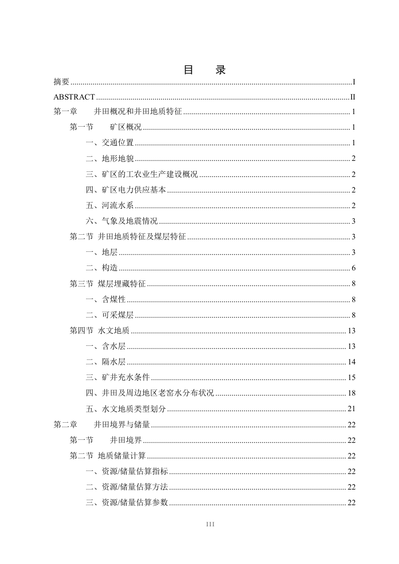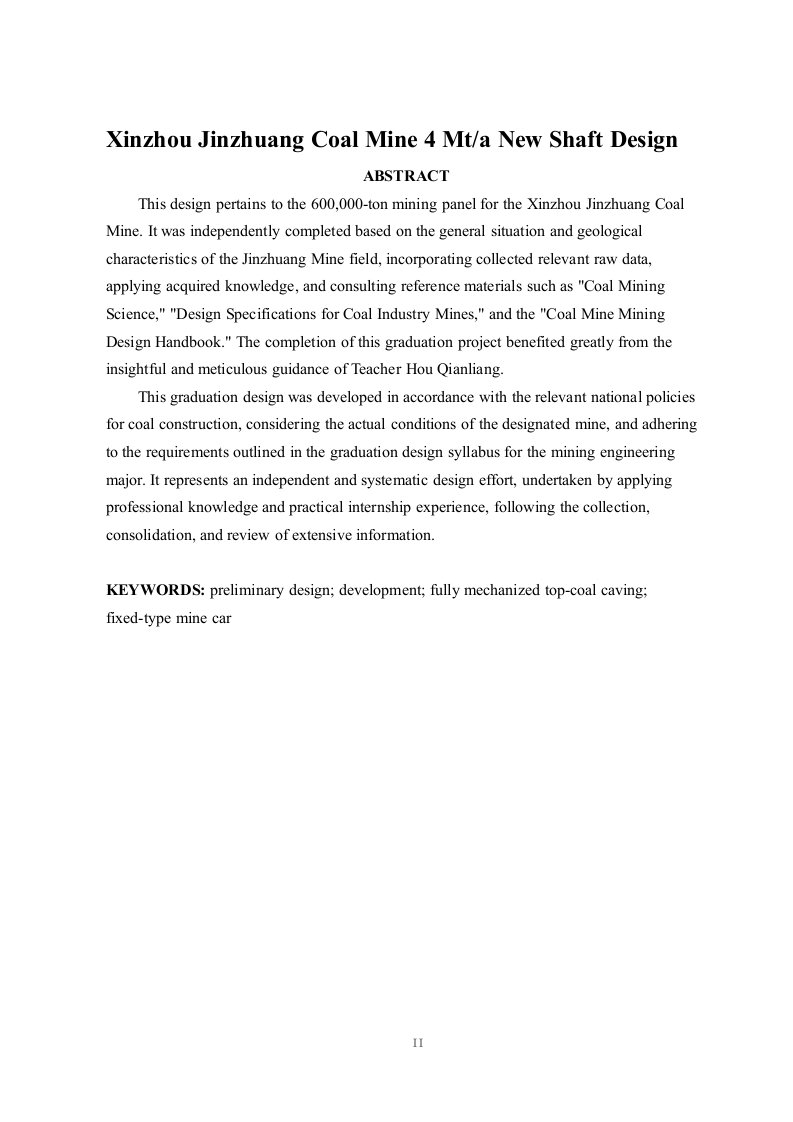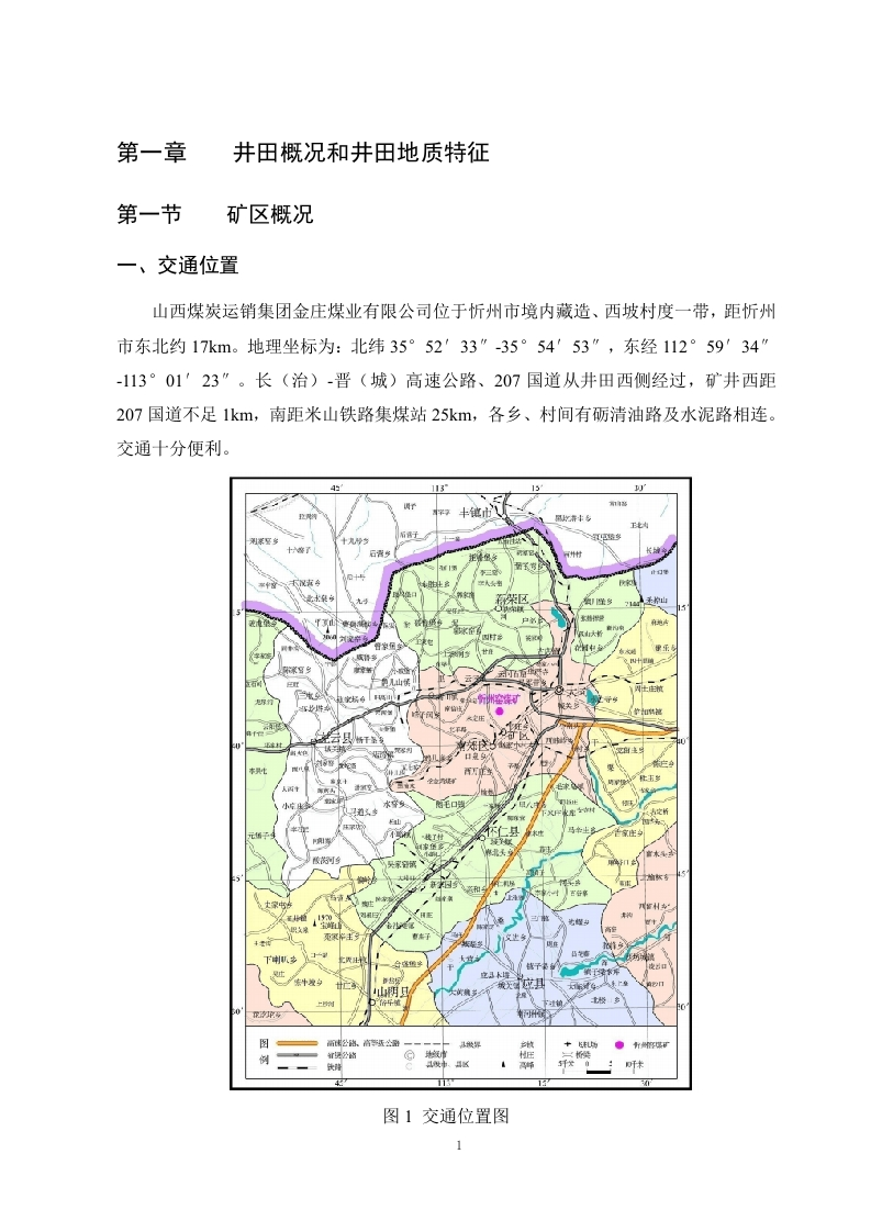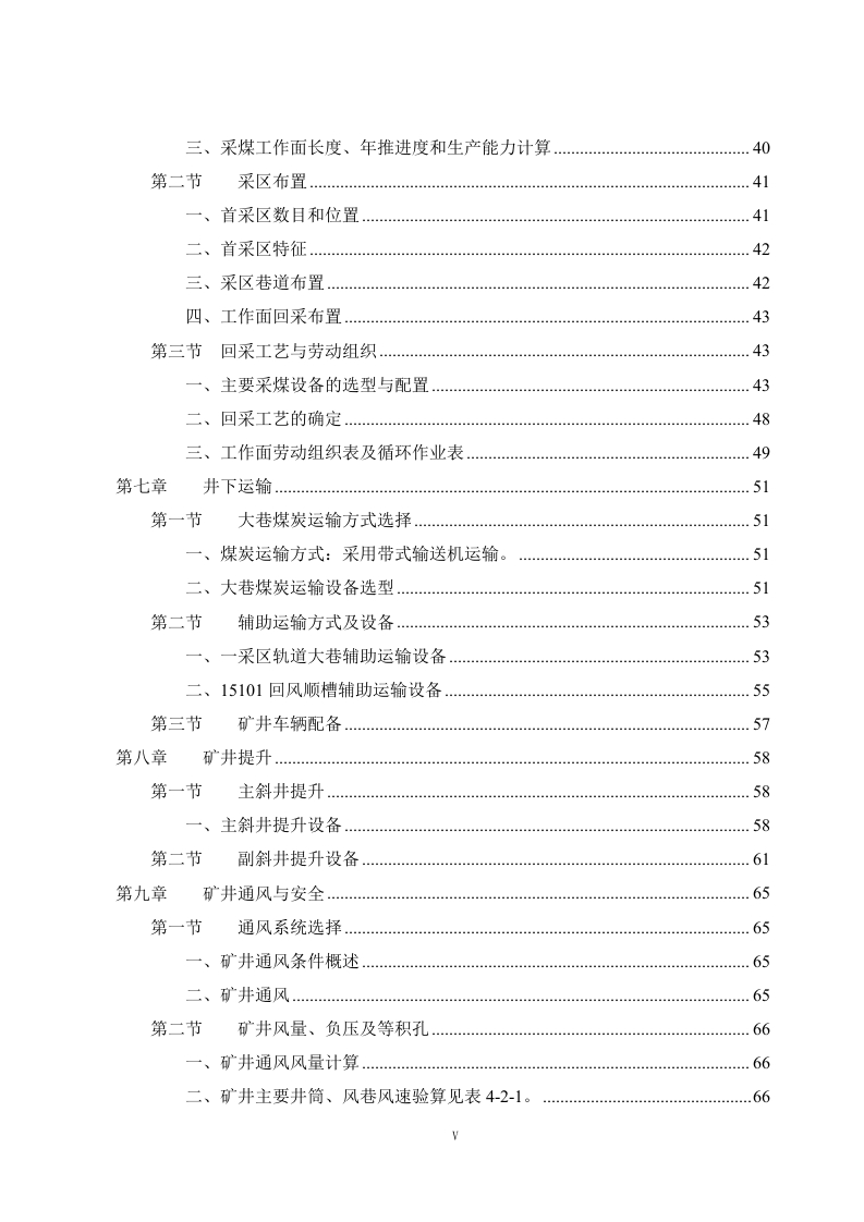 摘要本次设计的是忻州金庄煤矿60万吨采区设计。是在金庄煤矿井田概况和地质特征的基础上,结合搜集到的相关原始资料、运用所学知识、参考《煤矿开采学》、《煤炭工业和矿井设计规范》、《煤矿矿井开采设计手册》等参考资料,在侯千亮老师深入浅出的精心指导下独立完成。此次毕业设计是根据国家煤炭建设的有关方针、政策,结合设计矿井的实际情况,遵照采矿专业毕业设计大纲的要求,在收集、整理、查阅大量资料的前提下,运用自己所学的专业知识和实践实习经验独立的系统的完成的设计。关键词:初步设计:开拓:综采放顶煤:固定式矿车Xinzhou Jinzhuang Coal Mine 4 Mt/a New Shaft DesignABSTRACTThis design pertains to the 600,000-ton mining panel for the Xinzhou Jinzhuang CoalMine.It was independently completed based on the general situation and geologicalcharacteristics of the Jinzhuang Mine field,incorporating collected relevant raw data,applying acquired knowledge,and consulting reference materials such as "Coal MiningScience,""Design Specifications for Coal Industry Mines,"and the "Coal Mine MiningDesign Handbook."The completion of this graduation project benefited greatly from theinsightful and meticulous guidance of Teacher Hou Qianliang.This graduation design was developed in accordance with the relevant national policiesfor coal construction,considering the actual conditions of the designated mine,and adheringto the requirements outlined in the graduation design syllabus for the mining engineeringmajor.It represents an independent and systematic design effort,undertaken by applyingprofessional knowledge and practical internship experience,following the collection,consolidation,and review of extensive information.KEYWORDS:preliminary design;development;fully mechanized top-coal caving;fixed-type mine carII目录摘要…ABSTRACT.第一章井田概况和井田地质特征第一节矿区概况…一、交通位置二、地形地貌三、矿区的工农业生产建设概况四、矿区电力供应基本五、河流水系..2六、气象及地震情况第二节井田地质特征及煤层特征3一、地层3二、构造6第三节煤层埋藏特征8一、含煤性.8二、可采煤层…P第四节水文地质13一、含水层.13二、隔水层….14三、矿井充水条件15四、井田及周边地区老窑水分布状况….18五、水文地质类型划分21第二章井田境界与储量22第一节井田境界22第二节地质储量计算…22一、资源储量估算指标22二、资源储量估算方法.22三、资源储量估算参数…22III四、煤层采用厚度确定原则.….22五、资源储量估算结果23五、矿井设计可采储量24第三章矿井工作制度及生产能力..26第一节矿井工作制度..26第二节矿井生产能力及服务年限…26第四章井田开拓。27第一节井田开拓方式确定27第二节达到设计生产能力时工作面设备28一、回采工作面主要机械设备配备详见表….28二、采煤工作面长度、年推进度和生产能力计算..28三、综掘工作面主要设备表见表4-2-3.30四、井巷工程量.30第五章矿井基本巷道及建井计划.32第一节井简、石门与大巷….32第二节井底车场.….34第三节建井工作计划…...35一、施工准备的内容与进度.35二、矿井移交方式与移交标准..35二、巷道掘进进度指标.36三、掘进工作面个数及主要机械设备.36四、井巷工程量37五、三类工程施工组织原则….38六、建井工期预计….39七、加快建井速度的措施及建议.39第六章采煤方法。40第一节采煤方法的选择.。40一、采煤方法的选择40二、采煤工作面设备选型.40