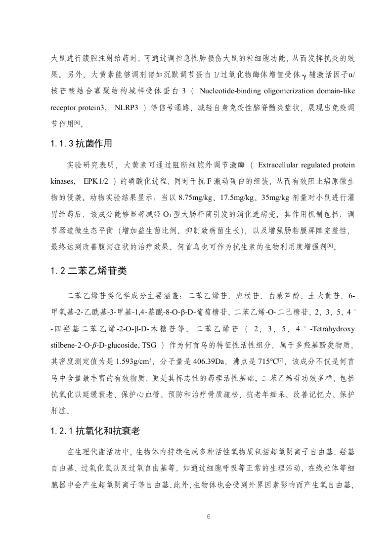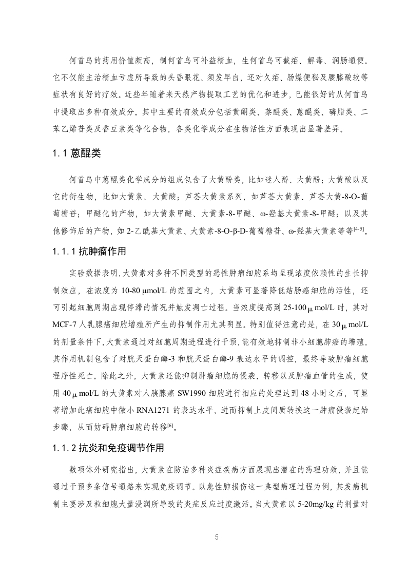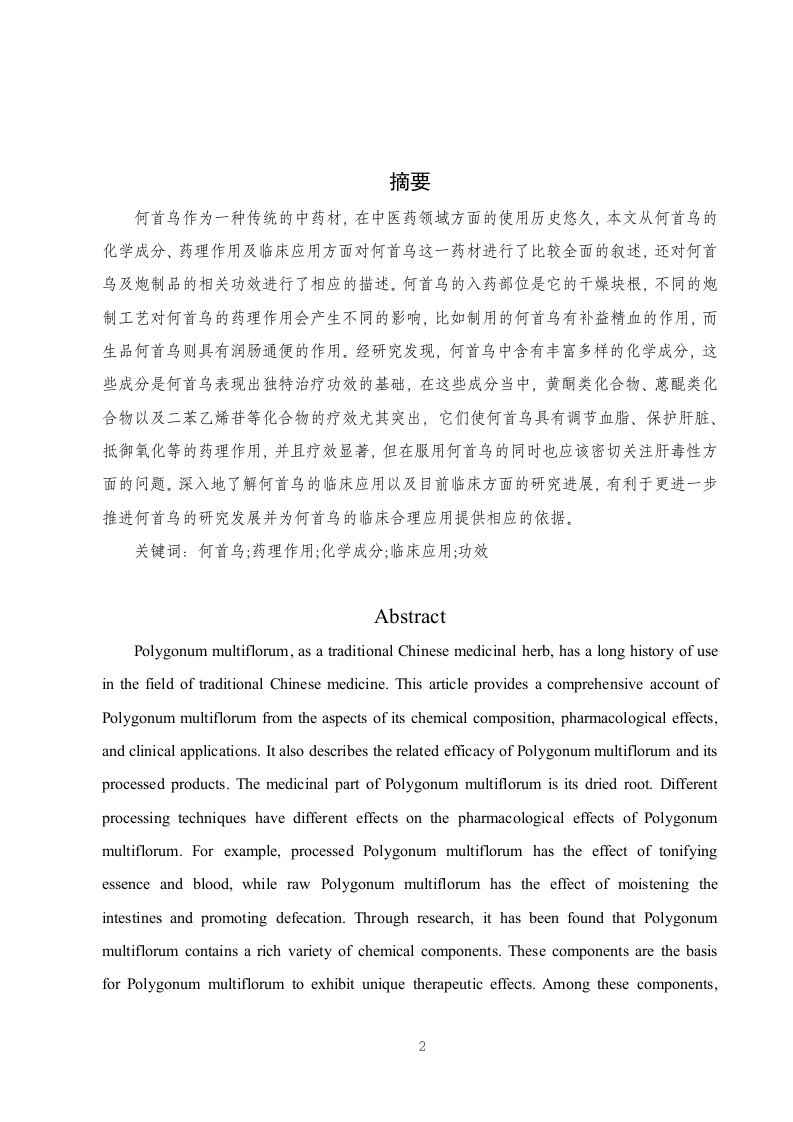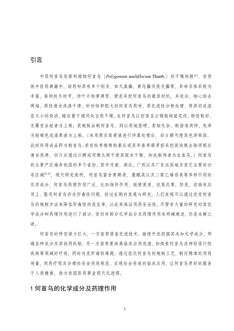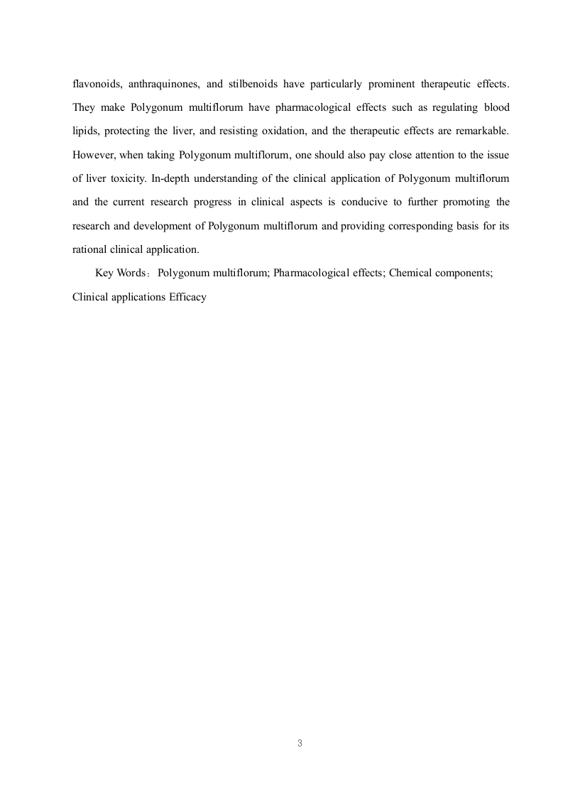 何首乌的化学成分、药理作用及临床应用的研究进展目录摘要4Abstract......…4引言.61何首乌的化学成分及药理作用..…61.1蒽醌类071.1.1抗肿瘤作用71.1.2抗炎和免疫调节作用>1.1.3抗菌作用....…81.2二苯乙烯苷类81.2.1抗氧化和抗衰老..81.2.2防治动脉粥样硬化..…91.2.3防治骨质疏松.101.2.4抗痴呆改善学习记忆101.2.5护肝功能..111.3黄酮类.111.3.1延缓衰老.121.3.2抗疲劳121.4萘醌类121.5磷脂类..121.6其他类.1.7何首鸟的中医药作用.132何首乌的炮制减毒作用...…142.1何首鸟的炮制.....2.2何首鸟的肝毒性....3何首鸟的临床应用.…153.1高血脂症153.2脱发.153.3高血压…163.4白癜风.……163.5润肠通便.….163.6其他临床应用174总结与展望.…17参考文献18致谢.….211摘要何首鸟作为一种传统的中药材,在中医药领域方面的使用历史悠久,本文从何首鸟的化学成分、药理作用及临床应用方面对何首鸟这一药材进行了比较全面的叙述,还对何首乌及炮制品的相关功效进行了相应的描述。何首鸟的入药部位是它的干燥块根,不同的炮制工艺对何首乌的药理作用会产生不同的影响,比如制用的何首鸟有补益精血的作用,而生品何首鸟则具有润肠通便的作用。经研究发现,何首鸟中含有丰富多样的化学成分,这些成分是何首鸟表现出独特治疗功效的基础,在这些成分当中,黄酮类化合物、蒽醌类化合物以及二苯乙烯苷等化合物的疗效尤其突出,它们使何首乌具有调节血脂、保护肝脏、抵御氧化等的药理作用,并且疗效显著,但在服用何首鸟的同时也应该密切关注肝毒性方面的问题。深入地了解何首乌的临床应用以及目前临床方面的研究进展,有利于更进一步推进何首乌的研究发展并为何首鸟的临床合理应用提供相应的依据。关键词:何首鸟:药理作用:化学成分:临床应用:功效AbstractPolygonum multiflorum,as a traditional Chinese medicinal herb,has a long history of usein the field of traditional Chinese medicine.This article provides a comprehensive account ofPolygonum multiflorum from the aspects of its chemical composition,pharmacological effects,and clinical applications.It also describes the related efficacy of Polygonum multiflorum and itsprocessed products.The medicinal part of Polygonum multiflorum is its dried root.Differentprocessing techniques have different effects on the pharmacological effects of Polygonummultiflorum.For example,processed Polygonum multiflorum has the effect of tonifyingessence and blood,while raw Polygonum multiflorum has the effect of moistening theintestines and promoting defecation.Through research,it has been found that Polygonummultiflorum contains a rich variety of chemical components.These components are the basisfor Polygonum multiflorum to exhibit unique therapeutic effects.Among these components,2flavonoids,anthraquinones,and stilbenoids have particularly prominent therapeutic effects.They make Polygonum multiflorum have pharmacological effects such as regulating bloodlipids,protecting the liver,and resisting oxidation,and the therapeutic effects are remarkable.However,when taking Polygonum multiflorum,one should also pay close attention to the issueof liver toxicity.In-depth understanding of the clinical application of Polygonum multiflorumand the current research progress in clinical aspects is conducive to further promoting theresearch and development of Polygonum multiflorum and providing corresponding basis for itsrational clinical application.Key Words:Polygonum multiflorum;Pharmacological effects;Chemical components;Clinical applications Efficacy3