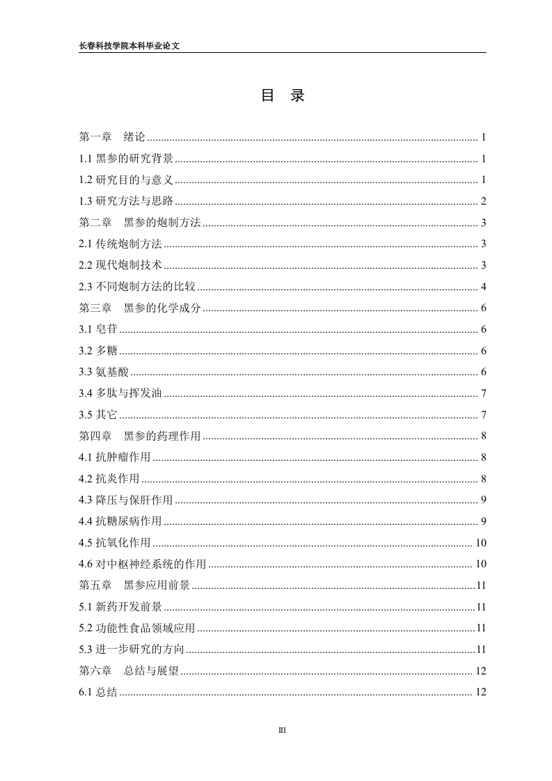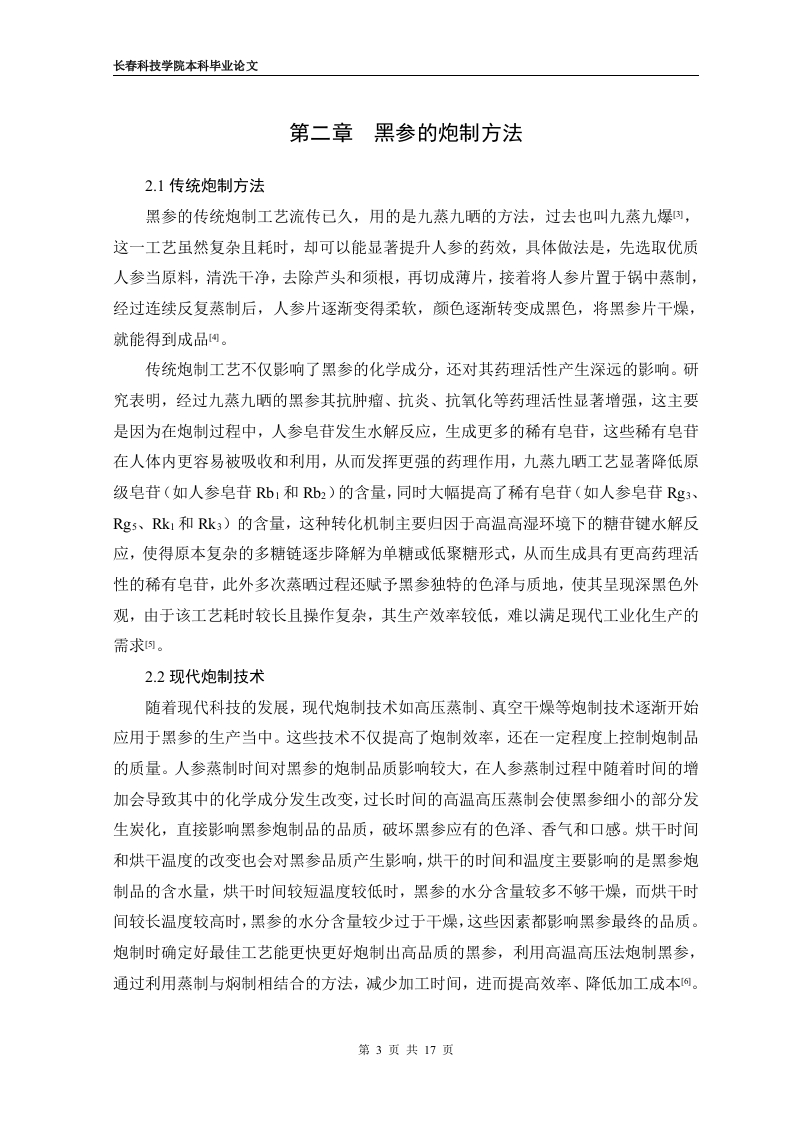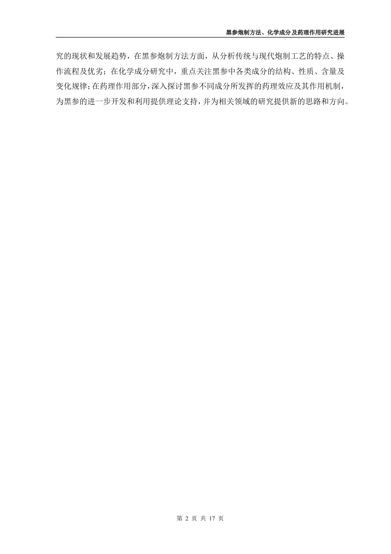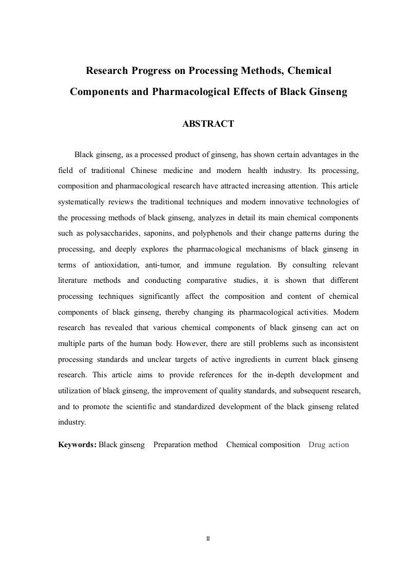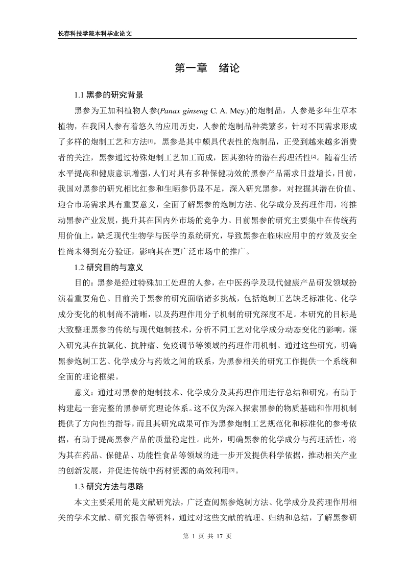 黑参的炮制方法、化学成分及药理作用研究进展摘要黑参作为人参的炮制品,在中医药领域及现代健康产业中展现出一定的优势,其炮制、成分与药理研究日益受到关注。本文系统综述黑参炮制方法的传统工艺与现代创新技术,详细分析其多糖、皂苷、多酚等主要化学成分及其在炮制过程中的变化规律,并深入探讨黑参在抗氧化、抗肿瘤、免疫调节等方面的药理作用机制。通过查阅相关文献方法,进行对比研究表明,不同炮制工艺显著影响黑参化学成分组成与含量,进而改变其药理活性:现代研究揭示了黑参多种化学成分可作用于人体多处,然而,目前黑参研究仍存在炮制标准不统一、活性成分作用靶点不明确等问题。本文旨在为黑参的深度开发利用、质量标准完善及后续研究提供参考,推动黑参相关产业科学化、标准化发展。关键词:黑参:炮制方法:化学成分;药理作用Research Progress on Processing Methods,ChemicalComponents and Pharmacological Effects of Black GinsengABSTRACTBlack ginseng,as a processed product of ginseng,has shown certain advantages in thefield of traditional Chinese medicine and modern health industry.Its processing,composition and pharmacological research have attracted increasing attention.This articlesystematically reviews the traditional techniques and modern innovative technologies ofthe processing methods of black ginseng,analyzes in detail its main chemical componentssuch as polysaccharides,saponins,and polyphenols and their change patterns during theprocessing,and deeply explores the pharmacological mechanisms of black ginseng interms of antioxidation,anti-tumor,and immune regulation.By consulting relevantliterature methods and conducting comparative studies,it is shown that differentprocessing techniques significantly affect the composition and content of chemicalcomponents of black ginseng,thereby changing its pharmacological activities.Modernresearch has revealed that various chemical components of black ginseng can act onmultiple parts of the human body.However,there are still problems such as inconsistentprocessing standards and unclear targets of active ingredients in current black ginsengresearch.This article aims to provide references for the in-depth development andutilization of black ginseng,the improvement of quality standards,and subsequent research,and to promote the scientific and standardized development of the black ginseng relatedindustry.Keywords:Black ginseng Preparation method Chemical composition Drug action0长春科技学院本科单业论文目录第一章绪论1.1黑参的研究背景11.2研究目的与意义1.3研究方法与思路…2第二章黑参的炮制方法.32.1传统炮制方法…32.2现代炮制技术.32.3不同炮制方法的比较4第三章黑参的化学成分63.1皂苷…63.2多糖..63.3氨基酸.…63.4多肽与挥发油.73.5其它..7第四章黑参的药理作用…84.1抗肿瘤作用84.2抗炎作用….84.3降压与保肝作用94.4抗糖尿病作用…94.5抗氧化作用…104.6对中枢神经系统的作用10第五章黑参应用前景..115.1新药开发前景.….115.2功能性食品领域应用.115.3进一步研究的方向..11第六章总结与展望126.1总结…12川黑参炮制方法、化学成分及药理作用研究进展6.2展望12参考文献.14致谢1>IV