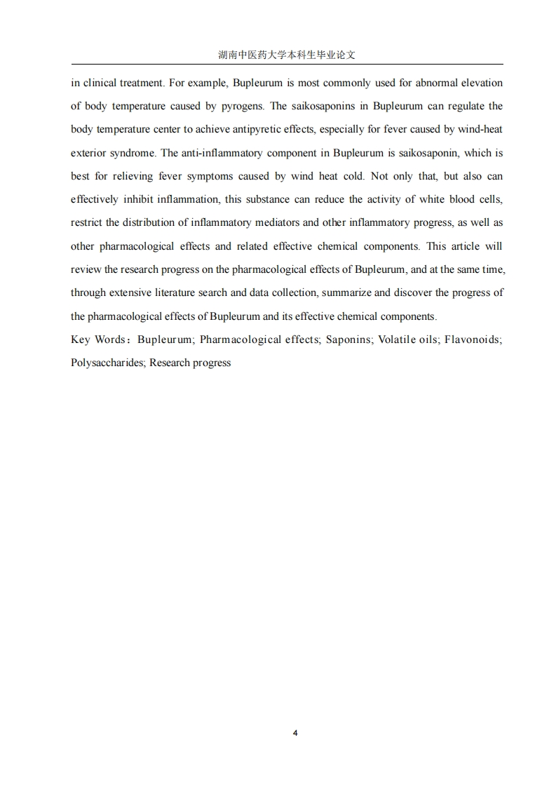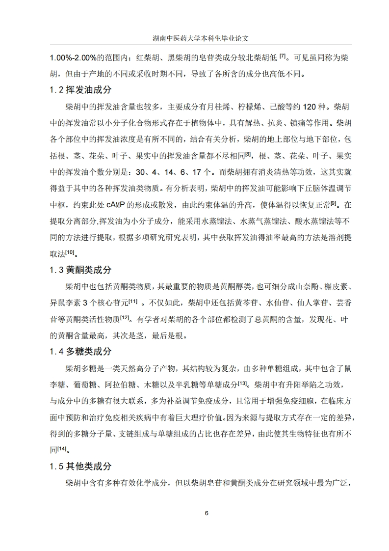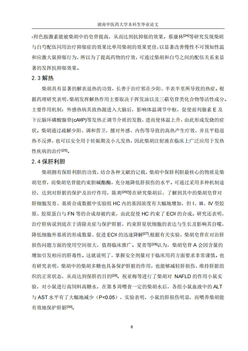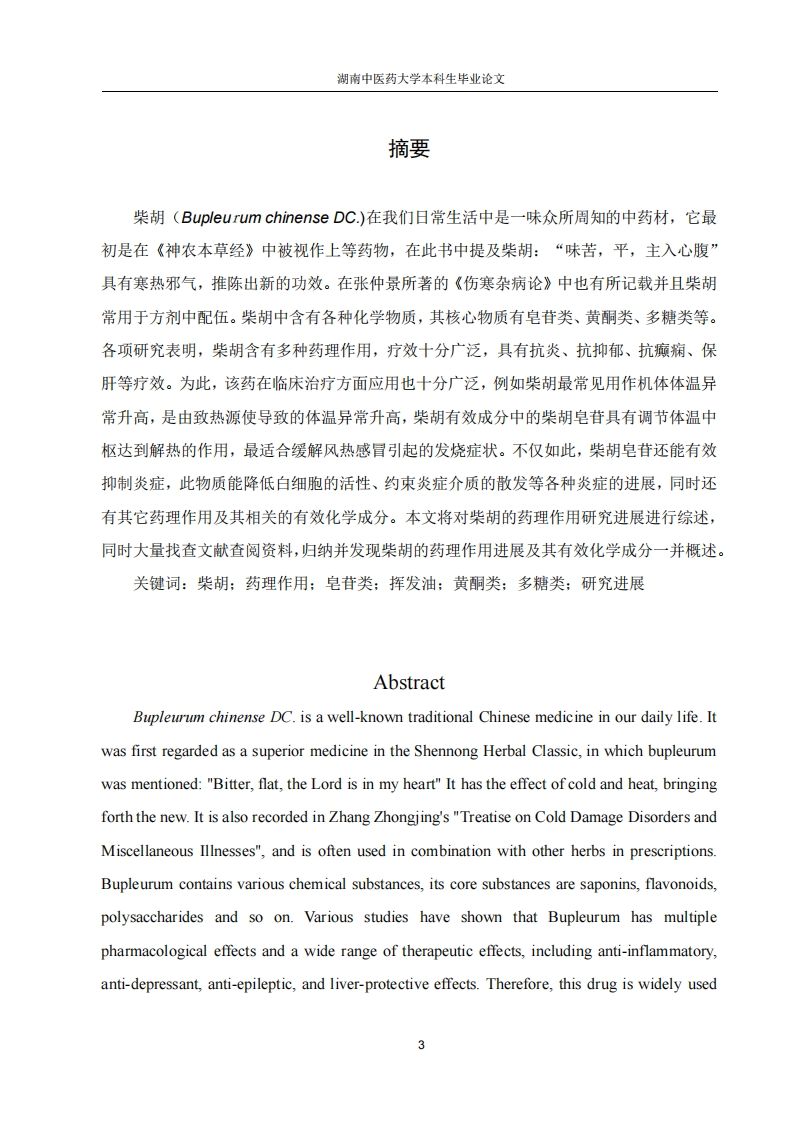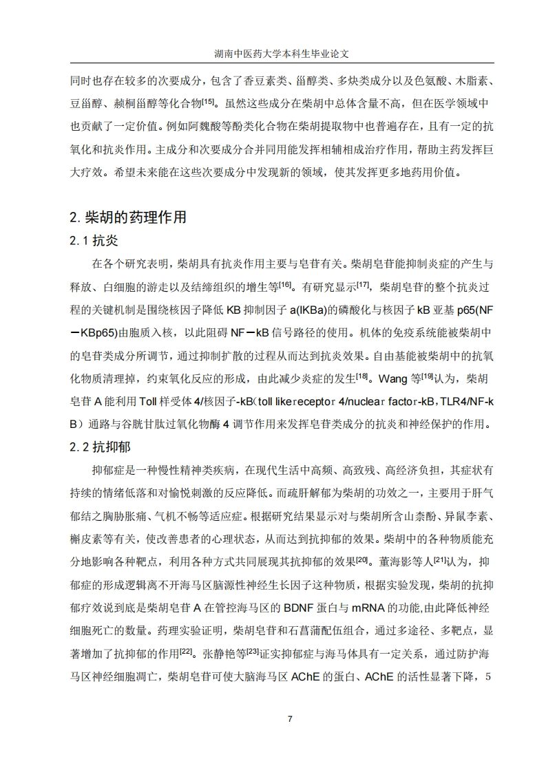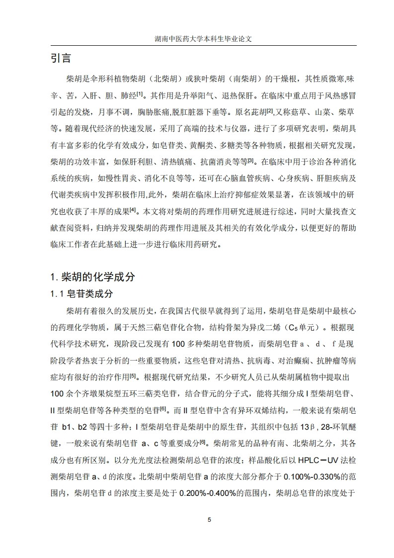 湖南中医药大学本科生毕业论文目录摘要(中英文)3引言.51.柴胡的化学成分.51.1皂苷类成分51.2挥发油成分61.3黄酮类成分81.4多糖类成分61.5其他类成分62.柴胡的药理作用72.1抗炎72.2抗抑郁72.3解热02.4保肝.2.5调节免疫力.92.6抗癫痫!92.7镇痛.92.8抗病毒92.9其他成分103.临床应用.10结语10参考文献11致谢..15湖南中医药大学本科生毕业论文摘要柴胡(Bupleurum chinense DC)在我们日常生活中是一味众所周知的中药材,它最初是在《神农本草经》中被视作上等药物,在此书中提及柴胡:“味苦,平,主入心腹”具有寒热邪气,推陈出新的功效。在张仲景所著的《伤寒杂病论》中也有所记载并且柴胡常用于方剂中配伍。柴胡中含有各种化学物质,其核心物质有皂苷类、黄酮类、多糖类等。各项研究表明,柴胡含有多种药理作用,疗效十分广泛,具有抗炎、抗抑郁、抗癫痫、保肝等疗效。为此,该药在临床治疗方面应用也十分广泛,例如柴胡最常见用作机体体温异常升高,是由致热源使导致的体温异常升高,柴胡有效成分中的柴胡皂苷具有调节体温中枢达到解热的作用,最适合缓解风热感冒引起的发烧症状。不仅如此,柴胡皂苷还能有效抑制炎症,此物质能降低白细胞的活性、约束炎症介质的散发等各种炎症的进展,同时还有其它药理作用及其相关的有效化学成分。本文将对柴胡的药理作用研究进展进行综述,同时大量找查文献查阅资料,归纳并发现柴胡的药理作用进展及其有效化学成分一并概述。关键词:柴胡:药理作用:皂苷类:挥发油:黄酮类:多糖类:研究进展AbstractBupleurum chinense DC.is a well-known traditional Chinese medicine in our daily life.Itwas first regarded as a superior medicine in the Shennong Herbal Classic,in which bupleurumwas mentioned:"Bitter,flat,the Lord is in my heart"It has the effect of cold and heat,bringingforth the new.It is also recorded in Zhang Zhongjing's "Treatise on Cold Damage Disorders andMiscellaneous Illnesses",and is often used in combination with other herbs in prescriptions.Bupleurum contains various chemical substances,its core substances are saponins,flavonoids,polysaccharides and so on.Various studies have shown that Bupleurum has multiplepharmacological effects and a wide range of therapeutic effects,including anti-inflammatory,anti-depressant,anti-epileptic,and liver-protective effects.Therefore,this drug is widely used3湖南中医药大学本科生毕业论文in clinical treatment.For example,Bupleurum is most commonly used for abnormal elevationof body temperature caused by pyrogens.The saikosaponins in Bupleurum can regulate thebody temperature center to achieve antipyretic effects,especially for fever caused by wind-heatexterior syndrome.The anti-inflammatory component in Bupleurum is saikosaponin,which isbest for relieving fever symptoms caused by wind heat cold.Not only that,but also caneffectively inhibit inflammation,this substance can reduce the activity of white blood cells,restrict the distribution of inflammatory mediators and other inflammatory progress,as well asother pharmacological effects and related effective chemical components.This article willreview the research progress on the pharmacological effects of Bupleurum,and at the same time,through extensive literature search and data collection,summarize and discover the progress ofthe pharmacological effects of Bupleurum and its effective chemical components.Key Words:Bupleurum;Pharmacological effects;Saponins;Volatile oils;Flavonoids;Polysaccharides;Research progress4湖南中医药大学本科生毕业论文引言柴胡是伞形科植物柴胡(北柴胡)或狭叶柴胡(南柴胡)的干燥根,其性质微寒,味辛、苦,入肝、胆、肺经。其作用是升举阳气、退热保肝。在临床中重点用于风热感冒引起的发烧,月事不调,胸胁胀痛,脱肛脏器下垂等。原名茈胡),又称菇草、山菜、柴草等。随着现代经济的快速发展,采用了高端的技术与仪器,进行了多项研究表明,柴胡具有丰富多彩的化学有效成分,如皂苷类、黄酮类、多糖类等各种物质,根据相关研究发现,柴胡的功效丰富,如保肝利胆、清热镇痛、抗菌消炎等等。在临床中用于诊治各种消化系统的疾病,如慢性胃炎、消化不良等等,还可在心脑血管疾病、心身疾病、肝胆疾病及代谢类疾病中发挥积极作用,此外,柴胡在临床上治疗抑郁症效果显著,在该领域中的研究也收获了丰厚的成果4。本文将对柴胡的药理作用研究进展进行综述,同时大量找查文献查阅资料,归纳并发现柴胡的药理作用进展及其相关的有效化学成