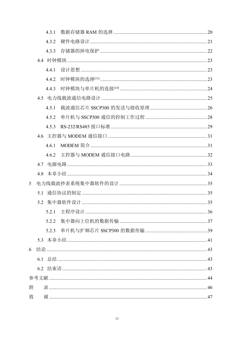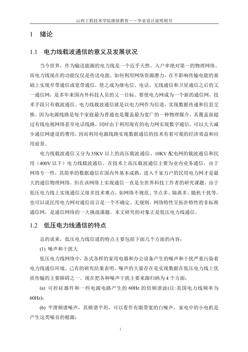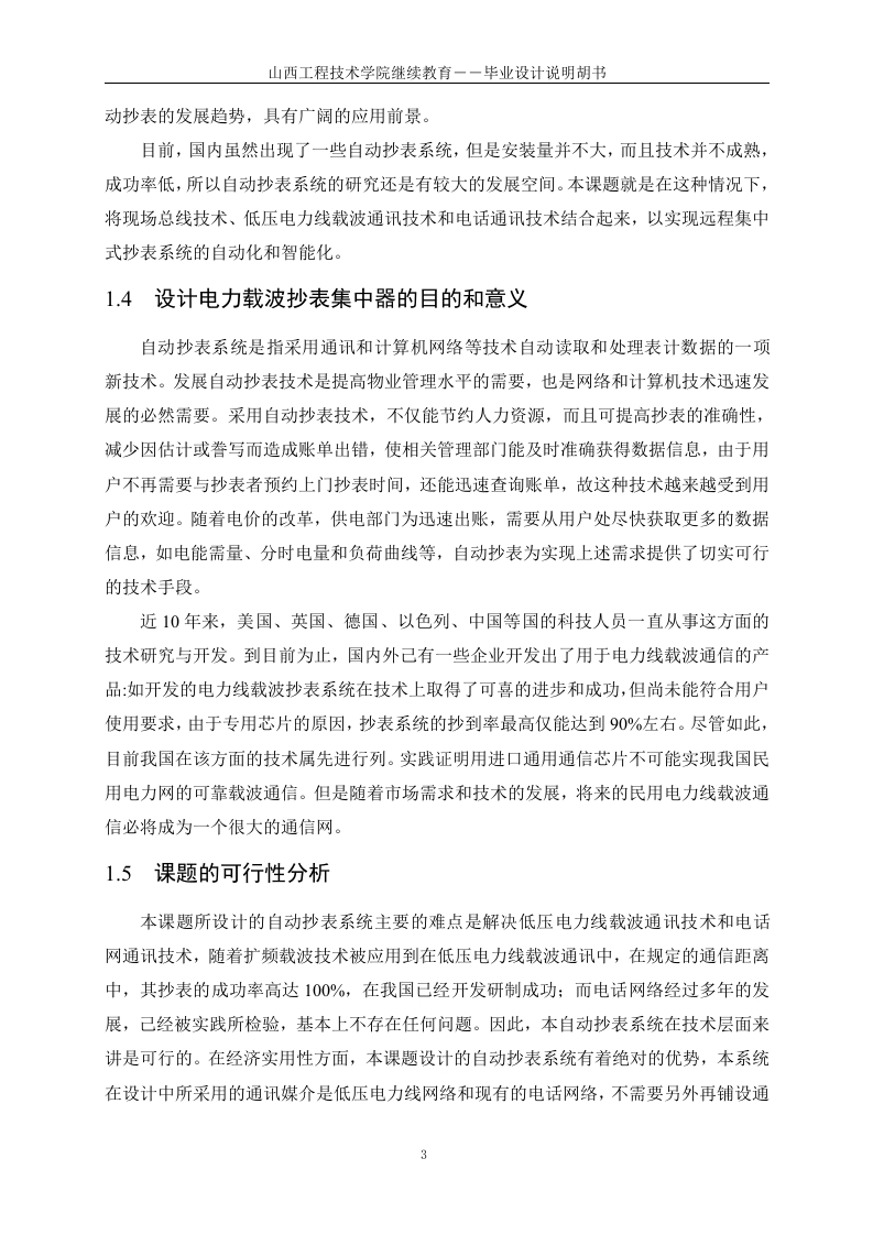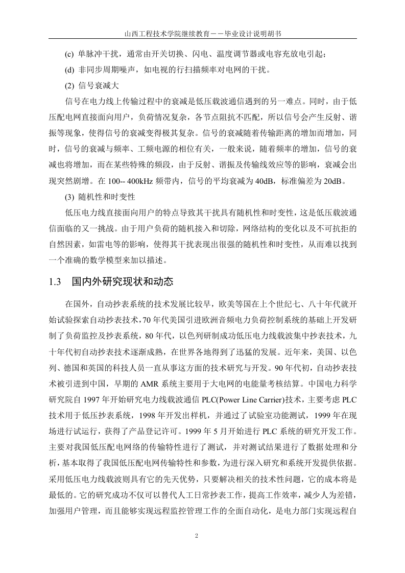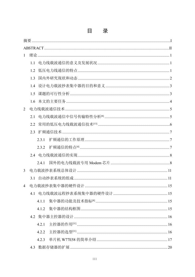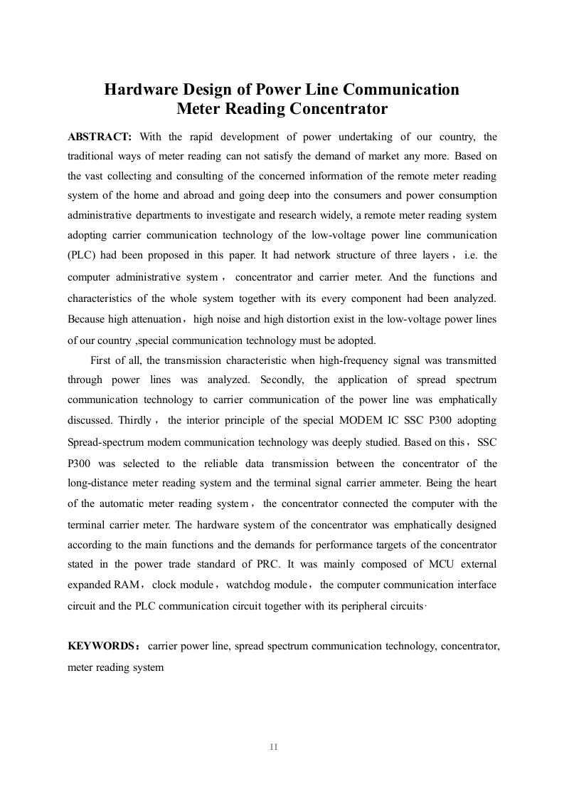 电力载波通信抄表集中器硬件设计摘要:随着我国电力事业的迅速发展,传统的用电抄收管理方式己经不能满足市场需求。本文在大量收集查阅国内外有关远程抄表系统资料、深入用户及用电管理部门广泛调研的基础上,提出了一种采用低压电力线载波通信技术的远程自动抄表系统。该系统具有三层网络结构,即上位机管理系统、集中器和载波电表。重点分析研究了集中器及其与各组成部分的通信。由于我国低压电力线上存在的高削减、高噪声、高变形,必须采用特殊的通信技术。本文首先分析了高频信号在电力线中的传输特性:重点讨论了扩频通信技术在电力线载波通信中的应用:深入研究了以扩频调制解调技术通信技术为基础的、高性能的电力线载波专用MODEM芯片SSCP300的内部工作原理。在此基础上,采用SSCP300实现了远程抄表系统中集中器与终端载波电表之间可靠的数据传输。集中器是连接上位机与终端载波电表之间的枢纽,起着上传下达的作用。根据中华人民共和国电力行业标准规定的集中器的主要功能及性能指标要求,本文重点研究设计了集中器的硬件系统。其中硬件系统主要包括主控制器、外部扩展数据存储器、时钟模块、看门狗模块、上位机通信接口电路以及电力线载波通信电路及其外围电路等。关键词:电力线载波:扩频通信技术:集中器:抄表系统IHardware Design of Power Line CommunicationMeter Reading ConcentratorABSTRACT:With the rapid development of power undertaking of our country,thetraditional ways of meter reading can not satisfy the demand of market any more.Based onthe vast collecting and consulting of the concerned information of the remote meter readingsystem of the home and abroad and going deep into the consumers and power consumptionadministrative departments to investigate and research widely,a remote meter reading systemadopting carrier communication technology of the low-voltage power line communication(PLC)had been proposed in this paper.It had network structure of three layers,i.e.thecomputer administrative system,concentrator and carrier meter.And the functions andcharacteristics of the whole system together with its every component had been analyzed.Because high attenuation,high noise and high distortion exist in the low-voltage power linesof our country special communication technology must be adopted.First of all,the transmission characteristic when high-frequency signal was transmittedthrough power lines was analyzed.Secondly,the application of spread spectrumcommunication technology to carrier communication of the power line was emphaticallydiscussed.Thirdly,the interior principle of the special MODEM IC SSC P300 adoptingSpread-spectrum modem communication technology was deeply studied.Based on this,SSCP300 was selected to the reliable data transmission between the concentrator of thelong-distance meter reading system and the terminal signal carrier ammeter.Being the heartof the automatic meter reading system,the concentrator connected the computer with theterminal carrier meter.The hardware system of the concentrator was emphatically designedaccording to the main functions and the demands for performance targets of the concentratorstated in the power trade standard of PRC.It was mainly composed of MCU externalexpanded RAM,clock module,watchdog module,the computer communication interfacecircuit and the PLC communication circuit together with its peripheral circuits.KEYWORDS:carrier power line,spread spectrum communication technology,concentrator,meter reading system女目录酒要.IABSTRACT.......1绪论…1.1电力线载波通信的意义及发展状况1.2低压电力线通信的特点…1.3国内外研究现状和动态..21.4设计电力载波抄表集中器的目的和意义.31.5课题的可行性分析….31.6本文的主要任务….42电力线载波通信技术.52.1电力线载波通信中信号传输特性分析8劉…2.2常用的低压电力线载波通信技术]..62.3扩频通信技术.72.3.1扩频通信的工作原理2.3.2扩频通信的特点472.4电力线载波通信的实现.82.4.1国外的电力线载波专用M0dem芯片.83电力载波抄表系统总体设计…..113.1自动