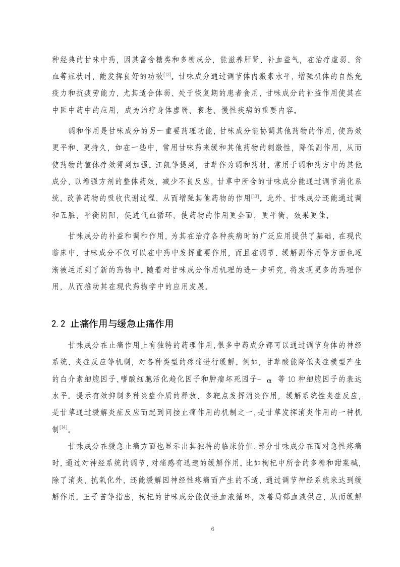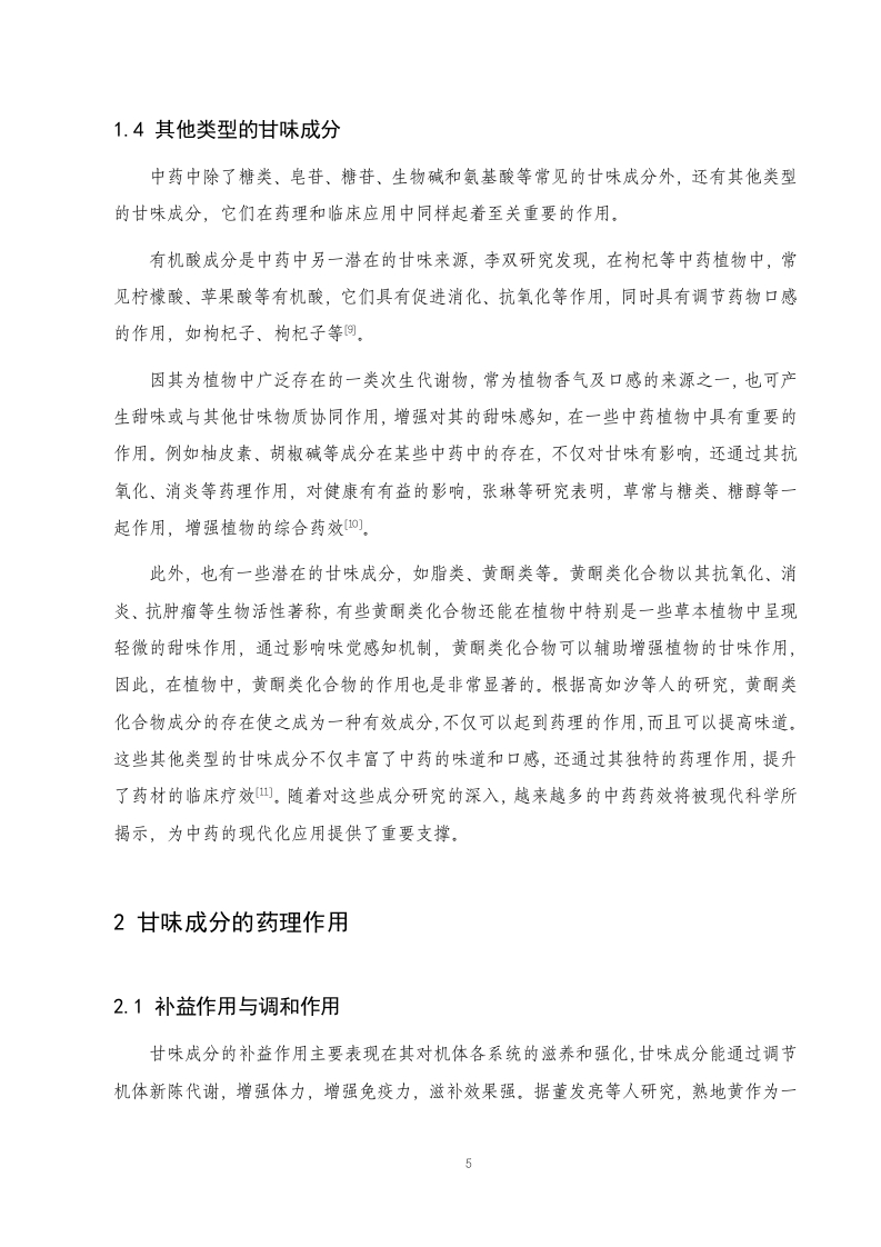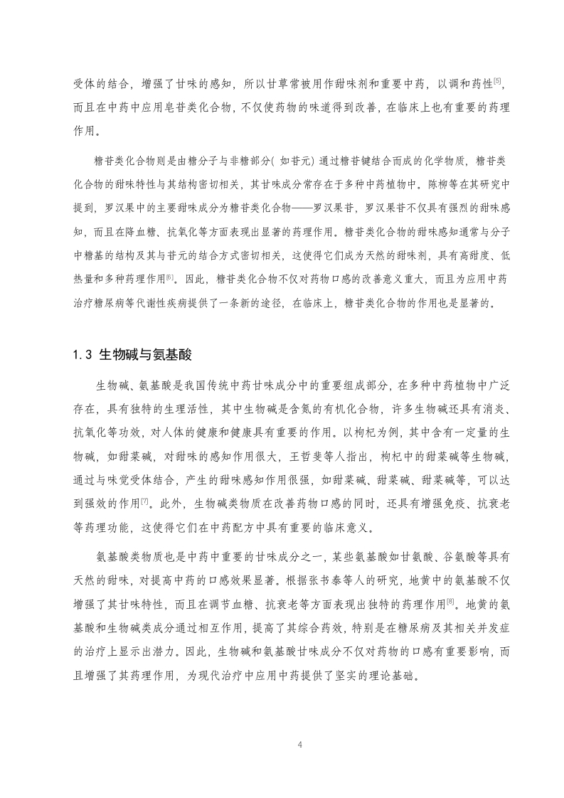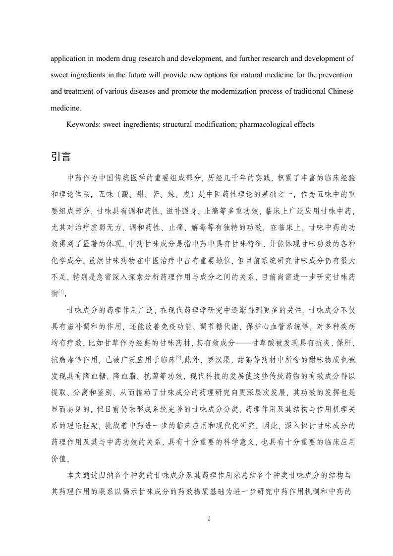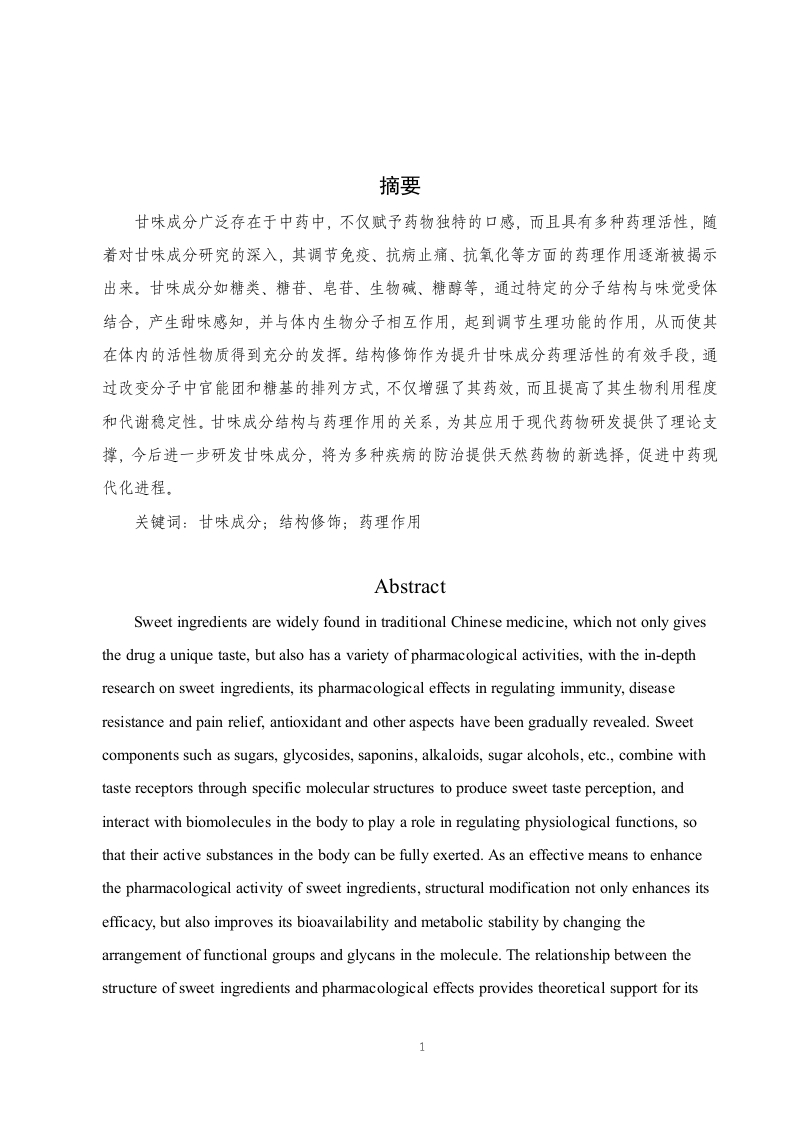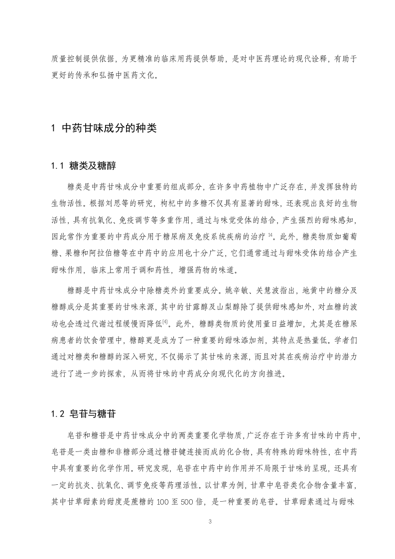 中药甘味成分及其药理作用的研究进展目录摘要..3引言.41中药甘味成分的种类51.1糖类及糖醇...51.2皂苷与糖苷…,,51.3生物碱与氨基酸.61.4其他类型的甘味成分2甘味成分的药理作用.…2.1补益作用与调和作用..…,,72.2止痛作用与缓急止痛作用..82.3调节免疫与抗病作用.92.4其他药理作用的研究进展93甘味成分结构与药理作用的关系..103.1糖类及糖醇.…。103.2皂苷与糖苷.…..113.3生物碱与氨基酸...123.4结构修饰与药理活性的提升12结论13参考文献.14致谢…17摘要甘味成分广泛存在于中药中,不仅赋予药物独特的口感,而且具有多种药理活性,随着对甘味成分研究的深入,其调节免疫、抗病止痛、抗氧化等方面的药理作用逐渐被揭示出来。甘味成分如糖类、糖苷、皂苷、生物碱、糖醇等,通过特定的分子结构与味觉受体结合,产生甜味感知,并与体内生物分子相互作用,起到调节生理功能的作用,从而使其在体内的活性物质得到充分的发挥。结构修饰作为提升甘味成分药理活性的有效手段,通过改变分子中官能团和糖基的排列方式,不仅增强了其药效,而且提高了其生物利用程度和代谢稳定性。甘味成分结构与药理作用的关系,为其应用于现代药物研发提供了理论支撑,今后进一步研发甘味成分,将为多种疾病的防治提供天然药物的新选择,促进中药现代化进程。关键词:甘味成分;结构修饰;药理作用AbstractSweet ingredients are widely found in traditional Chinese medicine,which not only givesthe drug a unique taste,but also has a variety of pharmacological activities,with the in-depthresearch on sweet ingredients,its pharmacological effects in regulating immunity,diseaseresistance and pain relief,antioxidant and other aspects have been gradually revealed.Sweetcomponents such as sugars,glycosides,saponins,alkaloids,sugar alcohols,etc.,combine withtaste receptors through specific molecular structures to produce sweet taste perception,andinteract with biomolecules in the body to play a role in regulating physiological functions,sothat their active substances in the body can be fully exerted.As an effective means to enhancethe pharmacological activity of sweet ingredients,structural modification not only enhances itsefficacy,but also improves its bioavailability and metabolic stability by changing thearrangement of functional groups and glycans in the molecule.The relationship between thestructure of sweet ingredients and pharmacological effects provides theoretical support for its1application in modern drug research and development,and further research and development ofsweet ingredients in the future will provide new options for natural medicine for the preventionand treatment of various diseases and promote the modernization process of traditional ChinesemedicineKeywords:sweet ingredients;structural modification;pharmacological effects引言中药作为中国传统医学的重要组成部分,历经几千年的实践,积累了丰富的临床经验和理论体系。五味(酸、甜、苦、辣、咸)是中医药性理论的基础之一。作为五味中的重要组成部分,甘味具有调和药性、滋补强身、止痛等多重功效,临床上广泛应用甘味中药,尤其对治疗虚弱无力、调和药性、止痛、解毒等有独特的功效,在临床上,甘味中药的功效得到了显著的体现。中药甘味成分是指中药中具有甘味特征,并能体现甘味功效的各种化学成分。虽然甘味药物在中医治疗中占有重要地位,但目前系统研究甘味成分仍有很大不足,特别是急需深入探索分析药理作用与成分之间的关系,目前尚需进一步研究甘味药物四.甘味成分的药理作用广泛,在现代药理学研究中逐渐得到更多的关注,甘味成分不仅具有滋补调和的作用,还能改善免疫功能、调节糖代谢、保护心血管系统等,对多种疾病均有疗效。比如甘草作为经典的甘味药材,其有效成分一甘草酸被发现具有抗炎、保肝、抗病毒等作用,已被广泛应用于临床冈,此外,罗汉果、甜茶等药材中所含的甜味物质也被发现具有降血糖、降血脂、抗菌等功效。现代科技的发展使这些传统药物的有效成分得以提取、分离和鉴别,从而推动了甘味成分的药理研究向更深层次发展,其功效的发挥也是显而易见的。但目前仍未形成系统完善的甘味成分分类、药理作用及其结构与作用机理关系的理论框架,挑战着中药进一步的临床应用和现代化研究。因此,深入探讨甘味成分的药理作用及其与中药功效的关系,具有十分重要的科学意义,也具有十分重要的临床应用价值。本文通过归纳各个种类的甘味成分及其药理作用来总结各个种类甘味成分的结构与其药理作用的联系以揭示甘味成分的药效物质基础为进一步研究中药作用机制和中药的2质量控制提供依据,为更精准的临床用药提供帮助,是对中医药理论的现代诠释,有助于更好的传承和弘扬中医药文化。1中药甘味成分的种类1.1糖类及糖醇糖类是中药甘味成分中重要的组成部分,在许多中药植物中广泛存在,并发挥独特的生物活性。根据刘思等的研究,枸杞中的多糖不仅具有显著的甜味,还表现出良好的生物活性,具有抗氧化、免疫调节等多重作用,通过与味觉受体的结合,产生强烈的甜味感知,因此常作为重要的中药成分用于糖尿病及免疫系统疾病的治疗4。此外,糖类物质如葡萄糖、果糖和阿拉伯糖等在中药