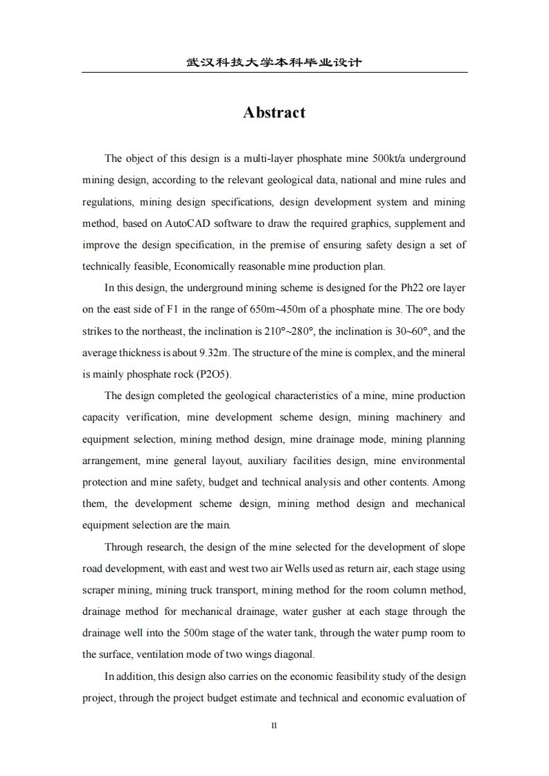 武汉科技大学本科毕业设计摘要本次设计的对象为某多层磷矿500kt/地下开采设计,根据相关的地质资料、国家和矿山的规章制度、采矿设计规范,设计开拓系统和采矿方法,依据AutoCAD软件绘制所需图形,补充完善设计说明书,在保证安全的前提下设计出一套技术上可行,经济上合理的矿山生产方案。本设计针对某磷矿650m~450m范围内F1东侧的Ph22矿层进行地下开采方案设计,矿体走向为北东,倾角为4°~10°,平均厚度约9.32m,矿区构造复杂,矿物主要是磷矿(P2O5)。本设计完成了某矿山地质特征研究、矿山生产能力校核、矿山开拓方案设计、矿山机械设备选型、矿山采矿方法设计、矿山排水方式、矿山开采计划安排、矿山的总平面布置、辅助设施设计、矿山环境保护和矿山安全、概算和技术分析等内容。其中以开拓方案设计、采矿方法设计和机械设备选型为主。通过研究,本设计矿山选择的开拓方式为斜坡道开拓,设有东、西两风井用作回风,各阶段采用铲运机出矿,矿用汽车运输,采矿方法为房柱法,排水方式为机械排水,各阶段涌水经回风巷道排入500m阶段的水仓中,经由水泵房排至地表,通风方式两翼对角式。此外,本设计还对此次设计项目进行经济可行性研究,通过对本矿的工程概算和技术经济评价,确定在此种开拓方式、采矿方法、设备选型以及矿石价格情况下,该整套设计方案可行。关键词:某多层磷矿:地下开采:斜坡道开拓:房柱法武汉科技大学本科毕业设计AbstractThe object of this design is a multi-layer phosphate mine 500kt/a undergroundmining design,according to the relevant geological data,national and mine rules andregulations,mining design specifications,design development system and miningmethod,based on AutoCAD software to draw the required graphics,supplement andimprove the design specification,in the premise of ensuring safety design a set oftechnically feasible,Economically reasonable mine production plan.In this design,the underground mining scheme is designed for the Ph22 ore layeron the east side of FI in the range of 650m~450m of a phosphate mine.The ore bodystrikes to the northeast,.the inclination is2l0°-280°,the inclination is30-60°,and theaverage thickness is about 9.32m.The structure of the mine is complex,and the mineralis mainly phosphate rock (P205).The design completed the geological characteristics of a mine,mine productioncapacity verification,mine development scheme design,mining machinery andequipment selection,mining method design,mine drainage mode,mining planningarrangement,mine general layout,auxiliary facilities design,mine environmentalprotection and mine safety,budget and technical analysis and other contents.Amongthem,the development scheme design,mining method design and mechanicalequipment selection are the main.Through research,the design of the mine selected for the development of sloperoad development,with east and west two air Wells used as return air,each stage usingscraper mining,mining truck transport,mining method for the room column method,drainage method for mechanical drainage,water gusher at each stage through thedrainage well into the 500m stage of the water tank,through the water pump room tothe surface,ventilation mode of two wings diagonal.In addition,this design also carries on the economic feasibility study of the designproject,through the project budget estimate and technical and economic evaluation of武汉科技大学本科毕业设计the mine,it is determined that the whole set of design scheme is feasible under thecondition of such development mode,mining method,equipment selection and oreprice.Keywords:Amultilayer phosphate mine;Underground mining;Slopedevelopment;Room and pillar methodⅢ武汉科技大学本科毕业设计目录1总论1.1地理位置1.2设计基础资料1.2.1设计对象1.2.2设计依据1.2.3设计原则1.3建设条件」1.3.1地质资源1.3.2气候及水文地质21.4工程概况1.41地质构造1.4.2工程规模21.4.3技术经济31.4.4开拓.1.4.5采矿方法1.4.6通风与排水系统2技术经济42.1劳动定员与劳动生产率2.2资金及资金筹措52.2.