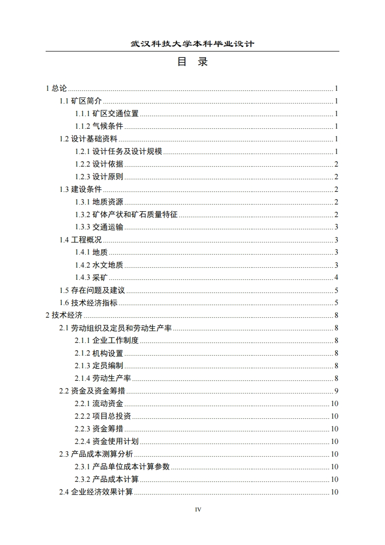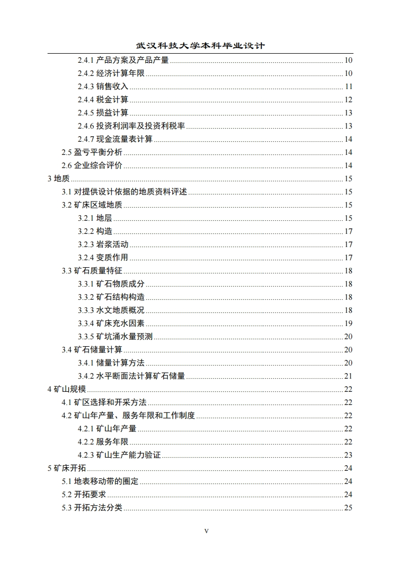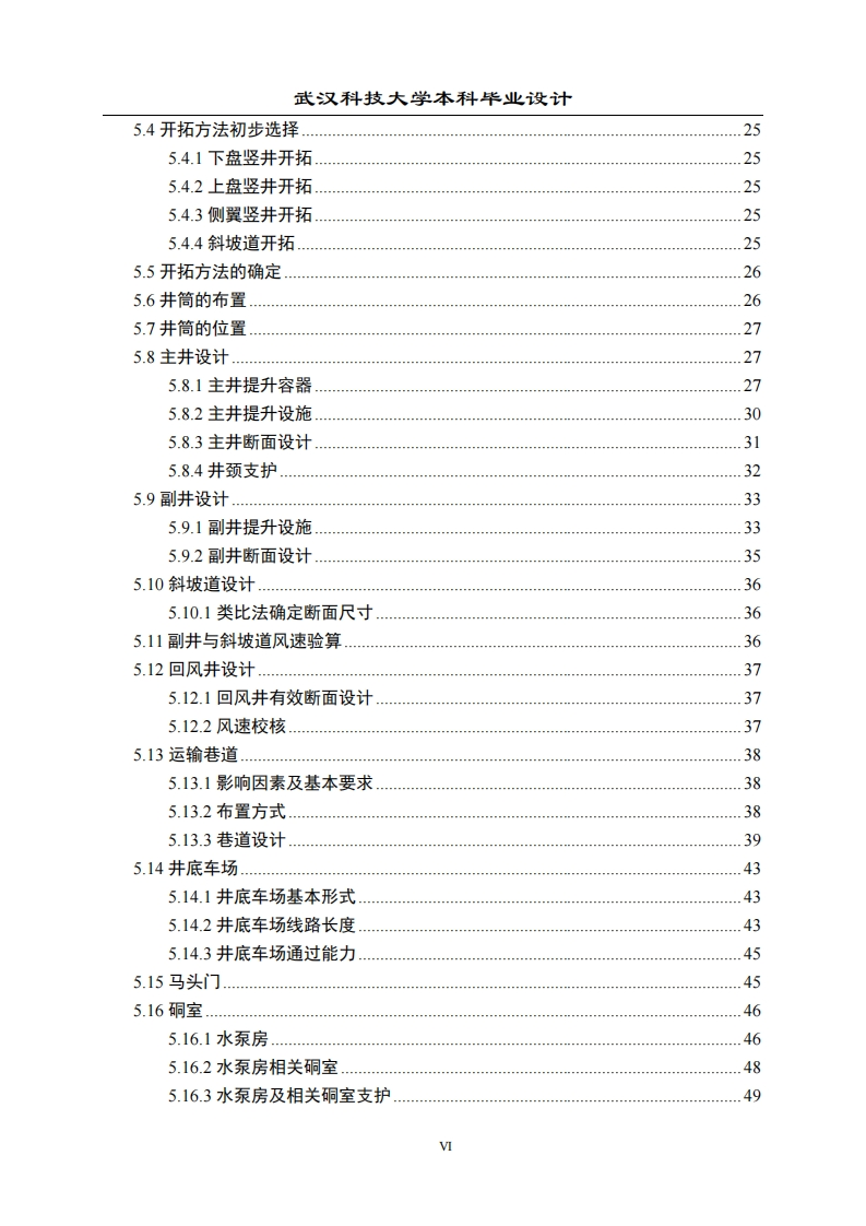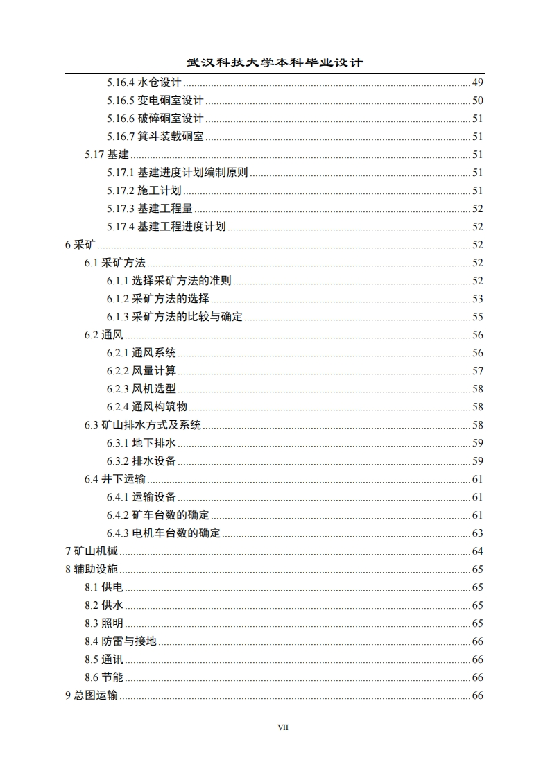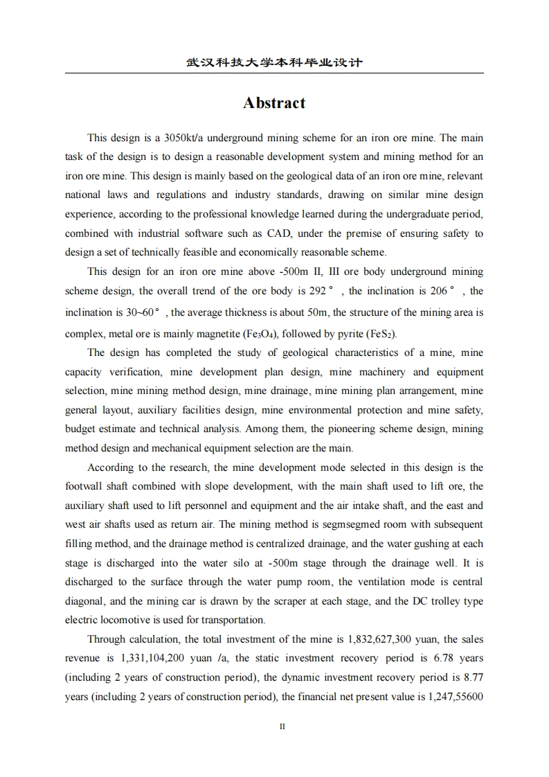 武汉科技大学本科华业设计摘要本次设计为某铁矿3050kWa地下开采方案设计,设计的主要任务是为某铁矿设计合理的开拓系统和采矿方法。本次设计主要依据某铁矿的地质资料、国家相关的法律法规及行业标准,借鉴类似矿山的设计经验,根据本科期间所学的专业知识,结合CAD等工业软件,在保证安全的前提下设计出一套技术上可行,经济上合理的方案。本设计针对某铁矿-500m以上的Ⅱ、Ⅲ号矿体进行地下开采方案设计,矿体总体走向为292°,倾向为206°,倾角为30-60°,平均厚度约50m,矿区构造复杂,金属矿物主要是磁铁矿(FeO4),其次为黄铁矿(FeS2)。本设计完成了某矿山地质特征研究、矿山生产能力校核、矿山开拓方案设计、矿山机械设备选型、矿山采矿方法设计、矿山排土排水方式、矿山开采计划安排、矿山的总平面布置、辅助设施设计、矿山环境保护和矿山安全、概算和技术分析等内容。其中以开拓方案设计、采矿方法设计和机械设备选型为主。通过研究,本设计矿山选择的开拓方式为下盘竖井联合斜坡道开拓,设有主井用于提升矿石,副井用于提升人员设备兼作进风井,另设有东、西两风井用作回风,采矿方法为无底柱分段崩落法,阶段高度为100m,排水方式为集中式排水,各阶段涌水经泄水井排入-500阶段的水仓中,经由水泵房排至地表,通风方式中央对角式,各阶段采用铲运机出矿,直流架线式电机车牵引矿车运输。通过计算,该矿山总投资为183262.73万元,销售收入为133110.42万元/a,静态投资回收期6.78年(含建设期2年),动态投资回收期8.77年(含建设期2年),财务净现值为124755.60万元,内部收益率为14%,盈亏平衡点为18.37%,验证了该方案在技术上可行,经济上合理。关键词:金属矿:地下开采:竖井联合斜坡道开拓:无底柱分段崩落法:中央对角式1武汉科技大学本科华业设计AbstractThis design is a 3050kt/a underground mining scheme for an iron ore mine.The maintask of the design is to design a reasonable development system and mining method for aniron ore mine.This design is mainly based on the geological data of an iron ore mine,relevantnational laws and regulations and industry standards,drawing on similar mine designexperience,according to the professional knowledge learned during the undergraduate period,combined with industrial software such as CAD,under the premise of ensuring safety todesign a set of technically feasible and economically reasonable scheme.This design for an iron ore mine above -500m II,IlI ore body underground miningscheme design,the overall trend of the ore body is292°,the inclination is206°,theinclination is 30-60,the average thickness is about 50m,the structure of the mining area iscomplex,metal ore is mainly magnetite(Fe304),followed by pyrite(FeS2).The design has completed the study of geological characteristics of a mine,minecapacity verification,mine development plan design,mine machinery and equipmentselection,mine mining method design,mine drainage,mine mining plan arrangement,minegeneral layout,auxiliary facilities design,mine environmental protection and mine safety,budget estimate and technical analysis.Among them,the pioneering scheme design,miningmethod design and mechanical equipment selection are the main.According to the research,the mine development mode selected in this design is thefootwall shaft combined with slope development,with the main shaft used to lift ore,theauxiliary shaft used to lift personnel and equipment and the air intake shaft,and the east andwest air shafts used as return air.The mining method is segmsegmed room with subsequentfilling method,and the drainage method is centralized drainage,and the water gushing at eachstage is discharged into the water silo at -500m stage through the drainage well.It isdischarged to the surface through the water pump room,the ventilation mode is centraldiagonal,and the mining car is drawn by the scraper at each stage,and the DC trolley typeelectric locomotive is used for transportation.Through calculation,the total investment of the mine is 1,832,627,300 yuan,t
