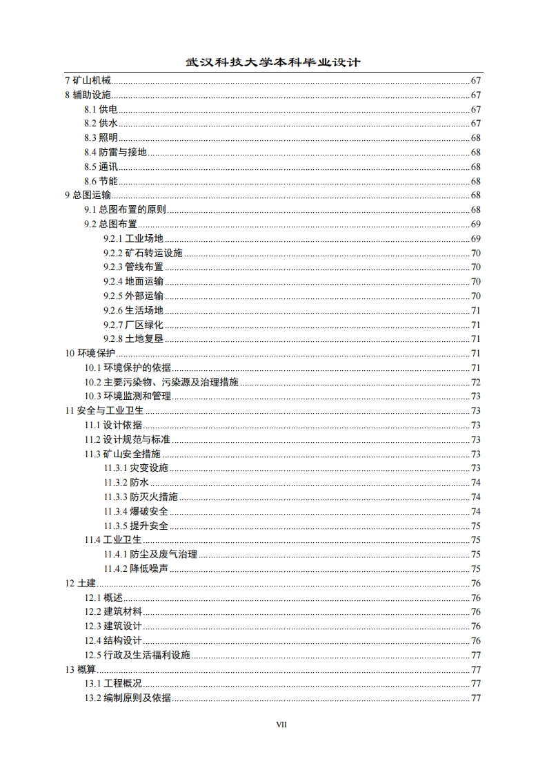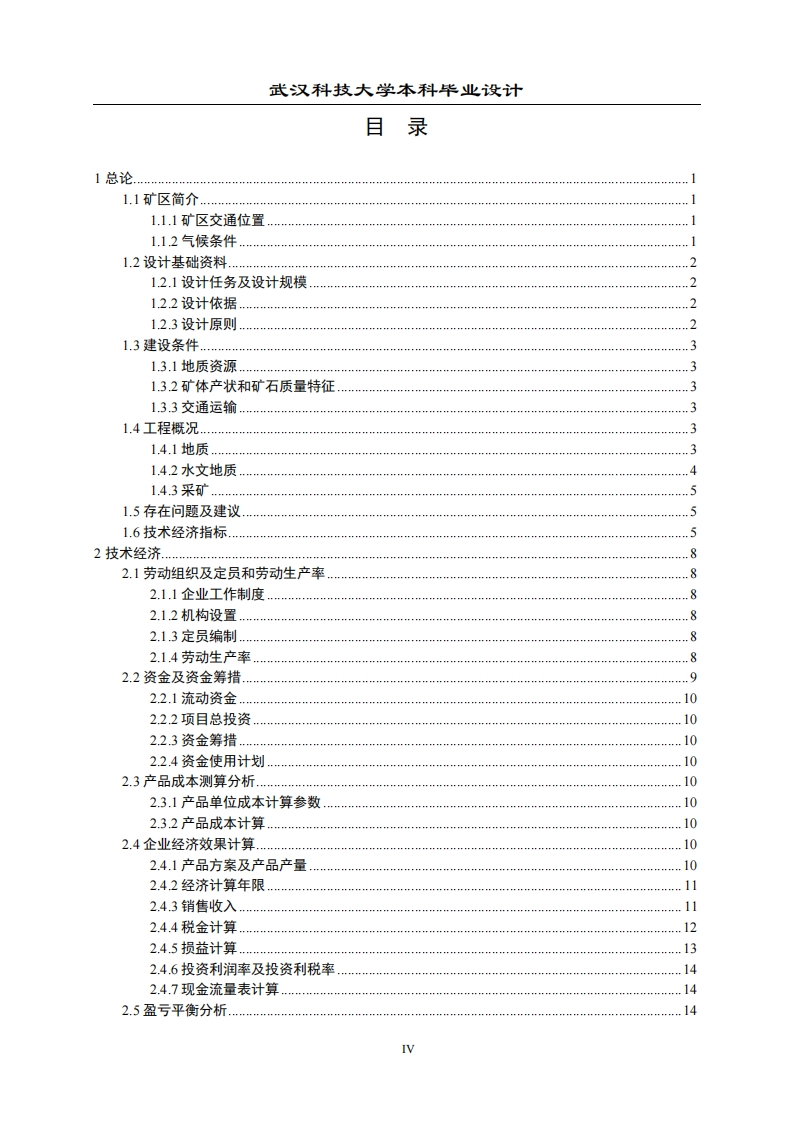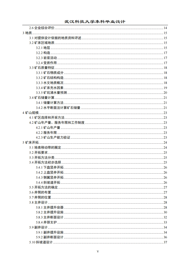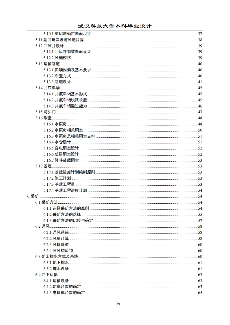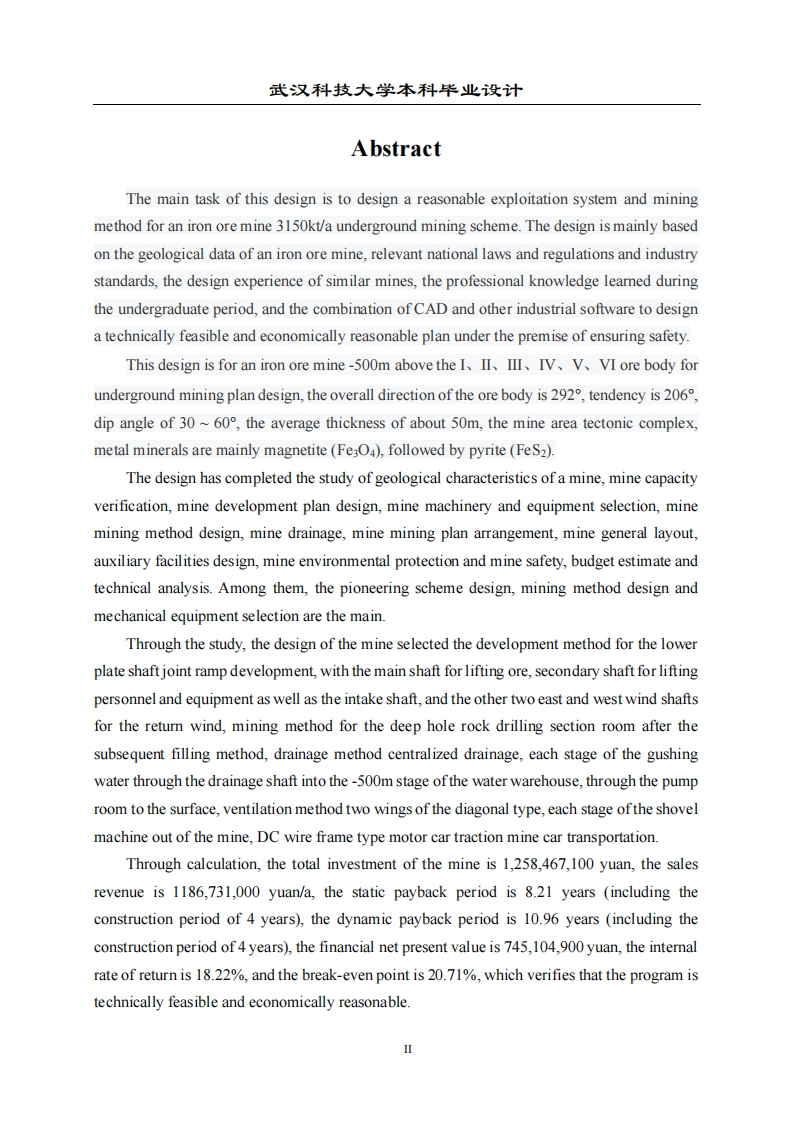 武汉科技大学本科毕业设计摘要本次设计为某铁矿3150kWa地下开采方案设计,设计的主要任务是为某铁矿设计合理的开拓系统和采矿方法。本次设计主要依据某铁矿的地质资料、国家相关的法律法规及行业标准,借鉴类似矿山的设计经验,根据本科期间所学的专业知识,结合CAD等工业软件,在保证安全的前提下设计出一套技术上可行,经济上合理的方案。本设计针对某铁矿-500m以上的I、Ⅱ、ⅢI、V、V、VI号矿体进行地下开采方案设计,矿体总体走向为292°,倾向为206°,倾角为30~60°,平均厚度约50m,矿区构造复杂,金属矿物主要是磁铁矿(FeO4),其次为黄铁矿(FeS2)。本设计完成了某矿山地质特征研究、矿山生产能力校核、矿山开拓方案设计、矿山机械设备选型、矿山采矿方法设计、矿山排土排水方式、矿山开采计划安排、矿山的总平面布置、辅助设施设计、矿山环境保护和矿山安全、概算和技术分析等内容。其中以开拓方案设计、采矿方法设计和机械设备选型为主。通过研究,本设计矿山选择的开拓方式为下盘竖井联合斜坡道开拓,设有主井用于提升矿石,副井用于提升人员设备兼作进风井,另设有东、西两风井用作回风,采矿方法为分段矿房嗣后充填法,排水方式集中式排水,各阶段涌水经泄水井排入-500m阶段的水仓中,经由水泵房排至地表,通风方式两翼对角式,各阶段采用铲运机出矿,直流架线式电机车牵引矿车运输。通过计算,该矿山总投资为125846.71万元,销售收入为118673.1万元a,静态投资回收期8.21年(含建设期4年),动态投资回收期10.96年(含建设期4年),财务净现值为万元,内部收益率为18.22%,盈亏平衡点为20.71%,验证了该方案在技术上可行,经济上合理。关键词:金属矿:地下开采:竖井联合斜坡道开拓:无底柱分段崩落法:两翼对角式1武汉科技大学本科毕业设计AbstractThe main task of this design is to design a reasonable exploitation system and miningmethod for an iron ore mine 3150kt/a underground mining scheme.The design is mainly basedon the geological data of an iron ore mine,relevant national laws and regulations and industrystandards,the design experience of similar mines,the professional knowledge learned duringthe undergraduate period,and the combination of CAD and other industrial software to designa technically feasible and economically reasonable plan under the premise of ensuring safety.This design is for an iron ore mine-5 00m above the I、Ⅱ、Ⅲl、IV、V、VI ore body forunderground mining plan design,the overall direction of the ore body is 292,tendency is 206,dip angle of 30~60,the average thickness of about 50m,the mine area tectonic complex,metal minerals are mainly magnetite(Fe3O4),followed by pyrite(FeS2).The design has completed the study of geological characteristics of a mine,mine capacityverification,mine development plan design,mine machinery and equipment selection,minemining method design,mine drainage,mine mining plan arrangement,mine general layout,auxiliary facilities design,mine environmental protection and mine safety,budget estimate andtechnical analysis.Among them,the pioneering scheme design,mining method design andmechanical equipment selection are the main.Through the study,the design of the mine selected the development method for the lowerplate shaftjoint ramp development,with the main shaft for lifting ore,secondary shaft for liftingpersonnel and equipment as well as the intake shaft,and the other two east and west wind shaftsfor the return wind,mining method for the deep hole rock drilling section room after thesubsequent filling method,drainage method centralized drainage,each stage of the gushingwater through the drainage shaft into the-500m stage of the water warehouse,through the pumproom to the surface,ventilation method two wings of the diagonal type,each stage of the shovelmachine out of the mine,DC wire frame type motor car traction mine car transportation.Through calculation,the total investment of the mine is 1,258,467,100 yuan,the salesrevenue is 1186,731,000 yuan/a,the static payback period is 8.21 year