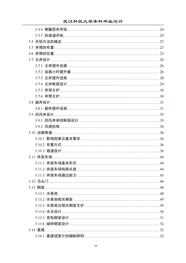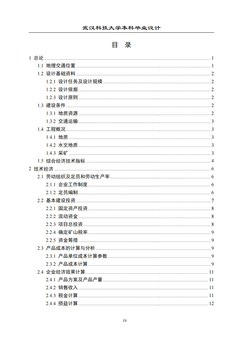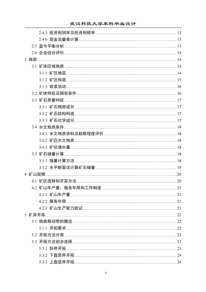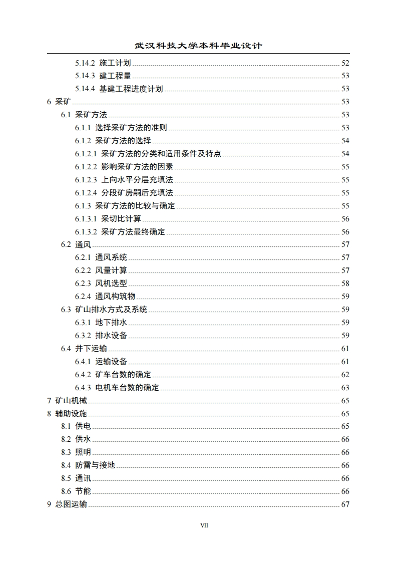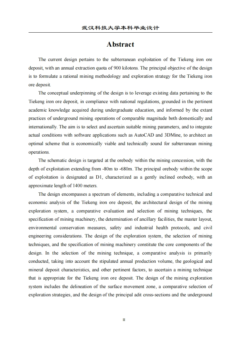 武汉科技大学本科华业设计摘要本次设计为铁坑铁矿900kt/地下开采设计,设计的主要任务是为铁坑铁矿设计合理的开采方法和开拓方案。设计的主要思路是通过已有的铁坑铁矿的相关资料,按照国家相关规定,根据本科期间所学相关专业知识,并参考国内外相似规模的地下开采现状,选择和确定适当的采矿参数,并结合实际情况以及AutoCAD和3 DMine等软件按照要求设计出一个经济上合理、技术上可行的利于地下开采的最佳方案。本设计针对矿区范围内的矿体进行了方案设计,开采深度范围为-80m-680m。开采范围内主要矿体为D1,为倾斜厚矿体,长约1400m。设计的内容包括:铁坑铁矿的技术经济比较、矿床开拓系统的设计、采矿方法的对比选择、矿山机械的选型、辅助设施的确定、总图布置、环境保护、安全与工业卫生、土建等。其中开拓系统的设计、采矿方法、机械设备的选型为主要设计内容。在选择采矿方法时,主要对所给年产量、矿体赋存条件、地质条件等因素进行对比分析,确定适合铁坑铁矿的采矿方法:矿山开拓系统的设计包括地表移动带的圈定、开拓方案对比选择、主要井巷断面及井底车场的设计等。矿山机械设备的选型主要包括矿山提升、通风、运输和排水等设备。本设计的主要参数有设计年产量为900ka,开拓方式为下盘竖井开拓,采矿方法为中深孔分段崩落阶段矿房嗣后充填法,通风方式为中央对角式分区通风,开采范围为-80m-680m,可开采储量为15030.87万t,可采年限为167年。年销售收入27675.00万元,年增值税金及附加3314.26元/a,年利润总额2861.10万元/a:年企业所得税715.275万元/a,年税后利润2145.825万元/:静态投资回收期7.23年,动态投资回收期14.14年,财务净现值为2315797.00万元,内部收益率为19.77%,验证该方案是技术上可行的、经济上合理的。关键词:铁坑铁矿:地下开采:下盘竖井开拓:充填采矿法:技术经济分析1武汉科技大学本科华业设计AbstractThe current design pertains to the subterranean exploitation of the Tiekeng iron oredeposit,with an annual extraction quota of 900 kilotons.The principal objective of the designis to formulate a rational mining methodology and exploration strategy for the Tiekeng ironore deposit.The conceptual underpinning of the design is to leverage existing data pertaining to theTiekeng iron ore deposit,in compliance with national regulations,grounded in the pertinentacademic knowledge acquired during undergraduate education,and informed by the extantpractices of underground mining operations of comparable magnitude both domestically andinternationally.The aim is to select and ascertain suitable mining parameters,and to integrateactual conditions with software applications such as AutoCAD and 3DMine,to architect anoptimal scheme that is economically viable and technically sound for subterranean miningoperations.The schematic design is targeted at the orebody within the mining concession,with thedepth of exploitation extending from-80m to -680m.The principal orebody within the scopeof exploitation is designated as D1,characterized as a gently inclined orebody,with anapproximate length of 1400 meters.The design encompasses a spectrum of elements,including a comparative technical andeconomic analysis of the Tiekeng iron ore deposit,the architectural design of the miningexploration system,a comparative evaluation and selection of mining techniques,thespecification of mining machinery,the determination of ancillary facilities,the master layout,environmental conservation measures,safety and industrial health protocols,and civilengineering considerations.The design of the exploration system,the selection of miningtechniques,and the specification of mining machinery constitute the core components of thedesign.In the selection of the mining technique,a comparative analysis is primarilyconducted,taking into account the stipulated annual production volume,the geological andmineral deposit characteristics,and other pertinent factors,to ascertain a mining techniquethat is appropriate for the Tiekeng iron ore deposit.The design of the mining explorations
