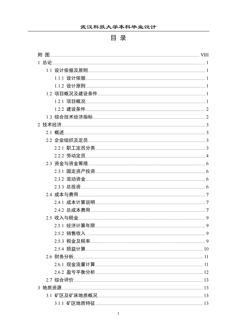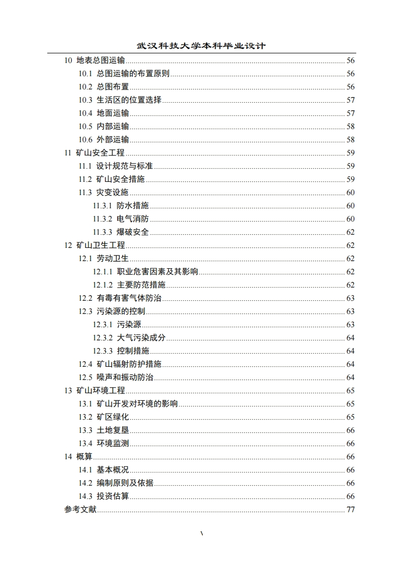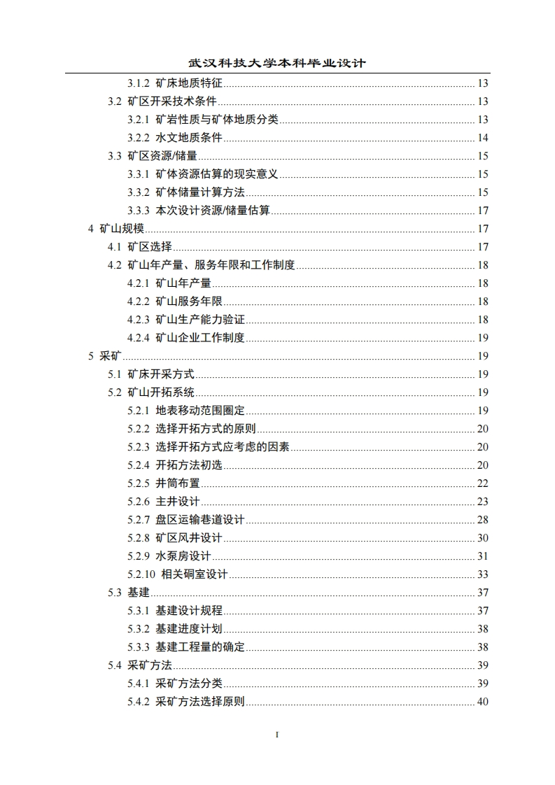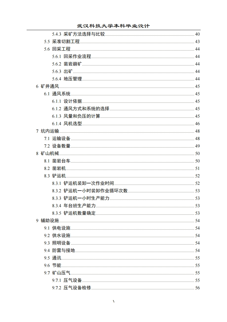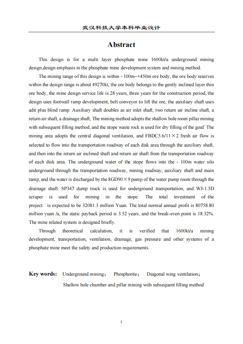 武汉科技大学本科毕业设计摘要本设计为某磷矿1600ktWa地下开采方案设计,设计的主要任务是为某磷矿设计合理的开拓系统和采矿方法。设计主要依据某磷矿的地质资料、国家相关的法律法规及行业标准,借鉴类似矿山的设计经验,结合CAD等软件设计出一套安全、技术、经济的方案。本设计的开采范围在-100m~+400m内的矿体,设计范围内的矿体储量约为49270kt,矿体属于缓倾斜层状薄矿体,矿山设计服务年限为28年,其中3年为建设期,设计采用下盘斜井开拓,带式输送机提升矿石:副井采用平酮加盲斜坡道,此外,副井兼做进风井,两个回风斜井:矿山采矿方法采用浅孔房柱采矿嗣后充填法,将采场废石用来对采空区进行干式充填:矿区采用两翼对角式通风,选用风机型号为FBDC5.6/11×2,新鲜风流经副井流入各盘区运输巷道,再从各盘区运输巷道流经采区巷道再进入回风斜井:采场地下水经各盘区运输巷道、采区巷道、副井、主斜井流入地下-100水仓,由水泵房8GD90×9型号水泵将水经排水井简集中排出:井下运输采用SP347型号自卸汽车运输,采场采用W-1.5D型号铲运机出矿:预计项目总投资为32081.3万元,正常年利润总额为80758.80万元/a,静态投资回收期为3.52年,盈亏平衡点为18.32%:对矿山相关系统进行设计。通过理论核算,验证某磷矿1600kW开采开拓、运输、通风、排水、压气等系统均满足安全、生产相关要求。关键词:地下开采:某磷矿;斜井开拓:两翼对角式通风:浅孔房柱采矿嗣后充填法武汉科技大学本科毕业设计AbstractThis design is for a multi layer phosphate mine 1600kt/a underground miningdesign,design emphasis in the phosphate mine development system and mining method.The mining range of this design is within-100m~+450m ore body,the ore body reserveswithin the design range is about 49270kt,the ore body belongs to the gently inclined layer thinore body,the mine design service life is 28 years,three years for the construction period,thedesign uses footwall ramp development,belt conveyor to lift the ore,the auxiliary shaft usesadit plus blind ramp.Auxiliary shaft doubles as air inlet shaft,two return air incline shaft,areturn air shaft,a drainage shaft;The mining method adopts the shallow hole room pillar miningwith subsequent filling method,and the stope waste rock is used for dry filling of the goaf.Themining area adopts the central diagonal ventilation,and FBDC5.6/11 X2 fresh air flow isselected to flow into the transportation roadway of each disk area through the auxiliary shaft,and then into the return air inclined shaft and return air shaft from the transportation roadwayof each disk area.The underground water of the stope flows into the -100m water silounderground through the transportation roadway,mining roadway,auxiliary shaft and mainramp,and the water is discharged by the 8GD90X9 pump of the water pump room through thedrainage shaft.SP347 dump truck is used for underground transportation,and WJ-1.5Dscraper is used for mining in the stope.The total investment of theproject is expected to be 32081.3 million Yuan.The total normal annual profit is 80758.80million yuan /a,the static payback period is 3.52 years,and the break-even point is 18.32%.The mine related system is designed briefly.Through theoretical calculation,it is verified that 1600kt/aminingdevelopment,transportation,ventilation,drainage,gas pressure and other systems of aphosphate mine meet the safety and production requirements.Key words:Underground mining;Phosphorite;Diagonal wing ventilation;Shallow hole chamber and pillar mining with subsequent filling method武汉科技大学本科毕业设计目录附图.VIII1总论.11.1设计依据及原则1.1.1设计依据11.1.2设计原则11.2项目概况及建设条件1.2.1项目概况11.2.2建设条件21.3综合技术经济指标22技术经济2.1概述2.2企业组织及定员2.2.1职工定员分类32.2.2劳动定员2.3资金与资金筹措62.3.1固定资产投资62.3.2流动资金62.3.3总投资62.4成本与费用72.4.1成本计算说明2.4.2总成本费用72.5收入与税金92.5.1经济计算年限92.5.2销售收入.92.5.3税金及税率92.5.4损益计算102.6财务分析」112.6.1现金流