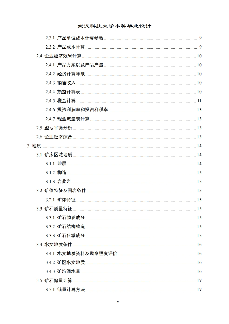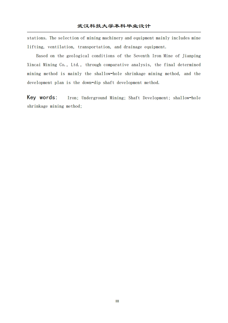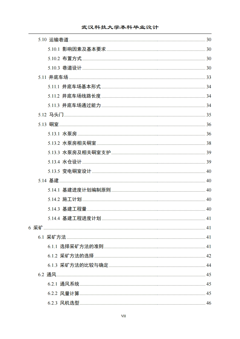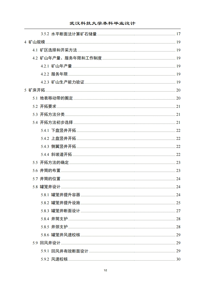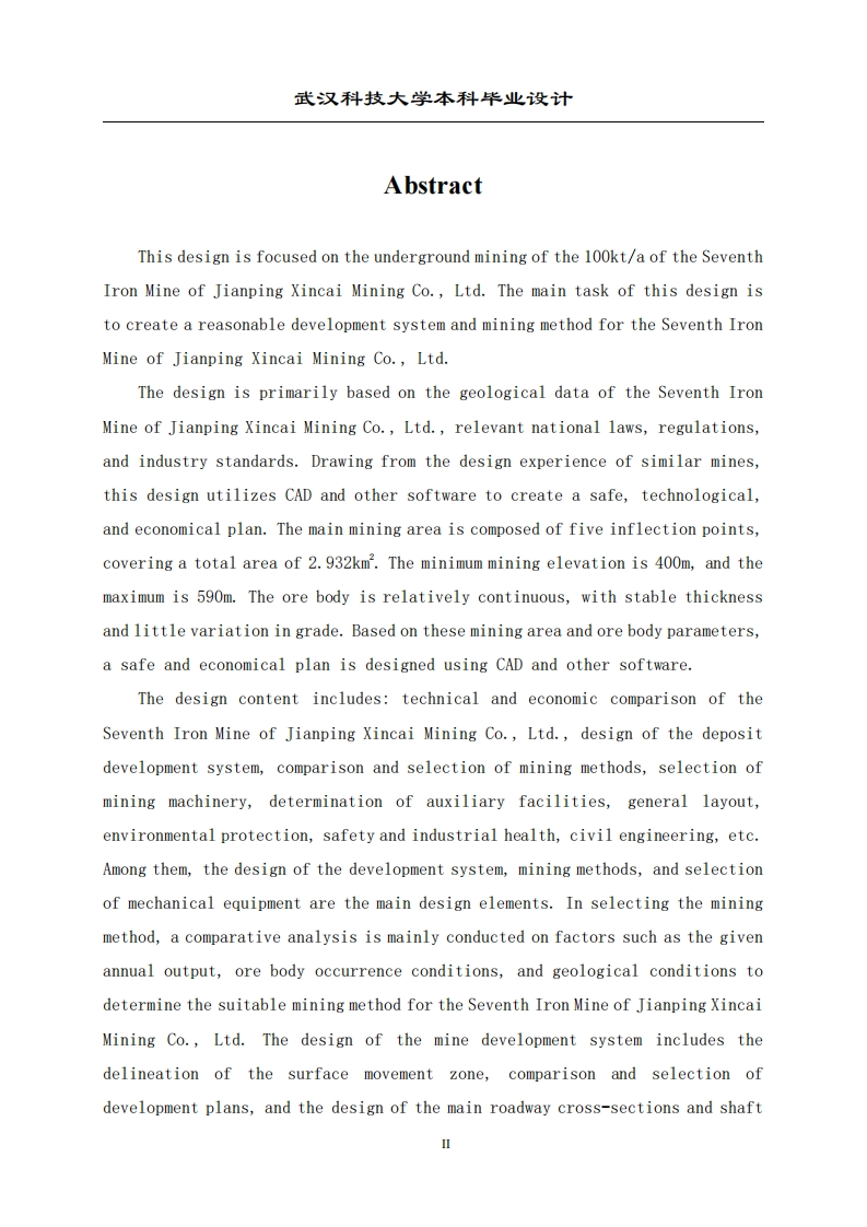 武汉科技大学本科华业设计摘要本次设计为建平新财矿业有限公司七矿铁矿100kt/a地下开采设计,设计的主要任务是为建平新财矿业有限公司七矿铁矿设计合理的开拓系统和采矿方法。本次设计主要依据建平新财矿业有限公司七矿铁矿的地质资料、国家相关的法律法规及行业标准,借鉴类似矿山的设计经验,结合CD等软件设计出一套安全、技术、经济的方案。本次设计主要矿区由5个拐点组成,矿区总面积2.932m2。矿区开采最低标高400m,最高标高590m。矿体较连续,厚度稳定且品位变化不大。通过上述矿区和矿体参数,利用CAD等软件设计出一套安全、经济的方案。设计的内容包括:建平新财矿业有限公司七矿铁矿的技术经济比较、矿床开拓系统的设计、采矿方法的对比选择、矿山机械的选型、辅助设施的确定、总图布置、环境保护、安全与工业卫生、土建等。其中开拓系统的设计、采矿方法、机械设备的选型为主要设计内容。在选择采矿方法时,主要对所给年产量、矿体赋存条件、地质条件等因素进行对比分析,确定适合建平新财矿业有限公司七矿铁矿的采矿方法:矿山开拓系统的设计包括地表移动带的圈定、开拓方案对比选择、主要井巷断面及井底车场的设计等。矿山机械设备的选型主要包括矿山提升、通风、运输和排水等设备。结合建平新财矿业有限公司七矿铁矿的地质条件,经过对比分析最终确定的采矿方法主要为浅孔留矿法,开拓方案为下盘竖井开拓。关键词:铁矿:地下开采:下盘竖井开拓:浅孔留矿法武汉科技大学本科华业设计AbstractThis design is focused on the underground mining of the 100kt/a of the SeventhIron Mine of Jianping Xincai Mining Co.,Ltd.The main task of this design isto create a reasonable development system and mining method for the Seventh IronMine of Jianping Xincai Mining Co.,Ltd.The design is primarily based on the geological data of the Seventh IronMine of Jianping Xincai Mining Co.,Ltd.,relevant national laws,regulations,and industry standards.Drawing from the design experience of similar mines,this design utilizes CAD and other software to create a safe,technological,and economical plan.The main mining area is composed of five inflection points,covering a total area of 2.932km'.The minimum mining elevation is 400m,and themaximum is 590m.The ore body is relatively continuous,with stable thicknessand little variation in grade.Based on these mining area and ore body parameters,a safe and economical plan is designed using CAD and other software.The design content includes:technical and economic comparison of theSeventh Iron Mine of Jianping Xincai Mining Co.,Ltd.,design of the depositdevelopment system,comparison and selection of mining methods,selection ofmining machinery,determination of auxiliary facilities,general layout,environmental protection,safety and industrial health,civil engineering,etc.Among them,the design of the development system,mining methods,and selectionof mechanical equipment are the main design elements.In selecting the miningmethod,a comparative analysis is mainly conducted on factors such as the givenannual output,ore body occurrence conditions,and geological conditions todetermine the suitable mining method for the Seventh Iron Mine of Jianping XincaiMining Co.,Ltd.The design of the mine development system includes thedelineation of the surface movement zone,comparison and selection ofdevelopment plans,and the design of the main roadway cross-sections and shaftⅡ武汉科技大学本科华业设计stations.The selection of mining machinery and equipment mainly includes minelifting,ventilation,transportation,and drainage equipment.Based on the geological conditions of the Seventh Iron Mine of JianpingXincai Mining Co.,Ltd.,through comparative analysis,the final determinedmining method is mainly the shallow-hole shrinkage mining method,and thedevelopment plan is the down-dip shaft development method.Key words:Iron;Underground Mining;Shaft Deve
