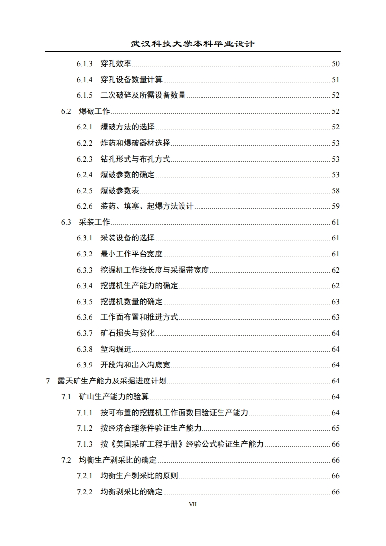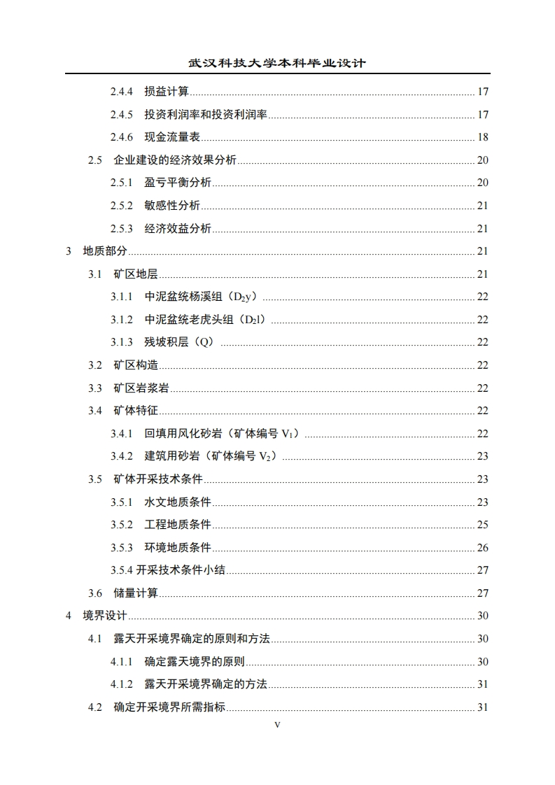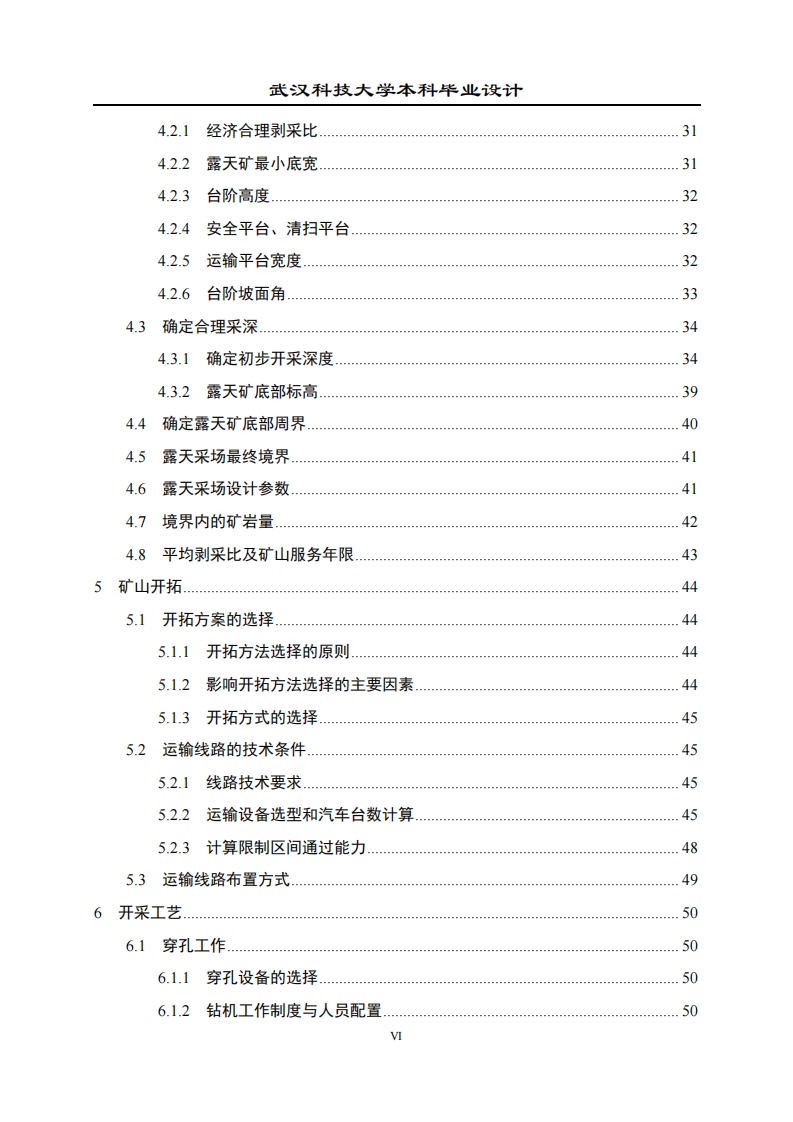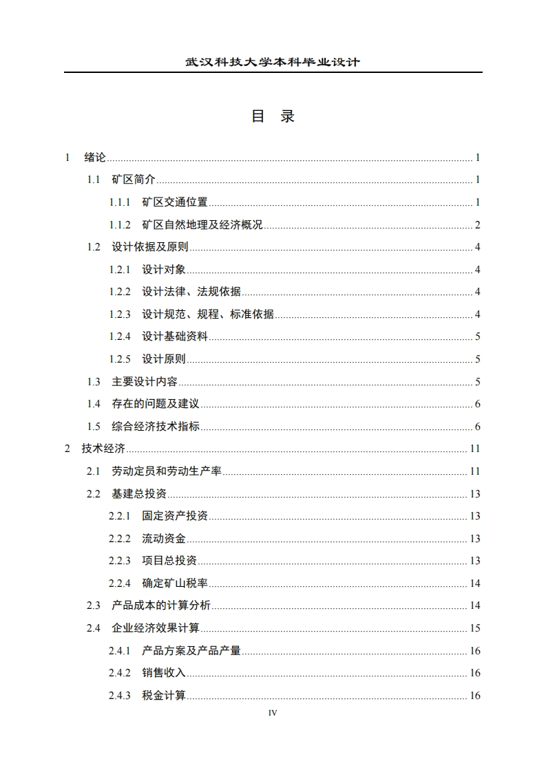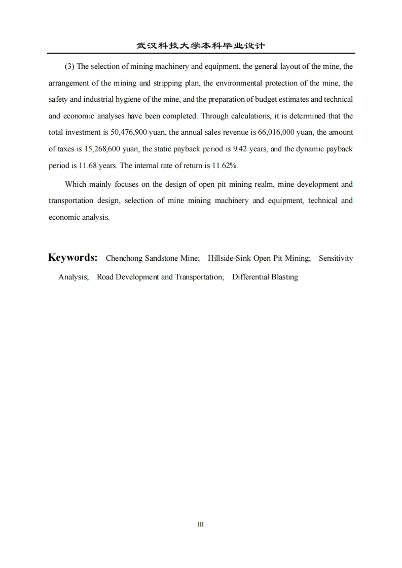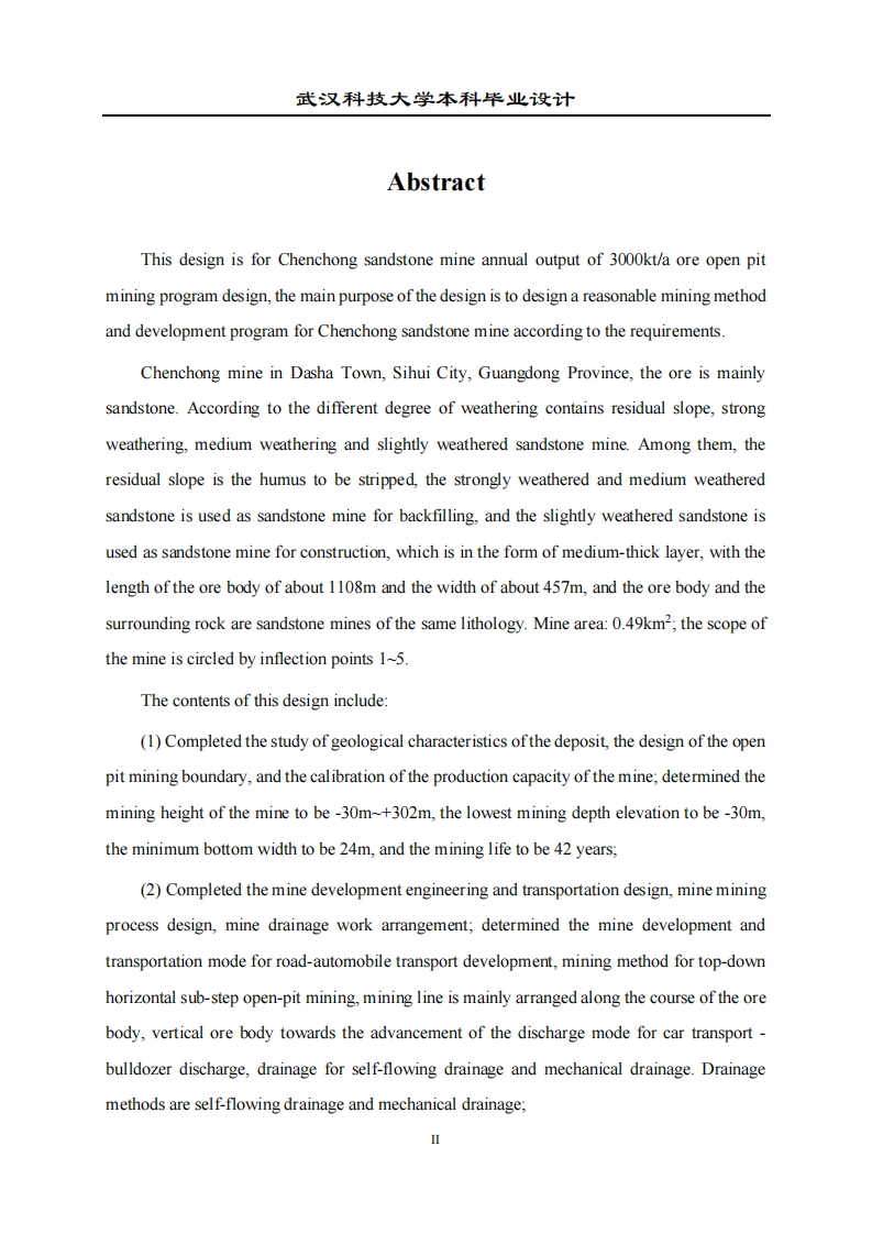 武汉科技大学本科毕业设计摘要本设计为陈冲砂岩矿年产3000kW矿石露天开采方案设计,设计的主要目的是根据要求为陈冲沙岩矿设计合理的开采方法和开拓方案。广东省四会市大沙镇陈冲矿区区内矿石主要为砂岩。根据风化程度不同包含残积坡、强风化、中风化和微风化砂岩矿。其中残积坡为需剥离的腐土,强风化和中风化砂岩用作回填用砂岩矿,微风化砂岩用作建筑用砂岩矿,其呈中厚层状,矿体长度约1108,宽约457m,矿体与围岩为同一岩性的砂岩矿。矿区面积:0.49m2:矿区范围由1~5号拐点圈闭。本设计的内容包括:(1)完成了矿床地质特征的研究、露天开采境界的设计、矿山生产能力校核:确定矿山开采高度为-30m~+302m,最低开采深度标高为-30m,确定最小底宽24m,开采年限为42年:(2)完成了矿山开拓工程及运输设计、矿山开采工艺设计、矿山排土排水工作安排:确定了本矿开拓运输方式为公路-汽车运输开拓,开采方法为自上而下水平分台阶露天开采,开采工作线主要沿矿体走向布置,垂直矿体走向推进,排土方式为汽车运输推土机排土,排水方式为自流排水和机械排水:(3)完成了矿山机械设备选型、矿山的总平面布置、矿岩采剥计划安排、矿山的环境保护、矿山安全与工业卫生、并进行概算的编制和技术经济分析等工作。通过计算,确定总投资为5047.69万元,达产年销售收入为6601.6万元,税金金额为1526.86万元,静态投资回收期为9.42年,动态投资回收期为11.68年。内部收益率为11.62%。其中主要以露天开采境界的设计、矿山开拓运输设计、矿山采矿机械设备的选型、技术经济分析为主。关键词:陈冲砂岩矿:山坡一凹陷露天矿开采:敏感性分析:公路开拓运输:微差爆破武汉科技大学本科毕业设计AbstractThis design is for Chenchong sandstone mine annual output of 3000kt/a ore open pitmining program design,the main purpose of the design is to design a reasonable mining methodand development program for Chenchong sandstone mine according to the requirements.Chenchong mine in Dasha Town,Sihui City,Guangdong Province,the ore is mainlysandstone.According to the different degree of weathering contains residual slope,strongweathering,medium weathering and slightly weathered sandstone mine.Among them,theresidual slope is the humus to be stripped,the strongly weathered and medium weatheredsandstone is used as sandstone mine for backfilling,and the slightly weathered sandstone isused as sandstone mine for construction,which is in the form of medium-thick layer,with thelength of the ore body of about 1108m and the width of about 457m,and the ore body and thesurrounding rock are sandstone mines of the same lithology.Mine area:0.49km2;the scope ofthe mine is circled by inflection points 1~5.The contents of this design include:(1)Completed the study of geological characteristics ofthe deposit,the design of the openpit mining boundary,and the calibration of the production capacity of the mine;determined themining height of the mine to be-30m~+302m,the lowest mining depth elevation to be-30m,the minimum bottom width to be 24m,and the mining life to be 42 years;(2)Completed the mine development engineering and transportation design,mine miningprocess design,mine drainage work arrangement;determined the mine development andtransportation mode for road-automobile transport development,mining method for top-downhorizontal sub-step open-pit mining,mining line is mainly arranged along the course of the orebody,vertical ore body towards the advancement of the discharge mode for car transport-bulldozer discharge,drainage for self-flowing drainage and mechanical drainage.Drainagemethods are self-flowing drainage and mechanical drainage;武汉科技大学本科毕业设计(3)The selection of mining machinery and equipment,the general layout of the mine,thearrangement of the mining and stripping plan,the environmental protection of the mine,thesafety and industrial hygiene of the mine,and the preparation of budget estimates and technicaland economic analyses have been comple