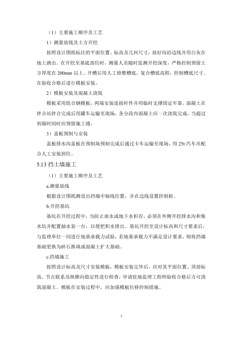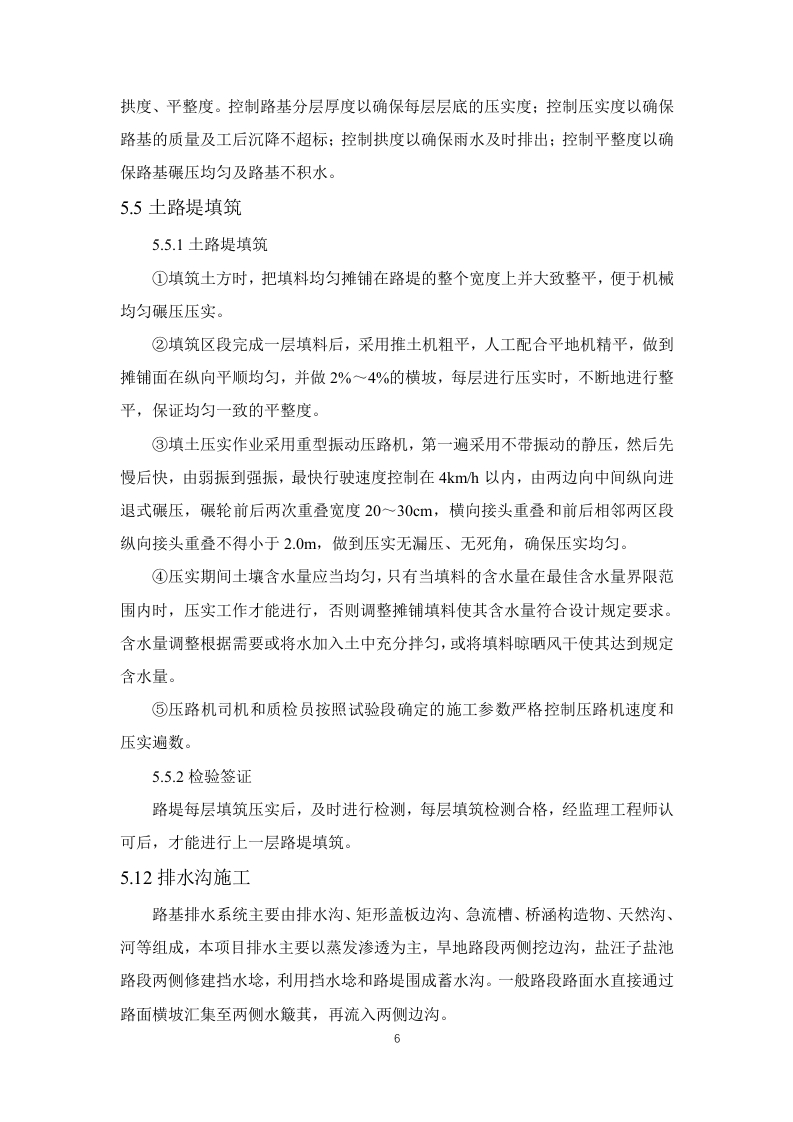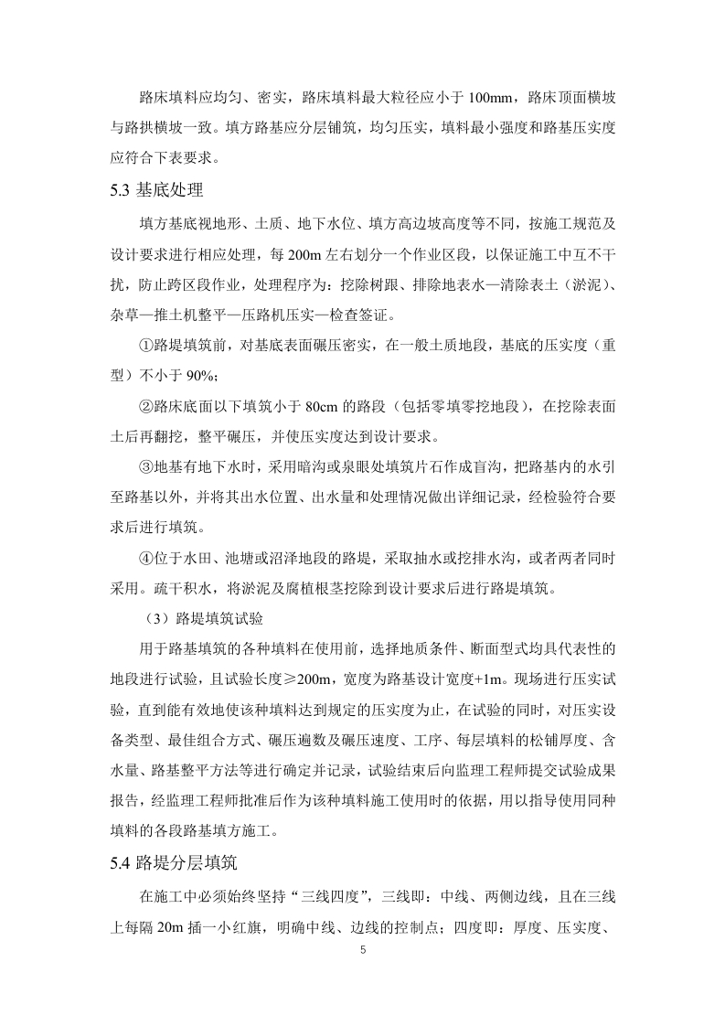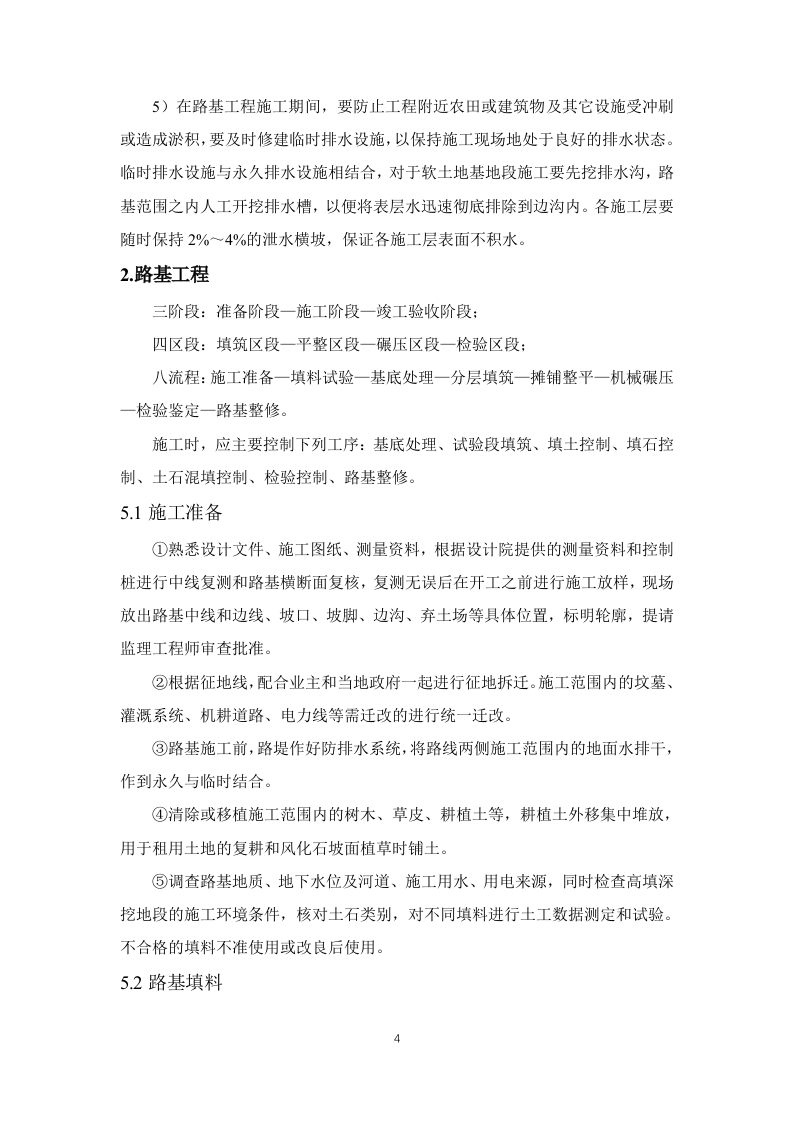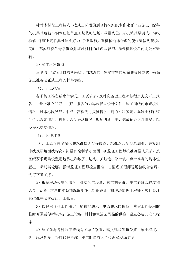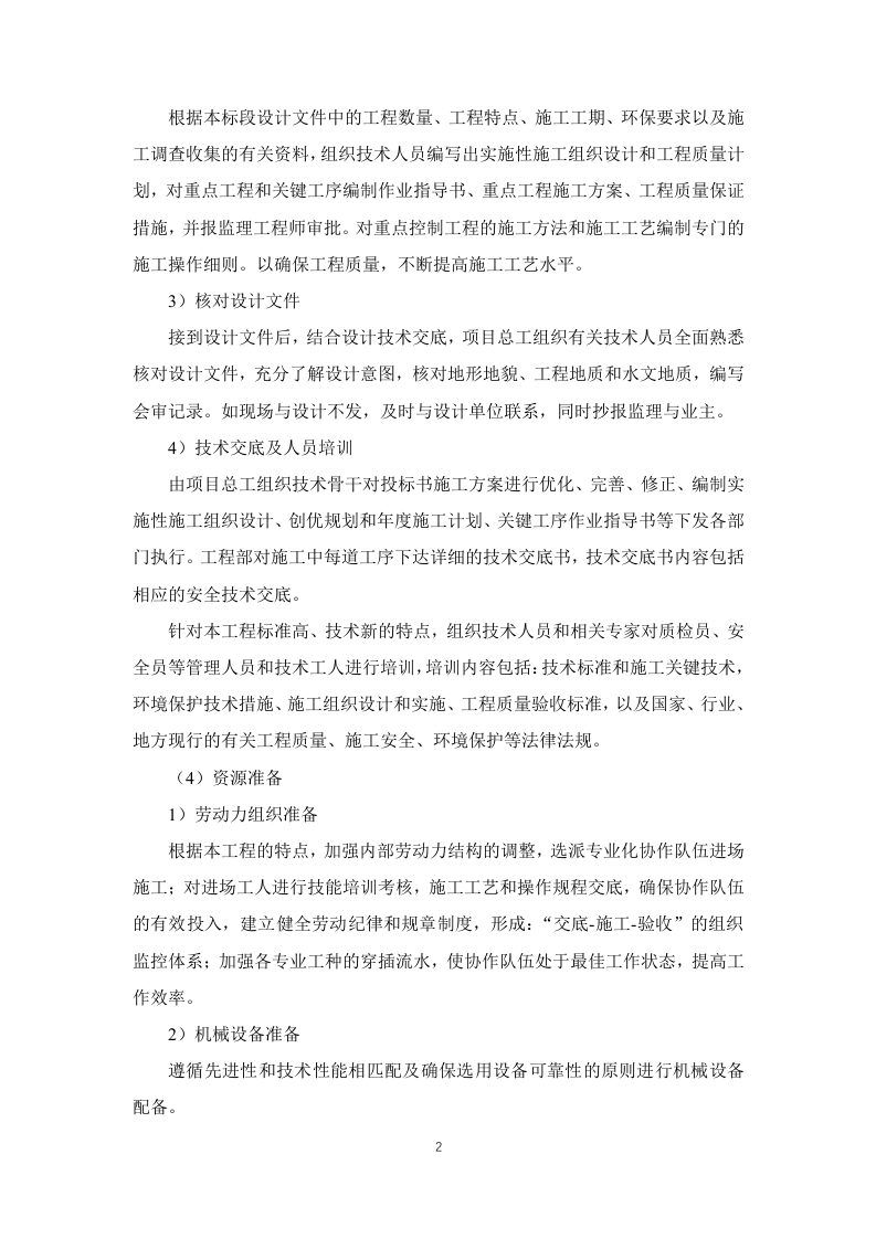 1.施工准备(2)施工前期准备项目经理部选派得力人员尽快与业主、地方政府、主管部门和相关的协作单位进行沟通,建立密切联系,消除施工障碍,疏通施工渠道,为施工创造一个和谐、融洽的内、外部环境。1)与业主和业主代表的协调项目经理部将向业主代表汇报工作情况,与业主和业主代表协商工作事项、商定议事规则及程序、确立例会制度。同时协助业主办理开工前的各项审批手续及落实现场施工条件。2)与地方有关部门的协调项目经理部还将积极主动的与当地公安、国土、交通、林业、环保、通信、水利、电力等部门取得联系,向他们通报情况,听取他们的意见,了解政府及主管部门的最新管理信息,按要求办理相关手续,制度相应的规章制度,取得当地政府及主管部门的支持、信任与配合。3)施工环境的协调做好施工现场周围环境的调查研究工作,掌握真实情况,增强工作的预见性、针对性和实效性,尽可能减少自然或人为不利因素的影响,为施工顺利进行创造条件。严格按照交通导行方案组织实施,做好安全警示标识及安全防护措施,封闭施工区域(3)施工技术准备1)施工测量项目经理部立即组织测量队和工程师按业主提供的施工设计资料,对平面控制网进行复测,并将复测成果按规定时间报送监理工程师。复测结果报经监理和业主批复后,组织定位放线,对路基工程、桥梁工程等布设精密导线网、水准网,埋设永久桩和护桩,确保本标段测量桩橛位置准确无误,满足标准规范的精度要求,并测量建设征地界。制定整个标段的测量计划和测量管理制度。2)施工工艺试验根据本标段设计文件中的工程数量、工程特点、施工工期、环保要求以及施工调查收集的有关资料,组织技术人员编写出实施性施工组织设计和工程质量计划,对重点工程和关键工序编制作业指导书、重点工程施工方案、工程质量保证措施,并报监理工程师审批。对重点控制工程的施工方法和施工工艺编制专门的施工操作细则。以确保工程质量,不断提高施工工艺水平。3)核对设计文件接到设计文件后,结合设计技术交底,项目总工组织有关技术人员全面熟悉核对设计文件,充分了解设计意图,核对地形地貌、工程地质和水文地质,编写会审记录。如现场与设计不发,及时与设计单位联系,同时抄报监理与业主。4)技术交底及人员培训由项目总工组织技术骨干对投标书施工方案进行优化、完善、修正、编制实施性施工组织设计、创优规划和年度施工计划、关键工序作业指导书等下发各部门执行。工程部对施工中每道工序下达详细的技术交底书,技术交底书内容包括相应的安全技术交底。针对本工程标准高、技术新的特点,组织技术人员和相关专家对质检员、安全员等管理人员和技术工人进行培训,培训内容包括:技术标准和施工关键技术,环境保护技术措施、施工组织设计和实施、工程质量验收标准,以及国家、行业、地方现行的有关工程质量、施工安全、环境保护等法律法规。(4)资源准备1)劳动力组织准备根据本工程的特点,加强内部劳动力结构的调整,选派专业化协作队伍进场施工:对进场工人进行技能培训考核,施工工艺和操作规程交底,确保协作队伍的有效投入,建立健全劳动纪律和规章制度,形成:“交底-施工-验收”的组织监控体系:加强各专业工种的穿插流水,使协作队伍处于最佳工作状态,提高工作效率。2)机械设备准备遵循先进性和技术性能相匹配及确保选用设备可靠性的原则进行机械设备配备。针对本标段工程特点,按施工区段的划分情况组织多作业面平行施工,配备的机具及运输车辆保证按节点工期按时进场,尽量到位,对机械及早调试、彻底检修,保证上场机具性能完好。对于重型和大型机械选择合理的便道运输到现场。同时,落实好设备专项资金并抓好材料的组织与管理,确保机具设备的高效率运转。3)施工材料准备尽早与厂家签订自购料采购合同或意向,确定材料的运输和交付方式,确保施工准备及正式工程的材料供应。(5)开工报告各项施工准备结束并满足开工要求后,及时向监理工程师按程序提交开工报告,一经批准立即开工。开工报告的内容包括对设计文件、施工图纸的审查核对情况,对本标段导线、中线、高程进行复测情况,对原材料鉴定、混凝土和砂浆配合比选定情况,机具、人员进场情况,现场四通一平、完成征地拆迁情况,以及技术交底情况。(6)其他准备1)开工之前用全站仪和水准仪进行导线点、水准点的复测及加密,并复测中线及原地面线标高,测量和绘制横断面图。在监理工程师核准测量成果后,按图纸要求现场设置用地界桩和坡脚、边沟、护坡道、取土坑、弃土堆等的具体位置桩,标明其轮廓,报请监理工程师检查批准,由监理工程师现场验收合格后,进行下道工序。2)根据现场收集的情况,核实的工程量,按工期要求、施工的难易程度和人员、设备、材料的准备情况编制施工组织设计,报现场监理工程师和项目经理部批准并及时提出开工报告。3)修建生活和工程用房,解决好通风、电力和水的供应,修建工程使用的临时便道或便桥以保证施工设备、材料和生活必需品的供应,设立必要的安全标志。4)施工前与各种地下管线有关单位联系、落实现状管道位置、覆土深度,进行现场刨验,采取保护措施。施工时请有关单位派员现场监护。5)在路基工程施工期间,要防