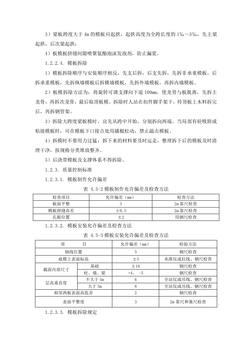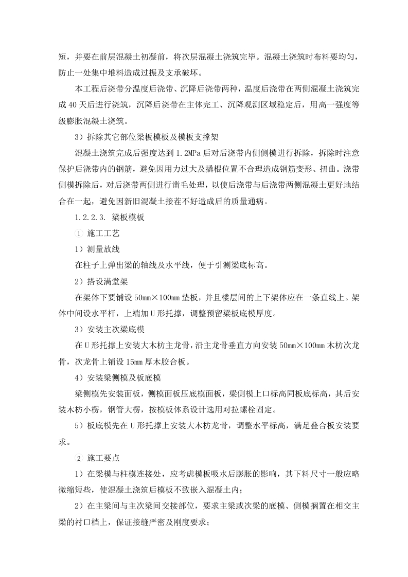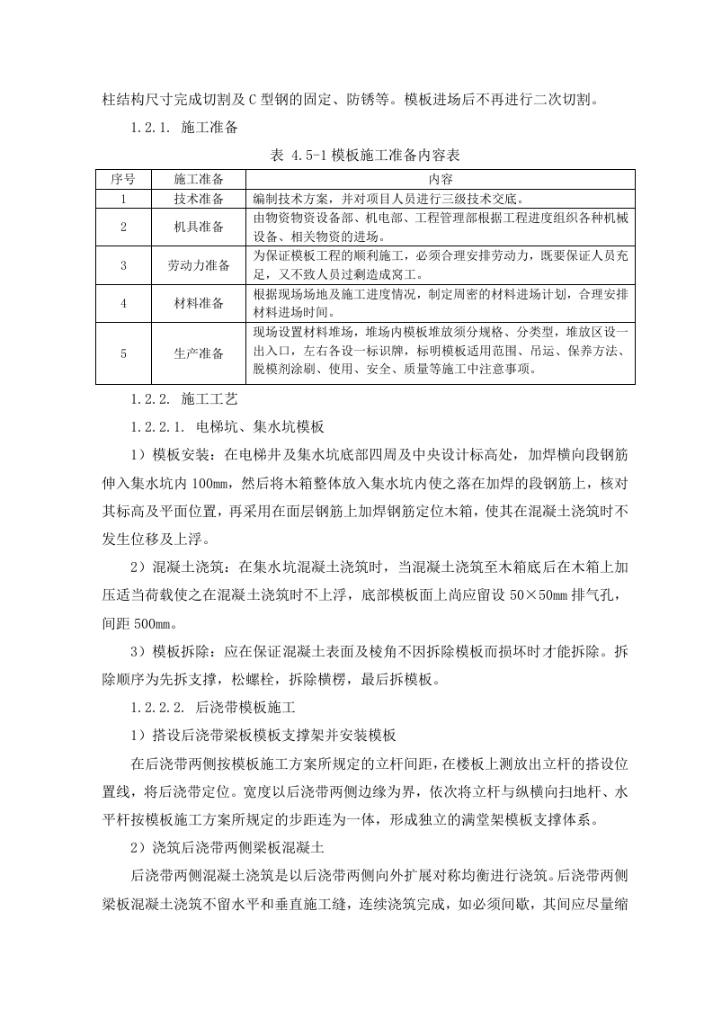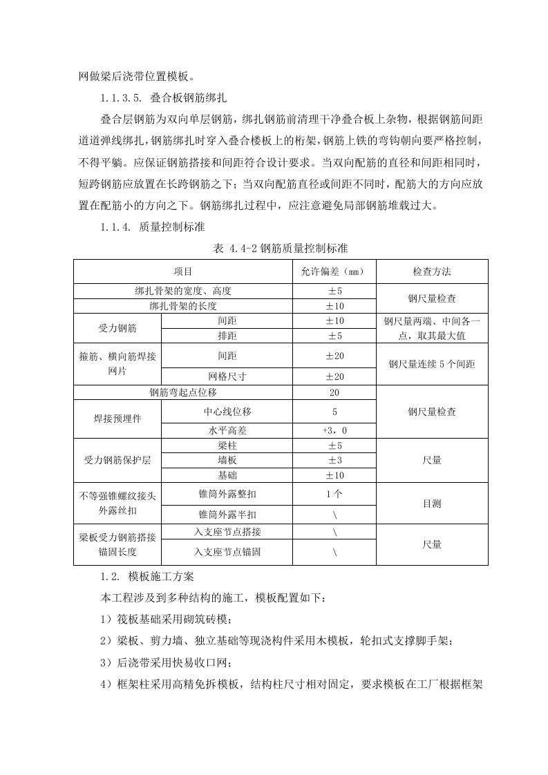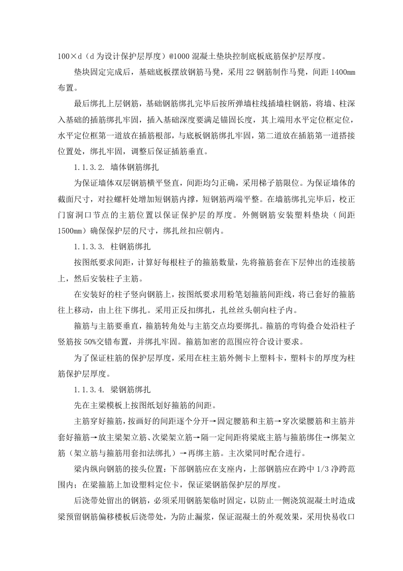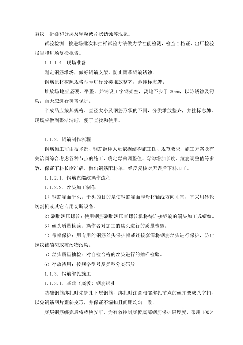 1.1.钢筋施工方案1.1.1.施工准备1.1.1.1.技术准备(1)项目技术部编制钢筋施工方案,对钢筋施工进行详细说明。施工前根据施工合同、施工图纸、设计变更、图纸会审记录及施工组织设计对现场施工管理人员进行技术交底。(2)组织相关人员学习相应国家施工及验收规范标准及图集,解决施工中存在的重难点,组织各片区工长对施工作业班组进行分项工程质量交底和安全交底,明确施工方法、施工方案编制意图及质量检验标准,为现场施工做好准备。(3)钢筋翻样做到与现场施工相结合,编制成统一料单,以便后台制作和钢筋绑扎。1.1.1.2.机具准备表4.4-1钢筋主要施工机具序号设备名称型号数量制造功率生产用于施规格年份(KW)能力工部位主体钢筋调直机CT6-12220185.5正常结构主体2钢筋弯曲机GW40220183正常结构主体3钢筋切断机GQ402220201.5正常结构主体直螺纹套丝机GX-4022019正常结构主体电焊机BX-300201923.4正常结构主体6电焊机BX-500201938正常结构1.1.1.3.材料准备钢筋进场要具有产品合格证和出厂检验报告。钢筋进场由材料员、质检员、专业工长共同验收,并委托试验员分批量取样做重量偏差检验和力学性能分析检验。当发现钢筋脆断,焊接性能不良和机械性能显著不正常时,还应进行钢筋化学成分分析。钢筋取样:同一厂别、同一炉罐号、同一规格、同一交货状态每≤60t为一验收批。进场验收:钢筋进场首先做外观检查,检查钢材表面质量,不应有油污、结疤、裂纹、折叠和分层及颗粒或片状锈蚀等现象。试验检测:按进场批次和抽样试验方法做力学性能检测,检查合格证、出厂检验报告和进场复检报告。1.1.1.4.现场准备划定钢筋堆场,做好钢筋支架,防止雨季钢筋锈蚀钢筋原材按照规格型号进行分类堆放整齐,悬挂标志牌。堆放场地应坚硬、平整,并铺设工字钢架空,离地不少于20cm,以防锈蚀及污染,雨天应进行覆盖保护。半成品应按其规格、直径大小及钢筋形状的不同,分类堆放整齐,并挂标志牌,现场应做到整洁清晰,便于查找和使用。1.1.2.钢筋制作流程钢筋加工前由技术部、钢筋翻样人员依据结构施工图、规范要求、施工方案及有关洽商综合考虑各种节点的施工,确定弯曲调整值、弯钩增加长度、箍筋调整值等参数,保证下料长度准确,做出钢筋配料单,经反复核对无误后下料加工。1.1.2.1.钢筋直螺纹操作流程1.1.2.2.丝头加工制作1)钢筋端面平头:平头的目的是使钢筋端面与母材轴线方向垂直,宜采用砂轮切割机或其它专用切断设备。2)剥肋滚压螺纹:使用钢筋剥肋滚压直螺纹机将待连接钢筋的端头加工成螺纹。3)丝头质量检验:操作者对加工的丝头进行的质量检验。4)带帽保护:用专用的钢筋丝头保护帽或连接套简将钢筋丝头进行保护,防止螺纹被磕碰或被污物污染。5)丝头质量抽检:对自检合格的丝头进行的抽样检验。6)存放待用:按规格型号及类型分类码放。1.1.3.钢筋绑扎施工1.1.3.1.基础(底板)钢筋绑扎基础钢筋绑扎时先绑扎下层钢筋,绑扎时注意相邻绑扎节点的丝扣要成八字扣,以免钢筋网片歪斜变形,并保证不漏扣且间距均匀一致。底层钢筋绑完后将垫块安牢,为有效控制底板底部钢筋保护层厚度,采用100×100×d(d为设计保护层厚度)@1000混凝土垫块控制底板底筋保护层厚度。垫块固定完成后,基础底板摆放钢筋马凳,采用22钢筋制作马凳,间距1400mm布置。最后绑扎上层钢筋,基础钢筋绑扎完毕后按所弹墙柱线插墙柱钢筋,将墙、柱深入基础的插筋绑扎牢固,插入基础深度要满足锚固长度,其上端用水平定位框定位,水平定位框第一道放在插筋根部,与底板钢筋绑扎牢固,第二道放在插筋第一道搭接位置处,绑扎牢固,调整后保证插筋垂直。1.1.3.2.墙体钢筋绑扎为保证墙体双层钢筋横平竖直,间距均匀正确,采用梯子筋限位。为保证墙体的截面尺寸,对拉螺杆处增加短钢筋内撑,短钢筋两端平整。在墙筋绑扎完毕后,校正门窗洞口节点的主筋位置以保证保护层的厚度。外侧钢筋安装塑料垫块(间距1500mm)确保保护层的尺寸,绑扎丝扣应朝内。1.1.3.3.柱钢筋绑扎按图纸要求间距,计算好每根柱子的箍筋数量,先将箍筋套在下层伸出的连接筋上,然后安装柱子主筋。在安装好的柱子竖向钢筋上,按图纸要求用粉笔划箍筋间距线,将已套好的箍筋往上移动,由上往下绑扎。采用正反扣绑扎,扎丝丝头朝向柱子内。箍筋与主筋要垂直,箍筋转角处与主筋交点均要绑扎。箍筋的弯钩叠合处沿柱子竖筋按50%交错布置,并绑扎牢固。箍筋加密的范围应符合设计要求。为了保证柱筋的保护层厚度,采用在柱主筋外侧卡上塑料卡,塑料卡的厚度为柱筋保护层厚度。1.1.3.4.梁钢筋绑扎先在主梁模板上按图纸划好箍筋的间距。主筋穿好箍筋,按画好的间距逐个分开→固定腰筋和主筋→穿次梁腰筋和主筋并套好箍筋→放主梁架立筋、次梁架立筋一→隔一定间距将梁底主筋与箍筋绑住→绑架立筋(架立筋与箍筋用套扣法绑扎)→再绑主筋。主次梁同时配合进行。梁内纵向钢筋的接头位置:下部钢筋应在支座内,上部钢筋应在跨中1/3净跨范围内:在梁箍筋上加设塑料定位卡,保证梁钢筋保护层的厚度。后浇带处留出的钢筋,必须采用钢筋架临时固定,以防止一侧浇筑混凝土时造成梁预留钢筋偏移楼板后浇带处,为防止漏浆,保证混凝土的外观效果,采用快易收口网做梁后浇带位置模板。1.1.3.5.叠合板钢筋绑扎叠合层钢筋为双向单