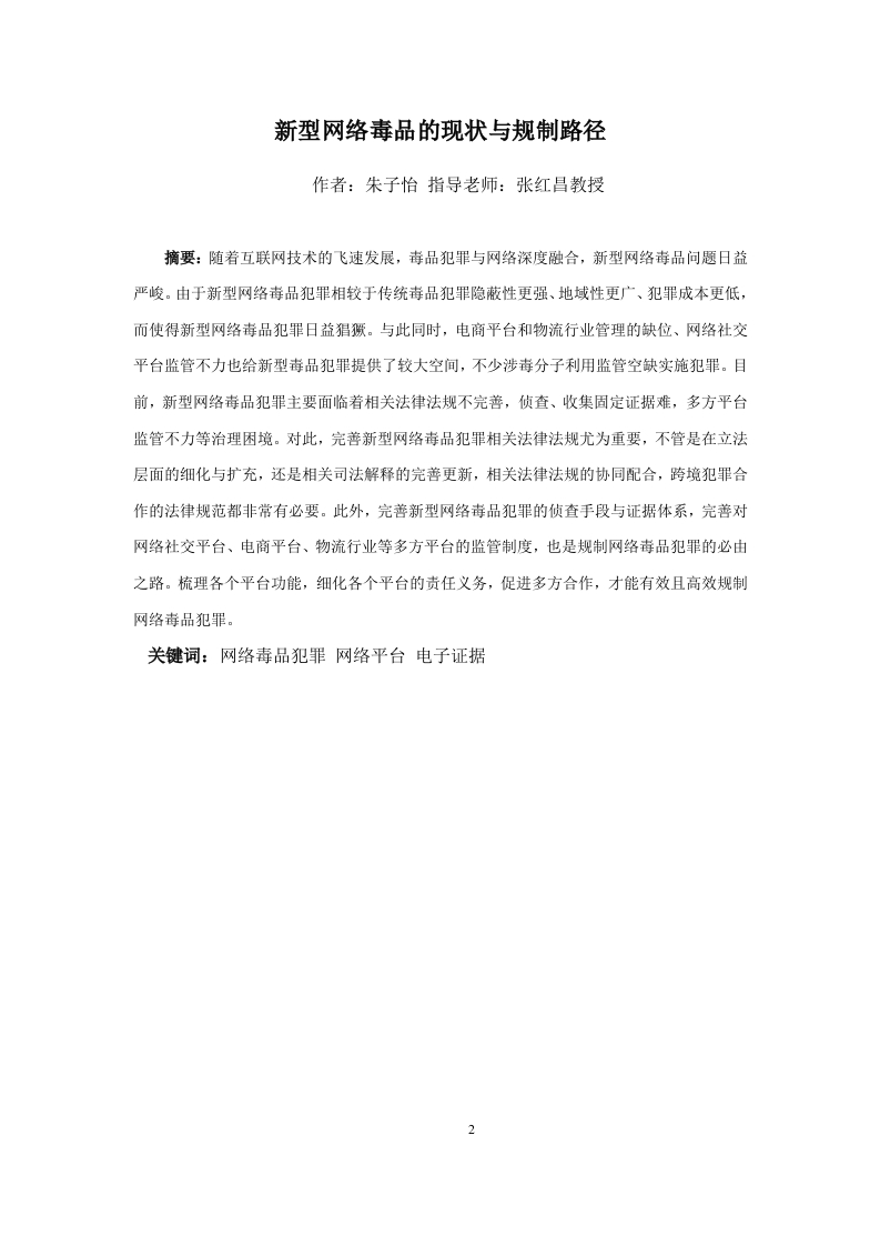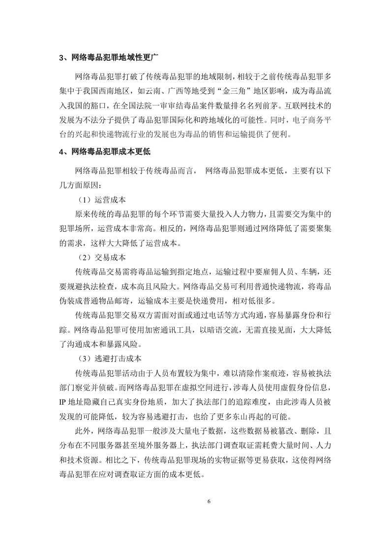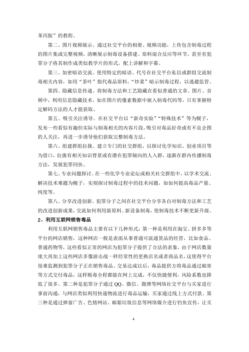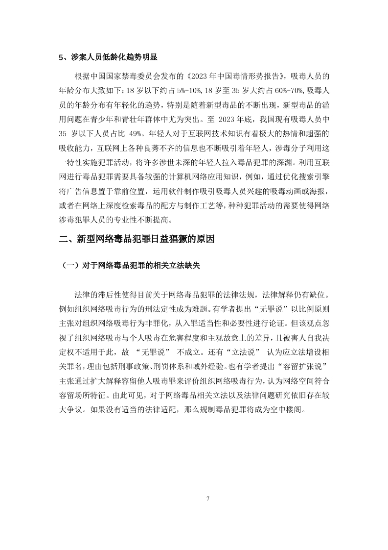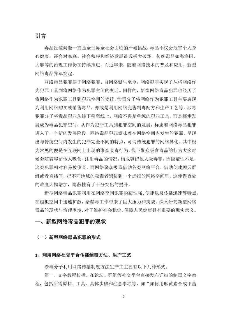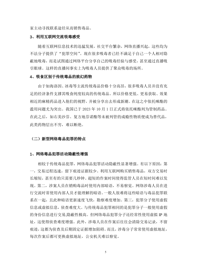 目录引信.3一、新型网络毒品犯罪的现状.3(一)新型网络毒品犯罪的形式3(二)新型网络毒品犯罪的特点.5二、新型网络毒品犯罪日益猖獗的原因.7(一)对于网络毒品犯罪的相关立法缺失(二)网络监管制度缺位.8(三)新型网络毒品犯罪固定证据难.…10三、新型网络毒品犯罪的规制路径.10(一)完善新型网络毒品犯罪相关案件的法律法规.10(二)完善对网络社交平台、电商平台、物流行业的监管制度..12(三)完普新型网络毒品犯罪的证据体系.13结语14参考文献.14新型网络毒品的现状与规制路径作者:朱子怡指导老师:张红昌教授摘要:随着互联网技术的飞速发展,毒品犯罪与网络深度融合,新型网络毒品问题日益严峻。由于新型网络毒品犯罪相较于传统毒品犯罪隐蔽性更强、地域性更广、犯罪成本更低,而使得新型网络毒品犯罪日益猖獗。与此同时,电商平台和物流行业管理的缺位、网络社交平台监管不力也给新型毒品犯罪提供了较大空间,不少涉毒分子利用监管空缺实施犯罪。目前,新型网络毒品犯罪主要面临着相关法律法规不完善,侦查、收集固定证据难,多方平台监管不力等治理困境。对此,完善新型网络毒品犯罪相关法律法规尤为重要,不管是在立法层面的细化与扩充,还是相关司法解释的完善更新,相关法律法规的协同配合,跨境犯罪合作的法律规范都非常有必要。此外,完善新型网络毒品犯罪的侦查手段与证据体系,完善对网络社交平台、电商平台、物流行业等多方平台的监管制度,也是规制网络毒品犯罪的必由之路。梳理各个平台功能,细化各个平台的责任义务,促进多方合作,才能有效且高效规制网络毒品犯罪。关键词:网络毒品犯罪网络平台电子证据引言毒品泛滥问题一直是全世界全社会面临的严峻挑战,毒品不仅会危害个人身心健康,还会对家庭、社会秩序和经济发展造成极大破坏。传统毒品如海洛因、大麻等的治理工作仍在持续推进,而近年来,随着网络技术的普及和应用,新型网络毒品异军突起。网络毒品犯罪属于网络犯罪。自网络诞生至今,网络犯罪实现了从将网络作为犯罪工具到将网络作为犯罪空间的变迁。同样的,新型网络毒品犯罪也经历了将网络作为犯罪工具到犯罪空间的变迁。涉毒分子将网络作为犯罪工具主要表现为利用网络购买或销售毒品,亦或是利用网络兜售制毒配方和生产工艺等。涉毒犯罪分子将毒品犯罪从线下移至线上,网络不再是单纯的犯罪工具,而是逐步发展成为毒品犯罪空间,从作为犯罪工具到犯罪空间的发展,标志着网络毒品犯罪进入了一个新的发展阶段。网络毒品犯罪意味着在网络空间内发生的犯罪,呈现出与传统空间内发生的犯罪完全不同的特点,可谓传统犯罪的网络异化。其中极为常见的便是在互联网上出现的聚众吸毒行为,线下聚众吸食毒品的行为大多时候会随着容留他人吸食、注射毒品的情况,构成容留他人吸毒罪,因隐蔽性不足,这类犯罪相对容易被侦查,而网络聚众吸毒借助各类网络平台,借助创建聊天群组或者直播间,把不同地域的吸毒者聚集到一个虚拟的网络空间里,这使得查处的难度大幅增加,隐蔽性有了十分突出的提升。新型网络毒品犯罪利用在网络空间犯罪隐蔽性强、便捷以及传播迅速等特点,在虚拟空间中迅速扩散,给禁毒工作带来了巨大压力和挑战。深入研究新型网络毒品的现状与治理困境,对于维护社会稳定、保障人民健康具有重要的现实意义。一、新型网络毒品犯罪的现状(一)新型网络毒品犯罪的形式1、利用网络社交平台传播制毒方法、生产工艺涉毒分子利用网络传播制度方法生产工主要有以下几种形式:第一、文字教程传播。在论坛、群组等社交平台直接发布详细的制毒文字教程,包括所需原料、工具、具体步骤和注意事项等,如“如何用麻黄素合成甲基3苯丙胺”的教程。第二、图片视频展示。通过社交平台的相册、视频功能,上传包含制毒过程的图片集或完整视频,清晰展示制毒设备搭建、原料混合反应等环节,甚至有犯罪分子将其制作成类似教学片的形式,配上讲解和字幕。第三、加密暗语交流。使用特定的暗语、代号在社交平台私信或群组交流制毒相关内容,如用“茶叶”指代毒品原料,“炒菜”暗示制毒过程,以逃避监管。第四、隐藏信息传递。将制毒方法和工艺隐藏在看似普通的文章、图片、音频中,利用信息隐藏技术,如在图片的像素数据中嵌入制毒代码等,只有掌握特定解码方法的人才能获取。第五、吸引关注诱导。在社交平台以“新奇实验”“特殊技术”等为幌子,发布一些看似有趣但实际与制毒相关的内容片段,吸引对毒品好奇或有不良企图的人关注,再进一步诱导他们获取完整制毒方法。第六、组建群组拉拢。建立专门的社交群组,以探讨化学知识、创业项目等为借口,拉拢有相关知识背景或有潜在犯罪倾向的人入群,逐渐在群内传播制毒方法,发展犯罪同伙。第七、专业问题探讨。在一些化学专业论坛或相关社交群组中,以学术交流、解决技术难题为幌子,实则探讨制毒过程中的技术问题,如如何提高毒品产量、纯度等。第八、分享改进创新。犯罪分子之间在社交平台分享各自对制毒方法和工艺的改进创新成果,交流如何利用新原料、新设备制毒,使制毒技术不断更新升级。2、利用互联网销售毒品利用互联网销售毒品主要有以下几种形式:第一种是利用在淘宝、