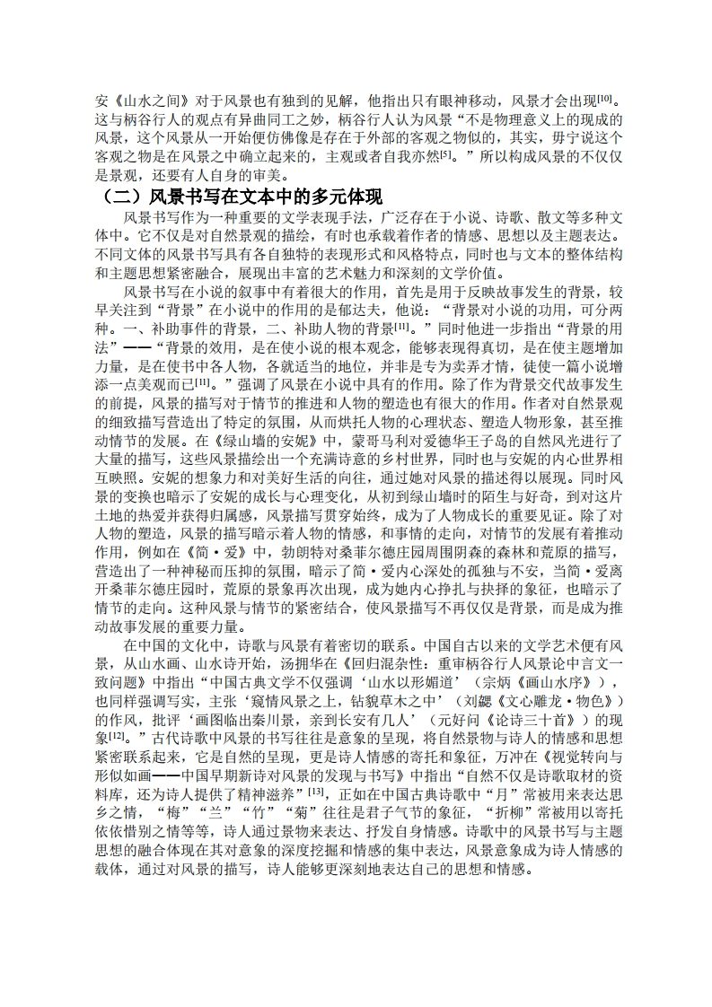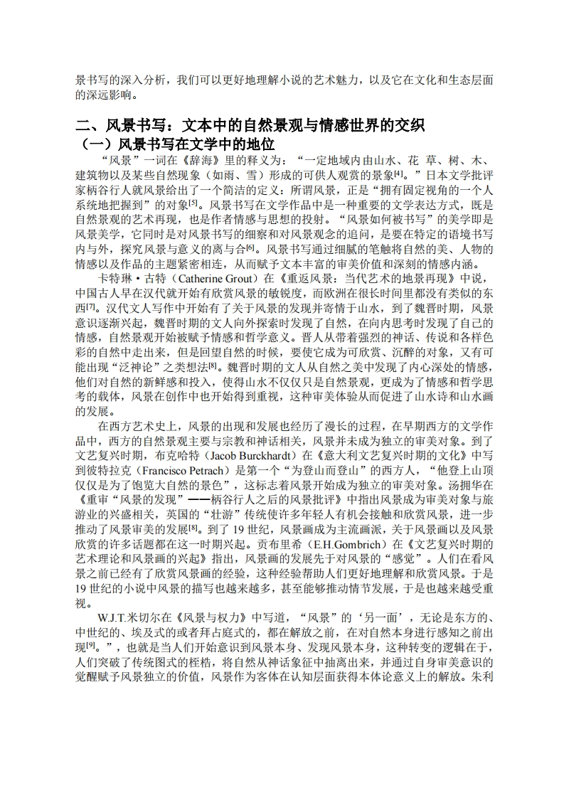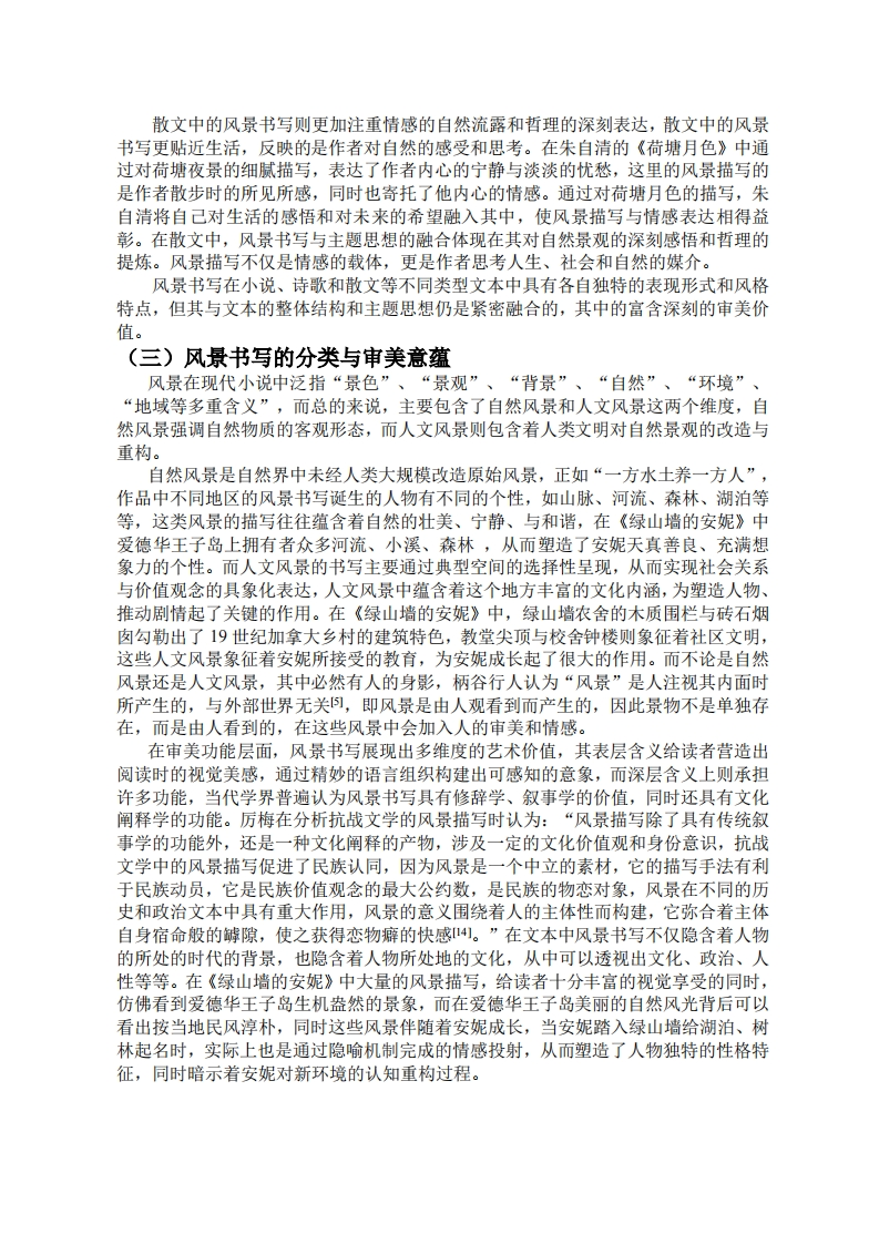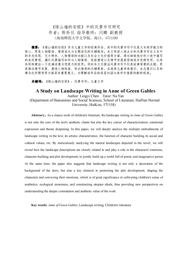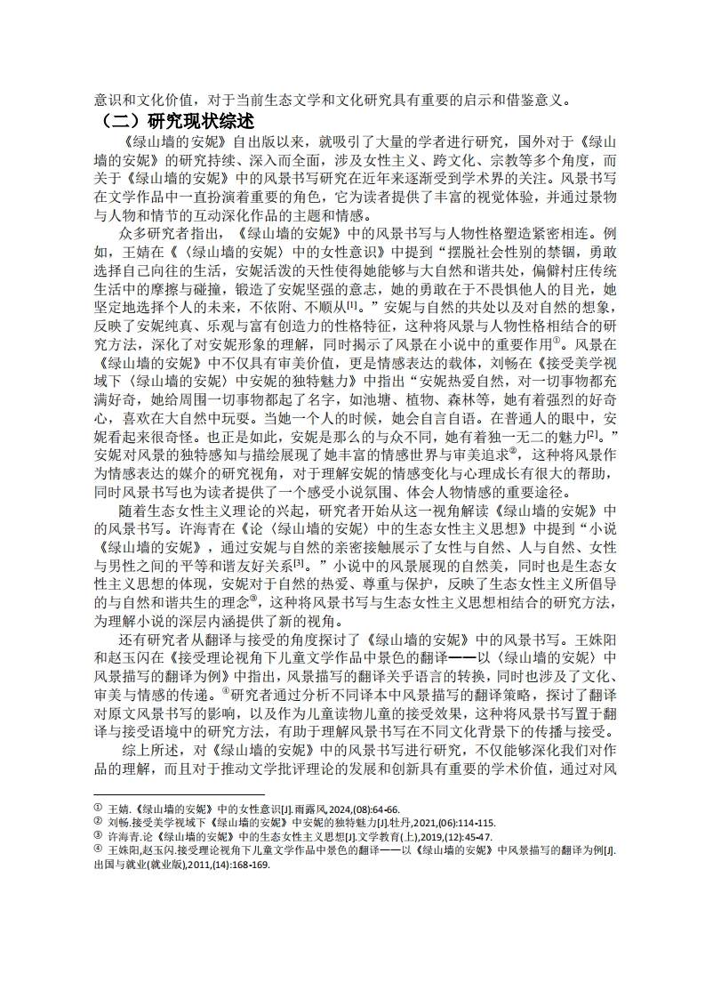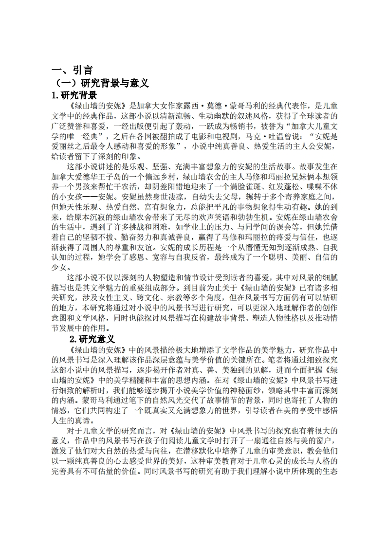 目录一、引言.(一)研究背景与意义5(二)研究现状综述..........二、风景书写:文本中的自然景观与情感世界的交织..0…7(一)风景书写在文学中的地位...…7(二)风景书写在文本中的多元体现...............8(三)风景书写的分类与审美意蕴......…·9三、《绿山墙的安妮》风景书写的艺术特色与人物塑造功能分析..10(一)风景书写的艺术特色解析..........10(二)风景书写与安妮性格塑造的关联......10(三)风景书写在人物关系构建中的角色..·12四、《绿山墙的安妮》风景书写的社会文化价值.·.13(一)风景书写对儿童审美的培养..........13(二)《绿山墙的安妮》中的乌托邦理想........14五、结论.…14参考文献......15致谢.....16《绿山墙的安妮》中的风景书写研究作者:陈羚仪指导教师:闫娜副教授(海南师范大学文学院,海口,571158)精要:《绿山墙的安妮》作为儿童文学的经典作品,其中的风景书写不仅是文本美学魅力的核心,更是人物塑造、情感表达与主题深化的关键载体。本文将深入地去分析风景书写在文本中的多元体现、艺术特色、人物塑造的功能以及社会文化价值等方面,通过细致地分析小说中描写的自然景观,揭示风景描写如何与人物情感、性格塑造以及情节发展紧密相连并发挥作用,从而共同构建出一个充满诗意与想象力的世界。同时本文还提出风景书写不仅是故事背景的点缀,更是推动情节发展、塑造人物性格、传达情感的关键要素,在培养儿童审美意识、生态意识以及构建乌托邦理想等方面具有重要意义,为理解该作品的深层内涵与美学价值提供新的视角。关健词:《绿山墙的安妮》;风景书写;儿童文学A Study on Landscape Writing in Anne of Green GablesAuthor:Lingyi Chen Tutor:Na Yan(Department of Humanities and Social Sciences,School of Literature,HaiNan NormalUniversity,HaiKou,571158)Abstract::As a classic work of children's literature,the landscape writing in Anne of Green Gablesis not only the core of the text's aesthetic charm but also the key carrier of characterization,emotionalexpression and theme deepening.In this paper,we will deeply analyze the multiple embodiments oflandscape writing in the text,its artistic characteristics,the function of character building its social andcultural values,etc.By meticulously analyzing the natural landscapes depicted in the novel,we willreveal how the landscape descriptions are closely related to and play a role in the characters'emotions,character building and plot development,to jointly build up a world full of poetic and imaginative power.At the same time,the paper also suggests that landscape writing is not only a decoration of thebackground of the story,but also a key element in promoting the plot development,shaping thecharacters and conveying their emotions,which is of great significance in cultivating children's sense ofaesthetics,ecological awareness,and constructing utopian ideals,thus providing new perspectives onunderstanding the deeper connotation and aesthetic value of the work.Key words:Anne of Green Gables;Landscape writing Children's literature一、引言(一)研究背景与意义1.研究背景《绿山墙的安妮》是加拿大女作家露西·莫德·蒙哥马利的经典代表作,是儿童文学中的经典作品,这部小说以清新流畅、生动幽默的叙述风格,获得了全球读者的广泛赞誉和喜爱,一经出版便引起了轰动,一跃成为畅销书,被誉为“加拿大儿童文学的唯一经典”,之后在各国被翻拍成了电影和电视剧,马克·吐温曾说:“安妮是爱丽丝之后最令人感动和喜爱的形象”,小说中纯真善良、热爱生活的主人公安妮,给读者留下了深刻的印象。这部小说讲述的是乐观、坚强、充满丰富想象力的安妮的生活故事。故事发生在加拿大爱德华王子岛的一个偏远乡村,绿山墙农舍的主人马修和玛丽拉兄妹俩本想领养一个男孩来帮忙干农活,却阴差阳错地迎来了一个满脸雀斑、红发蓬松、喋喋不休的小女孩一一安妮。安妮虽然身世凄凉,自幼失去父母,辗转于多个寄养家庭之间,但她天性乐观、热爱自然、富有想象力,总能把平凡的事物想象得生动有趣。她的到来,给原本沉寂的绿山墙农舍带来了无尽的欢声笑语和勃勃生机。安妮在绿山墙农舍的生活中,遇到了许多挑战和困难,如学业上的压力、与同学间的误会等,但她凭借着自己的坚韧不拔、勤奋努力和真诚善良,赢得了马修和玛丽拉的疼爱与信任,也逐渐获得了周围人的尊重和友谊。安妮的成长历程是一个从懵懂无知到逐渐成熟、自我认知的过程,她学会了感恩、宽容与自我反省,最终成为了一个聪明、美丽、自信的少女。这部小说不仅以深刻的人物塑造和情节设计受到读者的喜爱,其中对风景的细腻描写也是其文学魅力的重要组成部分。到目前为止关于《绿山墙的安妮》已有诸多相关研究,涉及女性主义、跨文化、宗教等多个角度,但在风景书写方面仍有可以钻研的地方,本研究将通过对小说中的风景书写进行研究,可以更深入地理解作者的创作意图和文学风格,同时也能探讨风景描写在构建故事背景、塑造人物性格以及推动情节发展中的作用。2.研究意义《绿山墙的安妮》中的风景描绘极大地增添了文学作品的美学魅力,研究作品中的风景书写是深入理解该作品深层意蕴与美学价值的关键所在。笔者将通