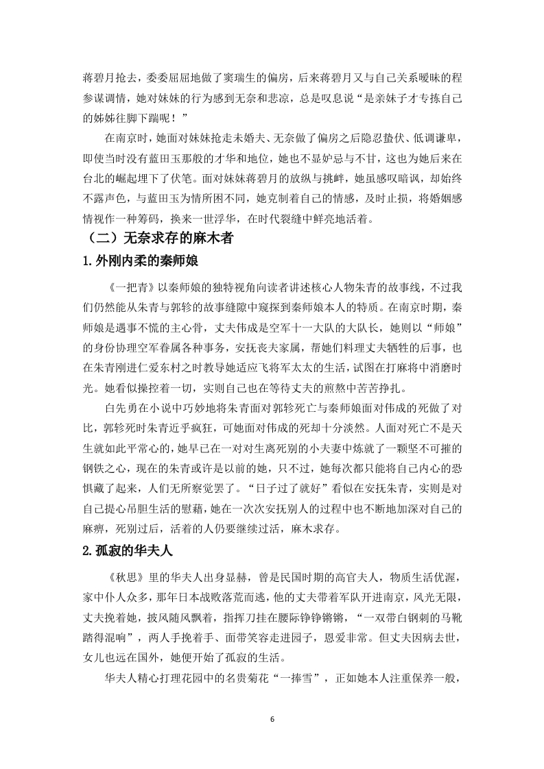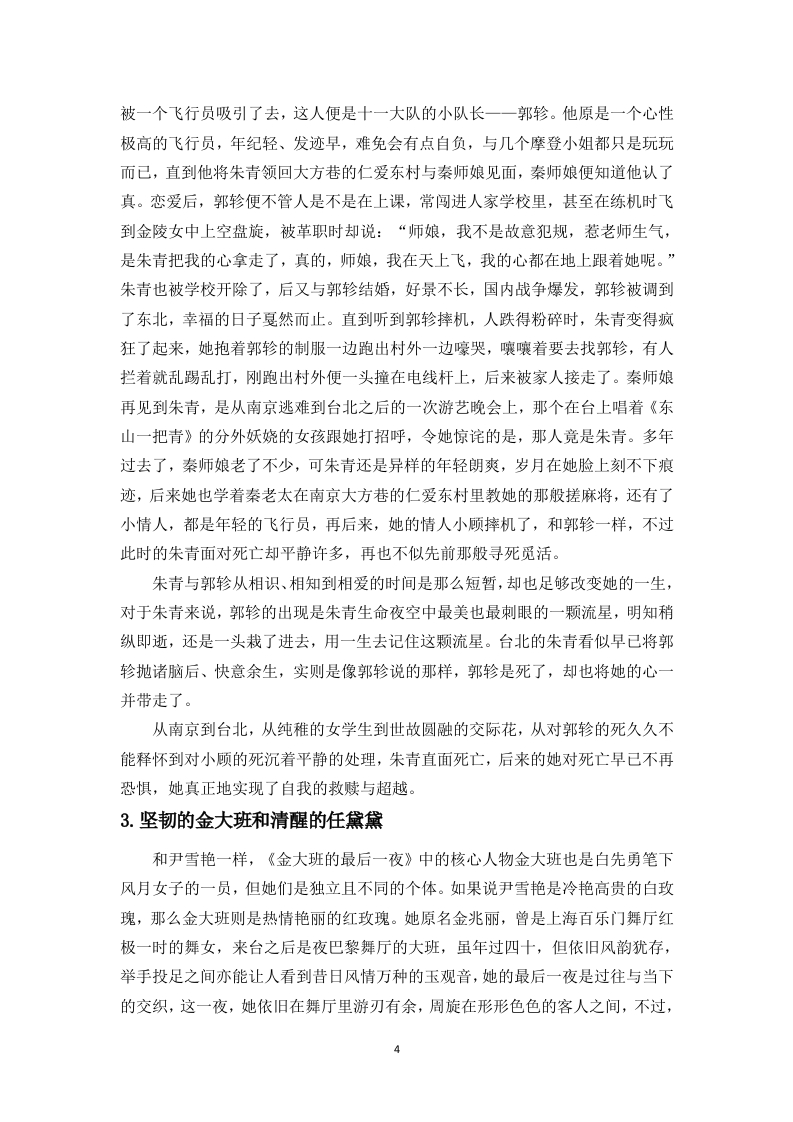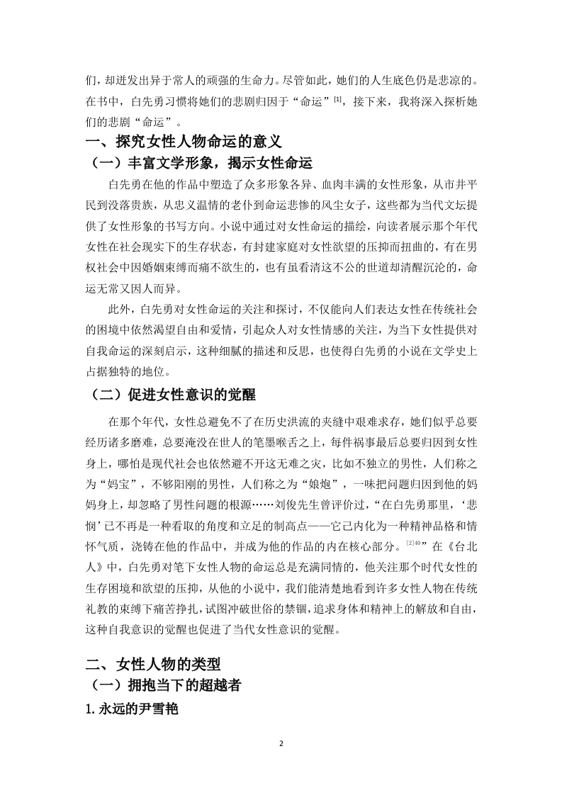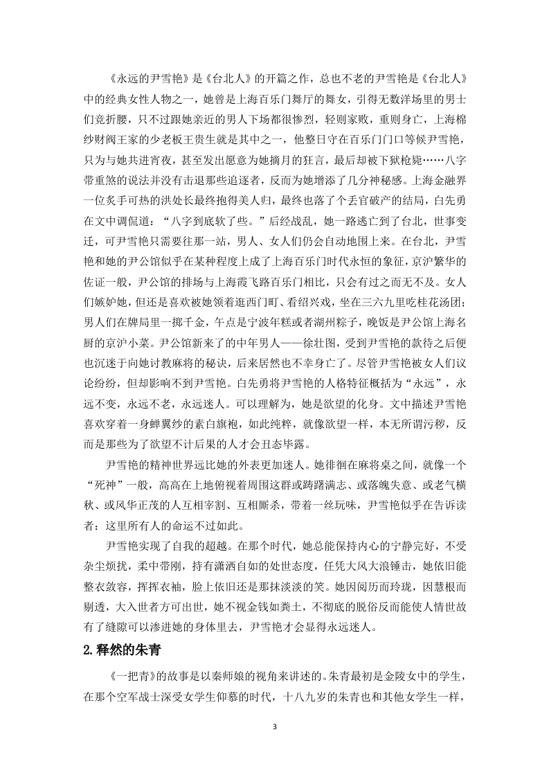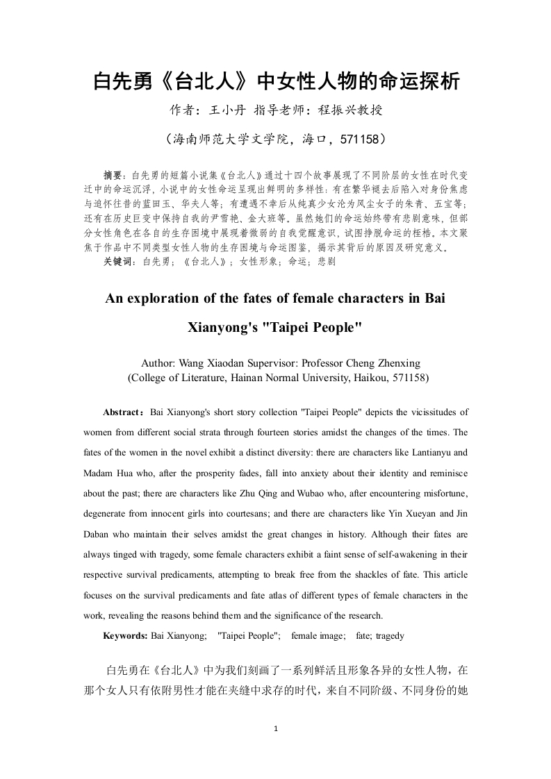 白先勇《台北人》中女性人物的命运探析目录一、探究女性人物命运的意义……2二、女性人物的类型……2(一)拥抱当下的超越者…*…2(二)无奈求存的麻木者…(三)拥护自我的利己者…(四)命运捉弄的可怜人…7三、女性人物命运形成的原因分析…10参考文献……12致谢……12白先勇《台北人》中女性人物的命运探析作者:王小丹指导老师:程振兴教授(海南师范大学文学院,海口,571158)摘要:白先勇的短篇小说集《台北人》通过十四个故事展现了不同阶层的女性在时代变迁中的命运沉浮,小说中的女性命运呈现出鲜明的多样性:有在繁华褪去后陷入对身份焦虑与追怀往昔的蓝田玉、华夫人等;有遭遇不幸后从纯真少女沦为风尘女子的朱青、五宝等:还有在历史巨变中保持自我的尹雪艳、金大班等。虽然她们的命运始终带有悲剧意味,但部分女性角色在各自的生存困境中展现着微弱的自我觉醒意识,试图挣脱命运的桎梏。本文聚焦于作品中不同类型女性人物的生存困境与命运图鉴,揭示其背后的原因及研究意义。关键词:白先勇:《台北人》;女性形象;命运;悲剧An exploration of the fates of female characters in BaiXianyong's "Taipei People"Author:Wang Xiaodan Supervisor:Professor Cheng Zhenxing(College of Literature,Hainan Normal University,Haikou,571158)Abstract:Bai Xianyong's short story collection "Taipei People"depicts the vicissitudes ofwomen from different social strata through fourteen stories amidst the changes of the times.Thefates of the women in the novel exhibit a distinct diversity:there are characters like Lantianyu andMadam Hua who,after the prosperity fades,fall into anxiety about their identity and reminisceabout the past;there are characters like Zhu Qing and Wubao who,after encountering misfortune,degenerate from innocent girls into courtesans;and there are characters like Yin Xueyan and JinDaban who maintain their selves amidst the great changes in history.Although their fates arealways tinged with tragedy,some female characters exhibit a faint sense of self-awakening in theirrespective survival predicaments,attempting to break free from the shackles of fate.This articlefocuses on the survival predicaments and fate atlas of different types of female characters in thework,revealing the reasons behind them and the significance of the researchKeywords:Bai Xianyong;"Taipei People";female image;fate;tragedy白先勇在《台北人》中为我们刻画了一系列鲜活且形象各异的女性人物,在那个女人只有依附男性才能在夹缝中求存的时代,来自不同阶级、不同身份的她们,却迸发出异于常人的顽强的生命力。尽管如此,她们的人生底色仍是悲凉的。在书中,白先勇习惯将她们的悲剧归因于“命运”山,接下来,我将深入探析她们的悲剧“命运”。一、探究女性人物命运的意义(一)丰富文学形象,揭示女性命运白先勇在他的作品中塑造了众多形象各异、血肉丰满的女性形象,从市井平民到没落贵族,从忠义温情的老仆到命运悲惨的风尘女子,这些都为当代文坛提供了女性形象的书写方向。小说中通过对女性命运的描绘,向读者展示那个年代女性在社会现实下的生存状态,有封建家庭对女性欲望的压抑而扭曲的,有在男权社会中因婚姻束缚而痛不欲生的,也有虽看清这不公的世道却清醒沉沦的,命运无常又因人而异。此外,白先勇对女性命运的关注和探讨,不仅能向人们表达女性在传统社会的困境中依然渴望自由和爱情,引起众人对女性情感的关注,为当下女性提供对自我命运的深刻启示,这种细腻的描述和反思,也使得白先勇的小说在文学史上占据独特的地位。(二)促进女性意识的觉醒在那个年代,女性总避免不了在历史洪流的夹缝中艰难求存,她们似乎总要经历诸多磨难,总要淹没在世人的笔墨喉舌之上,每件祸事最后总要归因到女性身上,哪怕是现代社会也依然避不开这无难之灾,比如不独立的男性,人们称之为“妈宝”,不够阳刚的男性,人们称之为“娘炮”,一味把问题归因到他的妈妈身上,却忽略了男性问题的根源…刘俊先生曾评价过,“在白先勇那里,‘悲悯'已不再是一种看取的角度和立足的制高点一一它己内化为一种精神品格和情怀气质,浇铸在他的作品中,并成为他的作品的内在核心部分。②o”在《台北人》中,白先勇对笔下女性人物的命运总是充满同情的,他关注那个时代女性的生存困境和欲望的压抑,从他的小说中,我们能清楚地看到许多女性人物在传统礼教的束缚下痛苦挣扎,试图冲破世俗的禁锢,追求身体和精神上的解放和自由,这种自我意识的觉醒也促进了当代女性意识的觉醒。二、女性人物的类型(一)拥抱当下的超越者1.永远的尹雪艳2《永远的尹雪艳》是《台北人》的开篇之作,总也不老的尹雪艳是《台北人》中的经典女性人物之一,她曾是上海百乐门舞厅的舞女,引得无数洋场里的男士们竞折腰,只不过跟她亲近的男人下场都很惨烈,轻则家败,重则身亡,上海棉纱财阀王家的少老板王贵生就是其中之一,他整日守在百乐门门口等候尹雪艳,只为与她共进宵夜,甚至发出愿意为她摘月的狂言,最后却被下狱枪毙…八字带重煞的说法并没有击退那些追逐者,反而为她增添了几分神秘感。上海金融界一位炙手可热的洪处长最终抱得美人归,最终也落了个丢官破产的结局,白先勇在文中调侃道:“八字到底软了些。”后经战乱,她一路逃亡到了台北,世事变迁,可尹雪艳只需要往那一站,男人、女人们仍会自动地围上来。在台北,尹雪艳和她的尹公馆