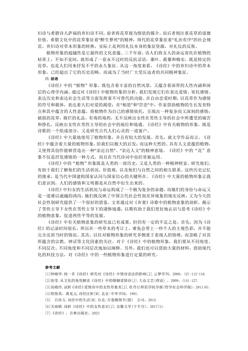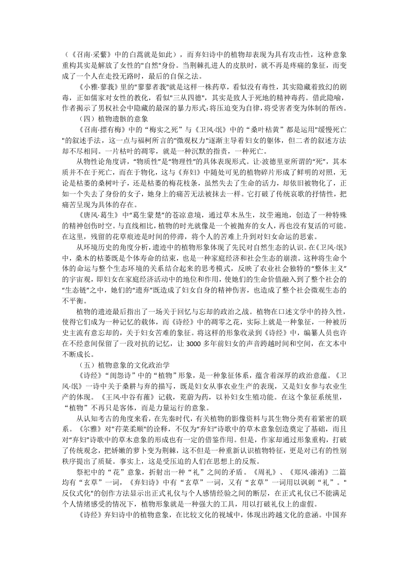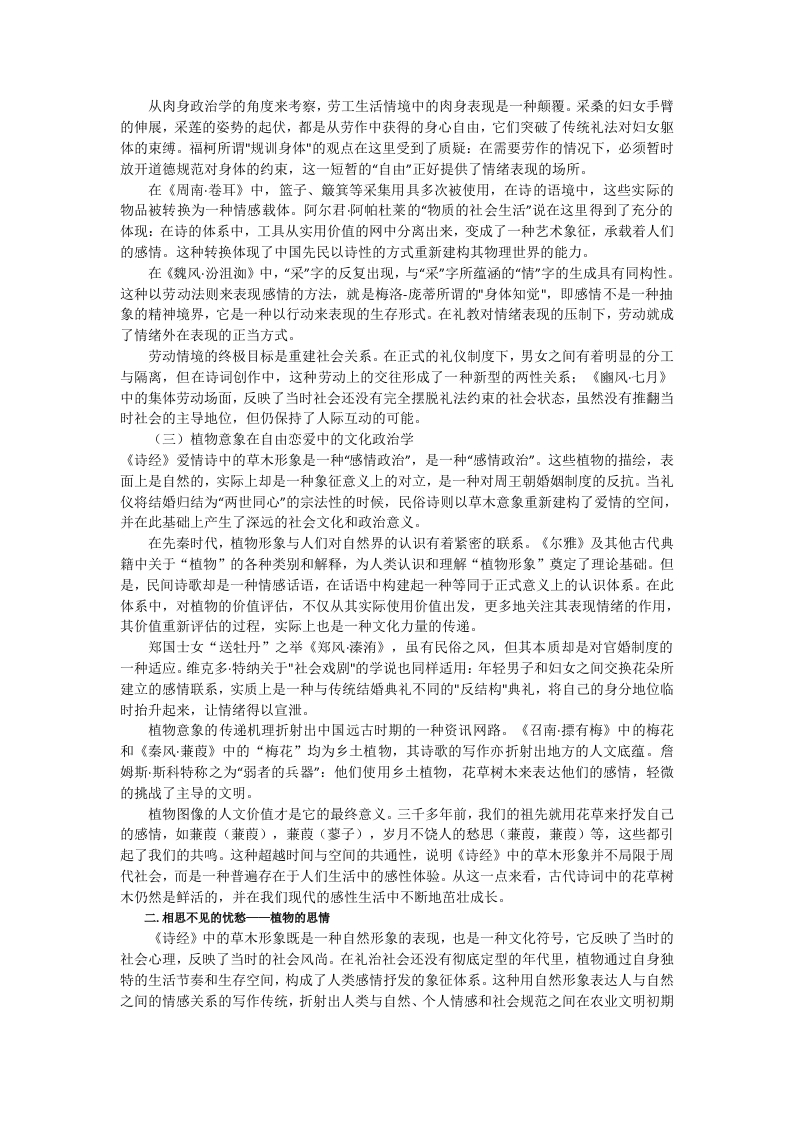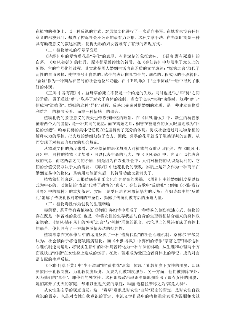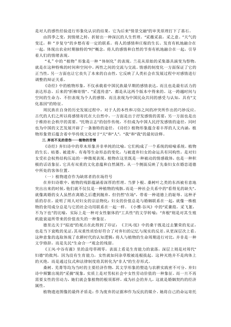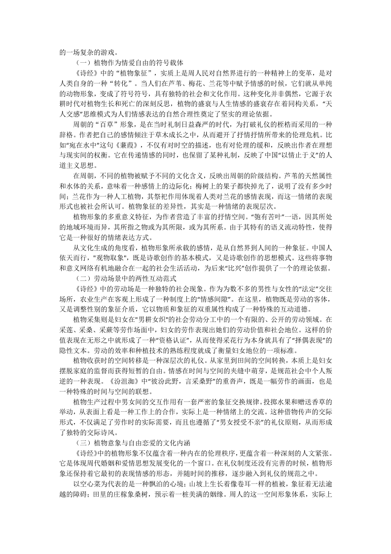 浅谈《诗经》中的植物与爱情汉语言文学专业学生姓名:张馥指导教师:刘明坤摘要:在《诗经》这一浩瀚的文学版图上,与婚恋趣材密切相关的植物意象有着不可忽视的深刻内涵。这不仅是对文学作品中植物的文化意义的发掘,而且也是对当时社会情爱思想的变迁进行了深入的考察,在此过程中体现出来的人与植物之间的关系具有特殊的、无可取代的意义。探讨《诗经》中的草木形象与情爱的联系,有助于我们更好地把握《诗经》的时代精神和深刻的思想内涵,也有助于我们更好地了解中国传统文化中的情爱思想。关键词:爱情诗:植物意象:象征体系:文化隐喻一.自由开放的恋爱——植物的传情《诗经》中的“植物”形象,形成了一种特殊的象征体系,它为被礼仪所禁锢的周民众提供了一个抒发感情的乐园。这既是一种单纯的山水描写,又是男性中心主义文化语境中个人感情的诗化释放。《诗经》爱情诗歌中花卉形象由“天然“走向“情感”,由“礼仪“走向“审美”客体,由“社会规范走向“个人表达”。“变”不仅仅是一种语言上的“变”,而是一种对中国传统文化的感情建构的反映。(一)植物作为情爱自由的符号载体植物在《诗经》情诗中具有象征的双重含义。《秦风·兼葭》的芦荡,《召南摽有梅》的梅实飘零,都赋予了自然形象以情感的内函,使之完成了从自然形象到文化形象的转换:另一方面,超越了“情之始,礼之终”的正统伦理,形成了具有自身特色的情感表达体系。这种二元性体现了周代社会的深层矛盾,表现为在森严的礼乐制度中仍然存在着个人情感的自由天地。植物形象的使用实际上是一种弱势群体对象征力量的反抗。布迪厄认为,统治阶层是以其对象征体系的独占为手段维护其统治地位的,但《诗经》中的平民诗歌则把最常见的草木作为表达感情的工具。在《郑风溱洧》中,兰草作为一种无声的象征,在具体的文本中变成了一种挑衅礼仪规范的欲望象征,“盗用“了正式的象征系统,显示了受压抑的人们的文化创造性。植物形象在时间和空间两个层面上表现出独特的情感。不同于庙堂文献的宏大叙述,《诗经》中的“兼葭”、“梅树”往往出现在边缘,出现在水边、路边,这样的空间选择并不是偶然。列斐伏尔关于“空间创造”的观点在这里得到了证实,即民间诗人其实是在为边缘化的空间赋予感情价值的同时,建立起了一种反对集权的言说立场。时间方面,以梅实成熟等植物的自然生长、枯萎周期代替礼仪社会机械的计时方式,反映了对自然本性的复归。梅树、芦苇等植物在婚恋诗中的大量出现,体现了先民们对自然环境的眷恋。蒂姆·英戈尔德提出了“栖居视角“,认为在远古时代,植物不仅是客体,而且是一种具有感情交流功能的物品。对《诗经》中的情爱诗进行阐释,是对传统的“人本位”思想的一种突破。《诗经》中的爱情,从一个道德的抽象概念,变成了一个具体的,可触摸的,有生命的事物,如芦苇,如兰草。这种情感的具现化,实际上是对"去身体化"的传统伦理规范的一种反叛,是对被压抑的情感体验和情感知觉的一种发掘。(二)劳动场景中的两性互动范式在《诗经》的爱情诗中,劳动场面是一种特别的、具有诗学和政治价值的题材。《周南·关雎》中的采藕、《豳风七月》中的采桑,从一种普通的劳动变成了一种感性的表演,而这种表演的过程,也隐含着一种对周王朝“男女有别“礼仪的消解。劳动在官方的论述中是一种维护国家和民族安定的方式,但在民歌中则是打破别种隔离的正当理由。从肉身政治学的角度来考察,劳工生活情境中的肉身表现是一种颠覆。采桑的妇女手臂的伸展,采莲的姿势的起伏,都是从劳作中获得的身心自由,它们突破了传统礼法对妇女躯体的束缚。福柯所谓"规训身体“的观点在这里受到了质疑:在需要劳作的情况下,必须暂时放开道德规范对身体的约束,这一短暂的“自由”正好提供了情绪表现的场所。在《周南卷耳》中,篮子、簸箕等采集用具多次被使用,在诗的语境中,这些实际的物品被转换为一种情感载体。阿尔君阿帕杜莱的“物质的社会生活”说在这里得到了充分的体现:在诗的体系中,工具从实用价值的网中分离出来,变成了一种艺术象征,承载着人们的感情。这种转换体现了中国先民以诗性的方式重新建构其物理世界的能力。在《魏风汾沮洳》中,“采”字的反复出现,与“采”字所蕴涵的“情”字的生成具有同构性。这种以劳动法则来表现感情的方法,就是梅洛-庞蒂所谓的"身体知觉“,即感情不是一种抽象的精神境界,它是一种以行动来表现的生存形式。在礼教对情绪表现的压制下,劳动就成了情绪外在表现的正当方式。劳动情境的终极目标是重建社会关系。在正式的礼仪制度下,男女之间有着明显的分工与隔离,但在诗词创作中,这种劳动上的交往形成了一种新型的两性关系:《豳风七月》中的集体劳动场面,反映了当时社会还没有完全摆脱礼法约束的社会状态,虽然没有推翻当时社会的主导地位,但仍保持了人际互动的可能。(三)植物意象在自由恋爱中的文化政治学《诗经》爱情诗中的草木形象是一种“感情政治”,是一种“感情政治”。这些植物的描绘,表面上是自然的,实际上却是一种象征意义上的对立,是一种对周王朝婚姻制度的反抗。当礼仪将结婚归结为“两世同心”的宗