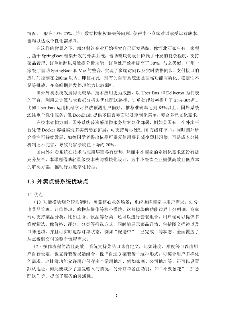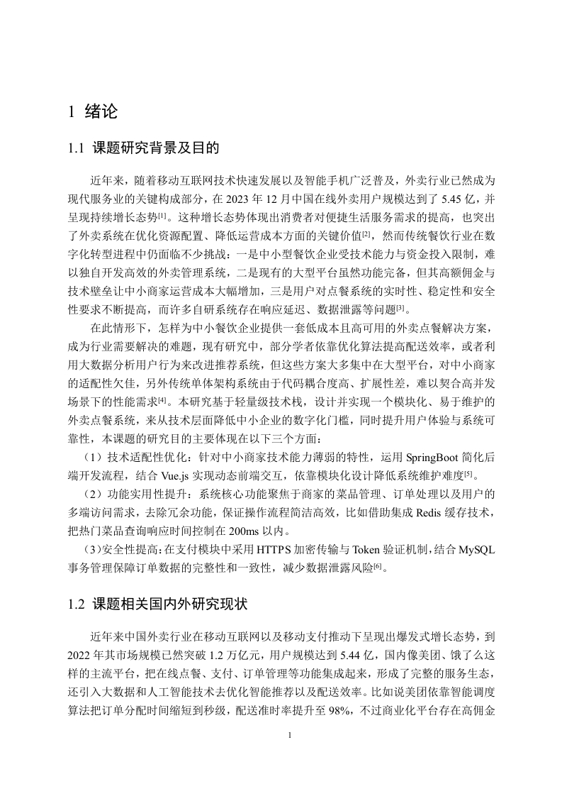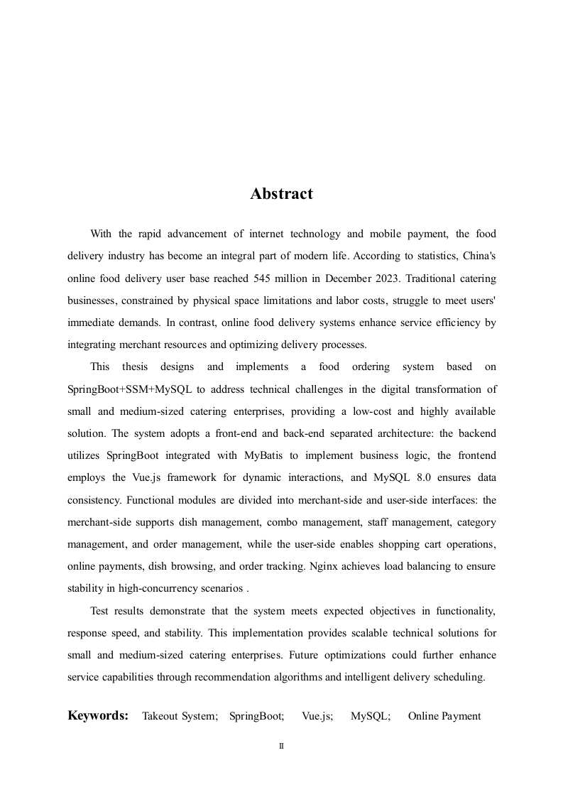 基于SpringBoot+SSM+MySQL的外卖点餐系统摘要随着互联网技术跟移动支付的迅猛进步,外卖行业已然变成现代生活里的关键构成部分,依据统计,在2023年12月中国在线外卖用户规模达到了5.45亿,传统餐饮行业受到物理空间以及人力成本的限制,很难契合用户即时性的需求,而在线外卖系统借助整合商家资源、优化配送流程,提升了服务效率。本文设计并且实现了一个以外卖点餐系统,该系统是基于SpringBoot+SSM+MySQL的,来解决中小型餐饮企业数字化转型过程中的技术痛点,给出低成本、高可用的解决办法,系统采用前后端分离的架构,后端依靠SpringBoot集成MyBatis来实现业务逻辑,前端利用uejs框架来实现动态交互,数据库选用MySQL8.0以保障数据的一致性。功能模块分成商家端与用户端:商家端支持菜品管理、套餐管理、员工管理、分类管理以及订单管理,用户端支持购物车操作、在线支付、菜品浏览以及订单追踪,依靠Ngix达成负载均衡,保证在高并发场景下的稳定性。测试结果表明,系统在功能性、响应速度及稳定性方面达到预期目标该系统的实现为中小型餐饮企业提供了可扩展的技术解决方案,未来可通过引入推荐算法与智能配送调度进一步优化服务能力。关键词:外卖系统:SpringBoot:Vue.js;MySQL:在线支付AbstractWith the rapid advancement of internet technology and mobile payment,the fooddelivery industry has become an integral part of modern life.According to statistics,China'sonline food delivery user base reached 545 million in December 2023.Traditional cateringbusinesses,constrained by physical space limitations and labor costs,struggle to meet users'immediate demands.In contrast,online food delivery systems enhance service efficiency byintegrating merchant resources and optimizing delivery processes.This thesis designs and implements a food ordering system based onSpringBoot+SSM+MySQL to address technical challenges in the digital transformation ofsmall and medium-sized catering enterprises,providing a low-cost and highly availablesolution.The system adopts a front-end and back-end separated architecture:the backendutilizes SpringBoot integrated with MyBatis to implement business logic,the frontendemploys the Vue.js framework for dynamic interactions,and MySQL 8.0 ensures dataconsistency.Functional modules are divided into merchant-side and user-side interfaces:themerchant-side supports dish management,combo management,staff management,categorymanagement,and order management,while the user-side enables shopping cart operations,online payments,dish browsing,and order tracking.Nginx achieves load balancing to ensurestability in high-concurrency scenariosTest results demonstrate that the system meets expected objectives in functionality,response speed,and stability.This implementation provides scalable technical solutions forsmall and medium-sized catering enterprises.Future optimizations could further enhanceservice capabilities through recommendation algorithms and intelligent delivery scheduling.Keywords:Takeout System;SpringBoot;Vue.js;MySQL;Online Payment目录1绪论..1.1课题研究背景及目的1.2课题相关国内外研究现状1.3外卖点餐系统优缺点..22技术相关.。.42.1开发技术详情介绍.42.2后端技术…42.2.1 SpringBoot基本概述.42.2.2 Nginx基本概述….42.3前端技术.52.3.1ue框架.52.4 MySQL数据库基本概述53外卖点餐系统需求分析….53.1系统基本需求分析.63.2系统基本功能模块介绍.63.2.1系统商家模块介绍.63.2.2系统用户模块介绍.73.3外卖系统下单流程简介。.84系统设计与基本功能实现.104.1系统功能模块设计….104.2数据库设计.104.2.1实体结构图.104.2.2各实体之间的关系….164.2.3数据库逻辑.….174.2.4数据库连接代码.224.3用户模块功能实现224.3.1浏览菜品.224.3.2商品下单.234.3.3地址管理244.3.4查看订单…254.4商家模块功能实现.264.4.1菜品管理..264.4.2分类管理.274.4.3订单管理.284.4.4套餐管理.294.4.5员工管理294.5外卖点餐系统相关代码.304.5.1查看购物车商品.304.5.2删除购物车中的一个商品..305系统则试.………………………….32Ⅲ5.1测试目的5.2系统登录模块测试325.3菜品管理模块测试.325.4查看订单模块测试。00404444445444444444444444545444444444444444544444