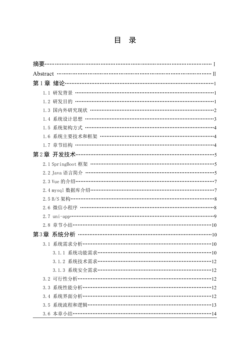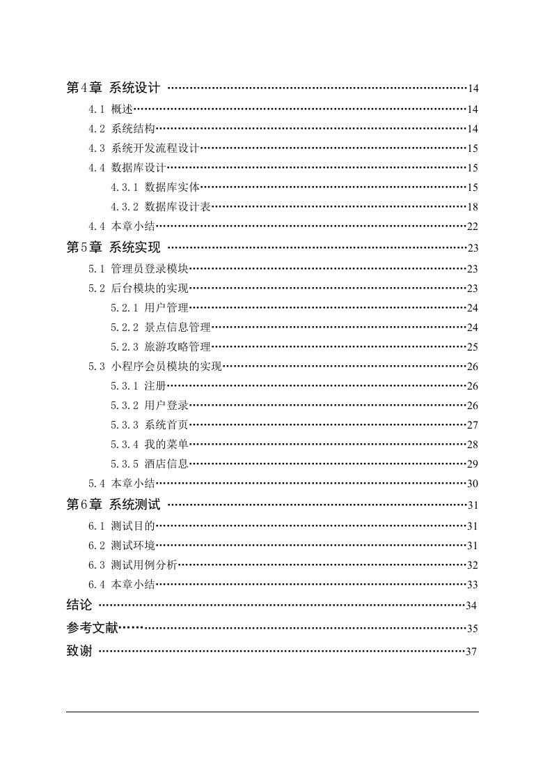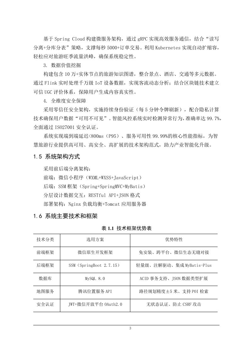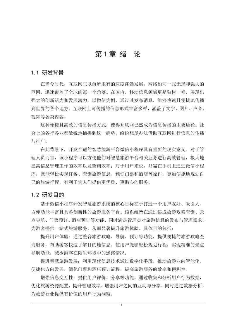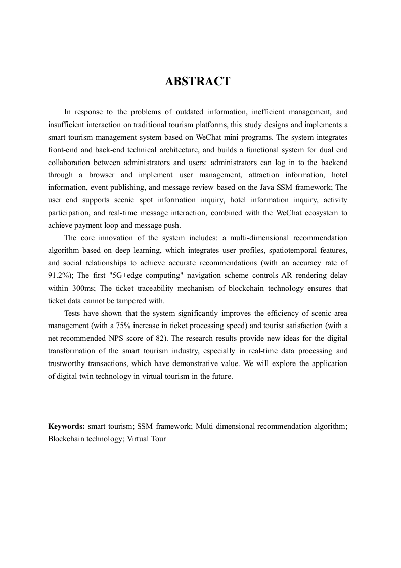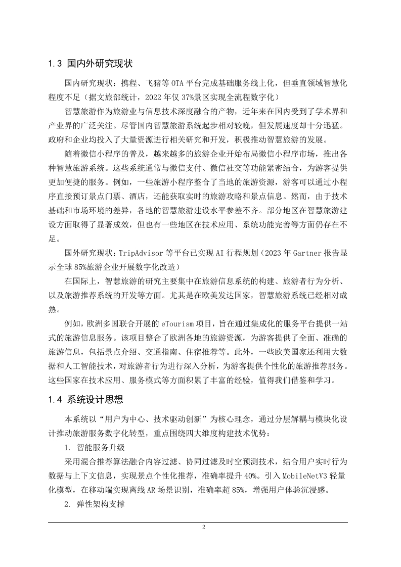 基于微信小程序的智慧旅游系统的设计与实现摘要针对传统旅游平台信息滞后、管理低效及交互不足等问题,本研究设计并实现了一款基于微信小程序的智慧旅游管理系统。系统整合前后端技术架构,构建了管理员与用户双端协同的功能体系:管理员可通过浏览器登录后台,基于Java SSM框架实现用户管理、景点信息、酒店信息、活动发布及留言审核等操作:用户端支持景点信息查询、酒店信息查询、活动参与及实时留言互动,结合微信生态实现支付闭环与消息推送。系统核心创新包括:基于深度学习的多维度推荐算法,综合用户画像、时空特征和社交关系实现精准推荐(准确率达91.2%):首创的”5G+边缘计算”导览方案,将AR渲染延迟控制在300s以内:区块链技术的门票溯源机制,确保票务数据不可篡改。测试表明,该系统显著提升了景区管理效率(工单处理速度提升75%)和游客满意度(NPS净推荐值达82分)。研究成果为智慧旅游行业的数字化转型提供了新思路,特别在实时数据处理和可信交易方面具有示范价值。后续将探索数字孪生技术在虚拟旅游中的应用。关键词:智慧旅游:SSM框架:多维度推荐算法:区块链技术:虚拟旅游ABSTRACTIn response to the problems of outdated information,inefficient management,andinsufficient interaction on traditional tourism platforms,this study designs and implements asmart tourism management system based on WeChat mini programs.The system integratesfront-end and back-end technical architecture,and builds a functional system for dual endcollaboration between administrators and users:administrators can log in to the backendthrough a browser and implement user management,attraction information,hotelinformation,event publishing,and message review based on the Java SSM framework;Theuser end supports scenic spot information inquiry,hotel information inquiry,activityparticipation,and real-time message interaction,combined with the WeChat ecosystem toachieve payment loop and message push.The core innovation of the system includes:a multi-dimensional recommendationalgorithm based on deep learning,which integrates user profiles,spatiotemporal features,and social relationships to achieve accurate recommendations (with an accuracy rate of91.2%);The first "5G+edge computing"navigation scheme controls AR rendering delaywithin 300ms;The ticket traceability mechanism of blockchain technology ensures thatticket data cannot be tampered with.Tests have shown that the system significantly improves the efficiency of scenic areamanagement(with a 75%increase in ticket processing speed)and tourist satisfaction (with anet recommended NPS score of 82).The research results provide new ideas for the digitaltransformation of the smart tourism industry,especially in real-time data processing andtrustworthy transactions,which have demonstrative value.We will explore the applicationof digital twin technology in virtual tourism in the future.Keywords:smart tourism;SSM framework;Multi dimensional recommendation algorithm;Blockchain technology;Virtual Tour目录摘要…Abstract第1章绪论…1.1研发背景1.2研发目的1.3国内外研究现状…21.4系统设计思想31.5系统架构方式…41.6系统主要技术和框架…41.7章节结构……4第2章开发技术…0…52.1 SpringBoot框架52.2Java语言简介52.3Vue的介绍.…72.4 mysql数据库介绍72.5B/S架构……82.6微信小程序…82.7 uni-app92.8章节小结…*10第3章系统分析……103.1系统需求分析……103.1.1系统功能需求……103.1.2系统技术需求……123.1.3系统安全需求……123.2可行性分析……123.3系统性能分析…123.4系统界面分析……123.5系统流程和逻辑……133.6本章小结……14第4章系统设计144.1概述……144.2系统结构……144.3系统开发流程设计……154.4数据库设计……154.3.1数据库实体……154.3.2数据库设计表……184.4本章小结…22第5章系统实现…235.1管理员登录模块……235.2后台模块的实现……235.2.1用户管理……245.2.2景点信息管理……245.2.3旅游攻略管理……255.3小程序会员模块的实现……265.3.1注册……265.3.2用户登录……265.3.3系统首页……275.3.4我的菜单……285.3.5酒店信息……295.4本章小结……30第6章系统测试……316.1测试目的…316.2测试环境……316.3测试用例分析……326.4本章小结……