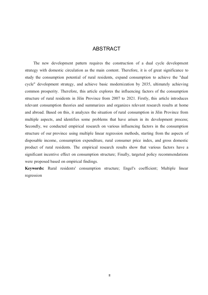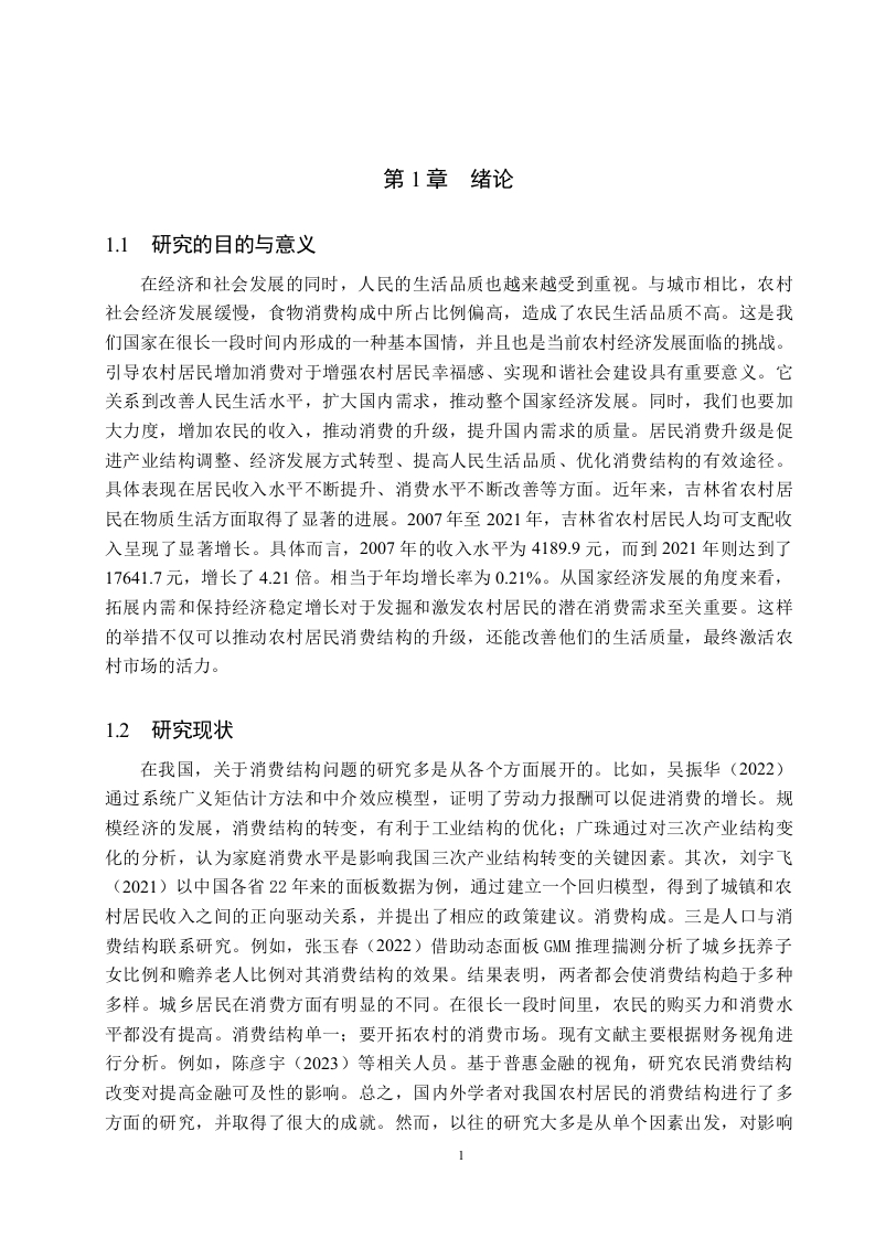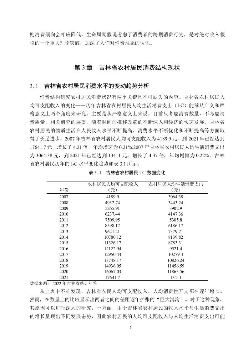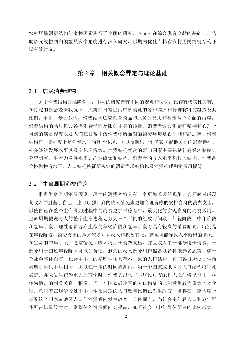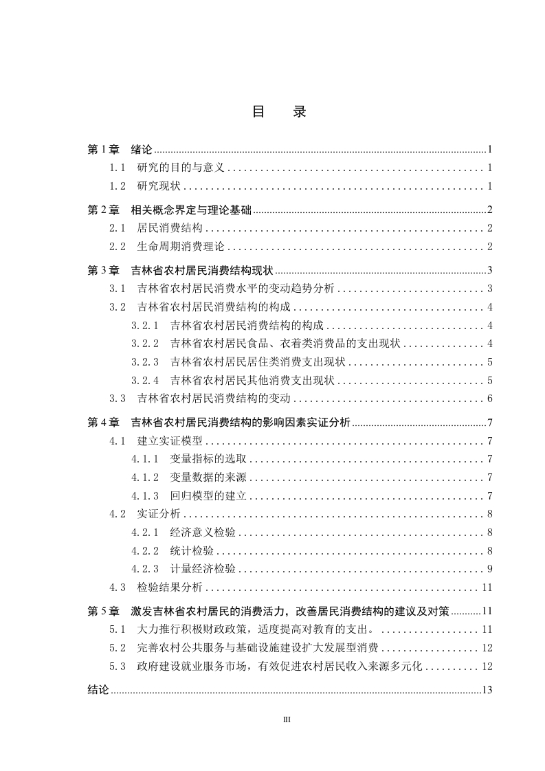 吉林省农村居民消费结构的影响因素研究摘要新发展格局需要构建以国内大循环为主要内容的双循环发展战略,因此,对农村居民的消费潜能进行研究,扩大消费实现“双循环”发展战略以及实现2035年基本实现现代化,最终实现共同富裕具有重要意义。为此,本文探讨了2007-2021年吉林省农村居民消费结构的影响因素。首先,本文引入了相关的消费理论,并总结、整理了国内外的相关研究成果,基于这一点,从多个方面分析了吉林省农村消费的状况,从而找出了它在发展过程中出现的一些问题:其次,我们从农村居民可支配收入、消费支出、农村居民消费价格指数以及国内生产总值等方面出发,采用多元线性回归的方法,对吉林省消费结构中的多种影响因素进行了实证研究。实证研究结果显示各因素对消费结构有较为显著的激励作用:最后根据实证得出的问题针对性的提出了政策建议。关键词:农村居民消费结构:恩格尔系数:多元线性回归ABSTRACTThe new development pattern requires the construction of a dual cycle developmentstrategy with domestic circulation as the main content.Therefore,it is of great significance tostudy the consumption potential of rural residents,expand consumption to achieve the "dualcycle"development strategy,and achieve basic modernization by 2035,ultimately achievingcommon prosperity.Therefore,this article explores the influencing factors of the consumptionstructure of rural residents in Jilin Province from 2007 to 2021.Firstly,this article introducesrelevant consumption theories and summarizes and organizes relevant research results at homeand abroad.Based on this,it analyzes the situation of rural consumption in Jilin Province frommultiple aspects,and identifies some problems that have arisen in its development process;Secondly,we conducted empirical research on various influencing factors in the consumptionstructure of our province using multiple linear regression methods,starting from the aspects ofdisposable income,consumption expenditure,rural consumer price index,and gross domesticproduct of rural residents.The empirical research results show that various factors have asignificant incentive effect on consumption structure;Finally,targeted policy recommendationswere proposed based on empirical findings.Keywords:Rural residents'consumption structure;Engel's coefficient;Multiple linearregression目录第1章绪论…1.1研究的目的与意义1.2研究现状....第2章相关概念界定与理论基础.…22.1居民消费结构........…22.2生命周期消费理论.·。....2第3章吉林省农村居民消费结构现状33.1吉林省农村居民消费水平的变动趋势分析...……33.2吉林省农村居民消费结构的构成...................43.2.1吉林省农村居民消费结构的构成.............43.2.2吉林省农村居民食品、衣着类消费品的支出现状.....43.2.3吉林省农村居民居住类消费支出现状…53.2.4吉林省农村居民其他消费支出现状.............53.3吉林省农村居民消费结构的变动..6第4章吉林省农村居民消费结构的影响因素实证分析..74.1建立实证模型......74.1.1变量指标的选取..…74.1.2变量数据的来源..4.1.3回归模型的建立..74.2实证分析...……84.2.1经济意义检验..4.2.2统计检验.....……84.2.3计量经济检验.....….943检验结果分析.…….11第5章激发吉林省农村居民的消费活力,改善居民消费结构的建议及对策.115.1大力推行积极财政政策,适度提高对教育的支出。…115.2完善农村公共服务与基础设施建设扩大发展型消费..........125.3政府建设就业服务市场,有效促进农村居民收入来源多元化......12结论.13参考文献14致谢..5