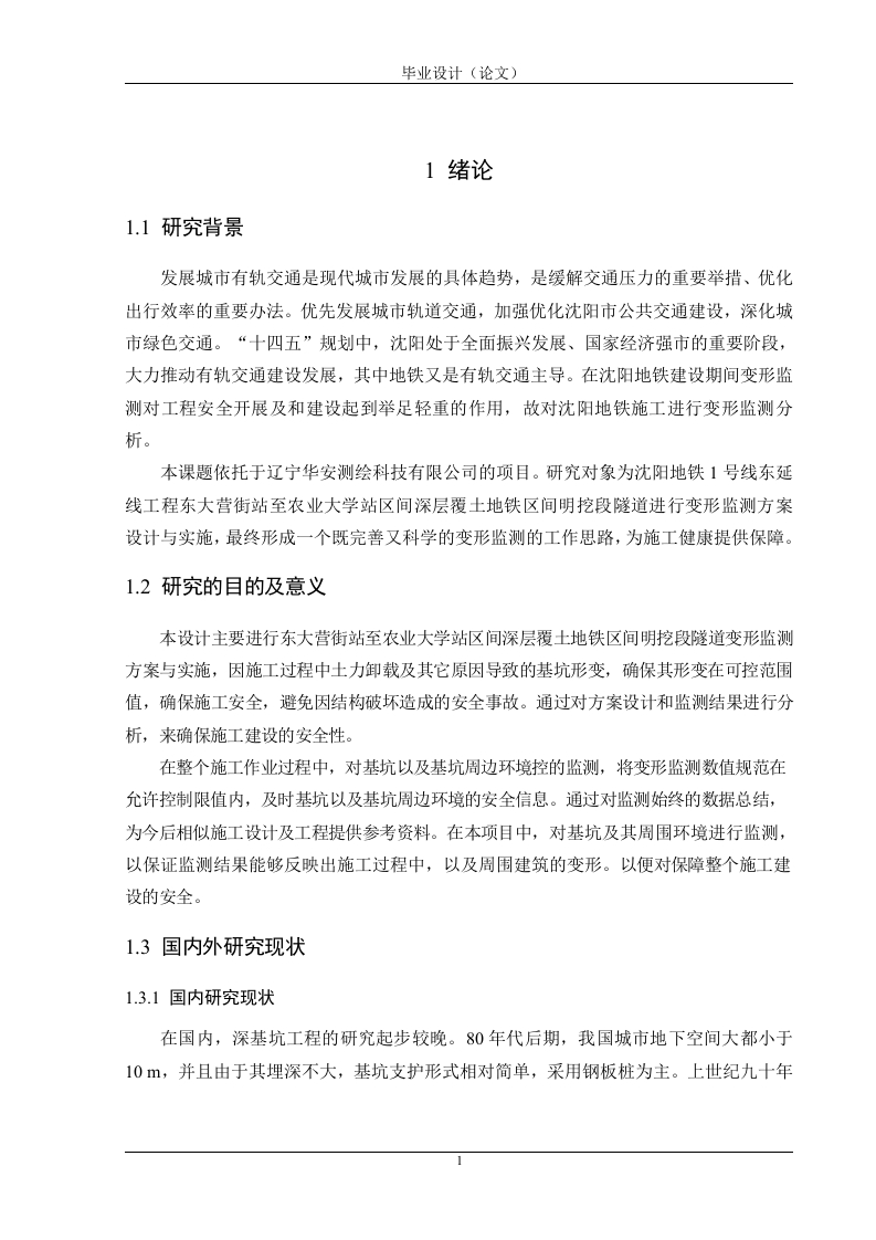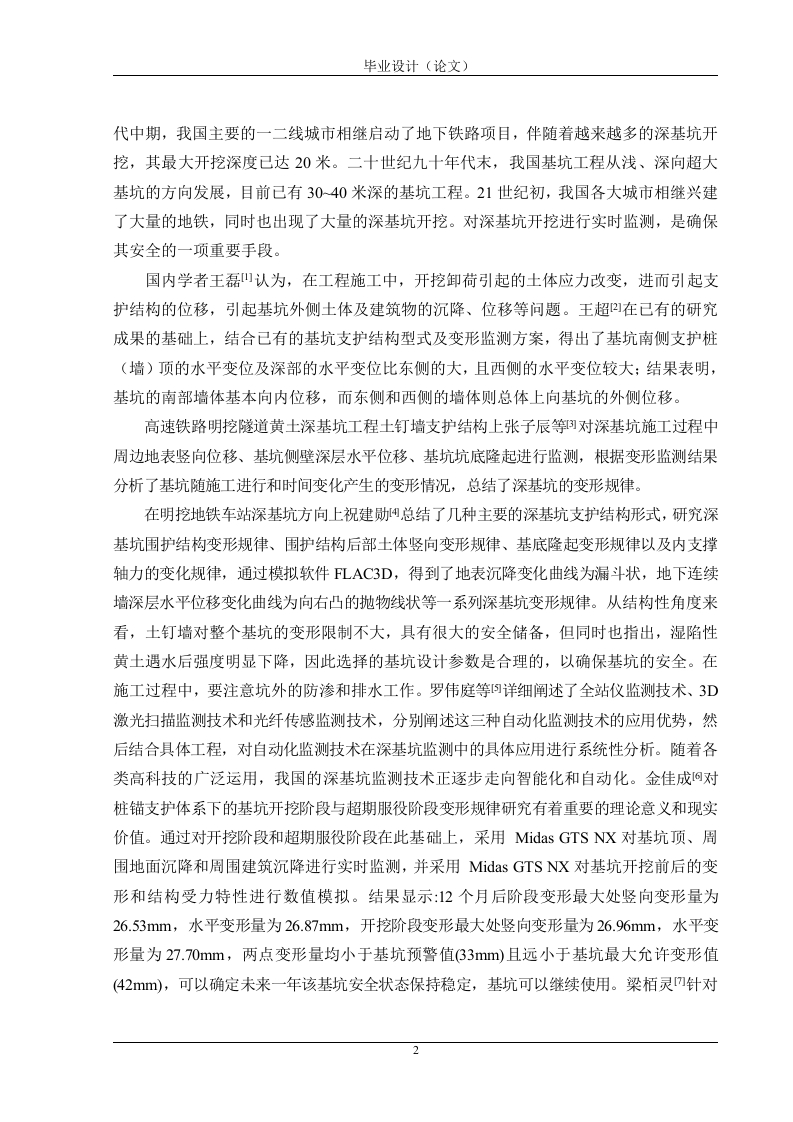 摘要发展城市有轨交通是现代城市发展的具体趋势,是缓解交通压力的重要举措、优化出行效率的重要办法。“十四五”规划中,沈阳处于全面振兴发展、国家经济强市的重要阶段,沈阳市大力推动地铁建设,故对沈阳地铁施工进行变形监测分析。本文主要以东大营街站至农业大学站区间深层覆土地铁区间明挖段隧道变形监测方案与实施,确定监测方法、监测精度、监测范围、预警等级,以GNSS静态测量为平面坐标控制点布设方法,以国家二等水准测量以附近高程控制点联测获得高程数据。共布设3个平面控制点和三个高程基准点,其高程分别为51.6623m、51.5319m、51.5395。使用徕卡全站仪对对支护桩桩顶水平位移、立柱水平位移进行监测,使用天宝电子水准仪对支护桩桩顶垂直位移、立柱竖向位移、基坑地表沉降进行监测,利用测斜仪对支护桩桩体围护桩变形进行数据采集,对高架桥的桥桩进行沉降数据采集来监测周边环境的变形来预防施工过程中土力卸载及其它原因导致的基坑形变,从而确保其形变在可控范围值,确保施工安全,避免因结构破坏造成的安全事故。既完善又科学的变形监测的工作思路,为施工健康提供保障。结果表明:基坑变形规律呈现先外扩后收缩的变形规律,基坑地表为先抬升后下沉的形变趋势,同时支护桩桩体围护桩变形最大发生在土体-砂石层交换层,最大形变量为19.84mm,形变较大临近预警值。周边高架桥变形无较大扰动,四墩桥墩差异沉降也很稳定。施工中将土-砂交换层的支撑更换为钢支撑或钢混支撑可极大的减少该处的形变,进一步提高工程安全。关键词:明挖隧道:变形监测:围护结构AbstractThe development of public transportation is the direction of modern urban developmentand an important measure to control air pollution and traffic congestion in big cities.We willgive priority to the development of urban public transport,continue to deepen the constructionof national public transport in cities,and increase the share rate of urban green transport.During the 14th Five-Year Plan period,Shenyang is in the key stage of all-round revitalizationand the construction of a national central city,and vigorously promotes the construction anddevelopment of rail transit,among which the subway is dominated by rail transit.Thedeformation monitoring during the construction of Shenyang metro plays an important role inthe safety development and construction of the project,so the deformation monitoring andanalysis of Shenyang metro construction are conducted.This paper mainly in dongda camp street station to agricultural university station intervaldeep covering land iron open section tunnel deformation monitoring scheme andimplementation,determine the monitoring method,monitoring accuracy,monitoring scope,warning level,through the horizontal displacement,vertical deformation,ensure constructionsafety,avoid safety accidents caused by structure damage.The perfect and scientific thinkingof deformation monitoring can guarantee the construction health.The results show that the deformation law of the foundation pit shows the deformationlaw of first expansion and then contraction,and the surface of the foundation pit is thedeformation trend of first lifting and then sinking.At the same time,the deformation of thesupporting pile retaining pile is the largest in the soil-sand layer exchange layer,the maximumshape variable is 19.84mm,and the deformation is larger and close to the warning value.Thedeformation of the surrounding viaduct has no large disturbance,and the differentialsettlement of the four piers is also very stable.The replacement of the support of the soil-sandexchange layer with steel support or steel concrete support can greatly reduce the deformationthere and further improve the safety of the project.Keywords:pen-cut tunnel;deformation monitoring;envelope structure目录摘要Abstract..…1绪论,1.1研究背景1.2研究的目的及意义1.3国内外研究现状1.3.1国内研究现状…1.3.2国外研究现状31.4研究的主要内容2研究区概况….52.1地理位置.52.2项目概况52.3项目工程地质概况.….52.4项目水文