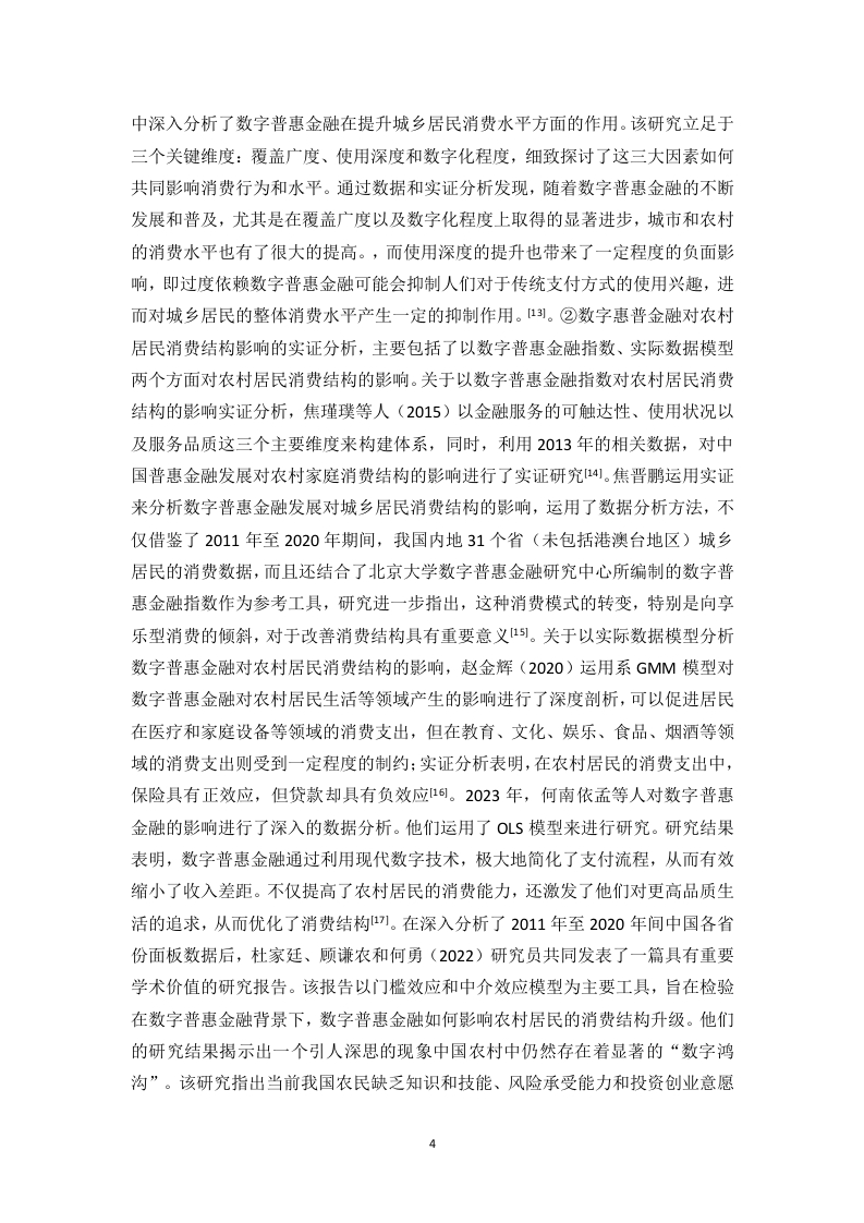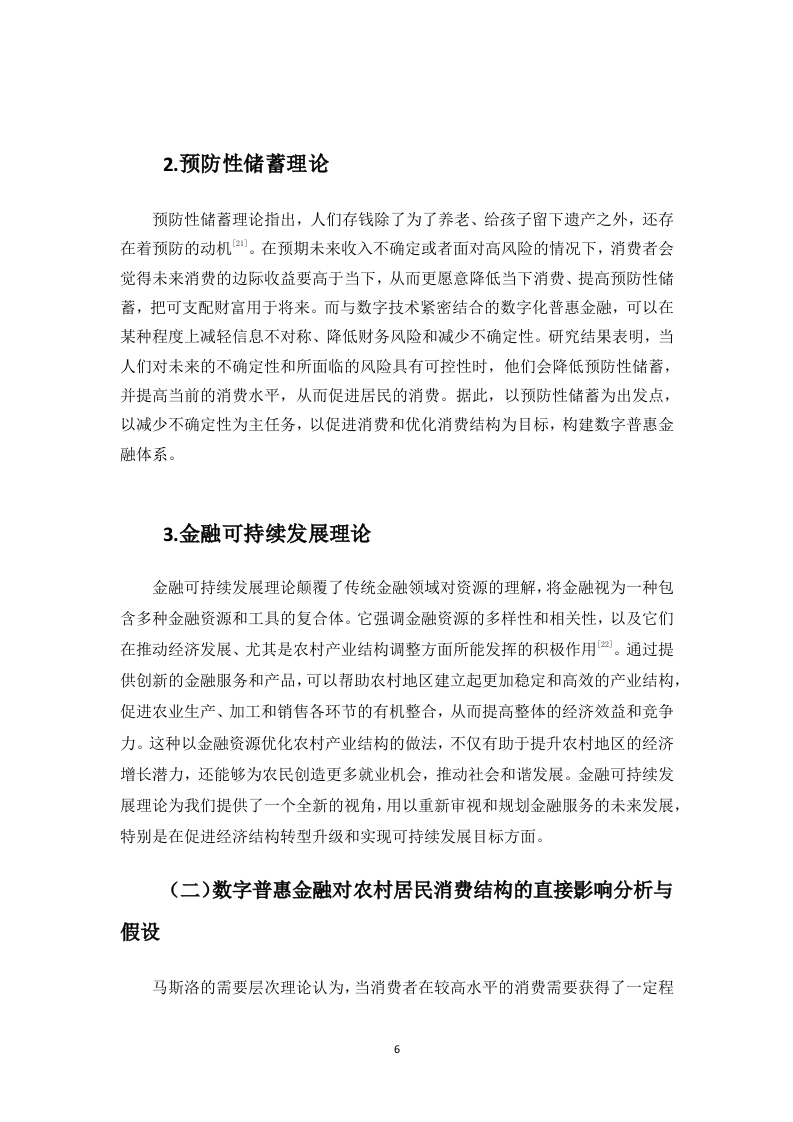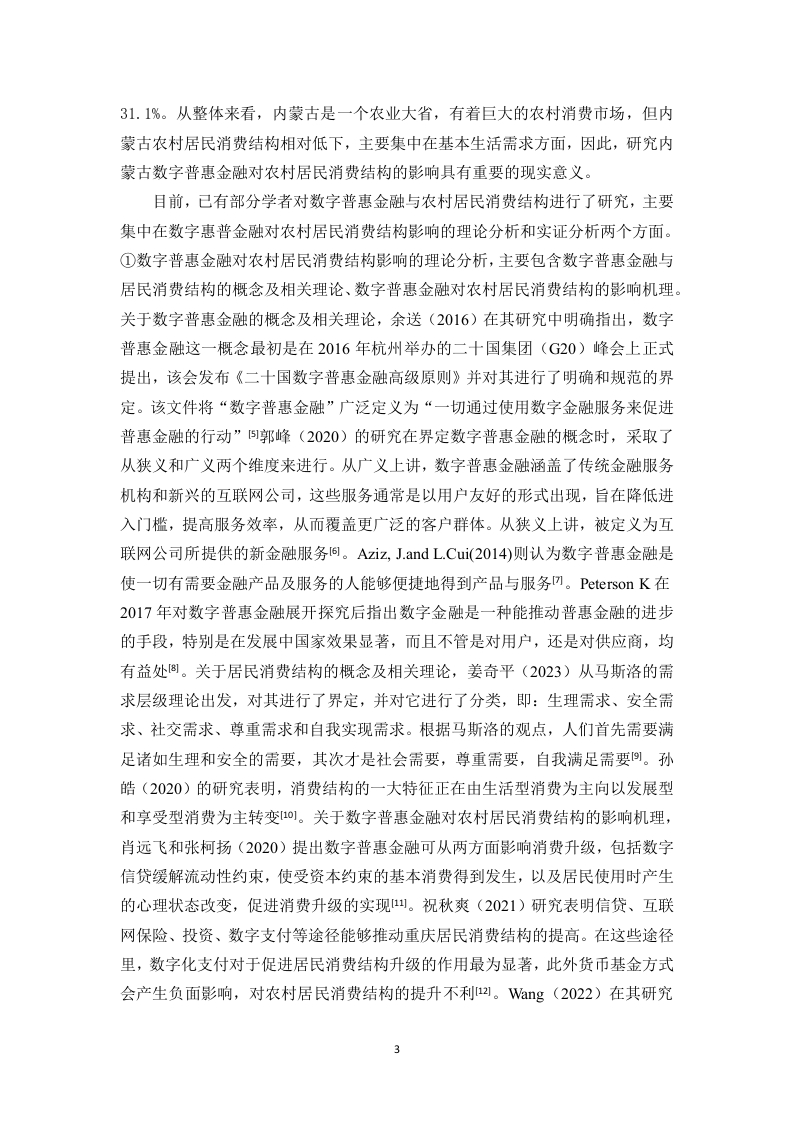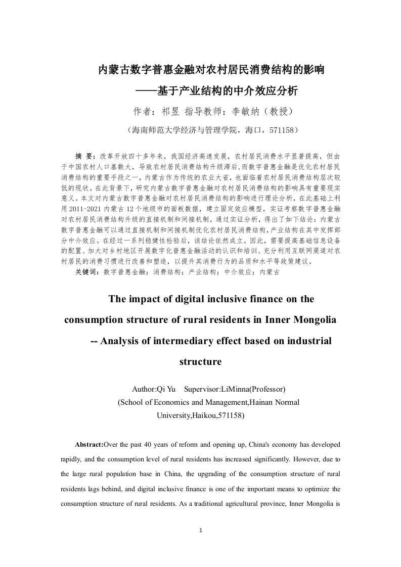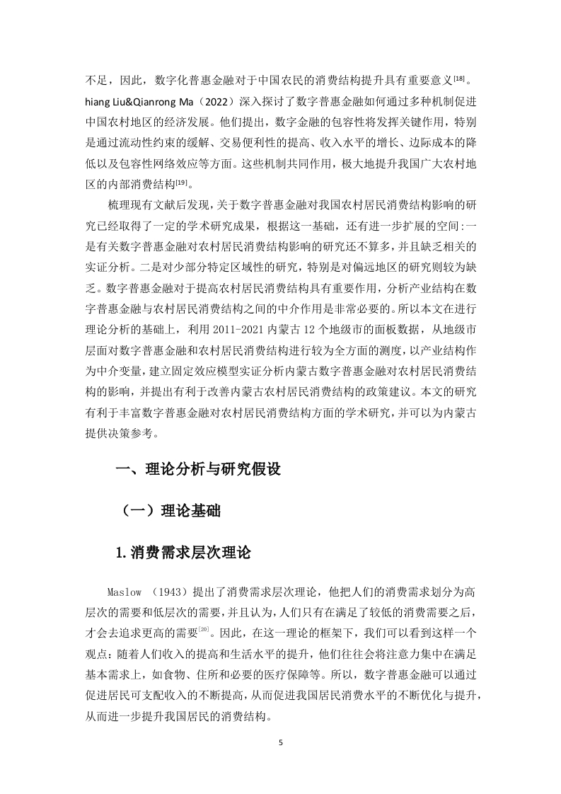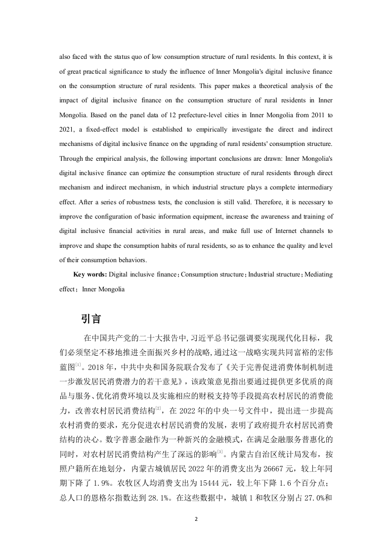 目录引言…2一、理论分析与研究假设5(一)理论基础.....51.消费需求层次理论52.预防性储蓄理论....63.金融可持续发展理论………………6(二)数字普惠金融对农村居民消费结构的直接影响分析与假设..·6(三)数字普惠金融对农村居民消费结构的间接影响分析与假设.·.·7二、实证研究设计...…….7(一)变量说明、测度与分析71.变量说明.…72.变量测度…9(1)被解释变量(Cons)的测度0.9(2)解释变量(nder)的测度..(3)中介变量(Su)的测度9(4)控制变量的测度.............93.变量的描述性分析104.相关性分析.....10(二)数据来源及初步检验111.数据来源..........112.初步检验...11(1)多重共线性检验11(2)单位根检验.....12(三)模型构建.12三、模型的估计与检验..........12(一)模型参数估计、检验与结果分析12(二)模型估计结果检验..........131.统计检验...13(1)拟合优度检验.....13(2)显著性检验..…132.稳健性检验...…14(2)间接影响稳健性检验。14(三)模型估计结果分析.….151.内蒙古数字普惠金融对农村居民消费结构的直接影响分析..152.内蒙古数字普惠金融对农村居民消费结构的间接影响分析..·15四、结论与政策建议16(一)主要结论16(二)对策建议...16参考文献.…17致谢20内蒙古数字普惠金融对农村居民消费结构的影响基于产业结构的中介效应分析作者:祁昱指导教师:李敏纳(教授)(海南师范大学经济与管理学院,海口,571158)摘要:改苹开放四十多年来,我国经济高速发展,农村居民消费水平显著提高,但由于中国农村人口基数大,导致农村居民消费结构升级滞后,而数字普惠金融是优化农村居民消费结构的重要手段之一,内蒙古作为传统的农业大省,也面临着农村居民消费结构层次较低的现状。在此背景下,研究内蒙古数字普惠金融对农村居民消费结构的影响具有重要现实意义。本文对内蒙古数字普惠金融对农村居民消费结枸的影响进行理论分析,在此基础上利用2011-2021内蒙古12个地级市的面板数据,建立固定效应模型,实证考察数字普惠金融对农村居民消费结构升级的直接机制和间接机制,通过实证分析,得出了如下结论:内蒙古数字普惠金融可以通过直接机制和间接机制优化农村居民消费结构,产业结构在其中发挥部分中介效应。在经过一系列稳健性检验后,该结论依然成立。因此,需要提高基础信息设备的配置、加大对乡村地区开展数字化普惠金融活动的认识和培训、充分利用互联网渠道对农村居民的消费习惯进行改善和塑造,以提升其消费行为的品质和水平等政策建议。关键词:数字普惠金融:消费结构:产业结构;中介效应;内蒙古The impact of digital inclusive finance on theconsumption structure of rural residents in Inner Mongolia--Analysis of intermediary effect based on industrialstructureAuthor:Qi Yu Supervisor:LiMinna(Professor)(School of Economics and Management,Hainan NormalUniversity,Haikou,571158)Abstract:Over the past 40 years of reform and opening up,China's economy has developedrapidly,and the consumption level of rural residents has increased significantly.However,due tothe large rural population base in China,the upgrading of the consumption structure of ruralresidents lags behind,and digital inclusive finance is one of the important means to optimize theconsumption structure of rural residents.As a traditional agricultural province,Inner Mongolia isalso faced with the status quo of low consumption structure of rural residents.In this context,it isof great practical significance to study the influence of Inner Mongolia's digital inclusive financeon the consumption structure of rural residents.This paper makes a theoretical analysis of theimpact of digital inclusive finance on the consumption structure of rural residents in InnerMongolia.Based on the panel data of 12 prefecture-level cities in Inner Mongolia from 2011 to2021,a fixed-effect model is established to empirically investigate the direct and indirectmechanisms of digital inclusive finance on the upgrading of rural residents'consumption structure.Through the empirical analysis,the following important conclusions are drawn:Inner Mongolia'sdigital inclusive finance can optimize the consumption structure of rural residents through directmechanism and indirect mechanism,in which industrial structure plays a complete intermediaryeffect.After a series of robustness tests,the conclusion is still valid.Therefore,it is necessary toimprove the configuration of basic