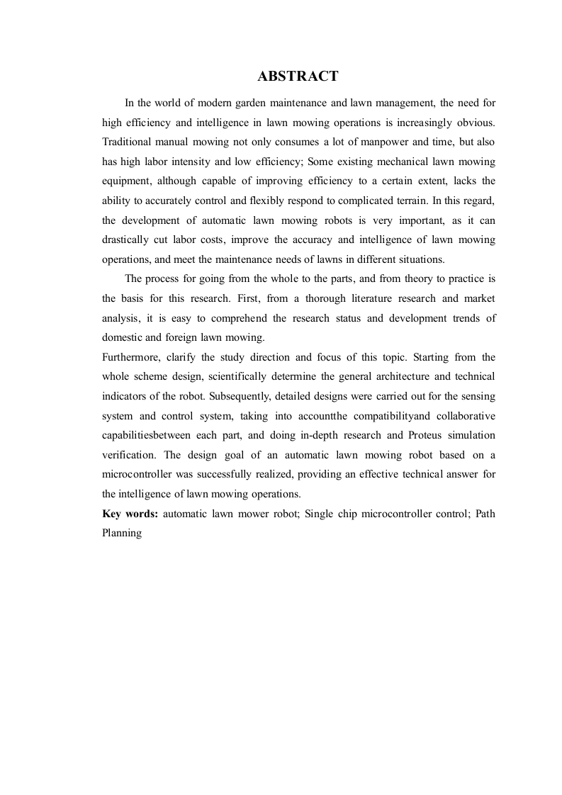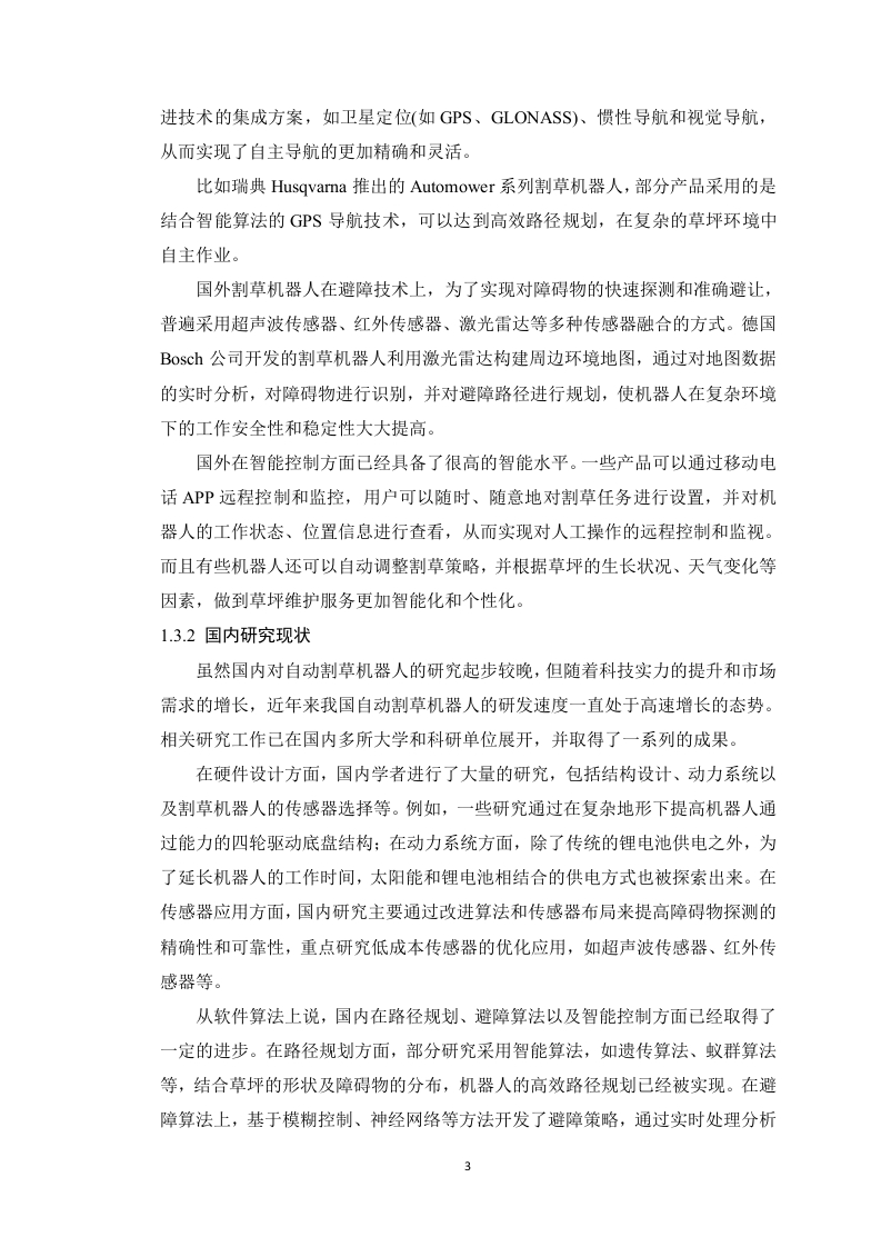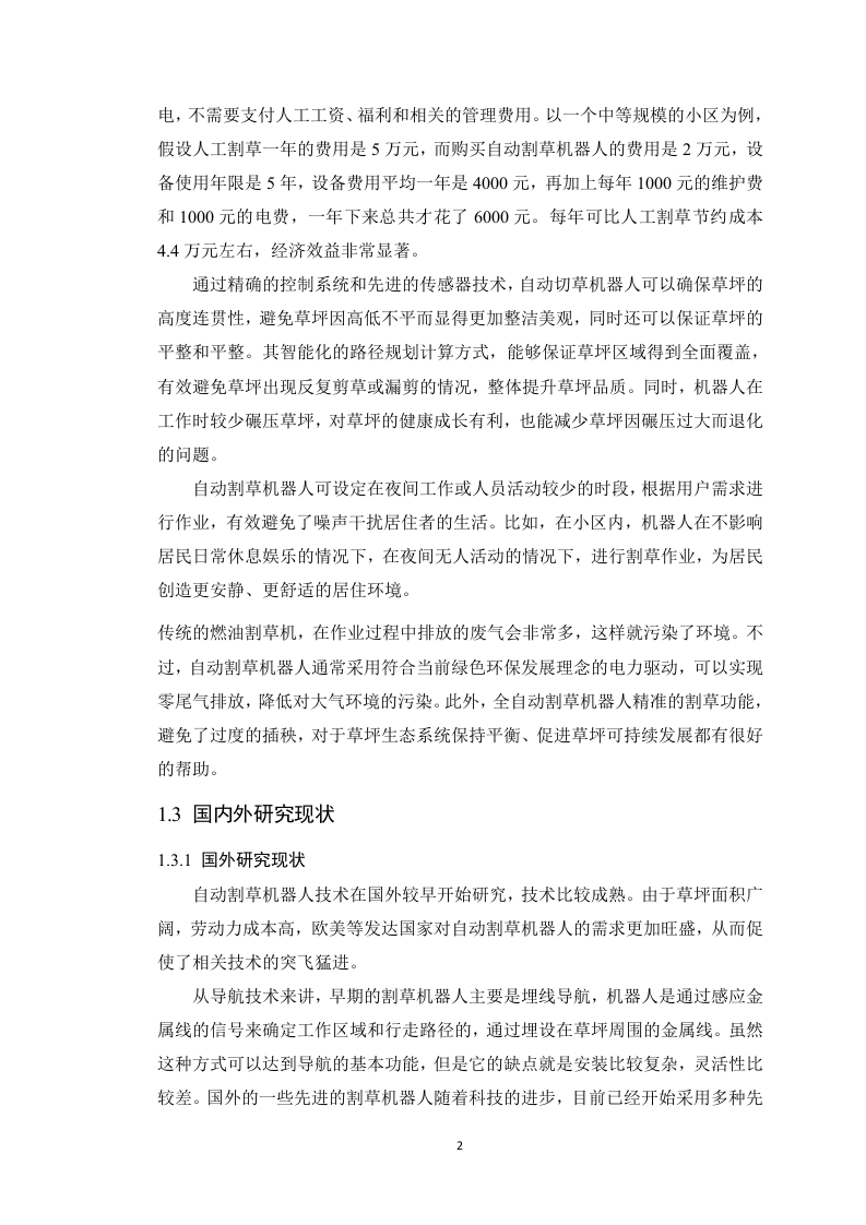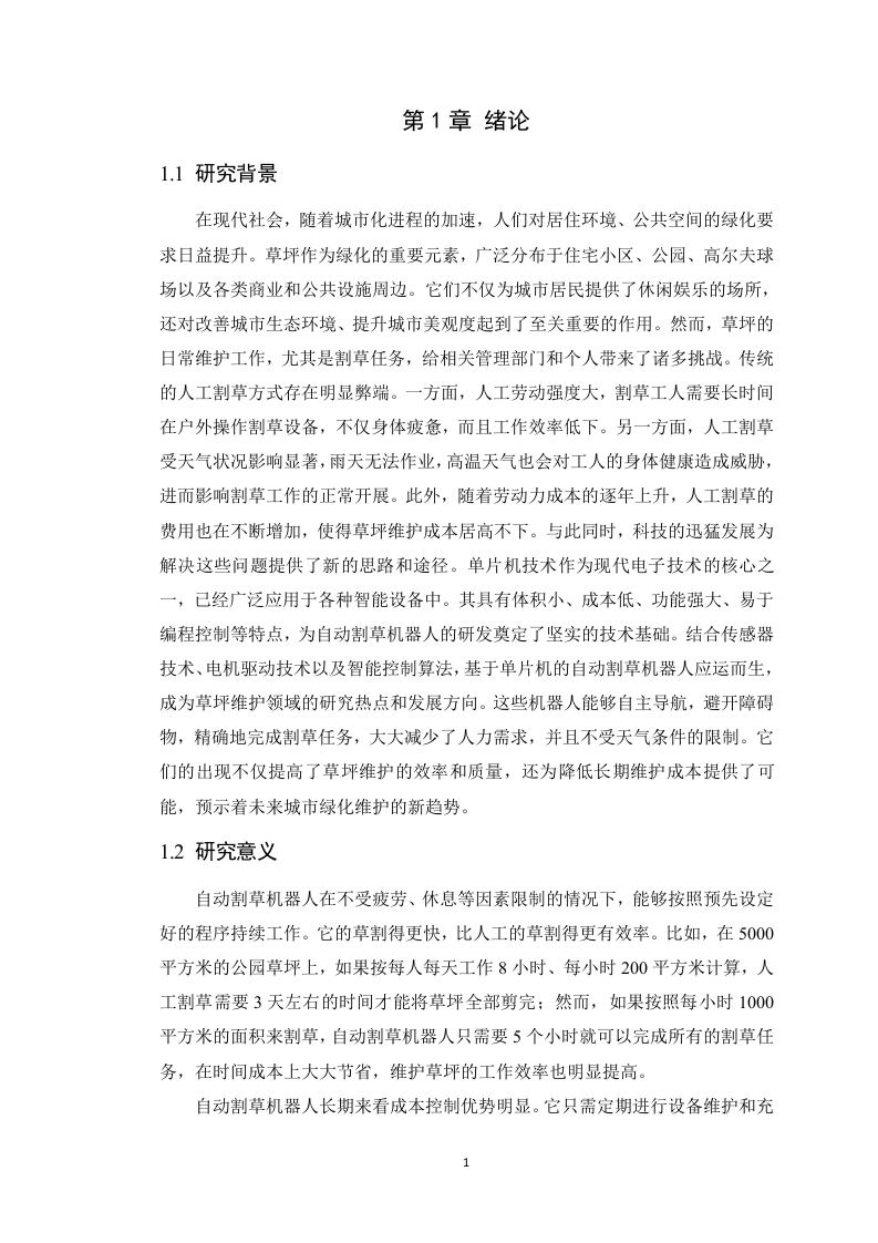 基于单片机的自动割草机器人设计摘要高效、智能的割草作业需求在现代园林养护与草坪经营领域日益突出。传统人工割草在劳动强度大、劳动效率低的同时,耗费大量人力和时间:但现有的部分机械割草设备,在复杂地形复杂的情况下,由于缺乏对复杂地形进行精确控制、灵活应变的能力,在一定程度上可以提高效率。在这样的背景下,为满足不同场景草坪维护需求的自动割草机器人研发意义重大,其可大幅降低人力成本,提高割草作业的精确性和智能化程度。课题的学习按照由整体到局部,由理论到实践的思路进行研究。一是通过广泛的文献研究及市场分析,对本课题的研究方向和重点进行全面了解,进而弄清国内外割草机器人的研究现状及发展趋势。然后再从整体方案的设计做起,对机器人的整体架构、技术指标等进行科学的确定。然后分别展开传感系统和控制系统的详细设计,并在此过程中对各部分之间的兼容性、协同工作能力进行充分考虑,并进行深入的钻研Proteus模拟验证。关键词:自动割草机器人:单片机控制:路径规划ABSTRACTIn the world of modern garden maintenance and lawn management,the need forhigh efficiency and intelligence in lawn mowing operations is increasingly obvious.Traditional manual mowing not only consumes a lot of manpower and time,but alsohas high labor intensity and low efficiency;Some existing mechanical lawn mowingequipment,although capable of improving efficiency to a certain extent,lacks theability to accurately control and flexibly respond to complicated terrain.In this regard,the development of automatic lawn mowing robots is very important,as it candrastically cut labor costs,improve the accuracy and intelligence of lawn mowingoperations,and meet the maintenance needs of lawns in different situations.The process for going from the whole to the parts,and from theory to practice isthe basis for this research.First,from a thorough literature research and marketanalysis,it is easy to comprehend the research status and development trends ofdomestic and foreign lawn mowing.Furthermore,clarify the study direction and focus of this topic.Starting from thewhole scheme design,scientifically determine the general architecture and technicalindicators of the robot.Subsequently,detailed designs were carried out for the sensingsystem and control system,taking into accountthe compatibilityand collaborativecapabilitiesbetween each part,and doing in-depth research and Proteus simulationverification.The design goal of an automatic lawn mowing robot based on amicrocontroller was successfully realized,providing an effective technical answer forthe intelligence of lawn mowing operations.Key words:automatic lawn mower robot;Single chip microcontroller control;PathPlanning目录第1章绪论.1.1研究背景.1.2研究意义1.3国内外研究现状...21.3.1国外研究现状1.3.2国内研究现状、3第2章系统整体设计…2.1方案选择2.2系统总体框架.5第3章系统硬件设计.63.1AT89C51单片机.3.1.1AT89C51主要性能参数..63.1.2AT89C51引脚...63.2传感器模块.…3.2.1测速装置模块..83.2.2碰撞检测.83.3驱动模块..93.4红外遥控模块...103.5浮动开关模块.113.6复位模块.113.7液晶显示模块14第4章系统软件设计.154.1总体软件流程..154.2红外发射电路流程.164.3红外遥控系统流程174.4驱动系统流程…184.5割草避障系统流程.19第5章系统仿真215.1系统仿真界面.215.2系统待机状态仿真.215.3系统割草机控制状态仿真.225.4系统割草机运行状态仿真…23结论25参考文献.26
