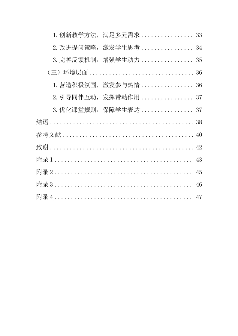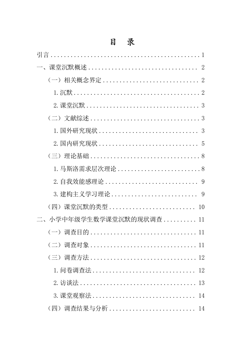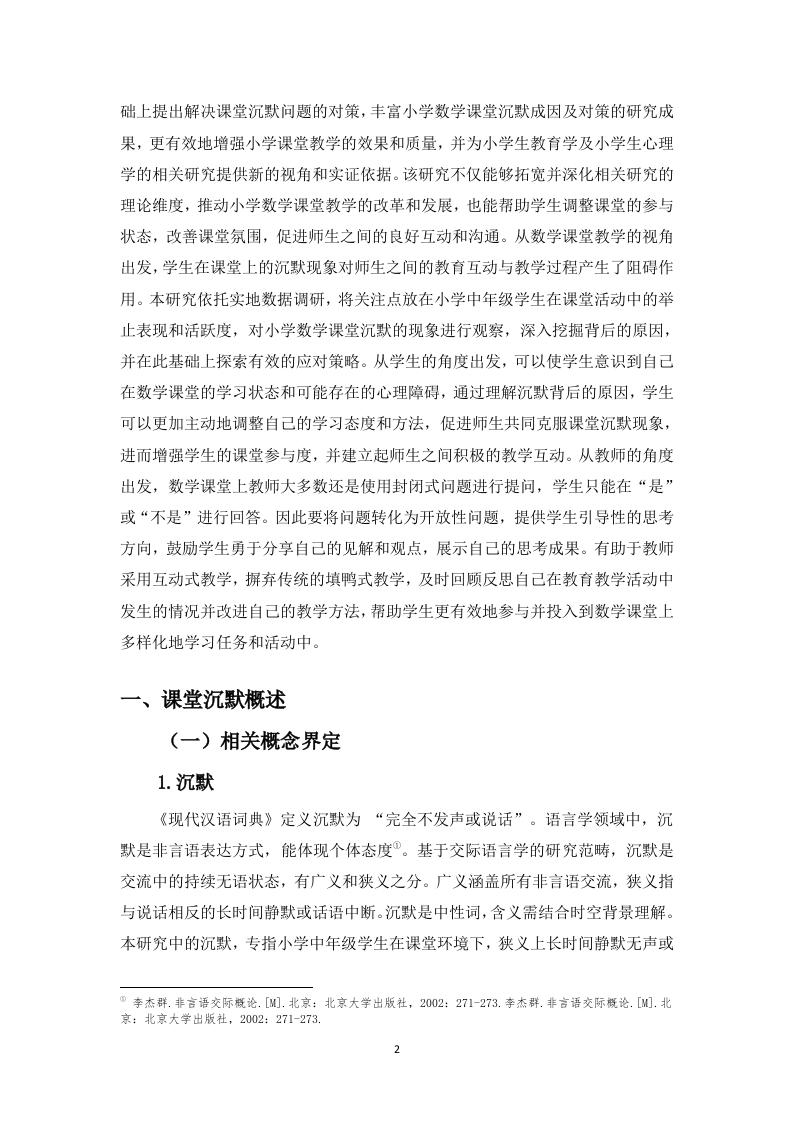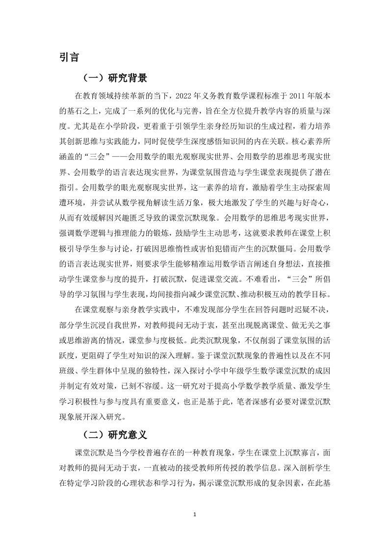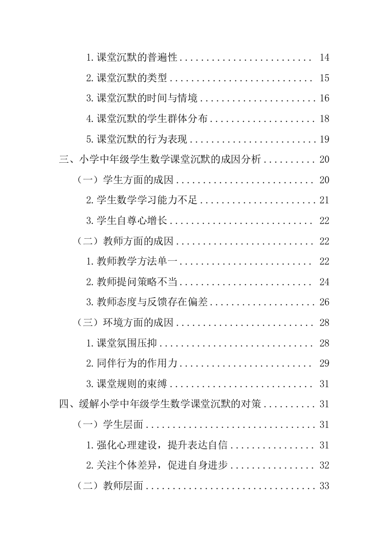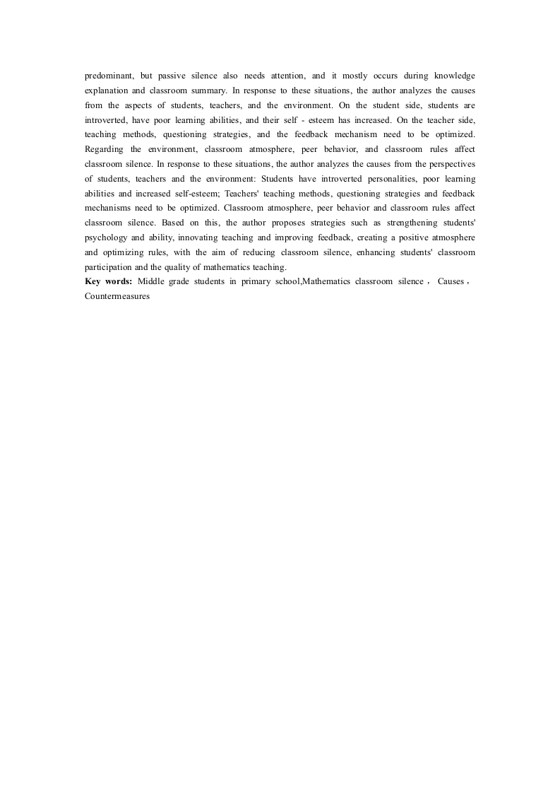 小学中年级学生数学课堂沉默的成因及对策研究作者:王彤指导教师:彭虹讲师(海南师范大学初等教育学院,海南海口,571158)摘要:小学中年级作为数学学习承上启下的关键时期,是学生思维转变与知识深化的关键节点,但课堂沉默现象的出现严重阻碍教学进程,制约学生数学思维与表达能力的发展。本研究以B县D小学三、四年级学生为研究对象,采用问卷调查法、访谈法以及课堂观察法,对小学中年级学生数学课堂沉默的现状展开深入调查。本文从普遍性、类型、时间情境、学生群体分布、行为表现五个维度,分析小学中年级数学课堂沉默现状。笔者发现课堂沉默普遍,积极沉默居多,但消极沉默也需重视,且多现于知识讲解与课堂小结。针对这些情况,笔者从学生、教师、环境层面剖析成因:学生性格内敛、学习能力欠佳、自尊心变强:教师教学方法、提问策略、反馈机制有待优化:课堂氛围、同伴行为、课堂规则影响课堂沉默。基于此,笔者提出强化学生心理与能力、创新教学与完善反馈、营造积极氛围与优化规则等策略,以期减少课堂沉默,提升学生课堂参与度和数学数学质量。关键词:小学中年级学生:数学课堂沉默:成因:对策Study on the Causes and Countermeasures of MathematicsClassroom Silence of Middle Grade Students in PrimarySchoolAuthor:Wang Tong Supervisor:Professor Peng Hong(College of Elementary Education,Hainan NormalUniversity,Haikou,Hainan,571158)Abstract:The middle grades of primary school,as a crucial period connecting the upper and lowergrades in mathematics learning,are key nodes for students'thinking transformation and knowledgedeepening.However,the emergence of classroom silence seriously hinders the teaching process andrestricts the development of students'mathematical thinking and expression abilities.This study takesthe third and fourth-grade students of D Primary School in B County as the research objects and deeplyinvestigates the current situation of mathematics classroom silence of middle grades students inprimary school by the methods of questionnaire survey,interview,and classroom observation.Theauthor analyzes the current situation from five dimensions:the universality of classroom silence,itstypes,the time and situation of its occurrence,the distribution among student groups,and thebehavioral manifestations.It finds that in mathematics classes for students in the middle grades ofprimary school,the phenomenon of classroom silence is relatively common.Among them,positivesilence dominates,but the phenomenon of negative silence cannot be ignored either.Moreover,thisphenomenon mostly occurs during the knowledge explanation and classroom summary sessions.Thisarticle analyzes the current situation of classroom silence in mathematics classes for middle gradeprimary school students from five dimensions:universality,type,time and situation,student groupdistribution,and behavior.The author finds that classroom silence is common,with active silence beingpredominant,but passive silence also needs attention,and it mostly occurs during knowledgeexplanation and classroom summary.In response to these situations,the author analyzes the causesfrom the aspects of students,teachers,and the environment.On the student side,students areintroverted,have poor learning abilities,and their self-esteem has increased.On the teacher side,teaching methods,questioning strategies,and the feedback mechanism need to be optimized.Regarding the environment,classroom atmosphere,peer behavior,and classroom rules affectclassroom silence.In response to these situations,the author analyzes the causes from the perspectivesof students,teachers and the environment:Students have introverted personalities,poor learningabi
