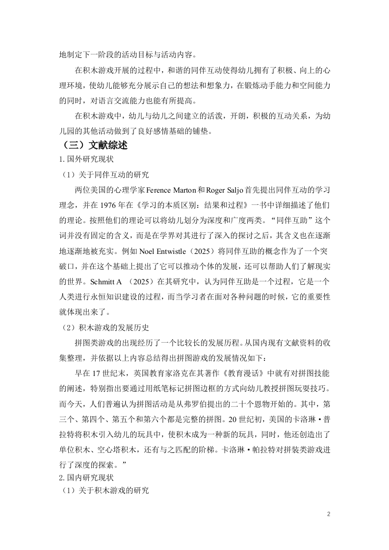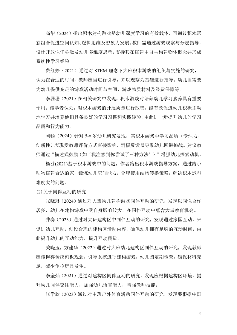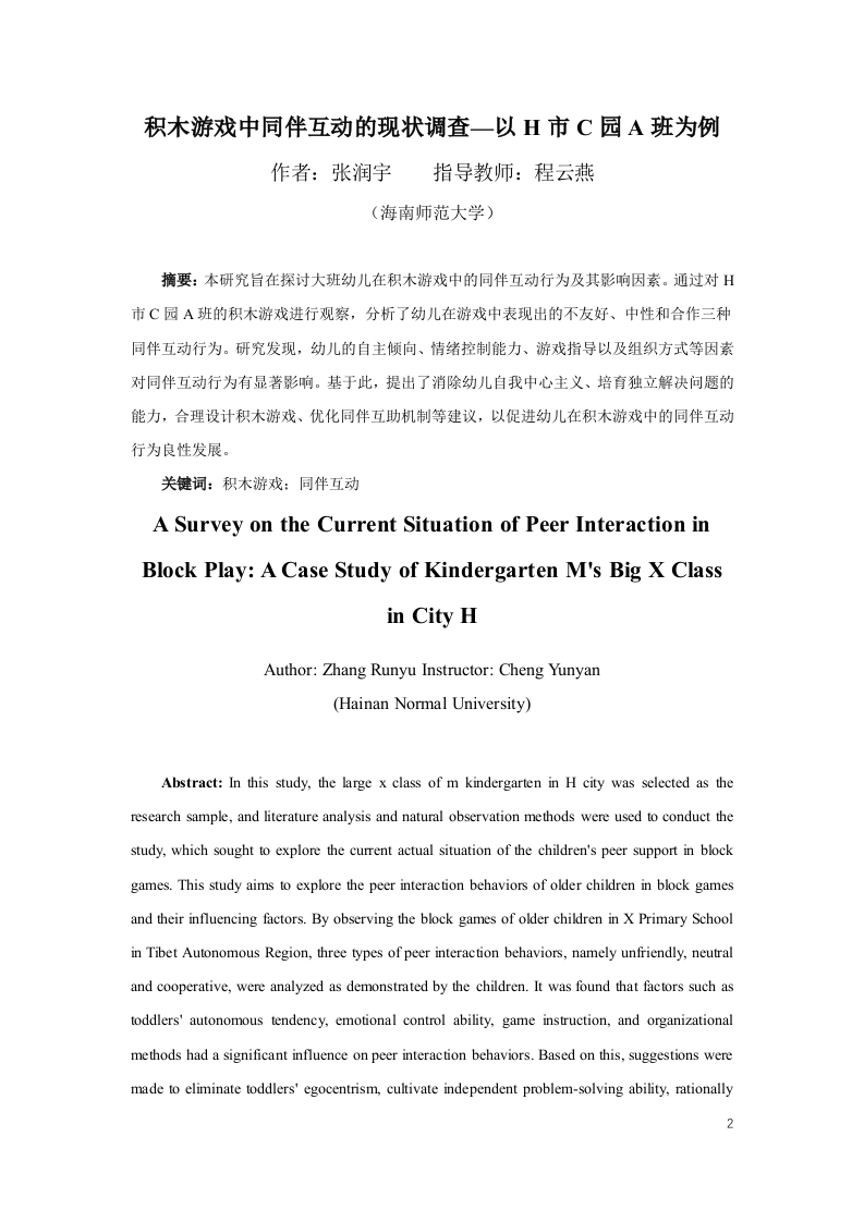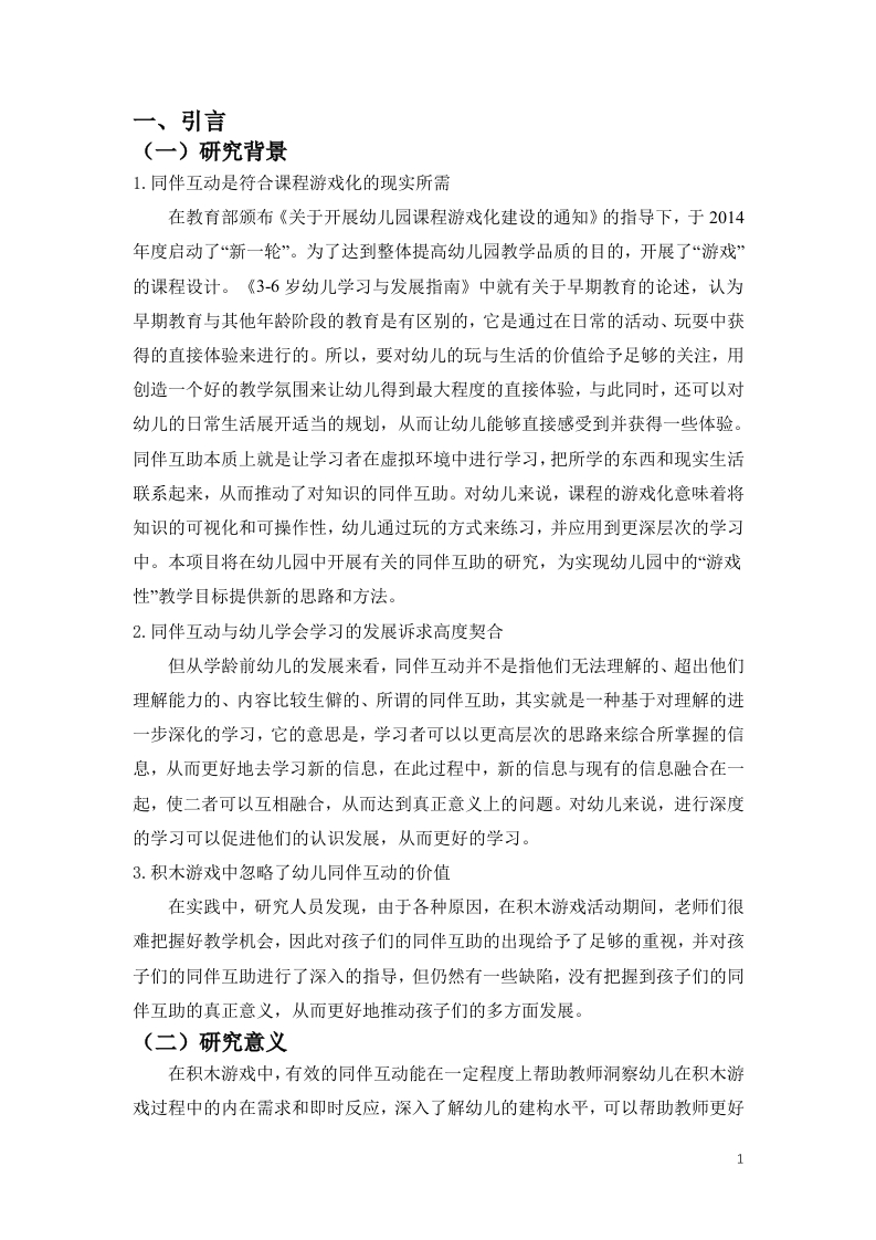 积木游戏中同伴互动的现状调查一-以H市C园A班为例目录一、引言.0.8(一)研究背景…8(二)研究意义.8(三)文献综述EEEEE EEEEEEEEEE EEE EE E9(四)核心概念界定。11二、研究设计.12(一)研究目的12(二)研究内容。12(三)研究对象.…......12(四)研究方法E EEEEE EEEEEEE12三、大班幼儿在积木游戏中同伴互动的现状13(一)互动数据…13(二)互动频次…14(三)互动行为…14(四)互动情绪现状....15(五)互动方式现状15四、大班幼儿在积木游戏中同伴互动的问题的原因.·16(一)告状问题突出..16(二)同行互动行为高于异性互动行为....17(三)幼儿情绪控制能力差...。。。00000004。。。。0051。”00。。。▣8(四)互动方式以语言动作兼有为主.…19五、大班幼儿在积木游戏中同伴互动的问题的原因20(一)幼儿自主倾向严重..20(二)异性活动偏好不同..20(三)幼儿情绪控制能力差..21(四)幼儿的语言发展能力影响幼儿同伴互动的方式..21六、促进幼儿同伴互动行为良性发展的建议.21(一)培养幼儿独立解决问题的素养..........22(二)营造良好异性互动氛围.…22(三)提升幼儿情绪控制能力....22(四)加强幼儿的语言发展能力,提高幼儿的同伴互动质量23结语…24参考文献..24附录一…0.271积木游戏中同伴互动的现状调查一以H市C园A班为例作者:张润宇指导教师:程云燕(海南师范大学)摘要:本研究旨在探讨大班幼儿在积木游戏中的同伴互动行为及其影响因素。通过对H市C园A班的积木游戏进行观察,分析了幼儿在游戏中表现出的不友好、中性和合作三种同伴互动行为。研究发现,幼儿的自主倾向、情绪控制能力、游戏指导以及组织方式等因素对同伴互动行为有显著影响。基于此,提出了消除幼儿自我中心主义、培育独立解决问题的能力,合理设计积木游戏、优化同伴互助机制等建议,以促进幼儿在积木游戏中的同伴互动行为良性发展。关键词:积木游戏:同伴互动A Survey on the Current Situation of Peer Interaction inBlock Play:A Case Study of Kindergarten M's Big X Classin City HAuthor:Zhang Runyu Instructor:Cheng Yunyan(Hainan Normal University)Abstract:In this study,the large x class of m kindergarten in H city was selected as theresearch sample,and literature analysis and natural observation methods were used to conduct thestudy,which sought to explore the current actual situation of the children's peer support in blockgames.This study aims to explore the peer interaction behaviors of older children in block gamesand their influencing factors.By observing the block games of older children in X Primary Schoolin Tibet Autonomous Region,three types of peer interaction behaviors,namely unfriendly,neutraland cooperative,were analyzed as demonstrated by the children.It was found that factors such astoddlers'autonomous tendency,emotional control ability,game instruction,and organizationalmethods had a significant influence on peer interaction behaviors.Based on this,suggestions weremade to eliminate toddlers'egocentrism,cultivate independent problem-solving ability,rationally2design block games,and optimize peer support mechanisms in order to promote the benigndevelopment of toddlers'peer interaction behaviors in block games.Key words:Large class preschoolers;Building block game3一、引言(一)研究背景1.同伴互动是符合课程游戏化的现实所需在教育部颁布《关于开展幼儿园课程游戏化建设的通知》的指导下,于2014年度启动了“新一轮”。为了达到整体提高幼儿园教学品质的目的,开展了“游戏的课程设计。《3-6岁幼儿学习与发展指南》中就有关于早期教育的论述,认为早期教育与其他年龄阶段的教育是有区别的,它是通过在日常的活动、玩耍中获得的直接体验来进行的。所以,要对幼儿的玩与生活的价值给予足够的关注,用创造一个好的教学氛围来让幼儿得到最大程度的直接体验,与此同时,还可以对幼儿的日常生活展开适当的规划,从而让幼儿能够直接感受到并获得一些体验。同伴互助本质上就是让学习者在虚拟环境中进行学习,把所学的东西和现实生活联系起来,从而推动了对知识的同伴互助。对幼儿来说,课程的游戏化意味着将知识的可视化和可操作性,幼儿通过玩的方式来练习,并应用到更深层次的学习中。本项目将在幼儿园中开展有关的同伴互助的研究,为实现幼儿园中的“游戏性”教学目标提供新的思路和方法。2.同伴互动与幼儿学会学习的发展诉求高度契合但从学龄前幼儿的发展来看,同伴互动并不是指他们无法理解的、超出他们理解能力的、内容比较生僻的、所谓的同伴互助,其实就是一种基于对理解的进一步深化的学习,它的意思是,学习者可以以更高层次的思路来综合所掌握的信息,从而更好地去学习新的信息,在此过程中,新的信息与现有的信息融合在一起,使二者可以互相融合,从而达到真正意义上的问题。对幼儿来说,进行深度的学习可以促进他们的认识发展,从而更好的学习。3.积木游戏中忽略了幼儿同伴互动的价值在实践中,研究人员发现,由于各种原因,在积木游戏活动期间,老师们很难把握好教学机会,因此对孩子们的同伴互助的出现给予了足够的重视,并对孩子们的同伴互助进行了深入的指导,但仍然有一些缺陷,没有把握到孩子们的同伴互助的真正意义,从而更好地推动孩子们的多方