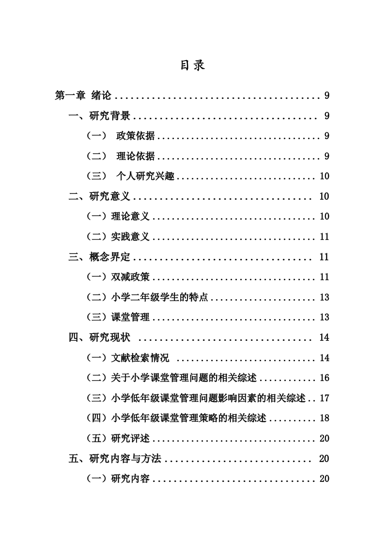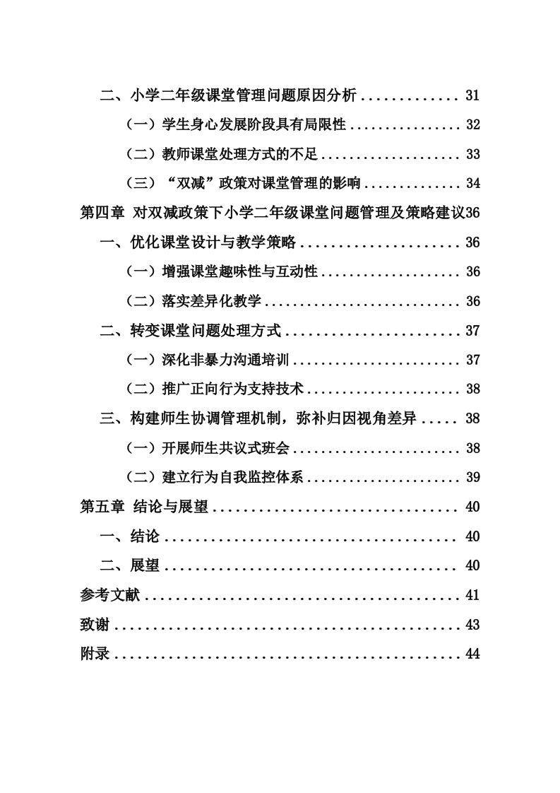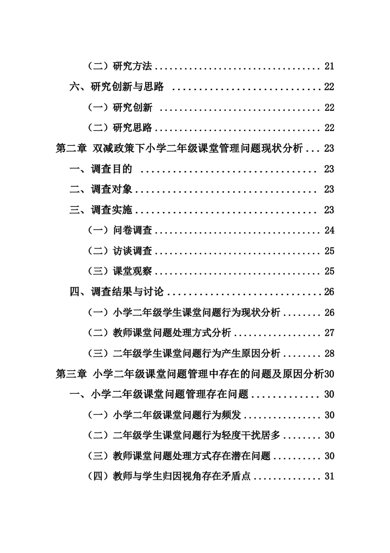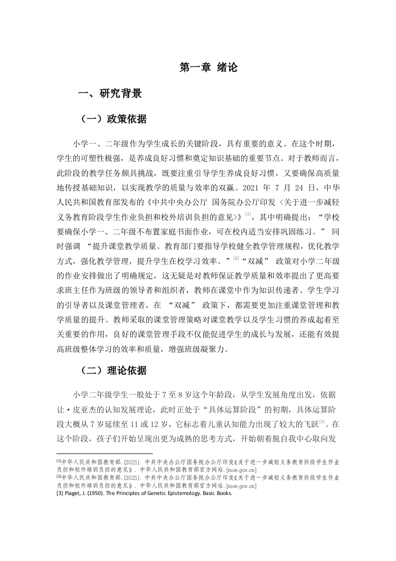 双减政策下小学二年级课堂管理问题及对策研究—一以W市S小学为例作者:陈勇指导教师:吴佳(海南师范大学初等教育学院,海口,571158)摘要:在“双减”政策的大背景之下,小学低年级阶段的课堂管理遭遇了全新的挑战,小学二年级学生的身心发展状态尚未达到成熟阶段,这使得课堂之中问题行为频繁发生,教师唯有对课堂问题进行有效的处理,才可以保证课堂教学可正常开展。本研究选取了W市S小学二年级作为实例,运用了文献资料法、问卷调查法、访谈以及课堂观察等方式。借助针对小学二年级全体学生以及教师展开问卷调查,并且对3名班主任进行访谈调查,分析小学二年级课堂问题的实际状况,探讨政策实施给课堂管理带来的影响、现存的问题以及优化的策略,从而分析W市S小学二年级课堂管理问题产生的原因,基于对问题的分析,提出具有针对性和可操作性的课堂管理策略,以提高小学二年级课堂管理的质量和效果,促进学生的全面发展。关键词:双减政策;小学二年级;课堂管理;对策研究Research on Classroom Management Issues andCountermeasures for Second-Grade Primary Schoolsunder the "Double Reduction"Policy:A Case Studyof S Primary School in W CityAuthor:Chen Yong Tutor:Wu Jia(College of Elementary Education,Hainan Normal University,Haiko u,Hainan,571158)Abstract:Under the background of the "double reduction"policy,the classroom management in thelower grades of primary school has encountered new challenges,and the physical and mentaldevelopment of students in the second grade of primary school has not yet reached the mature stage,which makes the problem behavior in the classroom occur frequently,and teachers can onlyeffectively deal with classroom problems to ensure that classroom teaching can be carried outnormally.In this study,the second grade of S primary school in W city was selected as an example,and the methods of literature method,questionnaire survey,interview,and classroom observationwere used.With the help of a questionnaire survey for all students and teachers in the second gradeof primary school,and interviews with three class teachers,the actual situation of the classroomproblems in the second grade of primary school was analyzed,and the impact of policyimplementation on classroom management,existing problems and optimization strategies werediscussed,so as to analyze the causes of the classroom management problems in the second grade ofS primary school in W city,and based on the analysis of the problems,a targeted and operableclassroom management strategy was proposed to improve the quality and effect of classroommanagement in the second grade of primary school.Promote the all-round development of students.Keywords:double reduction policy;Primary 2;classroom management;Countermeasure research目录第一章绪论.9一、研究背景9(一)政策依据..9(二)理论依据..9(三)个人研究兴趣..10二、研究意义...10(一)理论意义..10(二)实践意义....11三、概念界定...11(一)双减政策...」11(二)小学二年级学生的特点13(三)课堂管理...…13四、研究现状14(一)文献检索情况.14(二)关于小学课堂管理问题的相关综述.......16(三)小学低年级课堂管理问题影响因素的相关综述..17(四)小学低年级课堂管理策略的相关综述...·18(五)研究评述..」20五、研究内容与方法...20(一)研究内容...20(二)研究方法21六、研究创新与思路22(一)研究创新...22(二)研究思路......22第二章双减政策下小学二年级课堂管理问题现状分析.·23一、调查目的23二、调查对象23三、调查实施23(一)问卷调查...24(二)访谈调查......25(三)课堂观察25四、调查结果与讨论·..26(一)小学二年级学生课堂问题行为现状分析....·26(二)教师课堂问题处理方式分析.....27(三)二年级学生课堂问题行为产生原因分析.....28第三章小学二年级课堂问题管理中存在的问题及原因分析30一、小学二年级课堂问题管理存在问题.......30(一)小学二年级课堂问题行为频发..30(二)二年级学生课堂问题行为轻度干扰居多.....30(三)教师课堂问题处理方式存在潜在问题....30(四)教师与学生归因视角存在矛盾点.......31