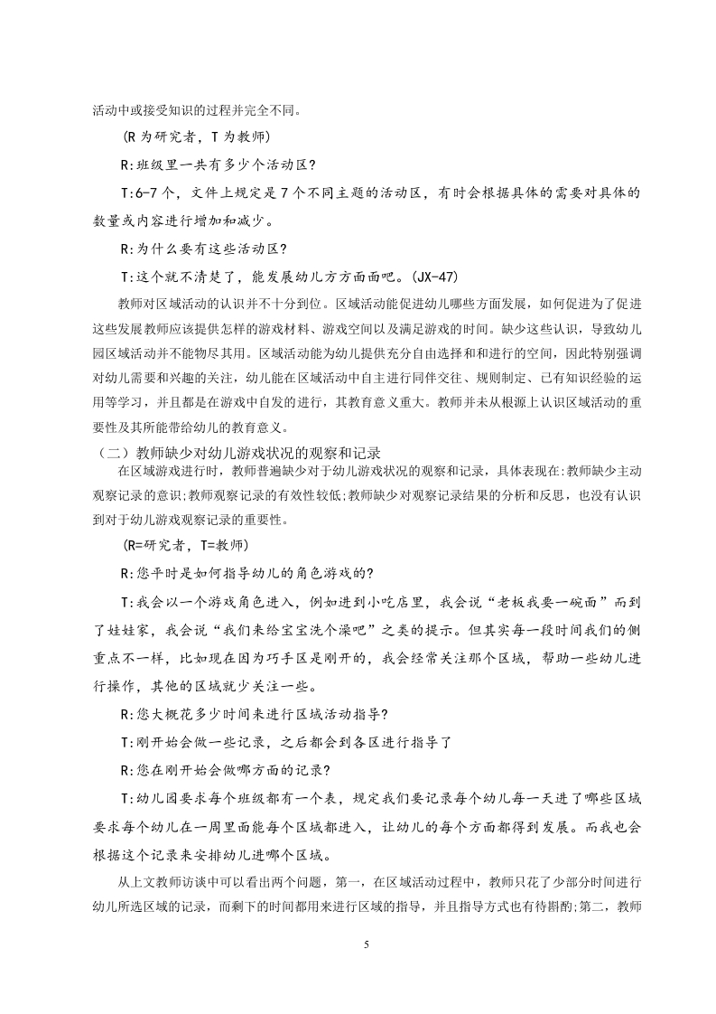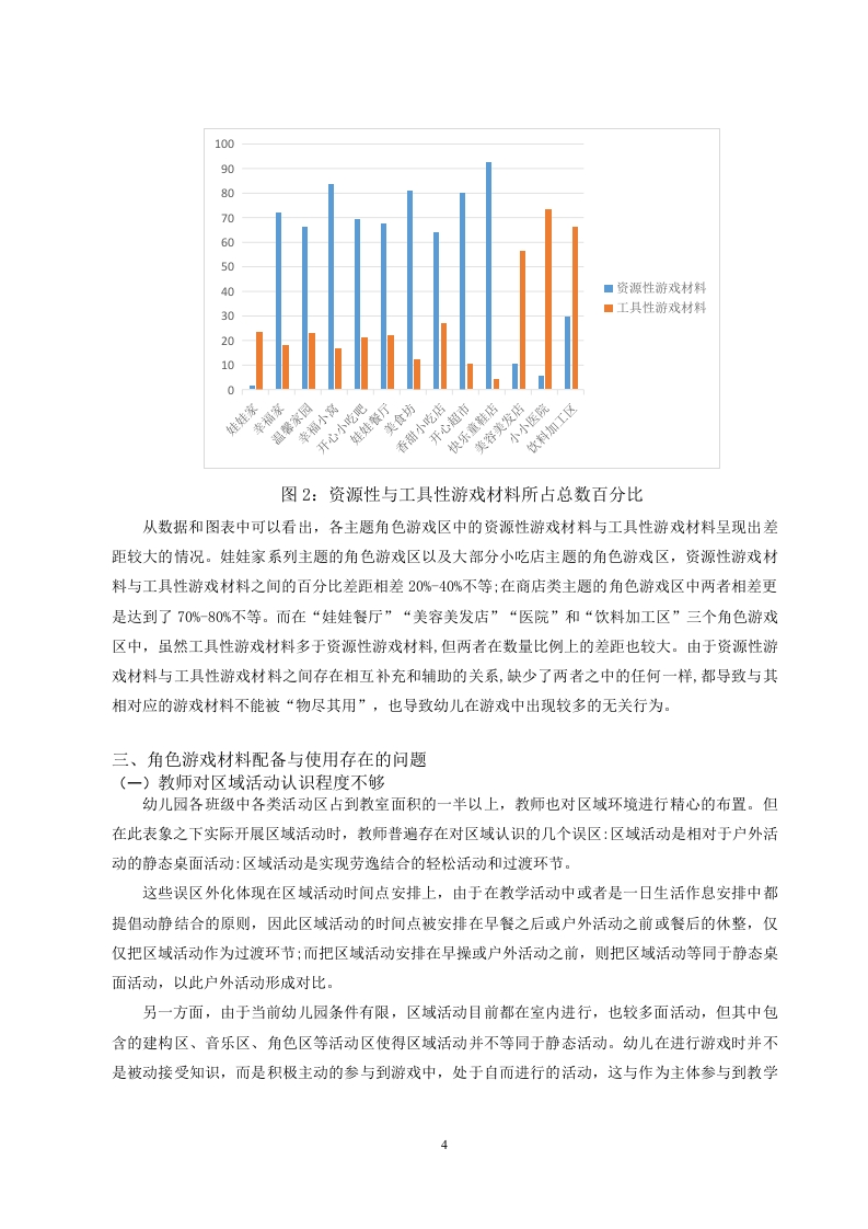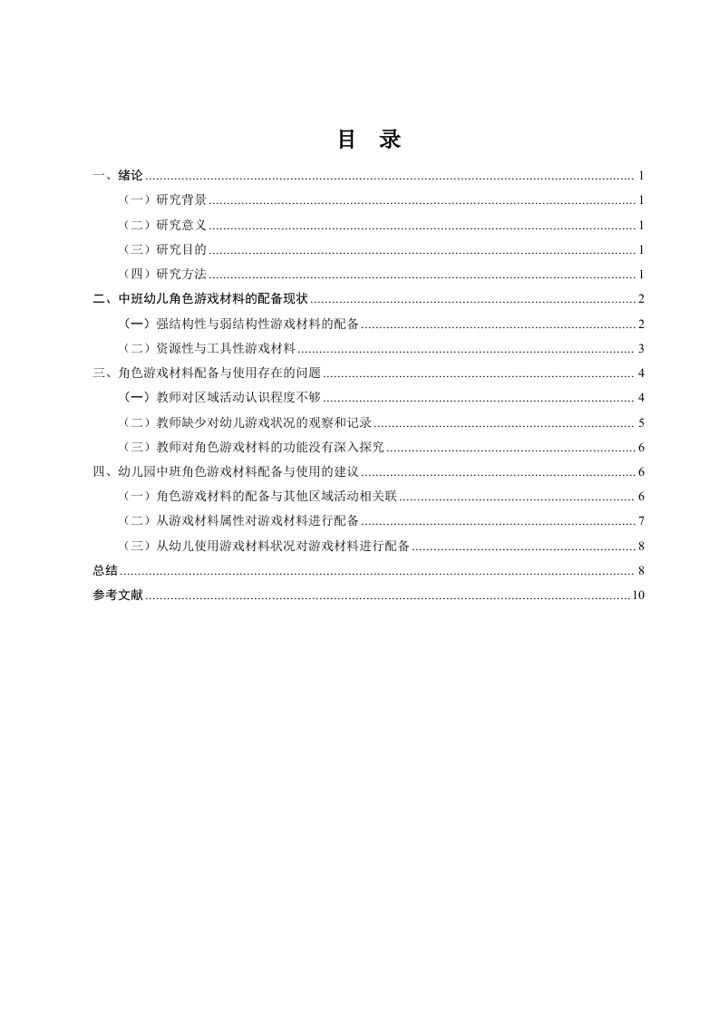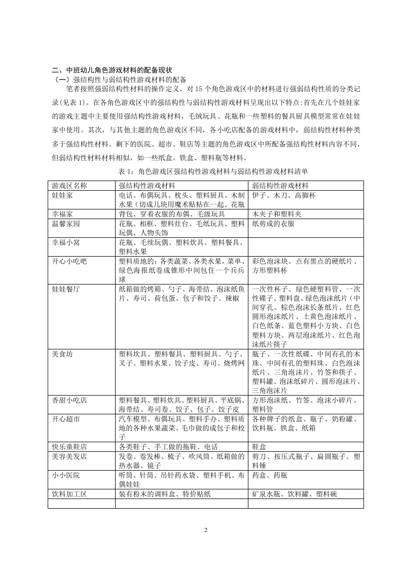 中班角色游戏中物质材料使用现状研究作者姓名作者单位指导老师:【摘要】角色游戏材料是幼儿在角色游戏区中进行角色游戏时所用玩具和物品的总称,也称为玩具或玩具材料。游戏材料是儿童游戏的物质基础,可以激发幼儿的游戏动机、游戏构思,丰富幼儿的游戏情节,引起联想和行动。对于游戏材料配备情况的调查,本研究按照强结构性游戏材料与弱结构性游戏材料、资源性游戏材料与工具性游戏材料对角色游戏区内的游戏材料进行分类,并根据四种类型的游戏材料所占数量抽取了四个角色游戏区作为典型案例,观察幼儿在这四个角色游戏区中使用游戏材料时呈现状况。找出中班角色游戏中物质材料使用中存在的问题并提出相应的对策。[关键词]中班幼儿:角色游戏材料:使用情况目录一、绪论…(一)研究背景…(二)研究意义…(三)研究目的…(四)研究方法。二、中班幼儿角色游戏材料的配备现状.2(一)强结构性与弱结构性游戏材料的配备.2(二)资源性与工具性游戏材料.…................3三、角色游戏材料配备与使用存在的问题(一)教师对区域活动认识程度不够(二)教师缺少对幼儿游戏状况的观察和记录(三)教师对角色游戏材料的功能没有深入探究….6四、幼儿园中班角色游戏材料配备与使用的建议6(一)角色游戏材料的配备与其他区域活动相关联….6(二)从游戏材料属性对游戏材料进行配备…7(三)从幼儿使用游戏材料状况对游戏材料进行配备….8总结.8参考文献.10一、绪论(一)研究背景“要关注儿童的成长,就必须关注儿童的游戏:而要关注儿童的游戏,必须重视儿童使用的玩具。”笔者曾到某幼儿园中班进行教学实习,在实习期间,发现区域活动中玩游戏的幼儿人数较少。笔者便对角色区角进行了观察,发现在角色游戏区中摆放了一张桌子和盛放游戏材料的储物柜,储物柜里面的游戏材料较陈旧,种类也较少,以布偶娃娃和塑料质地的餐具模型以及塑料水果蔬菜模型为主。这些角色游戏材料形式单一,并不能激起幼儿玩游戏的积极性,进区的幼儿玩着玩着都跑到别的活动区去了。笔者就角色游戏材料的问题咨询了带班教师,得知这些角色游戏材料是幼儿园配备的。因此角色游戏材料应该如何配备才能促进幼儿角色游戏材料的使用,产生更丰富的角色游戏情节,教师在游戏中应如何帮助幼儿获得更好的发展,这些问题都引起了笔者的思考。(二)研究意义材料是游戏的物质支柱,是幼儿游戏的工具,如果离开的游戏材料,幼儿的游戏也难以进行。学前期幼儿的思维特点以直觉行动思维为主,思维伴随着动作发生,或由动作来促进,游戏材料是引发幼儿游戏的主要因素之一。玩具及游戏材料提供的种类、数量都对幼儿的游戏交往、游戏水平产生重大影响。学习不一定是游戏,但游戏却一定是学习(包括已有经验的练习和新经验的获得),这种自发的无意性学习,主要是通过操作游戏材料在实现其娱乐功能的同时实现了它的教育功能”。因此笔者认为,如何从角色游戏区中的游戏材料的配备和使用中丰富幼儿的角色认知,密切幼儿角色之间的交流,对中班幼儿角色游戏的进行有重大意义。(三)研究目的本研究旨在探讨中班角色游戏中物质材料的使用现状,通过系统分析和实践观察,了解当前幼儿园中班角色游戏中物质材料的种类、数量、使用频率及其对幼儿发展的影响。研究目的包括:1)评估现有物质材料的配备是否符合幼儿的兴趣和需求:2)分析物质材料在角色游戏中的实际使用情况,识别存在的问题和不足:3)探讨物质材料对幼儿认知、情感和社会技能发展的作用,提出优化建议。通过本研究,期望为幼儿园教师和管理者提供科学依据,促进角色游戏材料的合理配备和有效使用,从而更好地支持幼儿的全面发展。(四)研究方法文献法:搜集与本研究相关的文献资料,了解幼儿角色游戏和角色游戏材料相关理论:收集近几年国内外针对幼儿角色游戏材料分类、配备和使用的相关研究,制定观察表:收集国内外优秀幼儿园区域活动以及角色区游戏材料配备的己有研究资料进行分析,寻找研究切入点,为提出建议部分作为参考。访谈法:本研究采用非结构式访谈,对被观察区角活动的班级教师进行访谈,了解区角的分布角色区活动时间、角色区游戏材料配备和使用等问题。基本按照访谈提纲的内容展开,但为获取更多信息,必要时会根据被访者的回答作进一步追问。二、中班幼儿角色游戏材料的配备现状(一)强结构性与弱结构性游戏材料的配备笔者按照强弱结构性材料的操作定义,对15个角色游戏区中的材料进行强弱结构性质的分类记录(见表1)。在各角色游戏区中的强结构性与弱结构性游戏材料呈现出以下特点:首先在几个娃娃家的游戏主题中主要使用强结构性游戏材料,毛绒玩具、花瓶和一些塑料的餐具厨具模型常常在娃娃家中使用。其次,与其他主题的角色游戏区不同,各小吃店配备的游戏材料中,弱结构性材料种类多于强结构性材料。剩下的医院、超市、鞋店等主题的角色游戏区中所配备强结构性材料内容不同,但弱结构性材料材料相似,如一些纸盒、铁盒、塑料瓶等材料。表1:角色游戏区强结构性游戏材料与弱结构性游戏材料清单游戏区名称强结构性游戏材料弱结构性游戏材料娃娃家电话、布偶玩具、枕头、塑料厨具、木制伊子、木刀、高脚杯水果(切成几块用魔术贴