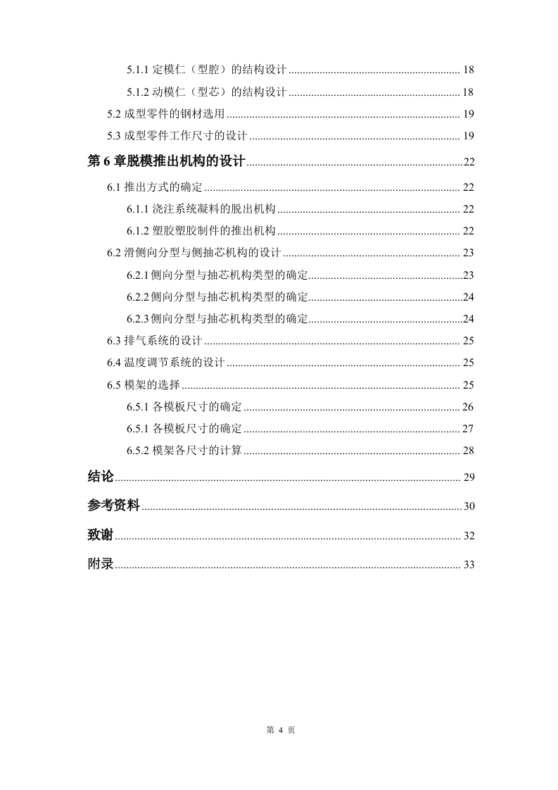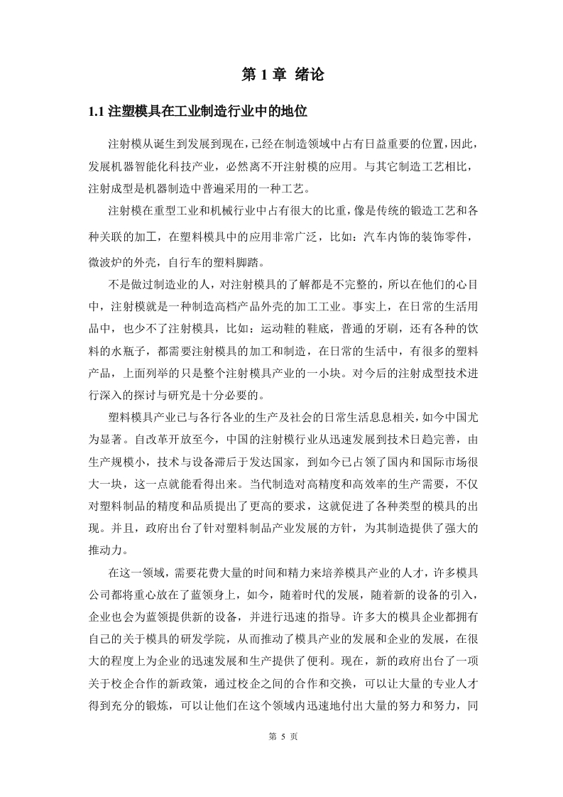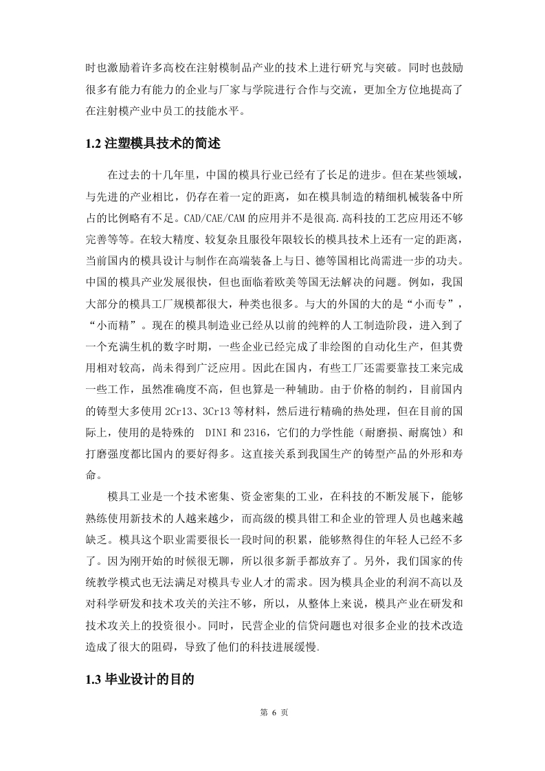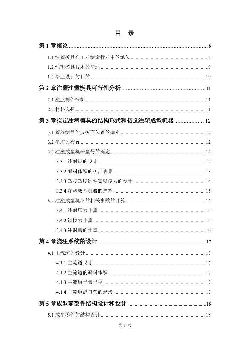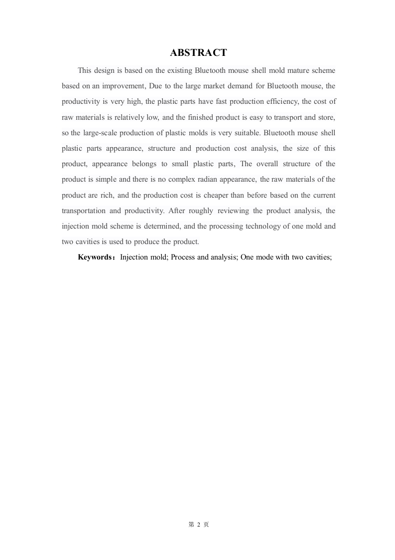 蓝牙鼠标上壳注射模具设计摘要本设计是基于现有的蓝牙鼠标上壳模具成熟方案基础上的一次改进,由于蓝牙鼠标的市场需求量大,生产力非常之高,塑胶制件拥有生产效率快、原材料成本相对较低、成品方便运输与储存,因此塑胶模具的大规模生产制造就非常合适。蓝牙鼠标上壳塑胶制件的外观、结构以及生产成本做出分析,本产品的尺寸、外观属于小型塑胶制件,产品整体结构简单且无复杂的弧度外观,产品的原料丰富、生产成本基于现在的运输与生产力更是比以往廉价,经过大概检阅的产品分析确定了注射模具方案,采用一模两腔加工工艺用以生产本产品。关键词:注射模:工艺与分析;一模两腔:第1页ABSTRACTThis design is based on the existing Bluetooth mouse shell mold mature schemebased on an improvement,Due to the large market demand for Bluetooth mouse,theproductivity is very high,the plastic parts have fast production efficiency,the cost ofraw materials is relatively low,and the finished product is easy to transport and store,so the large-scale production of plastic molds is very suitable.Bluetooth mouse shellplastic parts appearance,structure and production cost analysis,the size of thisproduct,appearance belongs to small plastic parts,The overall structure of theproduct is simple and there is no complex radian appearance,the raw materials of theproduct are rich,and the production cost is cheaper than before based on the currenttransportation and productivity.After roughly reviewing the product analysis,theinjection mold scheme is determined,and the processing technology of one mold andtwo cavities is used to produce the product.Keywords:Injection mold;Process and analysis;One mode with two cavities;第2页目录第1章绪论1.1注塑模具在工业制造行业中的地位.81.2注塑模具技术的简述..91.3毕业设计的目的10第2章注塑注塑模具可行性分析.112.1塑胶制件分析…2.2材料选择11第3章拟定注塑模具的结构形式和初选注塑成型机器123.1塑胶制品的分模面位置的确定…123.2型腔的布置123.3注塑成型机器型号的确定…123.3.1注射量的设计…123.3.2凝料体积的初步估算….133.3.3塑胶塑胶制件需锁模力的设计143.3.4注塑成型机器的选择153.4注塑成型机器的相关参数的计算153.4.1注射压力计算153.4.2锁模力计算153.4.3注射量的计算...16第4章浇注系统的设计.174.1主流道的设计..174.1.1主流道尺寸.…174.1.2主流道的凝料体积.174.1.3主流道当量半径..174.1.4主流道浇口套的形式17第5章成型零部件结构设计和设计】185.1成型零件的结构设计。第3页5.1.1定模仁(型腔)的结构设计.185.1.2动模仁(型芯)的结构设计185.2成型零件的钢材选用195.3成型零件工作尺寸的设计…19第6章脱模推出机构的设计226.1推出方式的确定…..226.1.1浇注系统凝料的脱出机构…..226.1.2塑胶塑胶制件的推出机构.…226.2滑侧向分型与侧抽芯机构的设计.236.2.1侧向分型与抽芯机构类型的确定..236.2.2侧向分型与抽芯机构类型的确定246.2.3侧向分型与抽芯机构类型的确定..246.3排气系统的设计.256.4温度调节系统的设计…25)膜尖的选泽..256.5.1各模板尺寸的确定.266.5.1各模板尺寸的确定….276.5.2模架各尺寸的计算28结论29参考资料.30致谢32附录33第4页