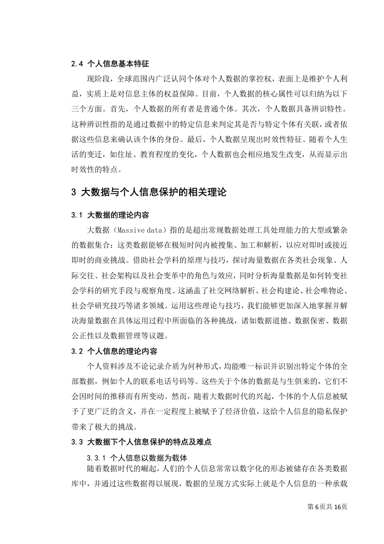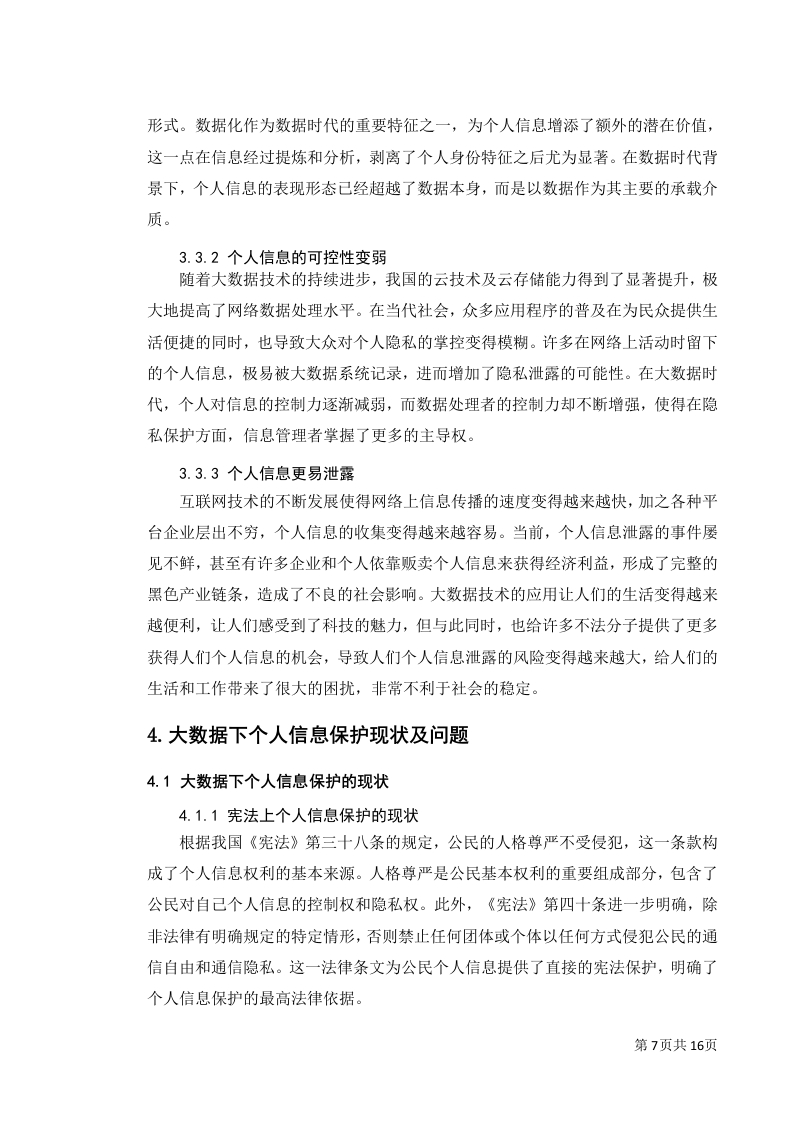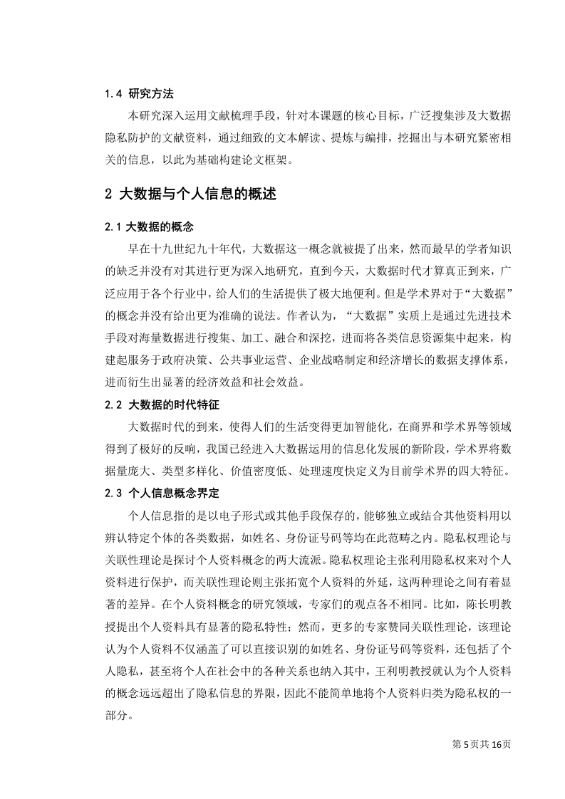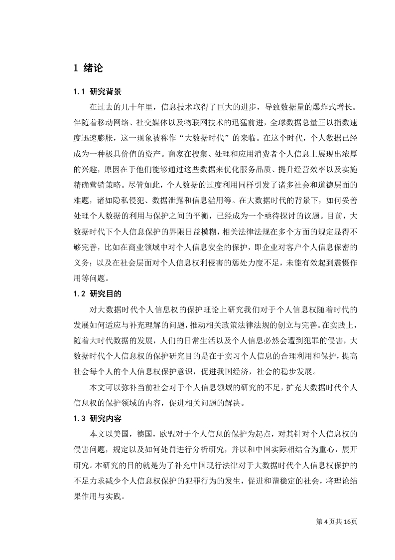 大数据技术背景下个人信息法律保护摘要:随着大数据时代到来,大数据技术深入日常,极大地丰富了我们的生活质量。然而,这把双刃剑也使得个人隐私面临前所未有的威胁。在我国,政府部门在处理公民数据时,扮演着双重角色一一既是数据的利用者,也是数据的守护者。若能妥善运用公民数据,不仅能显著增强行政效能,还能确保政策制定的合理性与精确度。然而,一旦数据泄露,后果不堪设想。鉴于此,本文聚焦于个人信息在行政法中的保护,深入剖析了我国个人信息保护的现状,揭示了在大数据背景下行政保护面临的挑战,并提出了针对性的保护策略。关键词:大数据时代:个人信息:行政法保护第1页共16页目录1绪论31.1研究背景1.2研究目的....。。。。。。41.3研究内容...…1.4研究方法...…42大数据与个人信息的概述..·52.1大数据的概念....52.2大数据的时代特征..。2.3个人信息概念界定...52.4个人信息基本特征....53大数据与个人信息保护的相关理论63.1大数据的理论内容....63.2个人信息的理论内容......63.3大数据下个人信息保护的特点及难点64.大数据下个人信息保护现状及问题...4.1大数据下个人信息保护的现状.....074.2大数据下个人信息保护的问题....95大数据运用与个人信息行政法保护的平衡及域外经验...·115.1以美国为例的分散立法模式..115.2以德国为例的综合立法模式....父5.3对我国个人信息行政法保护的启示..·126大数据时代个人信息行政法保护的立法建议..........126.1健全个人信息行政监管机制.....126.2构建个人信息行政公益诉讼制度..................136.3建立大数据个人信息处理的行政许可制度.............137总结..14参考文献.15第2页共16页致谢17第3页共16页1绪论1.1研究背景在过去的几十年里,信息技术取得了巨大的进步,导致数据量的爆炸式增长。伴随着移动网络、社交媒体以及物联网技术的迅猛前进,全球数据总量正以指数速度迅速膨胀,这一现象被称作“大数据时代”的来临。在这个时代,个人数据已经成为一种极具价值的资产。商家在搜集、处理和应用消费者个人信息上展现出浓厚的兴趣,原因在于他们能够通过这些数据来优化服务品质、提升经营效率以及实施精确营销策略。尽管如此,个人数据的过度利用同样引发了诸多社会和道德层面的难题,诸如隐私侵犯、数据泄露和信息滥用等。在大数据时代的背景下,如何妥善处理个人数据的利用与保护之间的平衡,已经成为一个亟待探讨的议题。目前,大数据时代下个人信息保护的界限日益模糊,相关法律法规在多个方面的规定显得不够完善,比如在商业领域中对个人信息安全的保护,即企业对客户个人信息保密的义务:以及在社会层面对个人信息权利侵害的惩处力度不足,未能有效起到震慑作用等问题。1.2研究目的对大数据时代个人信息权的保护理论上研究我们对于个人信息权随着时代的发展如何适应与补充理解的问题,推动相关政策法律法规的创立与完善。在实践上,随着大时代数据的发展,人们的日常生活以及个人信息必然会遭到犯罪的侵害,大数据时代个人信息权的保护研究目的是在于实习个人信息的合理利用和保护,提高社会每个人的个人信息权保护意识,促进我国经济,社会的稳步发展。本文可以弥补当前社会对于个人信息领域的研究的不足,扩充大数据时代个人信息权的保护领域的内容,促进相关问题的解决。1.3研究内容本文以美国,德国,欧盟对于个人信息的保护为起点,对其针对个人信息权的侵害问题,规定以及如何处罚进行分析研究,并以和中国实际相结合为重心,展开研究。本研究的目的就是为了补充中国现行法律对于大数据时代个人信息权保护的不足力求减少个人信息权保护的犯罪行为的发生,促进和谐稳定的社会,将理论结果作用与实践。第4页共16页