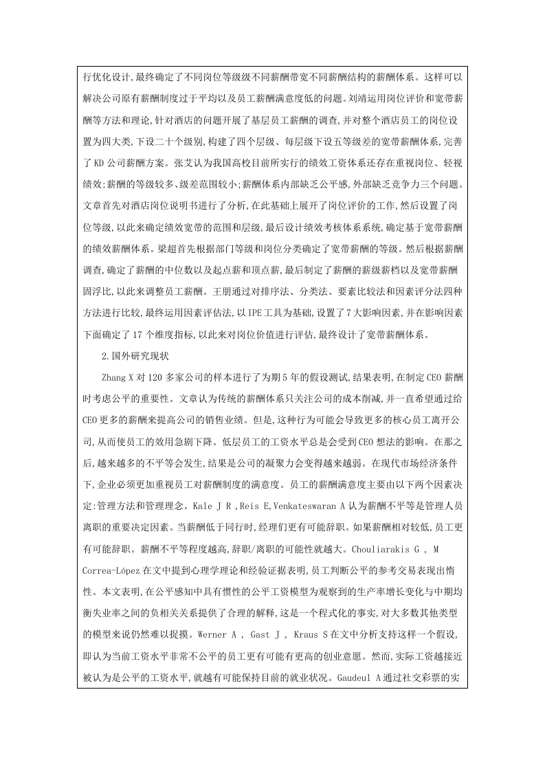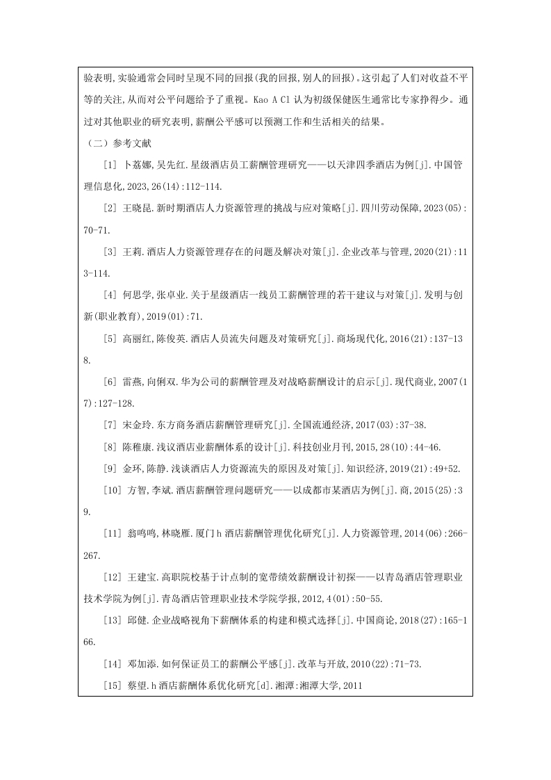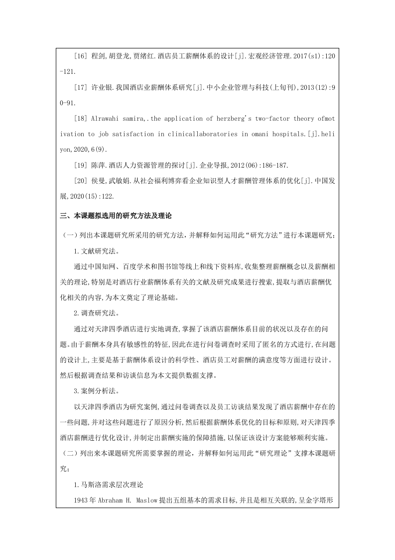 中瑞酒店管理学院本科毕业论文(设计)选题说明书姓名学号专业班级第一次实习第一次实习单位及部门单位及部门题目类型论文/设计研究方向拟选题目天津四季酒店薪酬体系优化研究选题说明一、选题依据(500字左右)(一)研究背景和目的1、研究背景党的十九大报告中明确指出,我国的经济目前己经由高速增长的阶段转向了高质量发展的阶段。任何企业在这个高质量发展的阶段都需要配备一批高素质人才来推动。自2019年爆发疫情以来,我国各个行业都受到了巨大的冲击,这也包括了酒店酒店以及住宿等服务型的行业。2021年我国国内疫情防控形势逐渐好转,居民节假日出行的意愿也渐渐增强,因此旅游市场出现了有序复苏的局面。面对该发展机遇,如何保证企业的生存并实现盈利成为了每个企业所必须思考的问题。习近平总书记在大会上指出,人才是实现民族振兴、赢得国际竞争主动的战略资源。同样,人才也是每个企业健康稳定发展的核心竞争力,是企业不容忽视的战略性资源。那么既要保证企业持续稳定发展,又要保证合理的薪酬结构对员工的激励性,如何在“降低人工成本”和“提高员工满意度”之间进行权衡就成为了企业所面临的一道难题。2、研究目的企业员工都具有多元且平衡的需要,当自己所关心的各种需要得到平衡满足时,通常表现为积极的工作态度及行为。本文将引入全面薪酬的概念,旨在从外在薪酬和内在薪酬两个维度满足员工的不同需求,进而提升员工薪酬的满意度,实现薪酬的激励性。本文所关注的案例企业是一家典型的服务业企业,高端的综合型酒店,拥有160名员工,经营范围广,包含了酒店、住宿、会议、休闲娱乐等多种服务项目,还配套有影院、商场等服务项目。为了将酒店的人工成本控制在理想范围内,同时不降低员工薪酬的满意度,只有对员工薪酬体系进行充分设计,才能发挥员工工作的潜能,从而提升酒店效益。(二)研究意义1.理论意义在全面薪酬理论的基础上,利用需求层次理论、宽带薪酬等理论,以天津四季酒店为具体研究对象,根据员工岗位价值进行准确定位,使员工工作贡献值与薪酬相匹配。此外,根据企业发展规划和薪酬管理办法,综合薪酬体系设计中的公平、竞争、激励等原则和最新酒店行业的要求对薪酬体系进行优化设计,促使员工个人目标与企业总体目标相符。优化后的薪酬体系丰富了薪酬方面的研究方法及设计思路。可以有效的丰富薪酬方面的理论研究。2.现实意义酒店服务行业作为典型的现代服务业,具有一线服务员工流动性较大、岗位替代性较强的特点,从而会增加重复培训的成本。本文将根据酒店服务行业的特点,对天津四季酒店员工进行问卷调查,通过对内部薪酬体系中的不同组成部分进行调查研究,并参考外部同行业同水平的薪酬体系进行科学合理的设计,完善了天津四季酒店薪酬体系的构建思路,科学规范的薪酬体系给天津四季酒店的人力资源管理提供了指导。为天津四季酒店人力资源的管理夯实了工作基础。二、本课题的文献综述和参考文献(一)文献综述1.国内研究现状王婕霏以高端酒店为例,酒店只有建立科学规范的薪酬体系,才能降低员工的经济压力,优化后的薪酬体系能够确保酒店经营发展的目标和员工努力的方向的一致性。调整后的薪酬结构中比较明显的部分是工龄工资,作者认为工龄工资主要是对酒店老员工的一个回报,可以提升员工对酒店的忠诚感,让员工为酒店不断创造出经济效益。章有才以中小型酒店为研究对象,认为受宏观形势的影响,中小型酒店员工的流失率不新断提高,而薪酬体系最主要的原因就是薪酬,因此作者对酒店原有的薪酬体系进行了系统地优化配置。王寅、梁军、荆亚宇和张松婷对星级酒店进行研究,认为通过调整酒店内部的薪酬构成,可以体现员工的工作价值以及对员工工作产生激励作用,不仅能够解决当地居民就业,还能提升整个酒店服务业水平。李婧从商务酒店的角度对员工薪酬进行了优化设计。徐玉冰以连锁酒店为研究对象,对整个酒店的薪酬体系展开了系统地研究,并对其进行了改进。叶蕊探索了经济型酒店薪酬体系的问题。宋宾宾对近年来所出现的度假酒店员工薪酬体系进行了优化设计。梁沫以国企A公司工程人员为研究对象,作者根据宽带薪酬的设计思路对A公司工程人员的薪酬体系进行优化设计,最终确定了不同岗位等级级不同薪酬带宽不同薪酬结构的薪酬体系。这样可以解决公司原有薪酬制度过于平均以及员工薪酬满意度低的问题。刘靖运用岗位评价和宽带薪酬等方法和理论,针对酒店的问题开展了基层员工薪酬的调查,并对整个酒店员工的岗位设置为四大类,下设二十个级别,构建了四个层级、每层级下设五等级差的宽带薪酬体系,完善了KD公司薪酬方案。张艾认为我国高校目前所实行的绩效工资体系还存在重视岗位、轻视绩效:薪酬的等级较多、级差范围较小:薪酬体系内部缺乏公平感,外部缺乏竞争力三个问题。文章首先对酒店岗位说明书进行了分析,在此基础上展开了岗位评价的工作,然后设置了岗位等级,以此来确定绩效宽带的范围和层级,最后设计绩效考核体系系统,确定基于宽带薪酬的绩效薪酬体系。梁超首先根据部门等级和岗位分类确定了宽带薪酬的等级。然后根据薪酬调查,确定了薪酬的中位数以及起点薪和顶点薪,