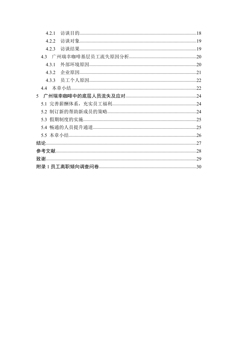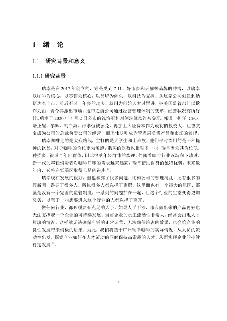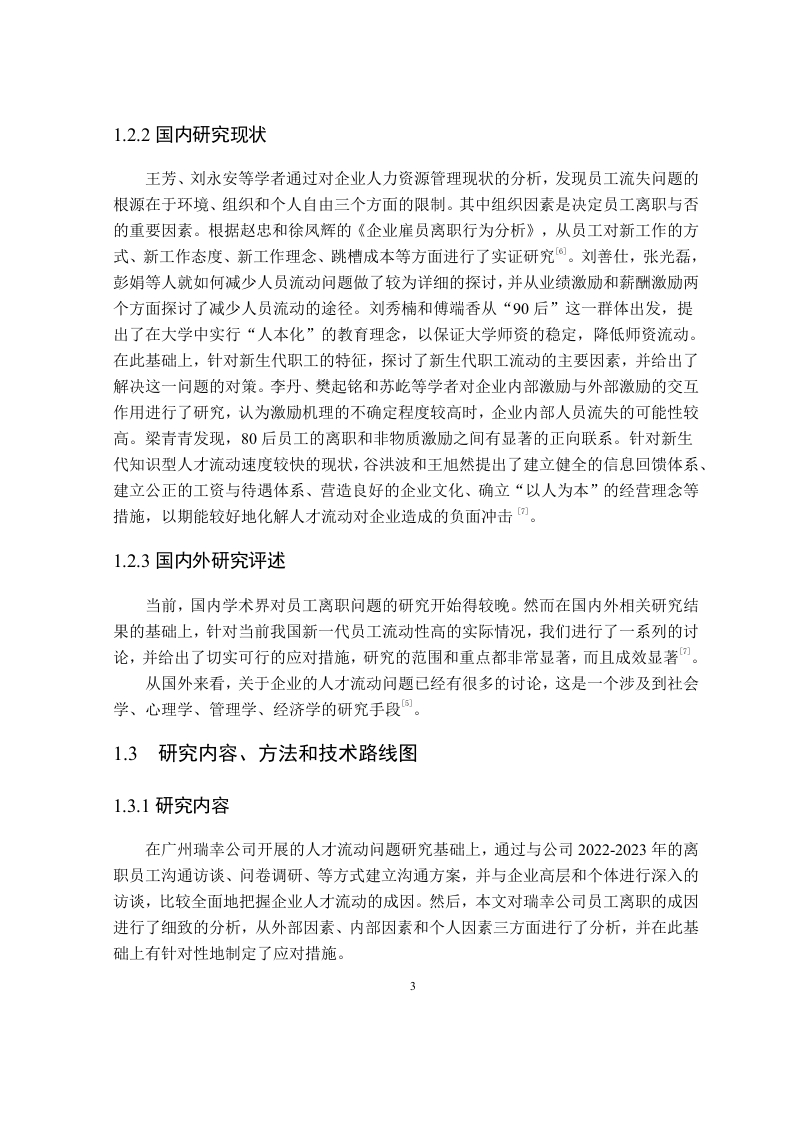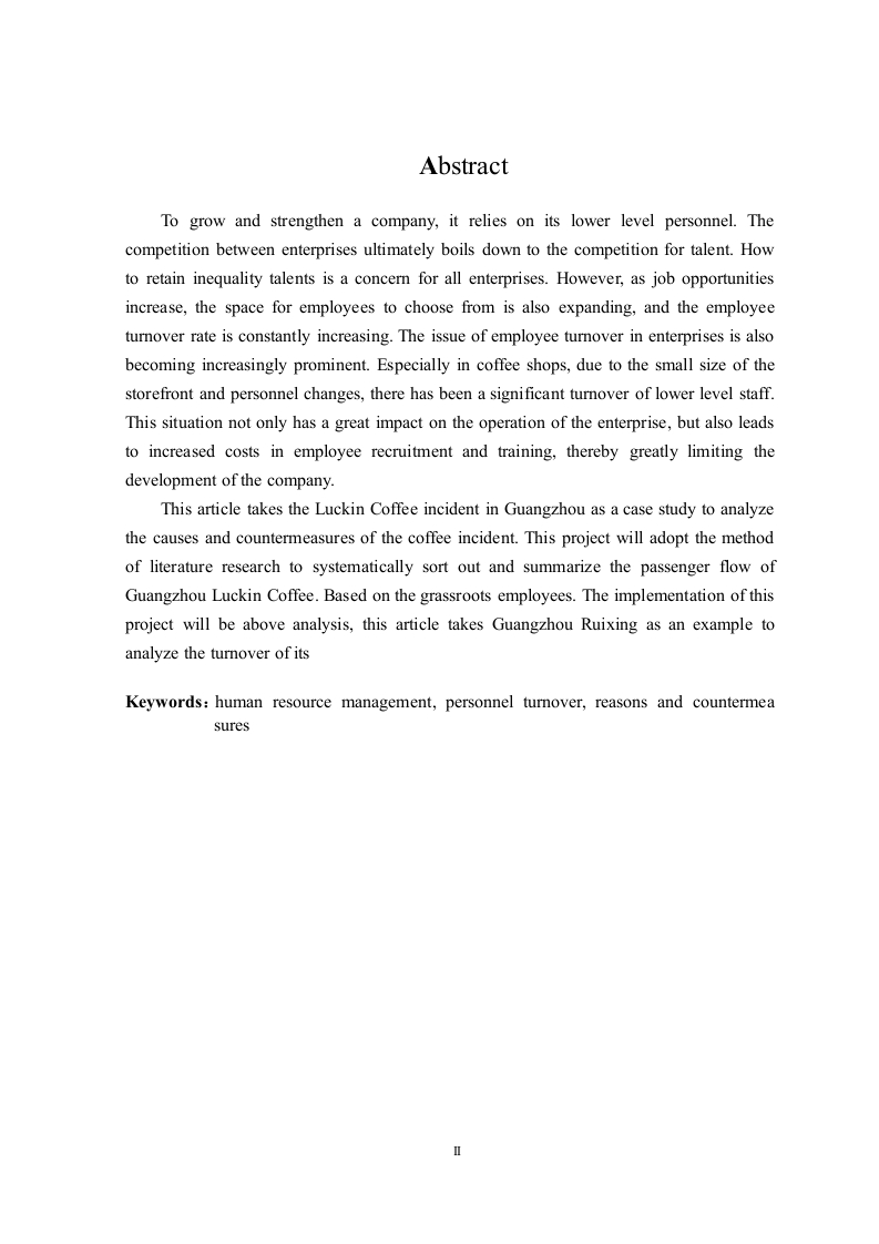 企业员工流失问题及对策研究一以广州瑞幸咖啡为例摘要企业要做大做强,靠的是企业的底层人员,企业与企业的竞争,归根到底是对人才的争夺。如何留住高素质的人才,是所有企业所关注的问题。但是在就业岗位增多的同时员工可供选择的空间越来越大,员工流动率也在不断提高,企业的员工流动问题也日趋突出。特别是在咖啡店,因为店面小加上人事的变化,造成了底层职员的大量流动。这样的情况不仅给企业的运营带来极大的影响,而且还会导致员工招聘和培训等方面的费用增加,从而使公司的发展受到极大的限制。本文以广州的瑞幸咖啡风波为个案,剖析了咖啡风波的成因及对策。本课题将采用文献调研的方法,对广州瑞幸咖啡的客流进行系统梳理和归纳。基于以上分析本文以广州瑞幸为例,分析了其基层员工的流动情况,该项目的实施将为瑞幸在广州的员工流动以及整个咖啡产业的良性发展提供理论依据。关键词:人力资源管理:人员流失:原因与对策AbstractTo grow and strengthen a company,it relies on its lower level personnel.Thecompetition between enterprises ultimately boils down to the competition for talent.Howto retain inequality talents is a concern for all enterprises.However,as job opportunitiesincrease,the space for employees to choose from is also expanding,and the employeeturnover rate is constantly increasing.The issue of employee turnover in enterprises is alsobecoming increasingly prominent.Especially in coffee shops,due to the small size of thestorefront and personnel changes,there has been a significant turnover of lower level staff.This situation not only has a great impact on the operation of the enterprise,but also leadsto increased costs in employee recruitment and training,thereby greatly limiting thedevelopment of the company.This article takes the Luckin Coffee incident in Guangzhou as a case study to analyzethe causes and countermeasures of the coffee incident.This project will adopt the methodof literature research to systematically sort out and summarize the passenger flow ofGuangzhou Luckin Coffee.Based on the grassroots employees.The implementation of thisproject will be above analysis,this article takes Guangzhou Ruixing as an example toanalyze the turnover of itsKeywords:human resource management,personnel turnover,reasons and countermeasures目录原创性声明摘要.Abstract.…....1绪论..11.1研究背景和意义1.1.1研究背景1.1.2研究目的……21.1.3研究意义…21.2文献综述..21.2.1国外研究现状.1.2.2国内研究现状…1.2.3国内外研究述评….31.3研究内容、方法和技术路线图.31.3.1研究内容…31.3.2研究方法..41.3.3技术路线图.41.4本章小结….52基础理论及相关概念。.621主要基础理论.62.2相关概念阐释….62.3本章小结..73广州瑞幸咖啡的发展与基层人员的流动,.83.1瑞幸咖啡在广州的概况.83.1.1瑞幸咖啡在广州的人员流动状况.….83.1.2瑞幸咖啡店的人员构成83.2瑞幸咖啡在广州的底层人员流动情况….83.3瑞幸咖啡对广州地区基层人员流动的影响103.3.1基层人员流动对雇员个体的影响.103.3.2瑞幸在广州的底层人员流动...113.4本章小结124瑞幸在广州的员工流动状况调查与分析...144.1企业在职人员问卷调查的结果分析..144.2设计和实施离职者访谈….184.2.1访谈目的.184.2.2访谈对象194.2.3访谈结果.194.3广州瑞幸咖啡基层员工流失原因分析204.3.1外部环境原因.204.3.2企业原因214.3.3员工个人原因…224.4本章小结…225广州瑞幸咖啡中的底层人员流失及应对…245.1完善薪酬体系,充实员工福利…245.2制订新的帮助新成员的策略.245.3假期制度的实施..…255.4畅通的人员提升通道.255.5本章小结..26结论.27参考文献,28致谢29附录1员工离职倾向调查问卷,30