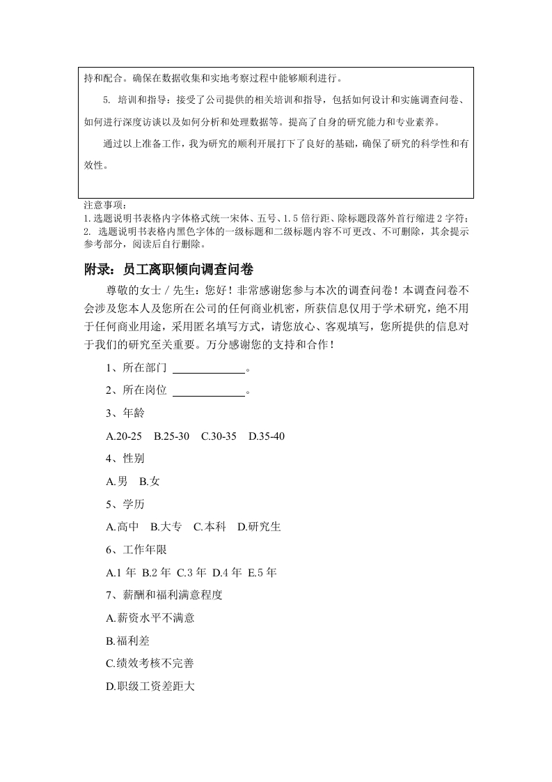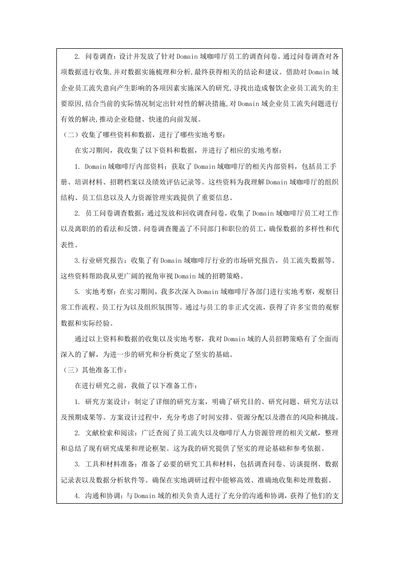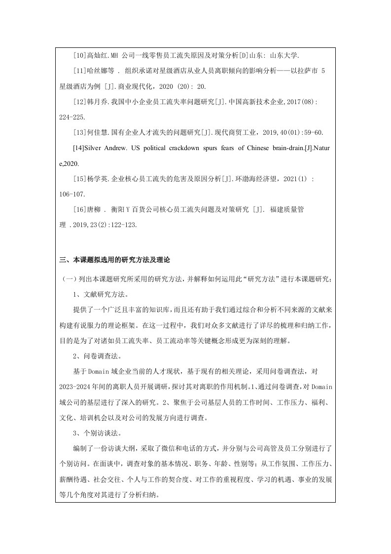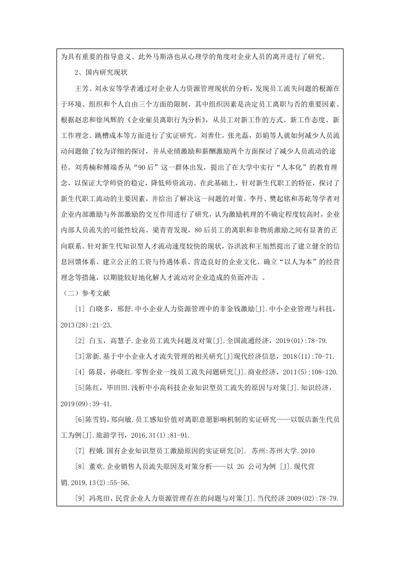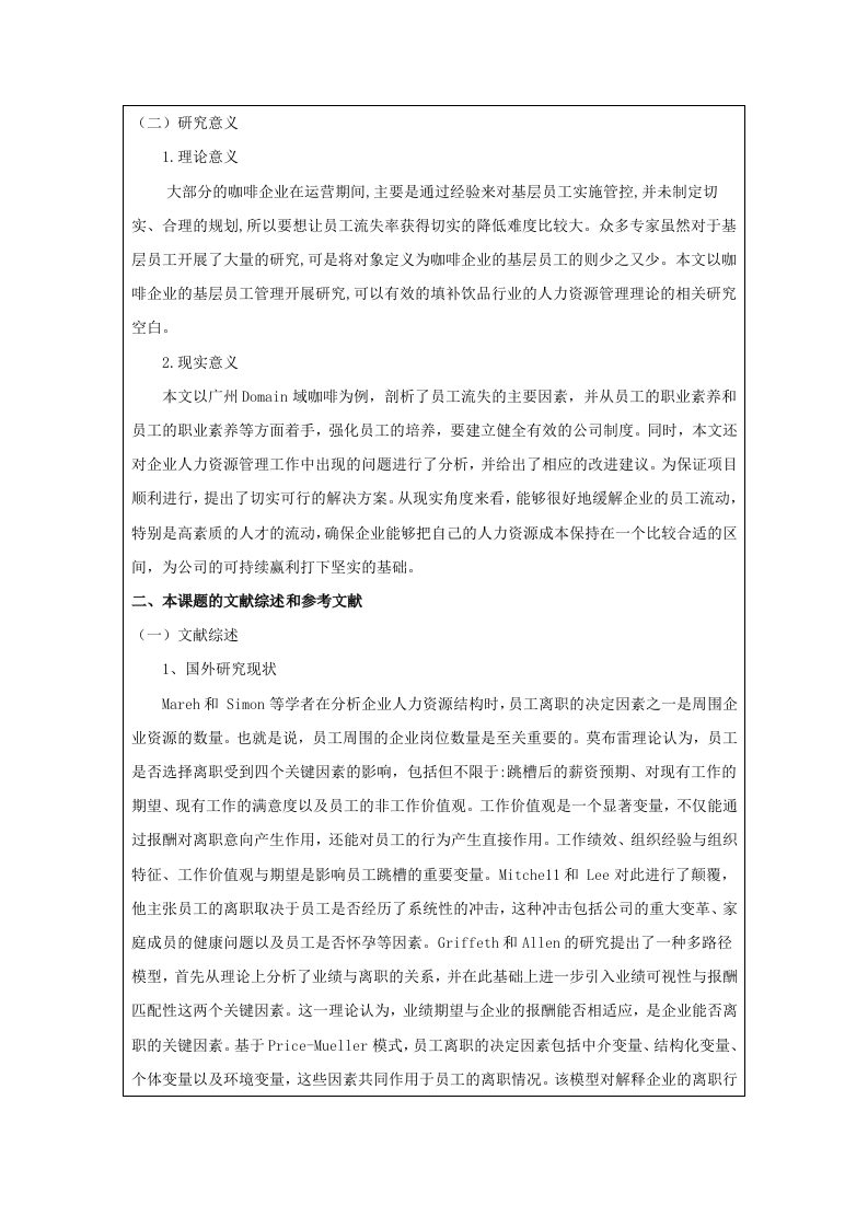 中瑞酒店管理学院本科毕业论文(设计)选题说明书姓名学号专业班级第一次实习第一次实习单位及部门单位及部门题目类型研究方向拟选题目企业员工流失问题及对策研究一一以Domain域咖啡厅为例选题说明一、选题依据(一)研究背景和目的1.研究背景Domain域咖啡走的是大众路线,主打的是大学生和上班族,他们平时饮用的是一种提神的饮品,对于咖啡的价位更为敏感,购买的次数也相对多一些,Domain域因为其价位低,种类多,很适合年轻群体,因此很受年轻群体的欢迎。伴随着咖啡行业逐渐向下渗透,新一代的年轻消费者对咖啡口味的需求越来越高,Domain域借助自身的独特优势,未来数年内,必将在低端区取得长足的进步。Domain域现在发展的很好,但也暴露了很多问题,比如公司的管理混乱,还有很多的假新闻,误导了很多人,所以很多人都选择了离职。这里面也有一个很大的原因,那就是没有一个完善的监管制度,一系列的问题加在一起,让这个行业的生态变得更加恶劣,以至于一些想要进入这个行业的人都选择了离开。做任何行业,都必须要有充足的人手,如果人手不够,那么做出来的产品再好也无法支撑起一个企业的可持续发展。当前企业的员工流动性非常大,经常会出现人才短缺的情况,这样就无法确保店铺的正常运营,无法确保培训的效果,也会给企业的良性发展带来消极的后果。2.研究目的文章基于人员流动的相关理论,针对当前在咖啡师行业中员工流动性相对较高的现实状况剖析原因并针对该问题提出对策,以此作为对咖啡师行业员工离职问题的研究的一个有效的补充,促进了我国的人力资源管理与企业经营理论的发展。(二)研究意义1.理论意义大部分的咖啡企业在运营期间,主要是通过经验来对基层员工实施管控,并未制定切实、合理的规划,所以要想让员工流失率获得切实的降低难度比较大。众多专家虽然对于基层员工开展了大量的研究,可是将对象定义为咖啡企业的基层员工的则少之又少。本文以咖啡企业的基层员工管理开展研究,可以有效的填补饮品行业的人力资源管理理论的相关研究空白。2.现实意义本文以广州Domain域咖啡为例,剖析了员工流失的主要因素,并从员工的职业素养和员工的职业素养等方面着手,强化员工的培养,要建立健全有效的公司制度。同时,本文还对企业人力资源管理工作中出现的问题进行了分析,并给出了相应的改进建议。为保证项目顺利进行,提出了切实可行的解决方案。从现实角度来看,能够很好地缓解企业的员工流动,特别是高素质的人才的流动,确保企业能够把自己的人力资源成本保持在一个比较合适的区间,为公司的可持续赢利打下坚实的基础。二、本课题的文献综述和参考文献(一)文献综述1、国外研究现状Mareh和Simon等学者在分析企业人力资源结构时,员工离职的决定因素之一是周围企业资源的数量。也就是说,员工周围的企业岗位数量是至关重要的。莫布雷理论认为,员工是否选择离职受到四个关键因素的影响,包括但不限于:跳槽后的薪资预期、对现有工作的期望、现有工作的满意度以及员工的非工作价值观。工作价值观是一个显著变量,不仅能通过报酬对离职意向产生作用,还能对员工的行为产生直接作用。工作绩效、组织经验与组织特征、工作价值观与期望是影响员工跳槽的重要变量。Mitchel1和Lee对此进行了颠覆,他主张员工的离职取决于员工是否经历了系统性的冲击,这种冲击包括公司的重大变革、家庭成员的健康问题以及员工是否怀孕等因素。Griffeth和Allen的研究提出了一种多路径模型,首先从理论上分析了业绩与离职的关系,并在此基础上进一步引入业绩可视性与报酬匹配性这两个关键因素。这一理论认为,业绩期望与企业的报酬能否相适应,是企业能否离职的关键因素。基于Price-Mueller模式,员工离职的决定因素包括中介变量、结构化变量、个体变量以及环境变量,这些因素共同作用于员工的离职情况。该模型对解释企业的离职行为具有重要的指导意义。此外马斯洛也从心理学的角度对企业人员的离开进行了研究。2、国内研究现状王芳、刘永安等学者通过对企业人力资源管理现状的分析,发现员工流失问题的根源在于环境、组织和个人自由三个方面的限制。其中组织因素是决定员工离职与否的重要因素。根据赵忠和徐凤辉的《企业雇员离职行为分析》,从员工对新工作的方式、新工作态度、新工作理念、跳槽成本等方面进行了实证研究。刘善仕,张光磊,彭娟等人就如何减少人员流动问题做了较为详细的探讨,并从业绩激励和薪酬激励两个方面探讨了减少人员流动的途径。刘秀楠和傅端香从“90后”这一群体出发,提出了在大学中实行“人本化”的教育理念,以保证大学师资的稳定,降低师资流动。在此基础上,针对新生代职工的特征,探讨了新生代职工流动的主要因素,并给出了解决这一问题的对策。李丹、樊起铭和苏屹等学者对企业内部激励与外部激励的交互作用进行了研究,认为激励机理的不确定程度较高时,企业内部人员流失的可能性较高。梁青青发现,80后员工的离职和非物质激励之间有显著的正向联系。针对新生代知识型人才流动速度较快的现状,谷洪波和王旭然提出了建立健全的信息回馈体系、建立公正的工资与待遇体系、营造良好的企业文化、确立“以人为本”的经营理念等