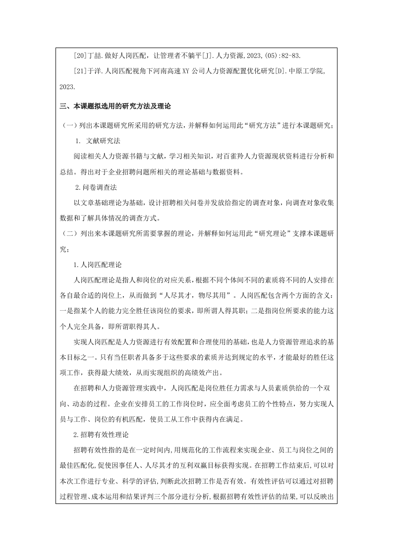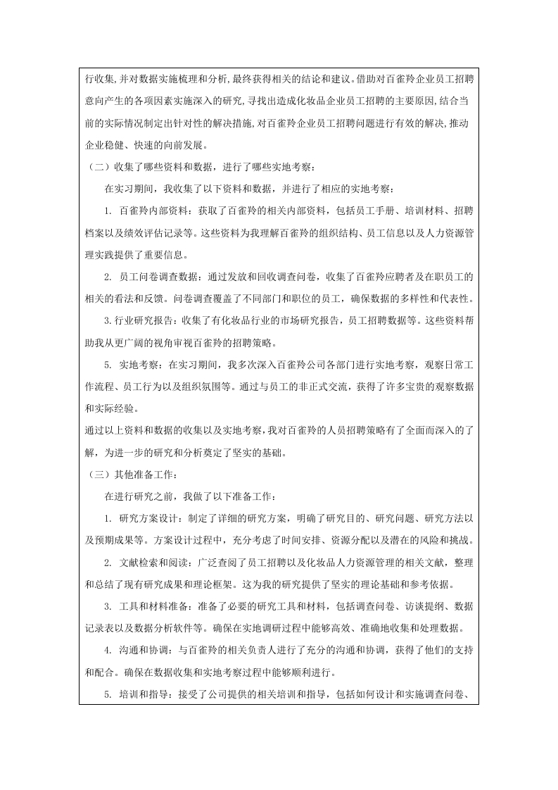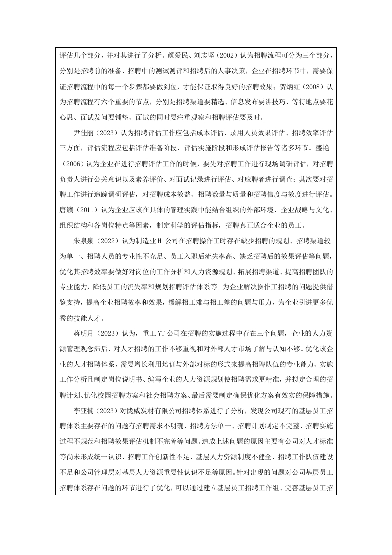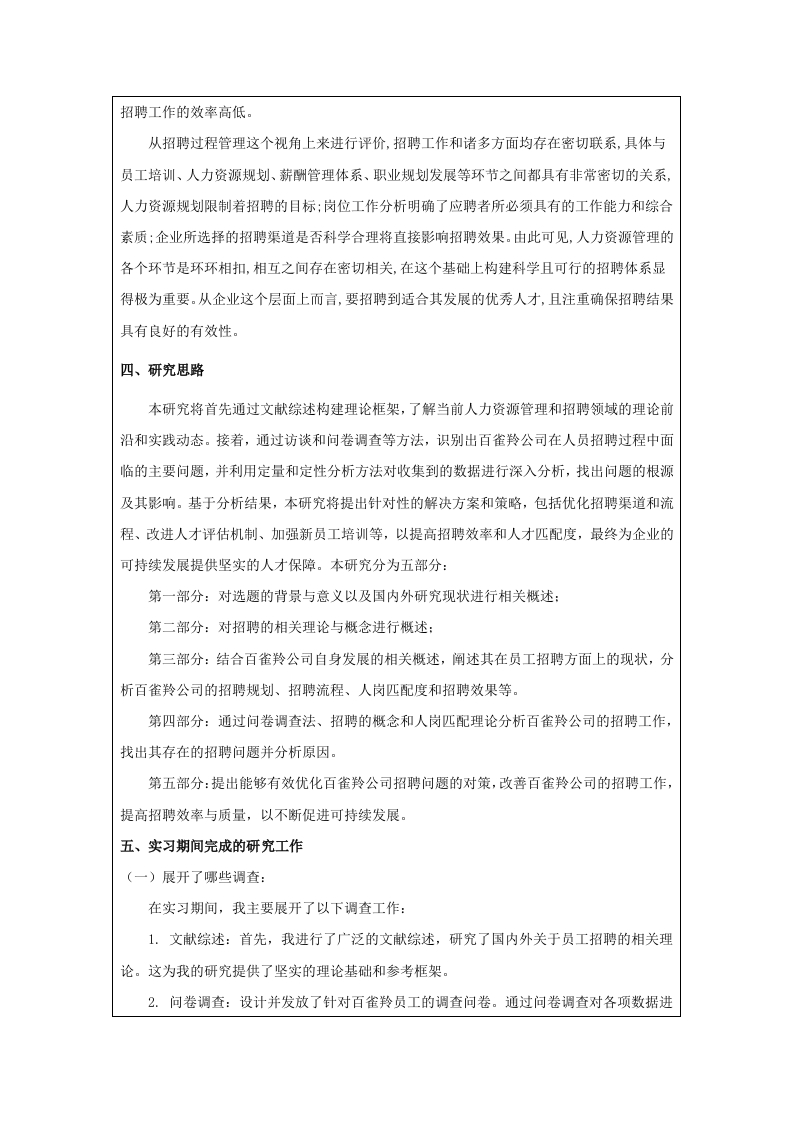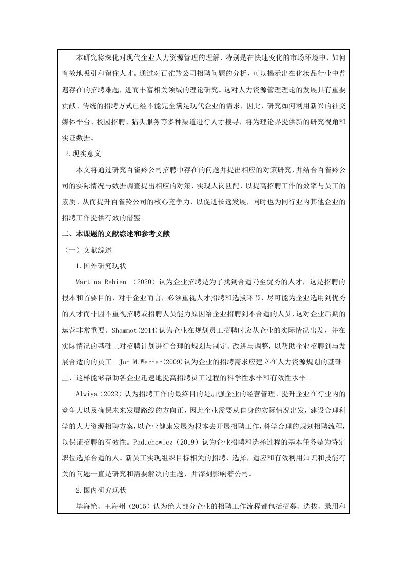 中瑞酒店管理学院本科毕业论文(设计)选题说明书姓名学号专业班级第一次实习第一次实习单位及部门单位及部门题目类型论文/设计研究方向拟选题目百雀羚公司的人员招聘的问题及对策研究选题说明一、选题依据(500字左右)(一)研究背景和目的1.研究背景随着经济的高速发展和社会的变化,社会人才的流动性不断增强,人才竞争力不断提高,市场竞争愈发激烈。在此背景之下,企业逐渐重视人力资源管理,一套完整且优秀的人力资源管理能够促进企业的进步与发展。员工招聘是企业的人力资源管理中重要的环节,能够满足企业的日益提升的发展需求。员工招聘是企业获取优秀人才的必要渠道、是实现企业发展、提升竞争力的重要途径:因此如何招聘优质的人才是企业需要着手关注的重要内容。百雀羚公司作为中国知名的化妆品品牌,近年来在国内外市场上取得了显著的成就。然而,随着业务的不断扩展和市场竞争的加剧,企业在人员招聘方面面临一系列挑战。这些挑战不仅包括人才短缺、招聘渠道单一、新员工适应周期长等问题,还涉及到如何有效评估和选拔合适人才的策略。因此,对百雀羚公司在人员招聘中存在的问题及其对策进行深入研究,不仅有助于企业优化人力资源管理,提升整体竞争力,也为其他企业提供有益的借鉴。2.研究目的本研究旨在通过对百雀羚公司在人员招聘过程中遇到的主要问题进行系统分析,提出针对性的解决方案和策略。通过探索多样化的招聘渠道、优化招聘流程、加强人才评估机制以及提升新员工培训体系,旨在提高招聘效率和人才匹配度,缩短新员工的适应周期,从而为企业的可持续发展提供坚实的人才保障。同时,本研究的结果将为企业管理层制定更有效的招聘政策提供科学依据,进而推动企业整体竞争力的提升。(二)研究意义1.理论意义本研究将深化对现代企业人力资源管理的理解,特别是在快速变化的市场环境中,如何有效地吸引和留住人才。通过对百雀羚公司招聘问题的分析,可以揭示出在化妆品行业中普遍存在的招聘难题,进而丰富相关领域的理论研究。这对人力资源管理理论的发展具有重要贡献。传统的招聘方式己经不能完全满足现代企业的需求,因此,研究如何利用新兴的社交媒体平台、校园招聘、猎头服务等多种渠道进行人才搜寻,将为理论界提供新的研究视角和实证数据。2.现实意义本文将通过研究百雀羚公司招聘中存在的问题并提出相应的对策研究,并结合百雀羚公司的实际情况与数据调查提出相应的对策,实现人岗匹配,以提高招聘工作的效率与员工的素质。从而提升百雀羚公司的核心竞争力,以促进长远发展,同时也为同行业内其他企业的招聘工作提供有效的借鉴。二、本课题的文献综述和参考文献(一)文献综述1.国外研究现状Martina Rebien(2020)认为企业招聘是为了找到合适乃至优秀的人才,这是招聘的根本和首要目的,对于企业而言,必须重视人才招聘和选拔环节,尽可能为企业选用到优秀的人才而非因不重视招聘或招聘人员能力原因给企业招聘到不合适的人员,这对企业后期的运营非常重要。Shammot(20l4)认为企业在规划员工招聘时应从企业的实际情况出发,并在实际情况的基础上对招聘计划进行合理的规划与制定、改进与调整,以帮助企业招聘到与发展合适的的员工。JonM.Werner(2009)认为企业的招聘需求应建立在人力资源规划的基础上,这样能够帮助各企业迅速地提高招聘员工过程的科学性水平和有效性水平。A1wiya(2022)认为招聘工作的最终目的是加强企业的经营管理、提升企业在行业内的竞争力以及确保未来发展路线的方向正,因此企业需要从自身的实际情况出发,建设合理科学的人力资源招聘方案,以企业健康发展为根本去开展招聘工作,科学合理的规划招聘流程,以保证招聘的有效性。Paduchowicz(2019)认为企业招聘和选择过程的基本任务是为特定职位选择合适的人。新员工实现组织目标相关的招聘,选择,适应和有效利用知识和技能有关的问题一直是研究和需要解决的主题,并深刻影响着公司。2.国内研究现状毕海艳、王海州(2015)认为绝大部分企业的招聘工作流程都包括招募、选拔、录用和评估几个部分,并对其进行了分析。颜爱民、刘志坚(2002)认为招聘流程可分为三个部分,分别是招聘前的准备、招聘中的测试测评和招聘后的人事决策,企业在招聘环节中,需要保证招聘流程中的每一个步骤都要做到位,才能保证取得良好的招聘效果:贺炳红(2008)认为招聘流程有六个重要的节点,分别是招聘渠道要精选、信息发布要讲技巧、等待地点要花心思、面试发问要铺垫、面试的同时要注重观察和招聘评估要及时。尹佳丽(2023)认为招聘评估工作应包括成本评估、录用人员效果评估、招聘效率评估三方面,评估流程应包括评估准备阶段、评估实施阶段和形成评估报告等诸多环节。盛艳(2006)认为企业在进行招聘评估工作的时候,要先对招聘工作进行现场调研评估,对招聘负责人进行公关意识以及素养评价、对面试记录进行评估、对应聘者进行调查:其次要对招聘工作进行追踪调研评估,对招聘成本效益、招聘数量与质量和招聘信度与效度进行评估。唐簸(2011)认为企业应该在具体的管理实践中能结合组织的外部环境、企业战略与文化、组织结构和各岗位特点等因素,制定科学的评估指标,招聘真正适合企业