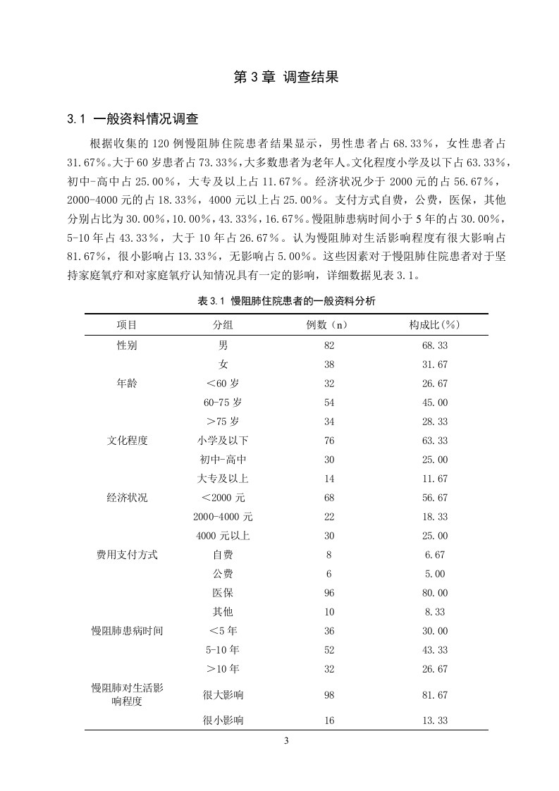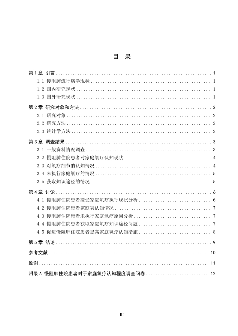 慢阻肺住院患者对家庭氧疗认知现状调查分析摘要目的了解慢阻肺住院患者对于家庭氧疗的认知现状,针对影响其依从性的原因及护理措施进行分析。方法选取张家口市第一医院2023年7月到2024年4月这段时间符合纳入标准的120例患者,对慢阻肺住院患者进行问卷调查。结果实施家庭氧疗的慢阻肺住院患者有78人,占总人数的65.0%,能够坚持每日用氧≥15h者仅有38人,占总人数的31.7%。了解家庭氧疗作用的慢阻肺住院患者有83人,占总人数的69.2%。慢阻肺住院患者在对疾病知识、氧疗方法中的细节方面仍需加强教育。慢阻肺住院患者对于家庭氧疗的认知情况并不理想,需要提高住院患者的认知程度。结论由于多种因素导致慢阻肺住院患者对于家庭氧疗认知程度较低,慢阻肺住院患者对于家庭氧疗参与率低、依从性差,对于疾病的认知影响着患者实际进行家庭氧疗的行为。医护工作者应从疾病的发展,病生理等方面进行知识教育,让患者了解疾病。根据不同患者的年龄,患病时间,文化水平等方面为患者提供专业针对的护理策略,加强对患者的健康教育,注重随访及回访,重视社会支持系统,从各方面帮助慢阻肺住院患者提高对家庭氧疗的认知水平,以改善缺氧等症状,提高慢阻肺住院患者的生活质量。关键词:慢阻肺:住院患者:家庭氧疗ABSTRACTObjective To investigate the cognitive status of COPD inpatients on home oxygen therapyand analyze the reasons affecting their compliance and nursing measures.Methods 120 patientswho met the inclusion criteria in Zhangjiakou First Hospital from July 2023 to April 2024 werecollected,and a questionnaire survey was conducted among the patients with COPD.Results78 patients (65.0%of the total number)patients underwent home oxygen therapy for COPD,andonly 38 patients(31.7%of the total number)were able to use oxygen 25h daily.There were 83patients with COPD who knew the effect of home oxygen therapy,accounting for 69.2%of thetotal number.The cognition of hospitalized COPD patients to home oxygen therapy is not ideal,and it is necessary to improve the cognition of hospitalized patients.Conclusion Due to variousfactors,the cognition of hospitalized COPD patients to home oxygen therapy is low,theparticipation rate of hospitalized COPD patients to home oxygen therapy is low,the complianceis poor,and the cognition of the disease affects the actual behavior of patients to carry out homeoxygen therapy.Inpatients with COPD still need to improve their understanding of the diseaseand the details of oxygen therapy in the medical work.The chronic patients should be educatedon the development of the disease,the physiology of the disease and so on,so that the patientscan understand the disease.According to different patients'age,time of illness,educational leveland other aspects to provide patients with professional nursing strategies,strengthen the healtheducation of patients,pay attention to follow-up and return visits,pay attention to social supportsystem,from all aspects to help COPD inpatients to improve the awareness of home oxygentherapy community level,in order to improve hypoxia and other symptoms,improve the qualityof life of COPD inpatients.Key Words:COPD;Inpatient;Home oxygen therapy0目录第1章引言1.1慢阻肺流行病学现状1.2国内研究现状1.3国外研究现状.........第2章研究对象和方法22.1研究对象...22.2研究方法...22.3统计学方法..。2第3章调查结果............33.1一般资料情况调查.....33.2慢阻肺住院患者对家庭氧疗认知现状.43.3对氧疗细节的认知情况....…43.4未执行家庭氧疗的情况..53.5获取知识途径的情况.....5第4章讨论........。64.1慢阻肺住院患者接受家庭氧疗执行现状分析64.2慢阻肺住院患者家庭氧认知情况....74.3慢阻肺住院患者未执行家庭氧疗原因分析.74.4慢阻肺住院患者获取家庭氧疗知识途径问题4.5促进慢阻肺住院患者提高家庭氧疗认知措施8第5章结论........参考文献.....10致谢。.。。。。。。。11附录A慢阻肺住院患者对于家庭氧疗认知程度调查问卷....·12面第1章引言1.1慢阻肺流行病学现状慢性阻塞性肺疾病(chronic obstructive pulmonary disease,COPD)简称慢阻肺,是以持续气流受限为特征的可以预防和治疗的疾病,其气流受限多呈进行性发展,与气道和肺组织对香烟烟雾等有害气体或有害颗粒的异常慢性炎症有关山。目前慢性阻塞性肺病的