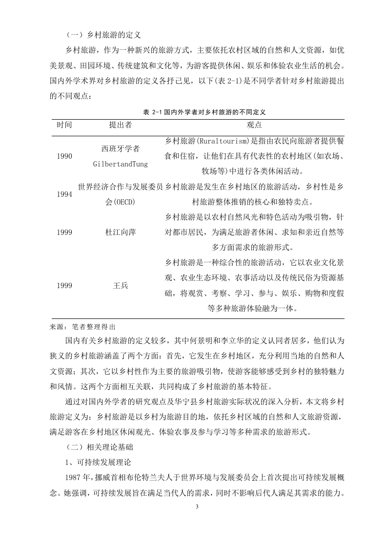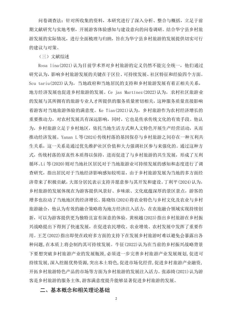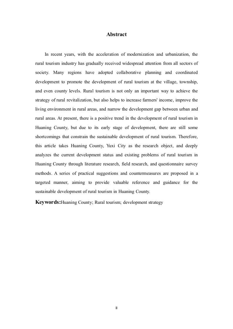 华宁县乡村旅游发展策略探析摘要近年来,随着现代化和城镇化进程的加快,乡村旅游产业逐渐受到社会各界的广泛关注。众多地区纷纷采取协同规划、协调发展的方式,以村庄、乡镇乃至县域为单位推进乡村旅游的发展。乡村旅游不仅是实现乡村振兴战略的重要途径,也有助于提高农民的收入,改善农村人居环境,从而缩小城乡发展差距。目前,华宁县在乡村旅游发展方面趋势向好,但由于还处于发展的初级阶段,仍存在着一些不足制约着乡村旅游的可持续发展。因此,本文以玉溪市华宁县为研究对象,通过文献研究法、实地调研法和问卷调查法深入剖析华宁县乡村旅游当前发展的状况和存在的问题,并针对性地提出了一系列切实可行的建议和对策,旨在为华宁县乡村旅游的可持续发展提供有价值的参考和指导。关键词:华宁县:乡村旅游:发展策略AbstractIn recent years,with the acceleration of modernization and urbanization,therural tourism industry has gradually received widespread attention from all sectors ofsociety.Many regions have adopted collaborative planning and coordinateddevelopment to promote the development of rural tourism at the village,township,and even county levels.Rural tourism is not only an important way to achieve thestrategy of rural revitalization,but also helps to increase farmers'income,improve theliving environment in rural areas,and narrow the development gap between urban andrural areas.At present,there is a positive trend in the development of rural tourism inHuaning County,but due to its early stage of development,there are still someshortcomings that constrain the sustainable development of rural tourism.Therefore,this article takes Huaning County,Yuxi City as the research object,and deeplyanalyzes the current development status and existing problems of rural tourism inHuaning County through literature research,field research,and questionnaire surveymethods.A series of practical suggestions and countermeasures are proposed in atargeted manner,aiming to provide valuable reference and guidance for thesustainable development of rural tourism in Huaning County.Keywords:Huaning County;Rural tourism;development strategy目录一、绪论...(一)研究背景及意义.(二)研究思路及方法...1(三)文献综述..…2二、基本概念和相关理论基础..2(一)乡村旅游的定义3(二)相关理论基础....3三、华宁县乡村旅游资源简介4(一)自然资源.....(二)人文旅游资源..5四、华宁县乡村旅游发展现状6(一)游客基本情况...…6(二)游客出游情况.....(三)游客反映存在的问题.….8(四)华宁县乡村旅游游客满意度调查分析.....9五、华宁县乡村旅游发展存在的问题9(一)宣传力度不足....9(二)基础设施配套不完善...9(三)乡村旅游产品同质化严重...10(四)生态环境遭到破坏...10六、华宁县乡村旅游发展的对策11(一)加大宣传推广力度....11(二)加强基础设施建设..·.......11(三)深度挖掘乡村旅游资源......12(四)加强乡村生态环境的治理.............12七、结论.....13l参考文献..............14