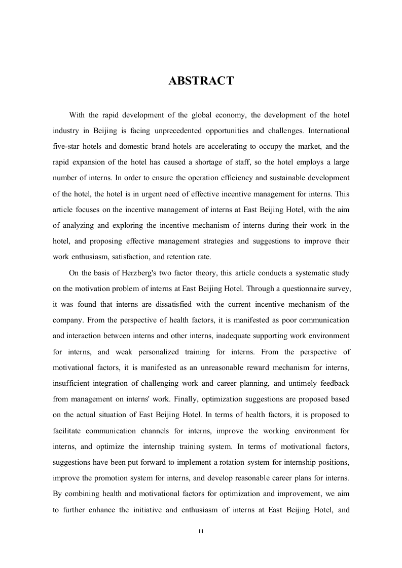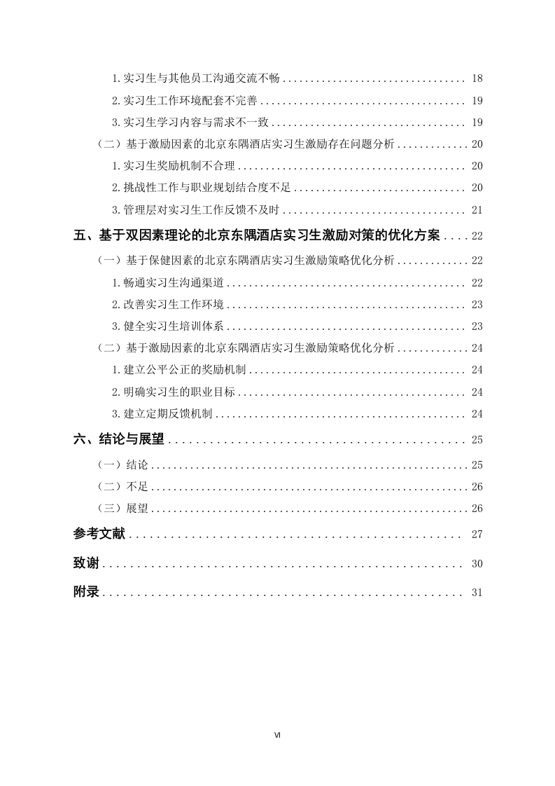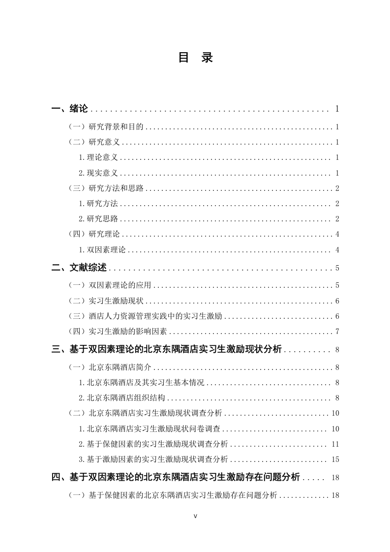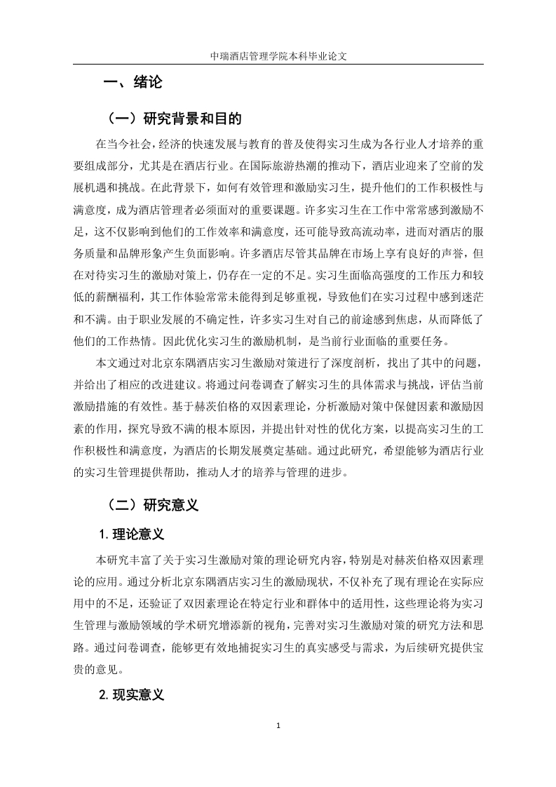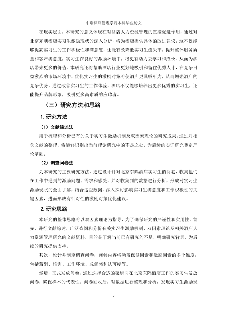 基于双因素理论的北京东隅酒店实习生的激励对策优化研究摘要随着全球经济的高速发展,使北京酒店业的发展面临着前所未有的机遇与挑战,国际五星级酒店和国内品牌酒店加速占领市场,酒店迅速扩张造成了人员短缺,因此酒店雇用了大批实习生。为了确保酒店的经营效率与可持续发展,酒店急需对实习生进行有效的激励管理。本文针对北京东隅酒店实习生激励管理进行研究,以期通过分析和探讨实习生在酒店工作期间的激励机制,提出有效的管理策略和建议,从而提高实习生的工作积极性、满意度和留任率。本文在赫茨伯格双因素理论的基础上,对北京东隅酒店实习生激励问题进行系统性研究。通过问卷的方式,对该酒店现行激励机制进行调查,发现实习生对于现行激励措施存在不满意。从保健因素维度分析,表现为实习生与其他员工沟通交流不畅、实习生工作环境配套不完善、实习生的学习内容与需求不一致等。从激励因素维度分析,表现为实习生奖励机制不合理、挑战性工作与职业规划结合度不足、管理层对实习生工作反馈不及时等。最后,结合北京东隅酒店的实际情况提出优化建议。保健因素方面,提出了畅通实习生沟通渠道、改善实习生工作环境、健全实习生培训体系。激励因素方面,提出了建立公平公正的奖励机制、明确实习生的职业目标、建立定期反馈机制等建议。通过保健因素与激励因素相结合的优化改进,以进一步提升北京东隅酒店实习生的主动性和积极性,推动酒店健康快速发展。关键词:实习生:双因素理论:激励对策:北京东隅酒店ABSTRACTWith the rapid development of the global economy,the development of the hotelindustry in Beijing is facing unprecedented opportunities and challenges.Internationalfive-star hotels and domestic brand hotels are accelerating to occupy the market,and therapid expansion of the hotel has caused a shortage of staff,so the hotel employs a largenumber of interns.In order to ensure the operation efficiency and sustainable developmentof the hotel,the hotel is in urgent need of effective incentive management for interns.Thisarticle focuses on the incentive management of interns at East Beijing Hotel,with the aimof analyzing and exploring the incentive mechanism of interns during their work in thehotel,and proposing effective management strategies and suggestions to improve theirwork enthusiasm,satisfaction,and retention rate.On the basis of Herzberg's two factor theory,this article conducts a systematic studyon the motivation problem of interns at East Beijing Hotel.Through a questionnaire survey,it was found that interns are dissatisfied with the current incentive mechanism of thecompany.From the perspective of health factors,it is manifested as poor communicationand interaction between interns and other interns,inadequate supporting work environmentfor interns,and weak personalized training for interns.From the perspective ofmotivational factors,it is manifested as an unreasonable reward mechanism for interns,insufficient integration of challenging work and career planning,and untimely feedbackfrom management on interns'work.Finally,optimization suggestions are proposed basedon the actual situation of East Beijing Hotel.In terms of health factors,it is proposed tofacilitate communication channels for interns,improve the working environment forinterns,and optimize the internship training system.In terms of motivational factors,suggestions have been put forward to implement a rotation system for internship positions,improve the promotion system for interns,and develop reasonable career plans for interns.By combining health and motivational factors for optimization and improvement,we aimto further enhance the initiative and enthusiasm of interns at East Beijing Hotel,andpromote the healthy and rapid development of the hotel.Keywords:Trainee;Two factor theory;Incentive measures;East Beijing Hotel么目录一、绪论1(一)研究背景和目的(二)研究意义..1.理论意义...…2.现实意义.…(三)研究方法和思路…2
