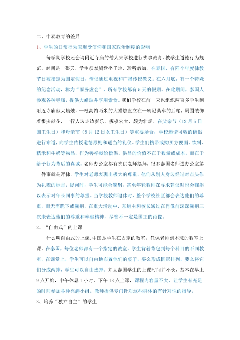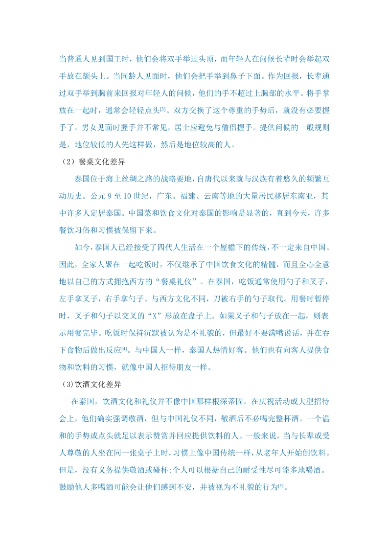 从中泰文化的差异分析中泰教育管理体制摘要:随着中国在国际上的竞争力日渐增强,中国文化作为中国软实力的象征,也渐渐地“全球化”。现如今学习中文的热潮逐步升温,越来越多的国家重视中文以及中国文化的学习,泰国就是其中之一。泰国学校现在将中文作为第三外语在泰国中小学普及,同时也有越来越多的泰国留学生到中国学习中文及中国文化。显然,一方面,泰国已成为中国在东南亚地区的长期合作伙伴。并且,中国和泰国文化的相互影响、相互渗透也产生了明显的文化差异。因此,中泰两国在教育方面的差异,不仅仅是文化差异,也是两国不同的国情造成的。此外,作为其软实力象征的中国文化正在逐步扩大其全球影响力。从古代开始中国与泰国就往来密切,泰国与中国一直以来友好的双边关系,成为了政治、经济和文化交流的基础。到现如今无论从政治、经济还是教育中泰两国就相互影响,求同存异。中国和泰国的教育体系存在显著差异。随着两国经济互动的日益密切,现在有大量的国际学生参与学术交流,通过相互学习和启发,为各自传统文化的共同发展做出贡献。泰中两国长期友好的双边关系为政治、经济和文化交流奠定了基础。两国之间的教育体制也存在着差异,也在往来的交流中相互学习借鉴,都有着对两国教育发展起着作用。关键词:1、文化差异:2、发展进程;3、教育体制差异:4、留学生学术交流一、泰国文化与中国文化的差异1、国家政治制度的差异中国是社会主义国家,而泰国实行君主立宪制。然而,与英国和日本等国家相比,泰国君主制在其人民心中占有更深刻的地位,显着影响了他们生活和思想的各个方面山。泰国的国旗几乎随处可见,还有国王或王后的照片和代表他们颜色的旗帜。这可能表明泰国更倾向于促进爱国主义意识,并进一步巩固君主在人民心中的地位。泰国拥有独特的视角,国家的概念与国王的概念紧密交织在一起。国王被视为代表国家本身的象征,以至于人们可以争辩说,在这里,人们将国王视为他们国家的代名词。只要你一到泰国,国王和王后玉照随处可见,这些照片反映了国王一生几个重要时期所做的重要事情,加冕典礼、禧年和巡回检查等活动经常在街上醒目地展示照片。但是,如果你多注意一点,你会发现国王的照片在人们的日常生活中随处可见。钱币上有,家庭墙壁上有,石英钟表盘有,就连小商贩的台秤秤盘里也有,让人有一种感觉:人民总是与国王团结在一起,反过来,国王也不断关心他的臣民。2、信仰差异中国人在信仰中珍视自由的价值,而泰国通常被称为“万佛之国”。佛教几代人以来一直深深植根于泰国文化中,在其超过6000万人口中,约有90%的人是佛教徒。佛教作为泰国人民生活中的指导原则具有重要意义。在泰国,皇家仪式、国民教育和生活的各个方面都以佛教原则为指导。还要求男性在二十岁时至少要花三个月的时间当和尚,早上出去施舍,中午后不吃饭,过着新手僧侣的苦行生活。在某些情况下,年轻的父母甚至把孩子送到寺庙里当僧侣一两年。在典型的家庭中,有一个小神龛是很常见的,人们外出时经常戴着佛吊坠项链。每当经过佛教寺庙时,他们都会确保表示尊重并提供祈祷。每天早上,他们自愿准备食物向僧侣施舍。在寺庙活动期间,人们会带来各种类型的食物作为供品,并聆听佛教教义。佛教与泰国人民的生活紧密交织在一起,乔迁、分娩、生日、婚礼和葬礼等仪式都涉及邀请僧侣诵经和加持。可以说,佛教及其崇拜已成为泰国生活的重要组成部分。在周末,许多人选择参观寺庙并从事佛教活动,而不是打牌或赌博。3、风俗差异(1)见面和辞别时肢体语言的差异在泰国,当地的习俗深受佛教传统的影响。当泰国人见面或告别时,他们会将手掌放在胸前以示敬意,以示问候。手掌握得越高,传达的尊重程度就越深。当普通人见到国王时,他们会将双手举过头顶,而年轻人在问候长辈时会举起双手放在额头上。当同龄人见面时,他们会把手举到鼻子下面。作为回报,长辈通过双手举到胸前来回报对年轻人的问候,他们的手不超过上胸部的水平。将手掌放在一起时,通常会轻轻点头]。双方交换了这个尊重的手势后,就没有必要握手了。男女见面时握手并不常见,居士应避免与僧侣握手。提供问候的一般规则是,地位较低的人先这样做,然后是地位较高的人。(2)餐桌文化差异泰国位于海上丝绸之路的战略要地,自唐代以来就与汉族有着悠久的频繁互动历史。公元9至10世纪,广东、福建、云南等地的大量居民移居东南亚,其中许多人定居泰国。中国菜和饮食文化对泰国的影响是显著的,直到今天,许多餐饮习俗和习惯被保留下来。如今,泰国人已经接受了四代人生活在一个屋檐下的传统,不一定来自中国。因此,全家人聚在一起吃饭时,不仅继承了中国饮食文化的精髓,而且全心全意地以自己的方式拥抱西方的“餐桌礼仪”。在泰国,吃饭通常使用勺子和叉子,左手拿叉子,右手拿勺子。与西方文化不同,刀被右手的勺子取代。用餐时暂停时,叉子和勺子以交叉的“X”形放在盘子上。如果叉子和勺子放在一起,则表示用餐完毕。吃饭时保持沉默被认为是不礼貌的,但最好不要满嘴说话,并在吞下食物后做出反应。与中国人一样,泰国人热情好客。他们也有向客人提供食物和饮料的习惯,就像中国人招待朋友一样