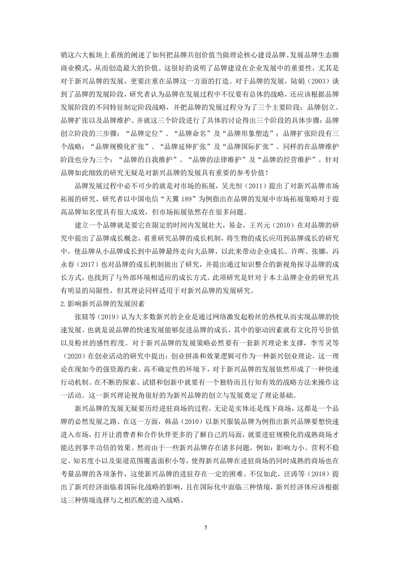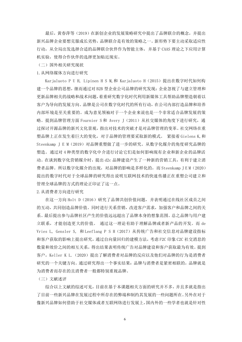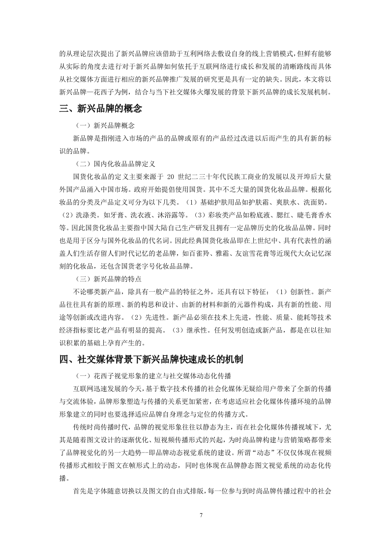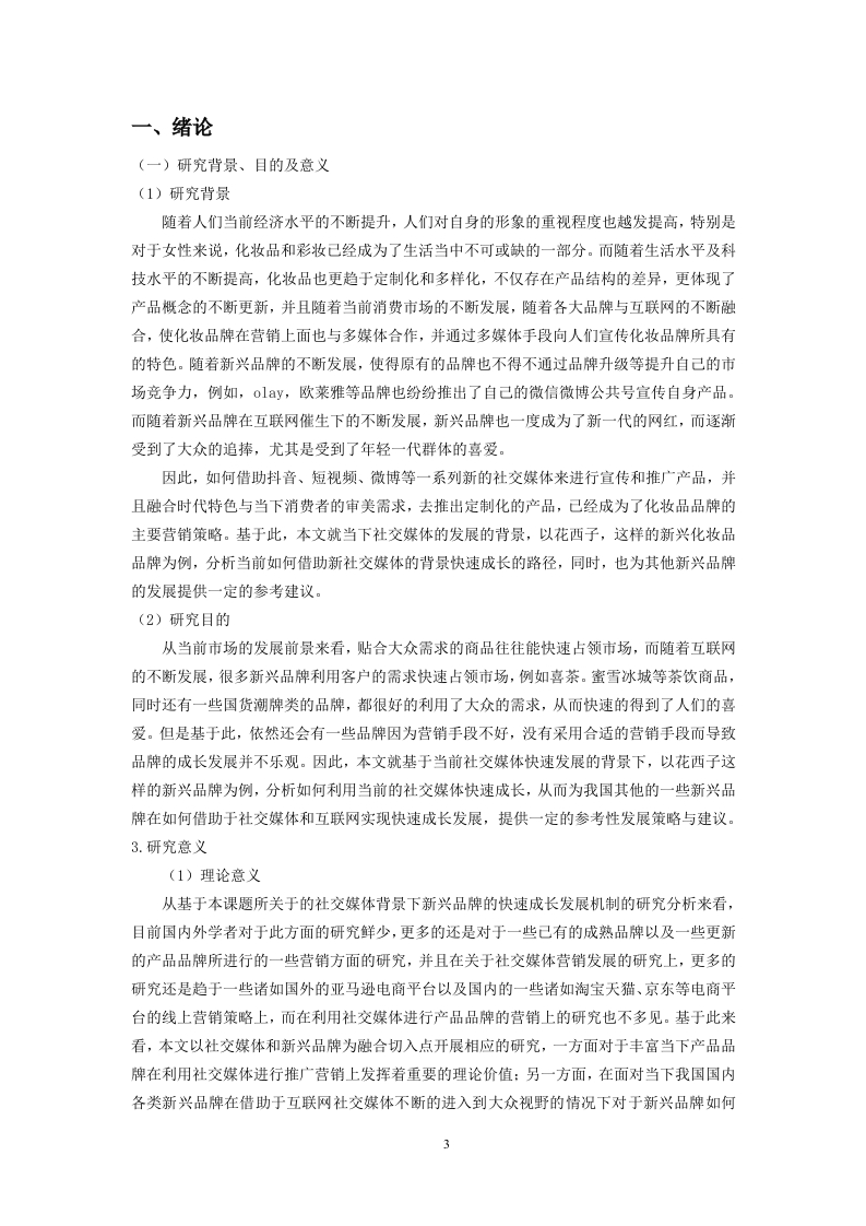 目录、绪论.…3(一)研究背景、目的及意义3(二)研究内容与方法二、文献综述4(一)国内相关研究现状.4(二)国外相关研究现状6(三)文献述评6三、新兴品牌的概念7(一)新兴品牌概念…7(二)国内化妆品品牌定义..7(三)新兴品牌的特点.7四、社交媒体背景下新兴品牌快速成长的机制.7(一)花西子视觉形象的建立与社交媒体动态化传播.7(二)花西子建构与社交媒体传播的互动.8五、关于新兴品牌快速成长的策略与建议…8(一)借助社会化媒体中时尚意见领袖实现品牌人格化.8(二)借助社交媒体亚文化青年圈层效应实现滚雪球式传播.9六、结论……9参考文献10社交媒体背景下新兴品牌快速成长机制分析以花西子为例XxxXxx摘要:随若互联网传播的不断发展,社交媒体给予时尚与化妆话题更多被探讨的机会。当下社会对于时尚与化妆的逐渐包容,更是推动了大量依托社交网路平台的化妆品牌的佩起。本文基于传播学研究领域对时尚与性别的关注,以及我国本土时尚品牌的现状与发展,台在打破对干传播学单向研究的周有认知,以依托社会化媒体得以兴起的化妆品牌为主要研究对象,将时尚、化妆与媒介放在同一体系中进行探讨。文献与研究现状的梳理为本文提供重要的理论支撑,因此在文献综述部分,本文从横向与纵向两个维度对现有研究进行归纳整理。首先在横向上,包罗与本课趣相关的媒介与化妆品牌构建与营销以及化妆品牌发展现状三方面内容,其次是在纵向上以时间线为轴梳理相关研究,并将国内外相关研究进行对比。这一部分内容旨在通过对文献的整合与比较,总结出目前关于品牌传播整体的研究趋势,并发现这一研究方向上的不足,挖掘出有价值的研究创新点关键词:社交媒体:化妆品牌:互联网2一、绪论(一)研究背景、目的及意义(1)研究背景随着人们当前经济水平的不断提升,人们对自身的形象的重视程度也越发提高,特别是对于女性来说,化妆品和彩妆己经成为了生活当中不可或缺的一部分。而随着生活水平及科技水平的不断提高,化妆品也更趋于定制化和多样化,不仅存在产品结构的差异,更体现了产品概念的不断更新,并且随着当前消费市场的不断发展,随着各大品牌与互联网的不断融合,使化妆品牌在营销上面也与多媒体合作,并通过多媒体手段向人们宣传化妆品牌所具有的特色。随着新兴品牌的不断发展,使得原有的品牌也不得不通过品牌升级等提升自己的市场竞争力,例如,olay,欧莱雅等品牌也纷纷推出了自己的微信微博公共号宣传自身产品。而随着新兴品牌在互联网催生下的不断发展,新兴品牌也一度成为了新一代的网红,而逐渐受到了大众的追捧,尤其是受到了年轻一代群体的喜爱。因此,如何借助抖音、短视频、微博等一系列新的社交媒体来进行宣传和推广产品,并且融合时代特色与当下消费者的审美需求,去推出定制化的产品,己经成为了化妆品品牌的主要营销策略。基于此,本文就当下社交媒体的发展的背景,以花西子,这样的新兴化妆品品牌为例,分析当前如何借助新社交媒体的背景快速成长的路径,同时,也为其他新兴品牌的发展提供一定的参考建议。(2)研究目的从当前市场的发展前景来看,贴合大众需求的商品往往能快速占领市场,而随着互联网的不断发展,很多新兴品牌利用客户的需求快速占领市场,例如喜茶。蜜雪冰城等茶饮商品,同时还有一些国货潮牌类的品牌,都很好的利用了大众的需求,从而快速的得到了人们的喜爱。但是基于此,依然还会有一些品牌因为营销手段不好,没有采用合适的营销手段而导致品牌的成长发展并不乐观。因此,本文就基于当前社交媒体快速发展的背景下,以花西子这样的新兴品牌为例,分析如何利用当前的社交媒体快速成长,从而为我国其他的一些新兴品牌在如何借助于社交媒体和互联网实现快速成长发展,提供一定的参考性发展策略与建议。3.研究意义(1)理论意义从基于本课题所关于的社交媒体背景下新兴品牌的快速成长发展机制的研究分析来看,目前国内外学者对于此方面的研究鲜少,更多的还是对于一些己有的成熟品牌以及一些更新的产品品牌所进行的一些营销方面的研究,并且在关于社交媒体营销发展的研究上,更多的研究还是趋于一些诸如国外的亚马逊电商平台以及国内的一些诸如淘宝天猫、京东等电商平台的线上营销策略上,而在利用社交媒体进行产品品牌的营销上的研究也不多见。基于此来看,本文以社交媒体和新兴品牌为融合切入点开展相应的研究,一方面对于丰富当下产品品牌在利用社交媒体进行推广营销上发挥着重要的理论价值:另一方面,在面对当下我国国内各类新兴品牌在借助于互联网社交媒体不断的进入到大众视野的情况下对于新兴品牌如何3利用社交媒体进行快速成长发展研究,这对于新兴品牌的发展来说具有一定的参考性理论价值。(2)实践意义随着时代的发展,市场上出现了越来越多的新兴现象,尤其一些新兴的品牌凭借着互联网快速的进入到大众视野,得到较好的发展,同时也极大的促进了我国一些中小企业的经济发展进步.但与此同时还有一些新兴品牌的成长发展却并不乐观,在随着逐步的发展过程中,也出现“暴毙”和退出市场的现象,究其原因,还是因为其在发展过程中没有能够得到社会大众的广泛认识和追捧,进而销量惨淡。基于此,本文就从当下社交媒体快速发展和