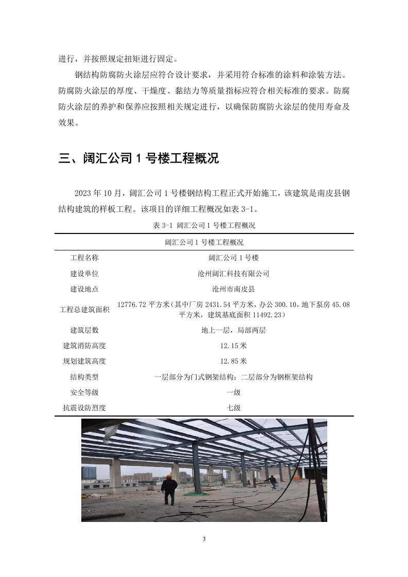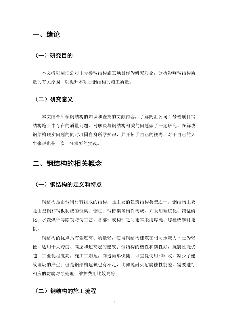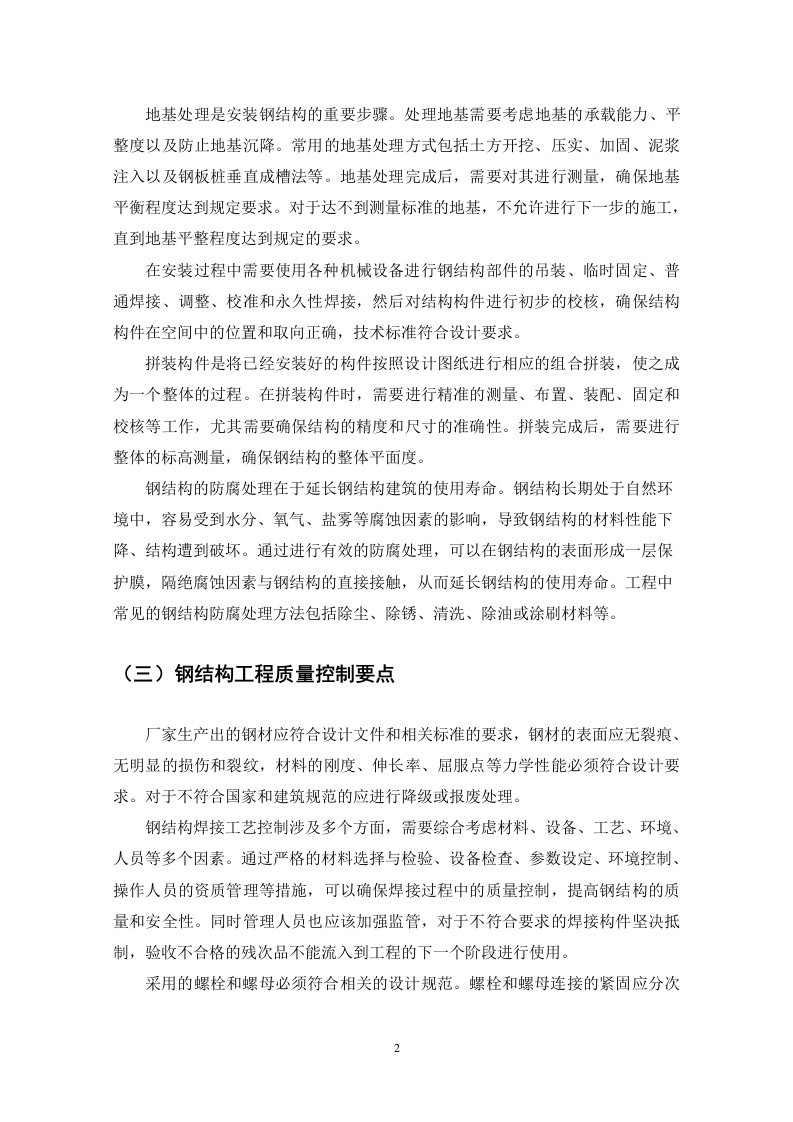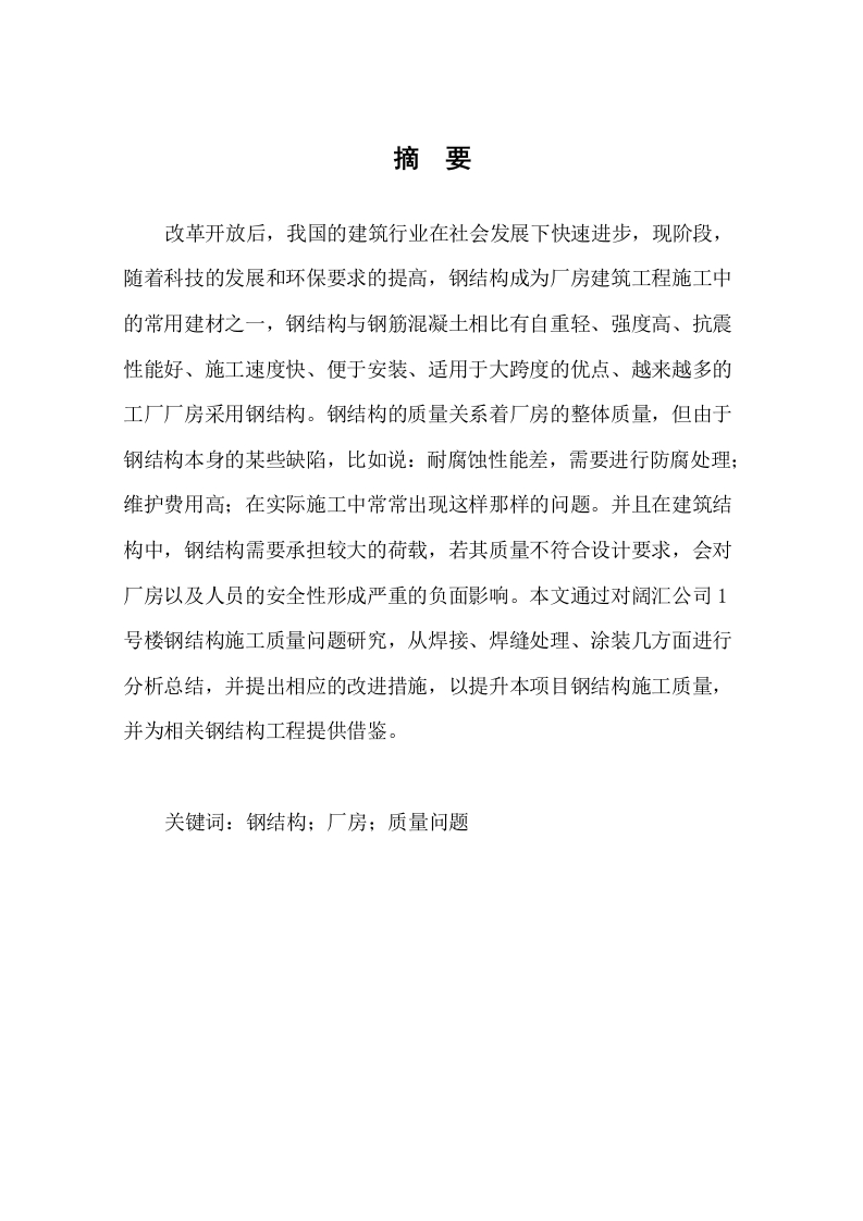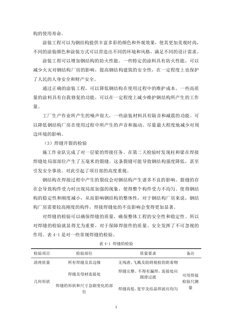 阔汇公司1号楼项目钢结构质量问题研究目录一、绪论(一)研究目的1(二)研究意义.1二、钢结构的相关概念........。1(一)钢结构的定义和特点…1(二)钢结构的施工流程(三)钢结构工程质量控制要点..2三、阔汇公司1号楼工程概况3四、阔汇公司1号楼钢结构质量问题(一)焊缝开裂问题…..41.现场出现的问题.….42.问题产生的原因.6五、阔汇公司一号楼钢结构质量问题解决措施(一)焊接焊缝处局部部位产生裂缝解决措施.71.焊缝焊接处已经出现裂缝2.避免焊缝处裂缝的预防措施.….8(二)在焊缝表面存在连续或断续凹槽的解决措施..81.在焊缝表面已经出现连续或断续凹槽的解决措施…82.预防在焊缝表面出现连续或断续凹槽的措施9(三)钢结构的涂装工程出现脱皮起锈解决措施.….91.对涂装工程已经出现脱皮起锈的解决措施,.92.避免出现钢结构涂装工程脱皮起锈的措施9六、结论.11参考文献....12摘要改革开放后,我国的建筑行业在社会发展下快速进步,现阶段,随着科技的发展和环保要求的提高,钢结构成为厂房建筑工程施工中的常用建材之一,钢结构与钢筋混凝土相比有自重轻、强度高、抗震性能好、施工速度快、便于安装、适用于大跨度的优点、越来越多的工厂厂房采用钢结构。钢结构的质量关系着厂房的整体质量,但由于钢结构本身的某些缺陷,比如说:耐腐蚀性能差,需要进行防腐处理:维护费用高:在实际施工中常常出现这样那样的问题。并且在建筑结构中,钢结构需要承担较大的荷载,若其质量不符合设计要求,会对厂房以及人员的安全性形成严重的负面影响。本文通过对阔汇公司1号楼钢结构施工质量问题研究,从焊接、焊缝处理、涂装几方面进行分析总结,并提出相应的改进措施,以提升本项目钢结构施工质量,并为相关钢结构工程提供借鉴。关键词:钢结构:厂房:质量问题一、绪论(一)研究目的本文将以阔汇公司1号楼钢结构施工项目作为研究对象,分析影响钢结构质量的有关原因,以提升本项目钢结构的施工质量。(二)研究意义本文结合所学钢结构的知识和查找的文献内容,了解阔汇公司1号楼项目钢结构施工中存在的质量问题,对解决与钢结构相关的问题做了一定研究,在解决钢结构现实问题的同时巩固自身所学知识,并开拓了自己的视野,对于自己的人生来说也是一次十分重要的实践。二、钢结构的相关概念(一)钢结构的定义和特点钢结构是由钢制材料组成的结构,是主要的建筑结构类型之一。钢结构主要是由型钢和钢板制成的钢梁、钢柱、钢桁架等构件构成,并采用硅烷化、纯锰磷化、水洗烘干等除锈防锈工艺。各部件或构件之间通常采用焊缝、螺栓或铆钉连接。钢结构的优点具有强度高、质量轻,使得钢结构建筑在相同承载力下更为轻便,适用于大跨度、高层和超高层的建筑:钢结构的塑性和韧性好,抗震性能优越:工业化程度高,施工工期短,制造简单快捷:可重复使用和回收,减少了建筑垃圾的产生:但是钢结构建筑也有不足,比如说耐火耐腐蚀性能差,需要进行相应的防腐防蚀处理:维护费用比较高等:(二)钢结构的施工流程地基处理是安装钢结构的重要步骤。处理地基需要考虑地基的承载能力、平整度以及防止地基沉降。常用的地基处理方式包括土方开挖、压实、加固、泥浆注入以及钢板桩垂直成槽法等。地基处理完成后,需要对其进行测量,确保地基平衡程度达到规定要求。对于达不到测量标准的地基,不允许进行下一步的施工,直到地基平整程度达到规定的要求。在安装过程中需要使用各种机械设备进行钢结构部件的吊装、临时固定、普通焊接、调整、校准和永久性焊接,然后对结构构件进行初步的校核,确保结构构件在空间中的位置和取向正确,技术标准符合设计要求。拼装构件是将已经安装好的构件按照设计图纸进行相应的组合拼装,使之成为一个整体的过程。在拼装构件时,需要进行精准的测量、布置、装配、固定和校核等工作,尤其需要确保结构的精度和尺寸的准确性。拼装完成后,需要进行整体的标高测量,确保钢结构的整体平面度。钢结构的防腐处理在于延长钢结构建筑的使用寿命。钢结构长期处于自然环境中,容易受到水分、氧气、盐雾等腐蚀因素的影响,导致钢结构的材料性能下降、结构遭到破坏。通过进行有效的防腐处理,可以在钢结构的表面形成一层保护膜,隔绝腐蚀因素与钢结构的直接接触,从而延长钢结构的使用寿命。工程中常见的钢结构防腐处理方法包括除尘、除锈、清洗、除油或涂刷材料等。(三)钢结构工程质量控制要点厂家生产出的钢材应符合设计文件和相关标准的要求,钢材的表面应无裂痕、无明显的损伤和裂纹,材料的刚度、伸长率、屈服点等力学性能必须符合设计要求。对于不符合国家和建筑规范的应进行降级或报废处理。钢结构焊接工艺控制涉及多个方面,需要综合考虑材料、设备、工艺、环境、人员等多个因素。通过严格的材料选择与检验、设备检查、参数设定、环境控制、操作人员的资质管理等措施,可以确保焊接过程中的质量控制,提高钢结构的质量和安全性。同时管理人员也应该加强监管,对于不符合要求的焊接构件坚决抵制,验收不合格的残次品不能流入到工程的下一个阶段进行使用。采用的螺栓和螺母必须符合相关的设计规范。螺栓和螺母连接的紧固应分次
