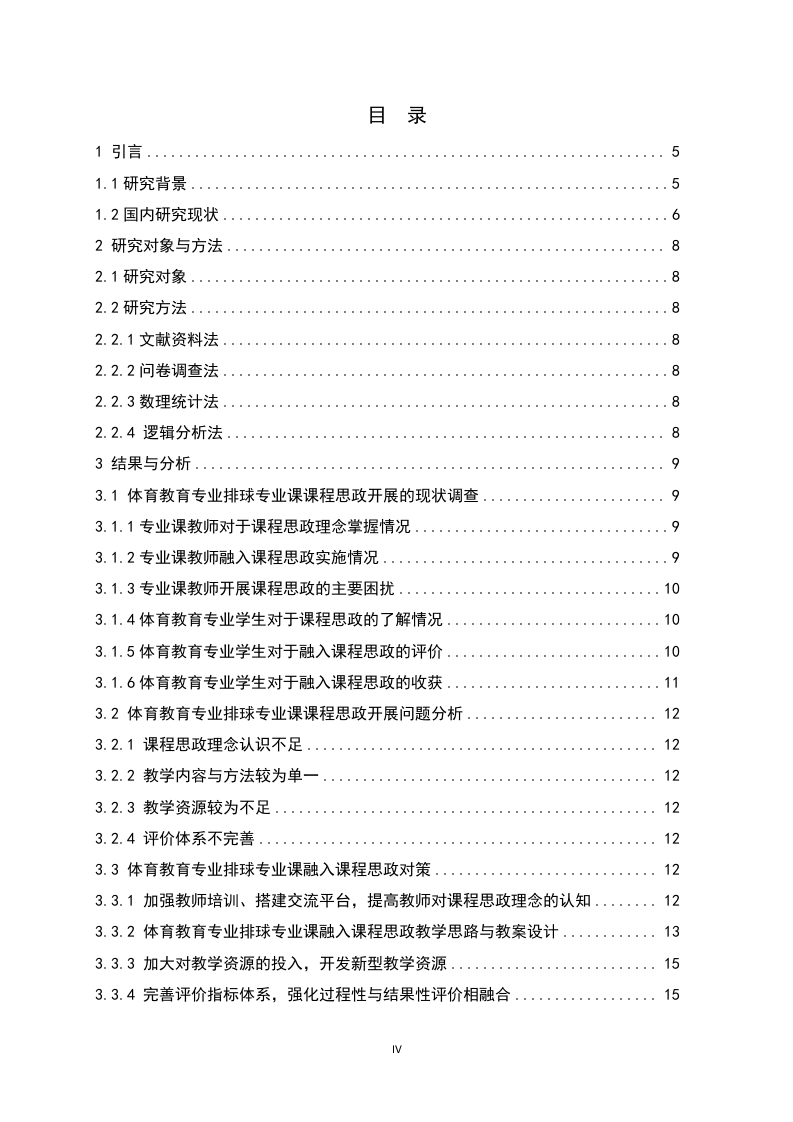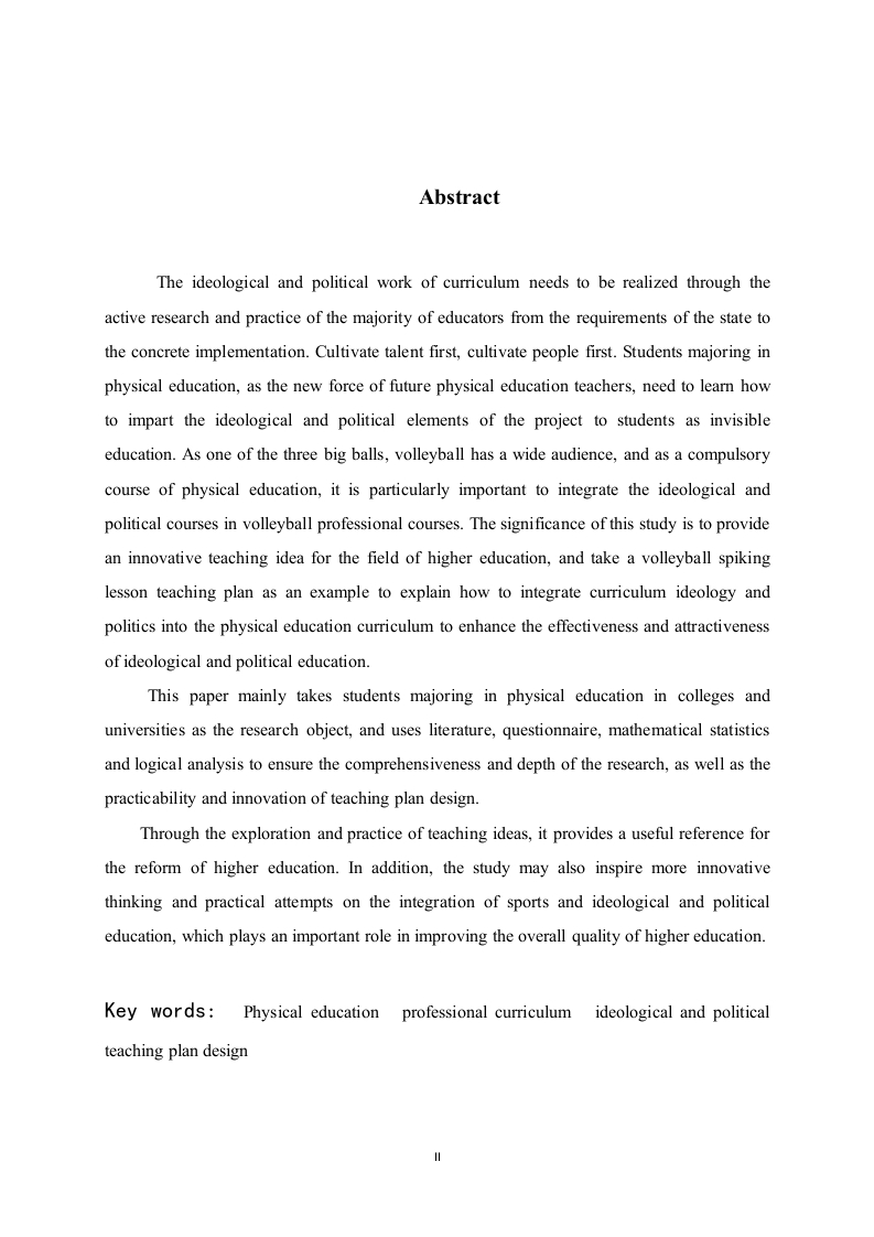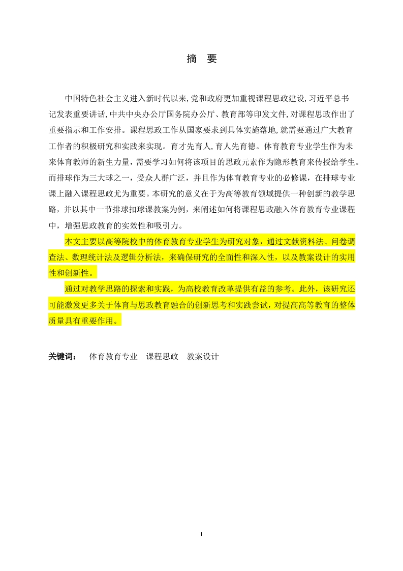 河译:范大学本科生毕业论文(设计)册学院:体育学院专业:体育教育年级:2020级学生姓名:张梓洋指导教师:郭强河译:范大学本科生毕业论文(设计)题目:体育教育专业课融入课程思政的教案设计--一以排球扣球为例学生姓名:张梓洋指导教师:郭强学院:体育学院专业:体育教育年级:2020完成日期:2024年5月28日学位论文原创性声明本人所提交的学位论文体育教育专业课融入课程思政的教案设计---以排球扣球为例,是在导师的指导下,独立进行研究工作所取得的原创性成果。除文中已经注明引用的内容外,本论文不包含任何其他个人或集体已经发表或撰写过的研究成果。对本文的研究做出重要贡献的个人和集体,均已在文中标明。本声明的法律后果由本人承担。论文作者(签名):指导教师确认(签名)。客注学位论文版权使用授权书本学位论文作者完全了解河北师范大学有权保留并向国家有关部门或机构送交学位论文的复印件和磁盘,允许论文被查阅和借阅。本人授权河北师范大学可以将学位论文的全部或部分内容编入有关数据库进行检索,可以采用影印、缩印或其它复制手段保存、汇编学位论文。保密的学位论文在年解密后适用本授权书及折论文作者(签名):指导教师(签名):客苹多强.摘要中国特色社会主义进入新时代以来,党和政府更加重视课程思政建设,习近平总书记发表重要讲话,中共中央办公厅国务院办公厅、教育部等印发文件,对课程思政作出了重要指示和工作安排。课程思政工作从国家要求到具体实施落地,就需要通过广大教育工作者的积极研究和实践来实现。育才先育人,育人先育德。体育教育专业学生作为未来体育教师的新生力量,需要学习如何将该项目的思政元素作为隐形教育来传授给学生。而排球作为三大球之一,受众人群广泛,并且作为体育教育专业的必修课,在排球专业课上融入课程思政尤为重要。本研究的意义在于为高等教育领域提供一种创新的教学思路,并以其中一节排球扣球课教案为例,来阐述如何将课程思政融入体育教育专业课程中,增强思政教育的实效性和吸引力。本文主要以高等院校中的体育教育专业学生为研究对象,通过文献资料法、问卷调查法、数理统计法及逻辑分析法,来确保研究的全面性和深入性,以及教案设计的实用性和创新性。通过对教学思路的探索和实践,为高校教育改革提供有益的参考。此外,该研究还可能激发更多关于体育与思政教育融合的创新思考和实践尝试,对提高高等教育的整体质量具有重要作用。关键词:体育教育专业课程思政教案设计