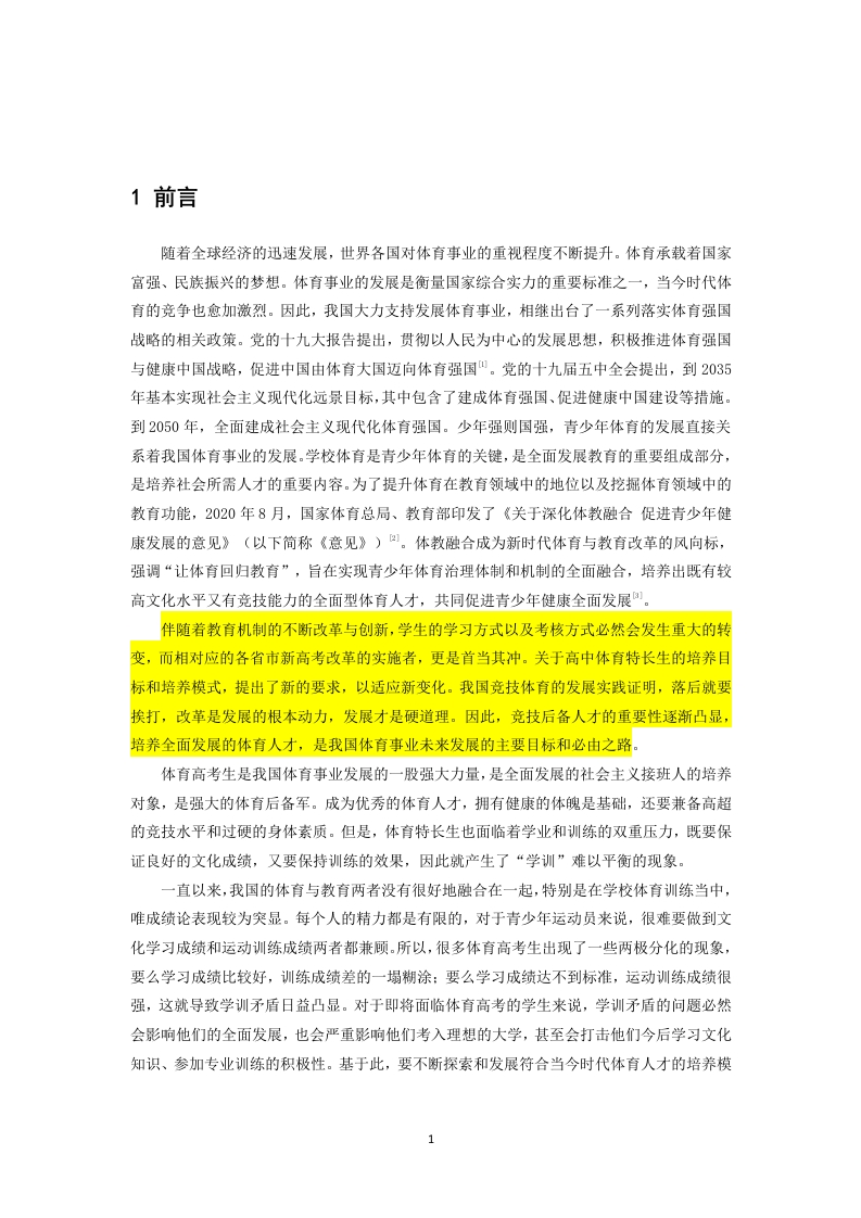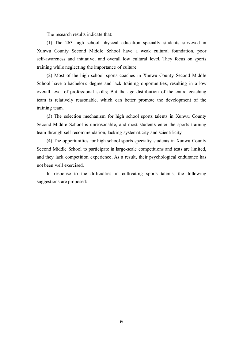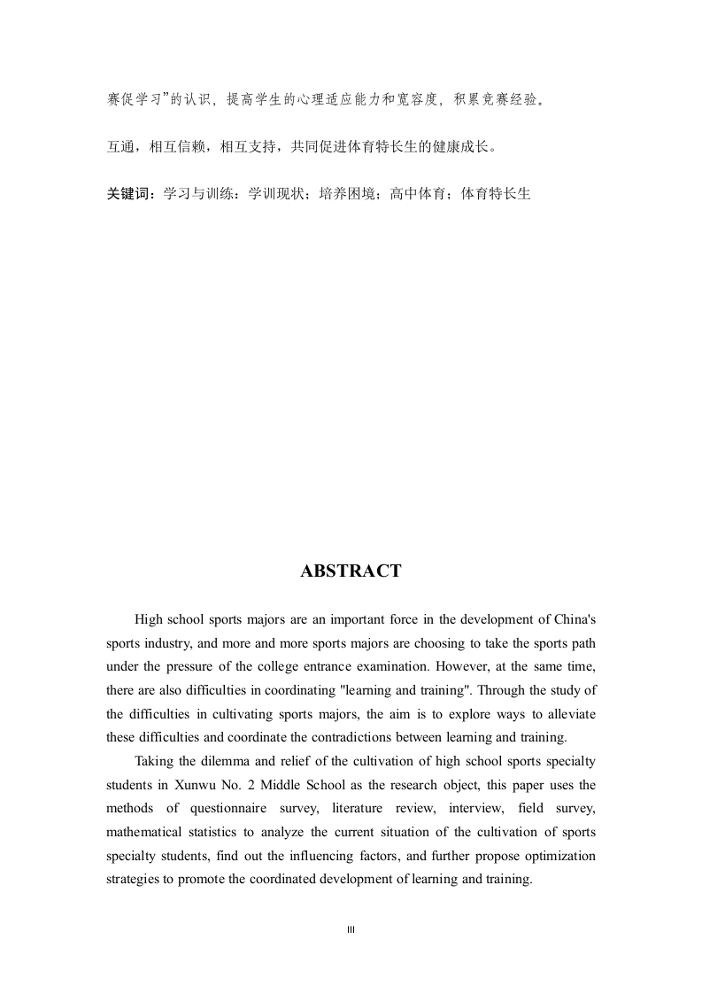 高中体育专业是中国体育产业发展的重要力量,越来越多的体育专业学生在高考压力下选择走体育之路。然而,与此同时,在协调“学习和培训”方面也存在因难。通过对体育专业培养困难的研究,旨在探索缓解这些困难的方法,协调学习与训练之间的矛盾。本文以寻乌二中高中体育专业学生培养的困境与缓解为研究对象,采用问卷调查、文献综述、访谈、实地调查、数理统计等方法,分析体育专业学生的培养现状,找出影响因素,并进一步提出优化策略,促进学习与训练的协调发展。研究结果表明:(1)寻乌县第二中学263名高中体育专业学生文化基础薄弱,自我意识和主动性差,整体文化水平低。他们只注重运动训练,而忽视了文化的重要性。(2)寻乌县第二中学的高中体育教练员大多拥有学士学位,缺乏培训机会,导致专业技能整体水平较低:但整个教练团队的年龄分布相对合理,可以更好地促进训练团队的发展。(3)寻乌县第二中学高中体育人才选拔机制不合理,大多数学生通过自我推荐进入运动训练队,缺乏系统性和科学性。(4)寻乌县第二中学高中体育专业学生参加大型比赛和测试的机会有限,缺乏比赛经验。因此,他们的心理耐力没有得到很好的锻炼。针对培养体育人才的困难,提出以下建议(1)体育专业学生应合理分配学习和训练时间,提高学习和训练效率,加强文化教师与体育教练员之间的沟通,落实个性化教学原则,共同制定适合学生的训练计划。(2)完善奖励考核机制,增强师资力量,增加教师外出培训机会,打造优秀教学团队,提高学生成绩。(3)体育教师应加大科研力度,开展更多的教学和科研活动,集思广益,制定科学合理的训练方法。(4)建立健全竞赛机制,强化“以竞赛代替训练,以竞赛促进教学,以竞赛促学习”的认识,提高学生的心理适应能力和宽容度,积累竞赛经验。互通,相互信赖,相互支持,共同促进体育特长生的健康成长。关键词:学习与训练:学训现状:培养困境:高中体育:体育特长生ABSTRACTHigh school sports majors are an important force in the development of China'ssports industry,and more and more sports majors are choosing to take the sports pathunder the pressure of the college entrance examination.However,at the same time,there are also difficulties in coordinating "learning and training".Through the study ofthe difficulties in cultivating sports majors,the aim is to explore ways to alleviatethese difficulties and coordinate the contradictions between learning and training.Taking the dilemma and relief of the cultivation of high school sports specialtystudents in Xunwu No.2 Middle School as the research object,this paper uses themethods of questionnaire survey,literature review,interview,field survey,mathematical statistics to analyze the current situation of the cultivation of sportsspecialty students,find out the influencing factors,and further propose optimizationstrategies to promote the coordinated development of learning and training.The research results indicate that:(1)The 263 high school physical education specialty students surveyed inXunwu County Second Middle School have a weak cultural foundation,poorself-awareness and initiative,and overall low cultural level.They focus on sportstraining while neglecting the importance of culture.(2)Most of the high school sports coaches in Xunwu County Second MiddleSchool have a bachelor's degree and lack training opportunities,resulting in a lowoverall level of professional skills;But the age distribution of the entire coachingteam is relatively reasonable,which can better promote the development of thetraining team.(3)The selection mechanism for high school sports talents in Xunwu CountySecond Middle School is unreasonable,and most students enter the sports trainingteam through self recommendation,lacking systematicity and scientificity.(4)The opportunities for high school sports specialty students in Xunwu CountySecond Middle School to participate in large-scale competitions and tests are limited,and they lack competition experience.As a result,their psychological endurance hasnot been well exercised.In response to the difficulties in cultivating sports talents,the followingsuggestions are prop
