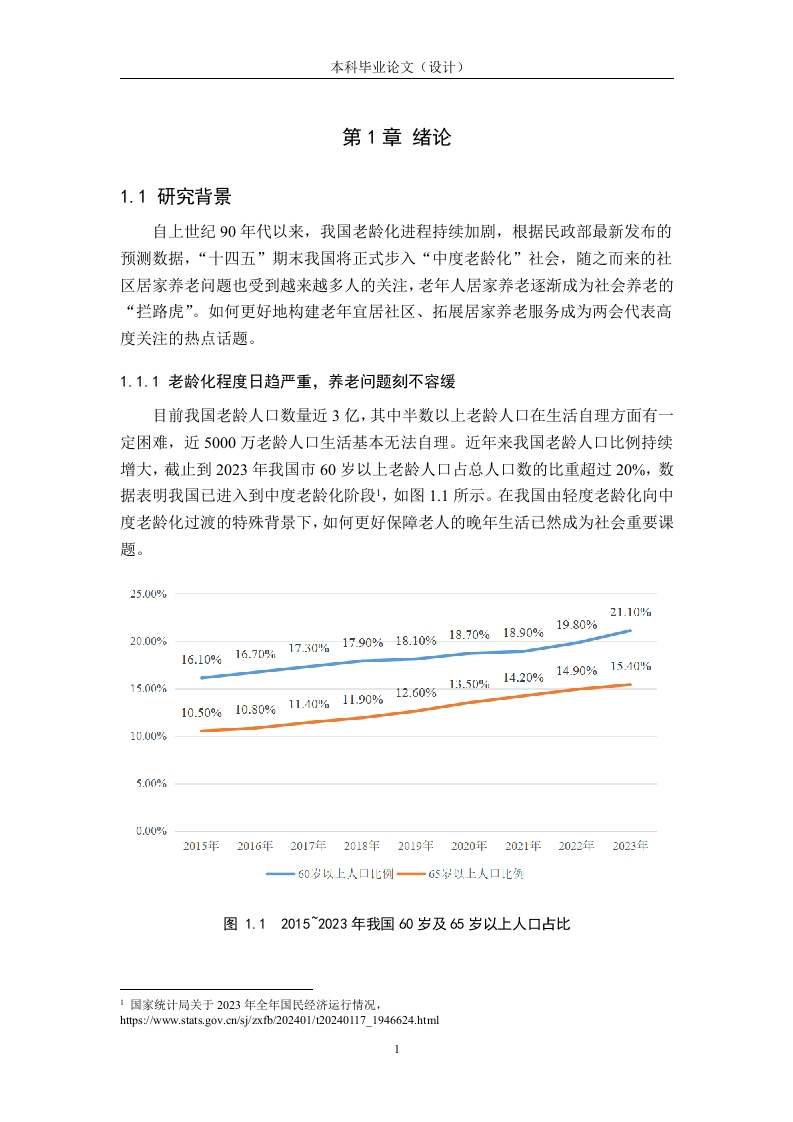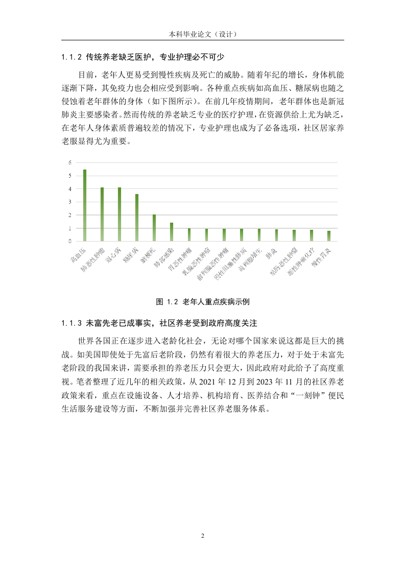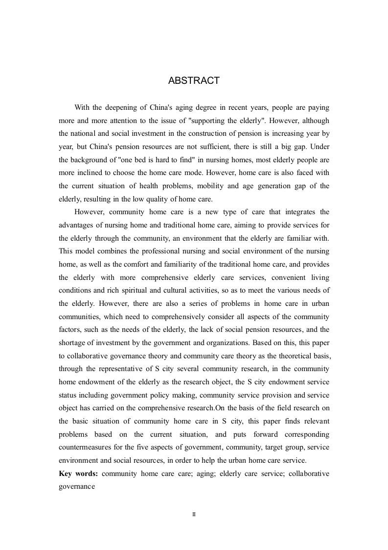 摘要随着近些年我国老龄化程度不断加深,人们对于“老有所养”的问题关注度日益加强。然而,虽然国家和社会对于养老的建设投入逐年加强,但是目前我国的养老资源并不充足,仍有很大的缺口。大部分老年人在养老院“一床难求”的背景下,更倾向于选择居家养老的养老方式。但是,居家养老同样面临老年人因为健康问题、活动能力和年龄代沟等现状,导致目前居家养老质量较低等问题。然而,社区居家养老是一种融合了养老院和传统居家养老优点的新型养老方式,旨在通过社区这个老年人都熟悉的环境为老年人提供服务。这种模式结合了养老院的专业护理和社交环境,以及传统居家养老的舒适和熟悉感,为老年人提供更全面、更具个性化的养老服务、便利的生活条件以及丰富的精神文化活动,以此来满足老年人生活的各种需要。但是,城市社区居家养老也存在着一系列问题,需要综合考虑社区各方面的因素,如老年人需求层面多、社会养老资源依旧处于匮乏状态、政府和社会组织投资紧缺等问题。基于此,本文以协同治理理论和社区照顾理论为理论基础,通过对S市具有代表性的几个社区进行调研,以各社区居家养老的老年人为调研对象,对S市养老服务现状包括政府政策制定方面、社区服务提供方面和服务的对象等方面进行了综合研究。本文在对S市社区居家养老基本情况进行了实地调研的基础上,基于现状发现了相关问题,并对政府、社区、目标群体、服务环境和社会资源五个方面提出了相应的对策,以期助力城市居家养老服务事业。关键词:社区居家养老:老龄化:养老服务:协同治理ABSTRACTWith the deepening of China's aging degree in recent years,people are payingmore and more attention to the issue of "supporting the elderly".However,althoughthe national and social investment in the construction of pension is increasing year byyear,but China's pension resources are not sufficient,there is still a big gap.Underthe background of "one bed is hard to find"in nursing homes,most elderly people aremore inclined to choose the home care mode.However,home care is also faced withthe current situation of health problems,mobility and age generation gap of theelderly,resulting in the low quality of home care.However,community home care is a new type of care that integrates theadvantages of nursing home and traditional home care,aiming to provide services forthe elderly through the community,an environment that the elderly are familiar with.This model combines the professional nursing and social environment of the nursinghome,as well as the comfort and familiarity of the traditional home care,and providesthe elderly with more comprehensive elderly care services,convenient livingconditions and rich spiritual and cultural activities,so as to meet the various needs ofthe elderly.However,there are also a series of problems in home care in urbancommunities,which need to comprehensively consider all aspects of the communityfactors,such as the needs of the elderly,the lack of social pension resources,and theshortage of investment by the government and organizations.Based on this,this paperto collaborative governance theory and community care theory as the theoretical basis,through the representative of S city several community research,in the communityhome endowment of the elderly as the research object,the S city endowment servicestatus including government policy making,community service provision and serviceobject has carried on the comprehensive research.On the basis of the field research onthe basic situation of community home care in S city,this paper finds relevantproblems based on the current situation,and puts forward correspondingcountermeasures for the five aspects of government,community,target group,serviceenvironment and social resources,in order to help the urban home care service.Key words:community home care care;aging;elderly care service;collaborativegovernance目录第1章绪论….11.1研究背景..........1.1.1老龄化程度日趋严重,养老问题刻不容