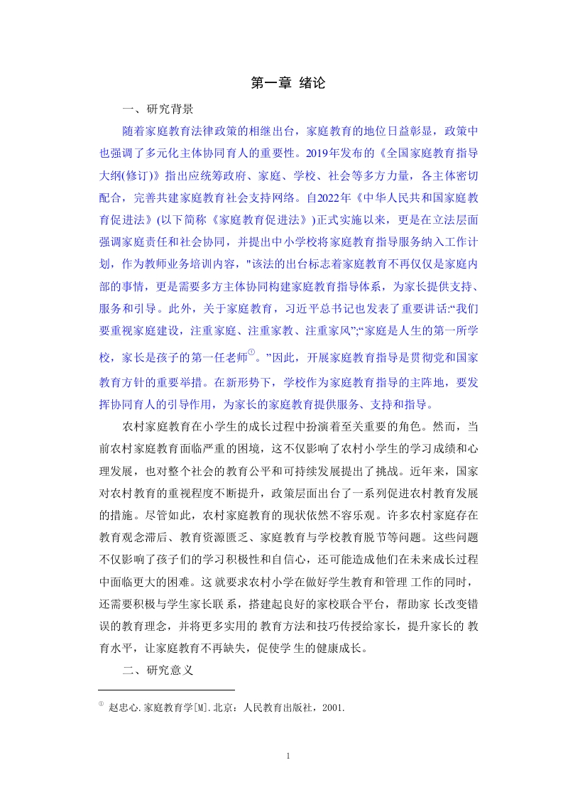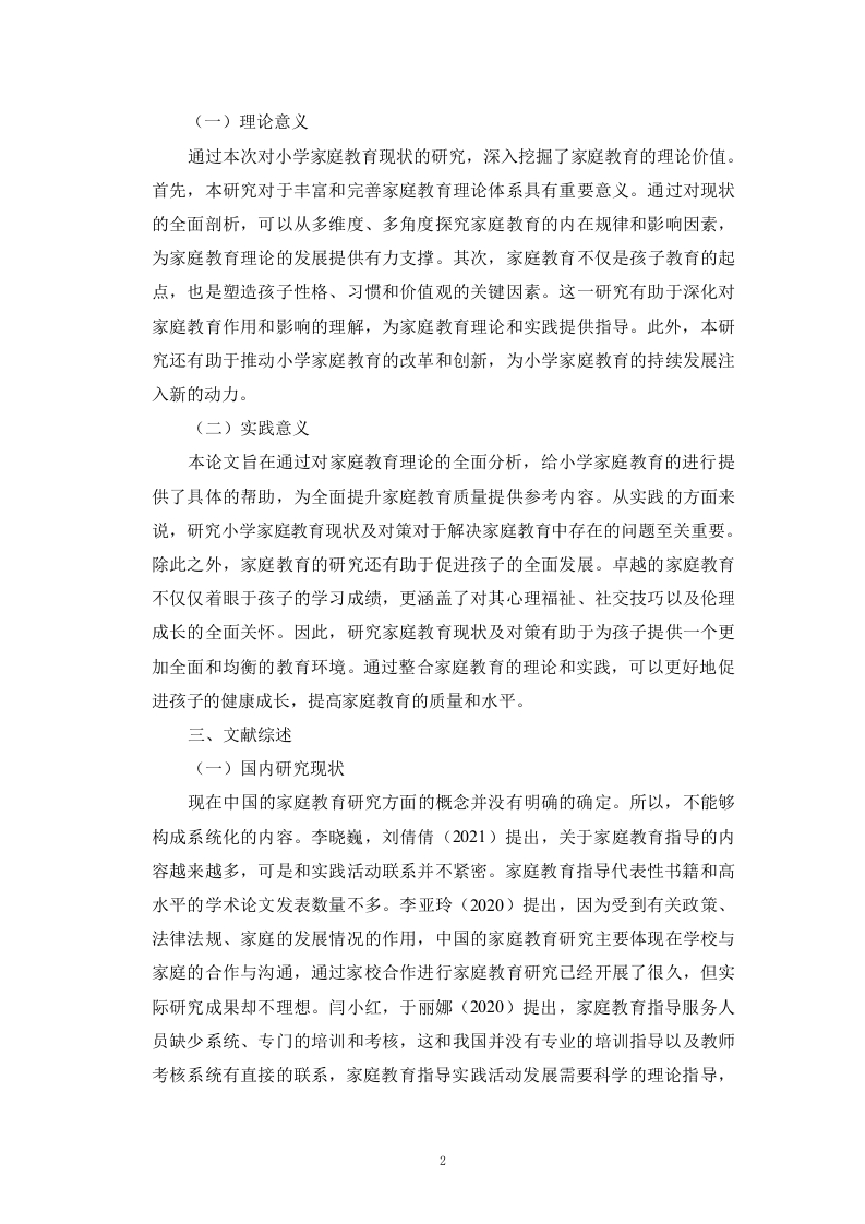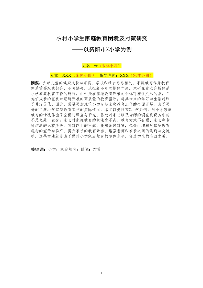 目录摘要.....................Abstract…..........................y第一章绪论.1一、研究背景.7二、研究意义.1(一)理论意义1(二)实践意义。7三、文献综述2(一)国内研究现状..2(二)国外研究现状.…..2(三)文献评述.3四、研究思路与方法.…3(一)研究思路.…3(二)研究方法.…3五、核心概念界定。(一)家庭教育….4(二)家庭教育指导.…第二章资阳市X小学家庭教育现状调查及分斯…5一、问卷设计.5二、资阳市X小学家庭教育现状调查结果分析.5(一)家长卷样本分析…5(二)教师卷样本分析.6三、资阳市X小学家庭教育现状分析.7(一)家长家庭教育现状….7(二)教师家庭教育现状….9第三章资阳市X小学农村小学生家庭教育存在的问题….13一、家长教育观念滞后...13二、教育资源匮乏.13三、家庭教育与学校教育脱节14第四章资阳市X小学农村小学生家庭教育缺失的原因分析.15一、家长缺乏科学的家教培训.15二、经济落后导致教育资源匮乏.15三、政府及学校重视不够导致家校教育分离…16第五章以资阳市X小学为例改善农村小学生家庭教育的对策建议..17一、加大培训力度,更新家长教育观念17二、建立帮扶体系,完善教育资源配置.17三、政策支持促进家校合作..18第六章结论….19一、研究总结….19二、研究不足与展望.19参考文献20附录A.….22附录B24致谢.26关于学士论文原创性的声明27II农村小学生家庭教育困境及对策研究以资阳市X小学为例姓名:x(宋体小四)专业:XXX(宋体小四)指导老师:XXX(宋体小四)摘要:少年儿童的健康成长与家庭、学校和社会息息相关,家庭教育作为教育体系重要组成部分,不可缺失,承担着不可忽视的作用。本研究重点分析的是小学家庭教育工作的进行。由于处在基础教育环节的个体可塑性更加的强,在他们成长的重要时期所开展的高质量的教育指导,对其未来的学习与生活起到了奠定价值。因此,需要更加注重小学时期家庭教育工作的全面开展。为了更好的了解小学家庭教育工作的实际情况,本文以资阳市X小学为例,对小学家庭教育的情况作出了全面的调查与研究。借助对家长以及老师的调查发现其中的不足之处,包含:家长对家庭教育的关注度不高、教育方式不合理、家长和老师沟通的比较少等。针对以上的问题,提出改进对策,包含:增强对家庭教育观念的宣传与推广、提升家长的教育素养、增强老师和家长之间的沟通与交流等。这些方法就是为了提升小学家庭教育的整体水平,促进学生的全面发展。关键词:小学:家庭教育;困境;对策IIIResearch on the Challenges and Countermeasures of FamilyEducation for Rural Primary School Students:A Case Study ofX Primary School in Ziyang Cityxxx(Times New Roman字体、小四号、居中)Major::xxx(Times New Roman字体、小四号)Instructor:xxx(Times New Roman字体、小四号)Abstract:The healthy growth of children is closely related to family,school andsociety.Family education,as an important part of the education system,cannot bemissing and plays an important role.This study focuses on the analysis of familyeducation in primary schools.As individuals in basic education are more flexible,the high-quality education guidance carried out in the important period of theirgrowth has laid a foundation for their future study and life.Therefore,we need topay more attention to the comprehensive development of family education inprimary school.With the help of the survey of parents and teachers,we foundsome shortcomings,including:parents'low attention to family education,unreasonable education methods,less communication between parents andteachers,etc.In view of the above problems,this paper puts forward theimprovement countermeasures,including:enhancing the publicity and promotionof the concept of family education,improving the educational quality of parents,and enhancing the communication and exchange between teachers and parents.These methods are to improve the overall level of primary school familyeducation and promote the all-round development of students.Key words primary school Family education Current situationCountermeasuresIV