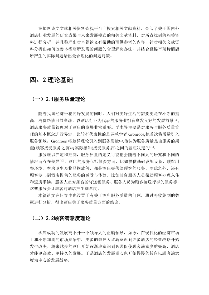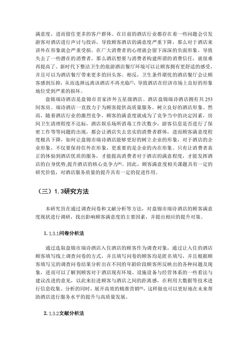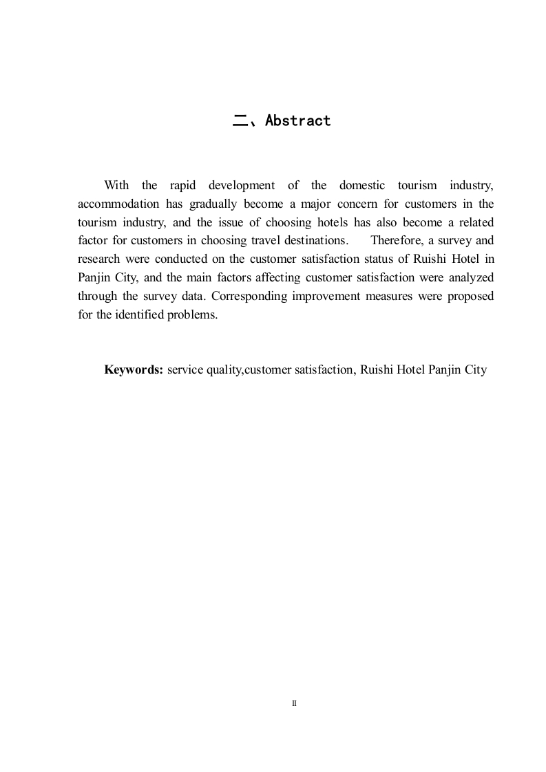 瑞诗酒店顾客满意度提升对策研究目录摘要Abstract.....1绪论….31.1研究背景..31.2研究目的和意义31.3研究方法.2理论基础….52.1服务质量理论.52.2顾客满意度理论..63酒店发展概况….63.1酒店历史.63.2酒店产品..63.3酒店特色….74顾客满意度分析研究….84.1问卷设计及数据分析.84.2调查结果分析.….95瑞诗酒店顾客满意度存在的问题125.1酒店地理位置不具有优势.…..125.2酒店无法及时解决顾客需求问题135.3酒店处理顾客投诉效率低5.4酒店的现代化设施不完善136瑞诗酒店顾客满意度提升对策.….146.1酒店增设交通服务….146.2提高酒店解决顾客问题效率.146.3在网络平台增设酒店投诉窗口...146.4优化并完普酒店内部设施.15结论.n.5参考文献…17致谢.18一、摘要随着国内旅游业的快速发展,在住宿方面的问题也逐渐成为了在旅游业中的一个非常受到顾客们关注的一大问题,随之而来的选择酒店问题也成为了顾客在选择旅游目的地上的一个相关因素。瑞诗酒店一直致力于对顾客提供一个高质量的服务、亲切的服务态度、舒适温馨的住宿环境和质量完好的设施设备,然而,随着酒店行业的激烈竞争,顾客的满意度就成为了竞争当中的决定因素,所以,对于提升研究顾客对于酒店的满意度的提升就非常至关重要。所以对盘锦市瑞诗酒店的顾客满意度现状进行调查与研究,并通过调查出的数据分析出影响顾客满意度的主要因素,并且对发现的问题提出相对应的提升对策。关键词:服务质量;顾客满意度:盘锦瑞诗酒店二、AbstractWith the rapid development of the domestic tourism industry,accommodation has gradually become a major concern for customers in thetourism industry,and the issue of choosing hotels has also become a relatedfactor for customers in choosing travel destinations.Therefore,a survey andresearch were conducted on the customer satisfaction status of Ruishi Hotel inPanjin City,and the main factors affecting customer satisfaction were analyzedthrough the survey data.Corresponding improvement measures were proposedfor the identified problems.Keywords:service quality,customer satisfaction,Ruishi Hotel Panjin City