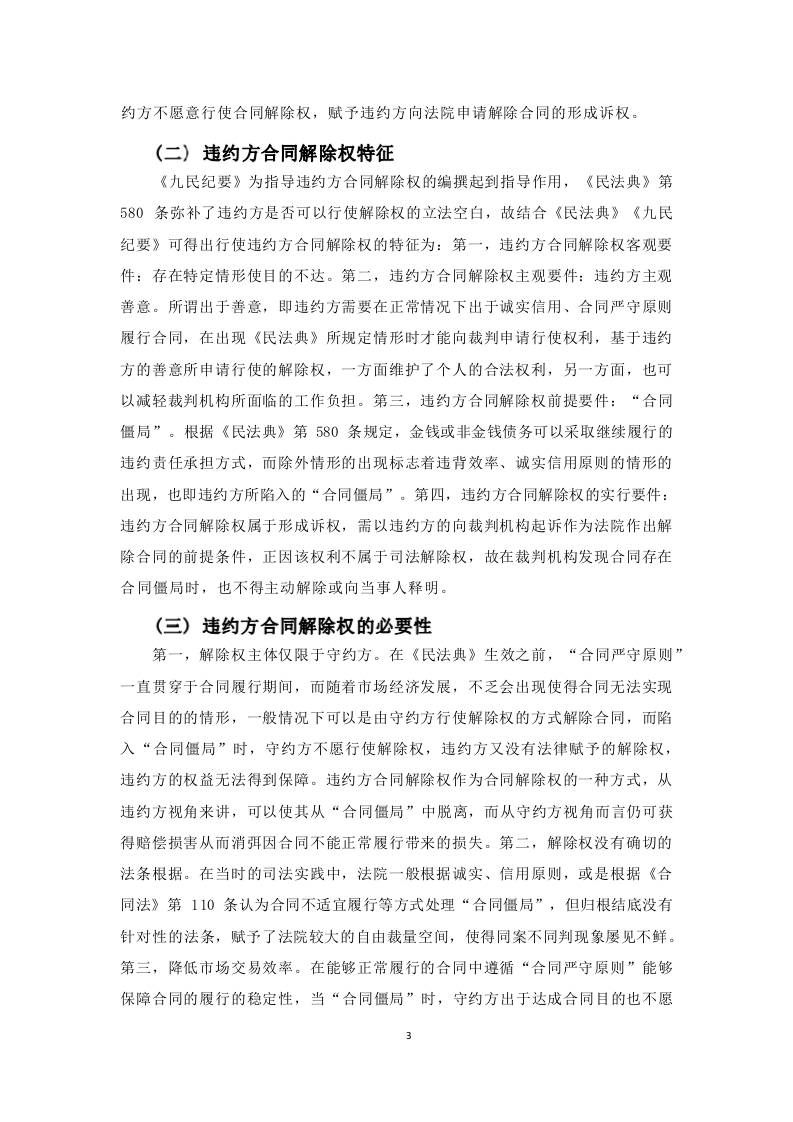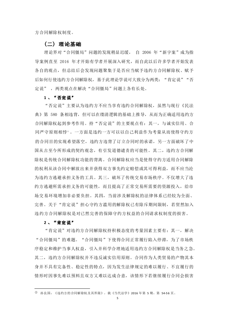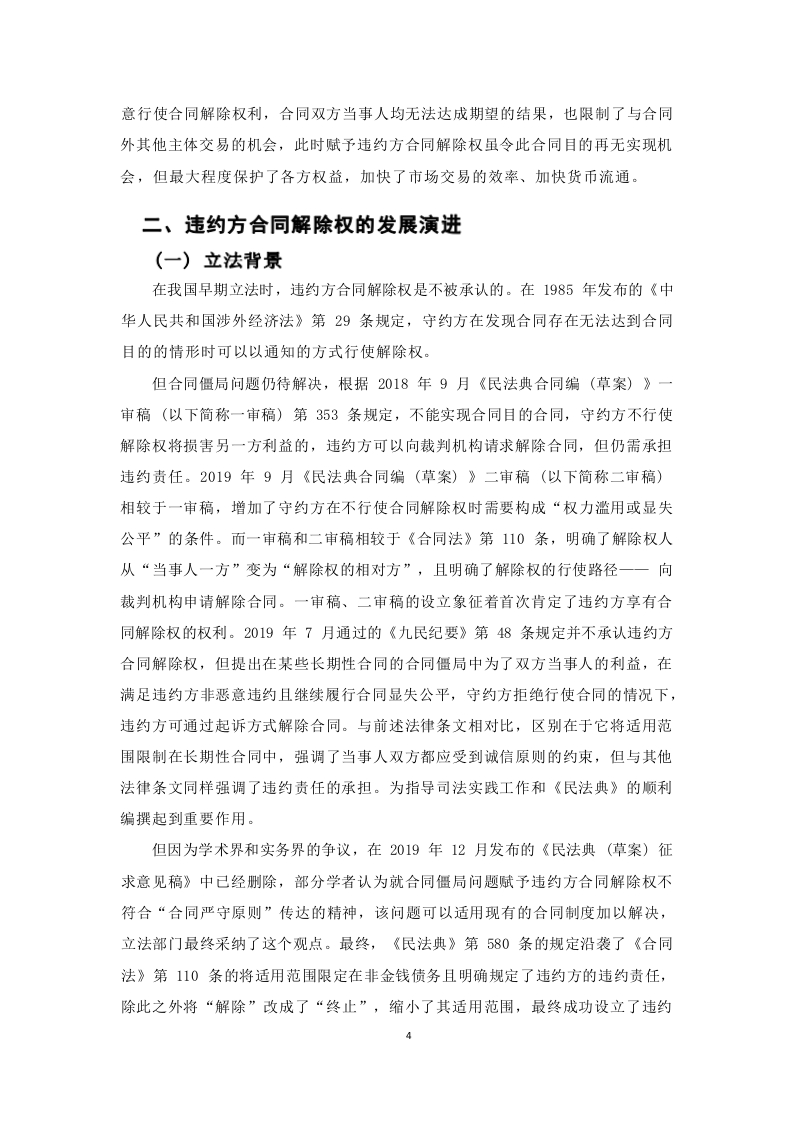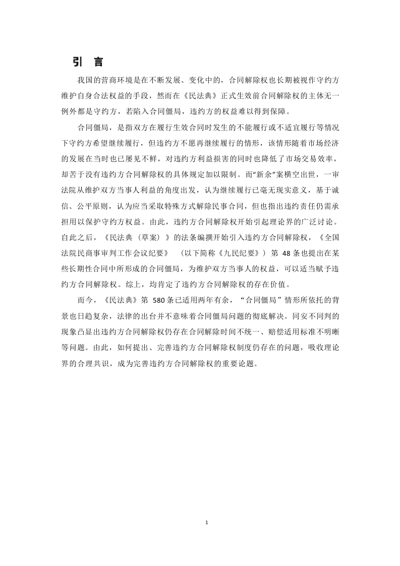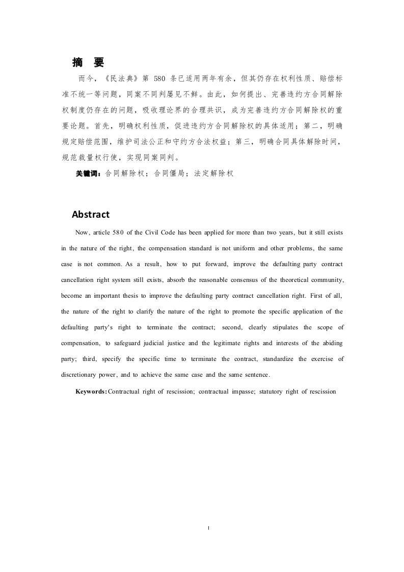 《民法典》视角下违约方合同解除权规则适用目录摘要Abstract.引言……1一、违约方合同解除权概述……2(一)违约方合同解除权概念2(二)违约方合同解除权特征.……3(三)违约方合同解除权的必要性二、违约方合同解除权的发展演进…4()立法背景.4(二)理论基础…51、“否定说”.52、“肯定说”53、针对“否定说”提出问题的解决路径,.6(三)司法实践.7三、违约方合同解除权存在的问题…9(一)权利性质不明确…9(二)损害赔偿责任判定不统9(三)合同解除时间不一致…10四、违约方合同解除权的完普…10(一)明确权利性质….10(二)明确合同解除时间…11(三)明确赔偿责任,11结语…13参考文献…14摘要而今,《民法典》第580条已适用两年有余,但其仍存在权利性质、赔偿标准不统一等问题,同案不同判屡见不鲜。由此,如何提出、完善违约方合同解除权制度仍存在的问题,吸收理论界的合理共识,成为完善违约方合同解除权的重要论题。首先,明确权利性质,促进违约方合同解除权的具体适用;第二,明确规定赔偿范围,维护司法公正和守约方合法权益;第三,明确合同具体解除时间,规范栽量权行使,实现同案同判。关键词:合同解除权;合同僵局;法定解除权AbstractNow,article 580 of the Civil Code has been applied for more than two years,but it still existsin the nature of the right,the compensation standard is not uniform and other problems,the samecase is not common.As a result,how to put forward,improve the defaulting party contractcancellation right system still exists,absorb the reasonable consensus of the theoretical community,become an important thesis to improve the defaulting party contract cancellation right.First of all,the nature of the right to clarify the nature of the right to promote the specific application of thedefaulting party's right to terminate the contract;second,clearly stipulates the scope ofcompensation,to safeguard judicial justice and the legitimate rights and interests of the abidingparty:third,specify the specific time to terminate the contract,standardize the exercise ofdiscretionary power,and to achieve the same case and the same sentence.Keywords:Contractual right of rescission;contractual impasse;statutory right of rescission引言我国的营商环境是在不断发展、变化中的,合同解除权也长期被视作守约方维护自身合法权益的手段,然而在《民法典》正式生效前合同解除权的主体无一例外都是守约方,若陷入合同僵局,违约方的权益难以得到保障。合同僵局,是指双方在履行生效合同时发生的不能履行或不适宜履行等情况下守约方希望继续履行,但违约方不愿再继续履行的情形,该情形随着市场经济的发展在当时也已屡见不鲜,对违约方利益损害的同时也降低了市场交易效率,却苦于没有违约方合同解除权的具体规定加以限制。而“新余”案横空出世,一审法院从维护双方当事人利益的角度出发,认为继续履行已毫无现实意义,基于诚信、公平原则,认为应当采取特殊方式解除民事合同,但也指出违约责任仍需承担用以保护守约方权益。由此,违约方合同解除权开始引起理论界的广泛讨论。自此之后,《民法典(草案)》的法条编撰开始引入违约方合同解除权,《全国法院民商事审判工作会议纪要》(以下简称《九民纪要》)第48条也提出在某些长期性合同中所形成的合同僵局,为维护双方当事人的权益,可以适当赋予违约方合同解除权。综上,均肯定了违约方合同解除权的存在价值。而今,《民法典》第580条已适用两年有余,“合同僵局”情形所依托的背景也日趋复杂,法律的出台并不意味着合同僵局问题的彻底解决。同安不同判的现象凸显出违约方合同解除权仍存在合同解除时间不统一、赔偿适用标准不明晰等问题。由此,如何提出、完善违约方合同解除权制度仍存在的问题,吸收理论界的合理共识,成为完善违约方合同解除权的重要论题。一、违约方合同解除权概述(一)违约方合同解除权概念在大陆法系国家,合同履行中一般坚持“合同严守原则”,一方面是合同双方出于合意达成的合同,应当按照订立合同时约定的权利义务履约:另一方面赋予任意一方随意解除合同的权利都会损害交易市场的稳定性。但随着市场环境的日益完善,不可避免地出现因某些因素使得合同难以履行的情形,此时守约方出于想继续履约或获得更高的赔偿款项使得合同解除“遥遥无期”,一方面损害了市场交易,另一方面违约方的权益也难以得到救济。违约方合同解除权是赋予违约方“脱离”陷入合同僵局的制度,违约方合同解除权与合同严守原则各尽其责,其在某些特定情况下发挥保障当事人权益、促进市场运转的权益。想知道违约方合同解除权,必先了解其背景一一合同僵局。目前法学界尚未对“合同僵局”作学界统一定义,主流观念指的是由于合同不适宜强制履行或客观不能履行,继续履行将损害当事人的利益,而守约方不愿意解除合同所导致的情形。由此可以进一步提出“合同僵局”的主要特征为:第一,合同不适宜强制履行或客观履行不能。但其与情势变更有所区别,根据《民法典》第533条,情势变更属于发生了无法预见、非商业风险的客观变化,继续履行将对一方当事人不利从而无需承担违约责任。“合同僵局”下的不能履行更多是为了平衡双方当事人的利益,比如游戏公司与自然人签订一项长期合同,但自然人因为个人原因导致继续履行费用过高。此时并没有发生情势变更的合同客