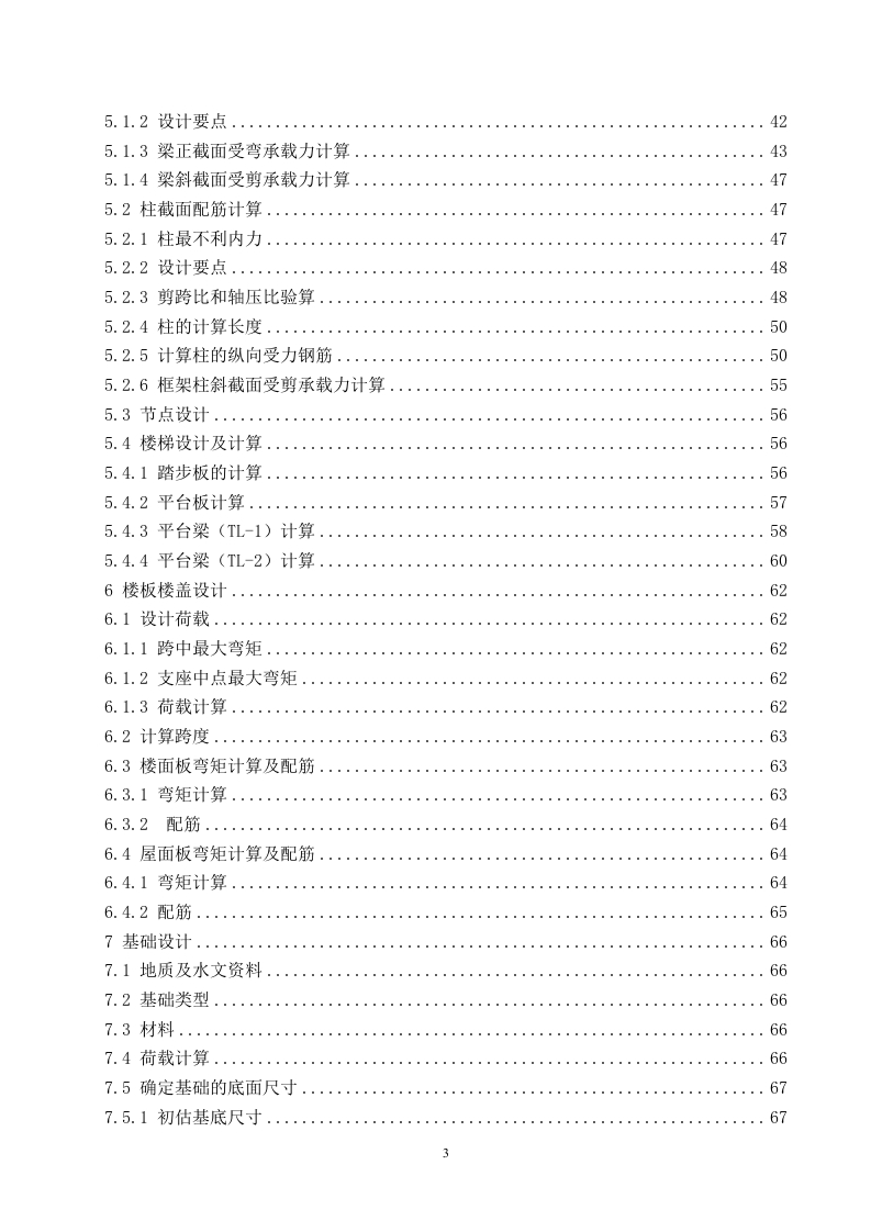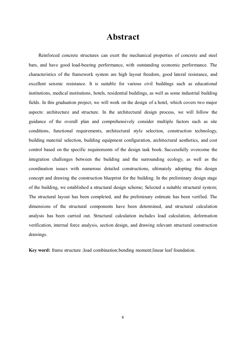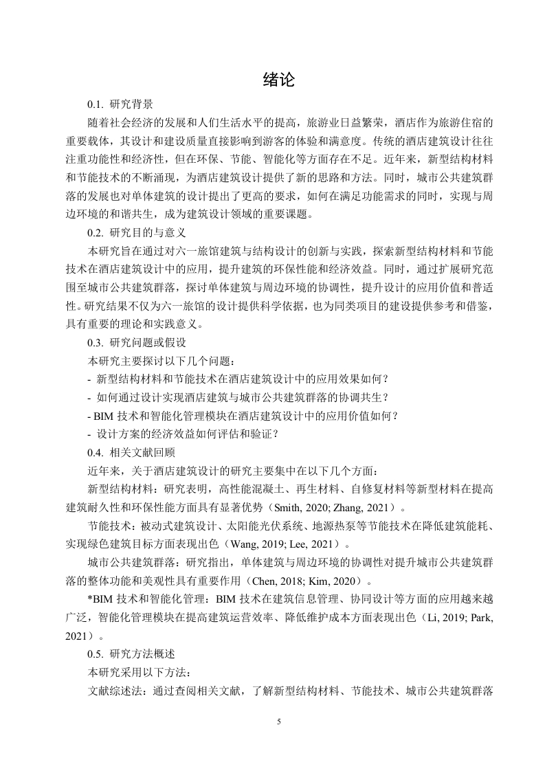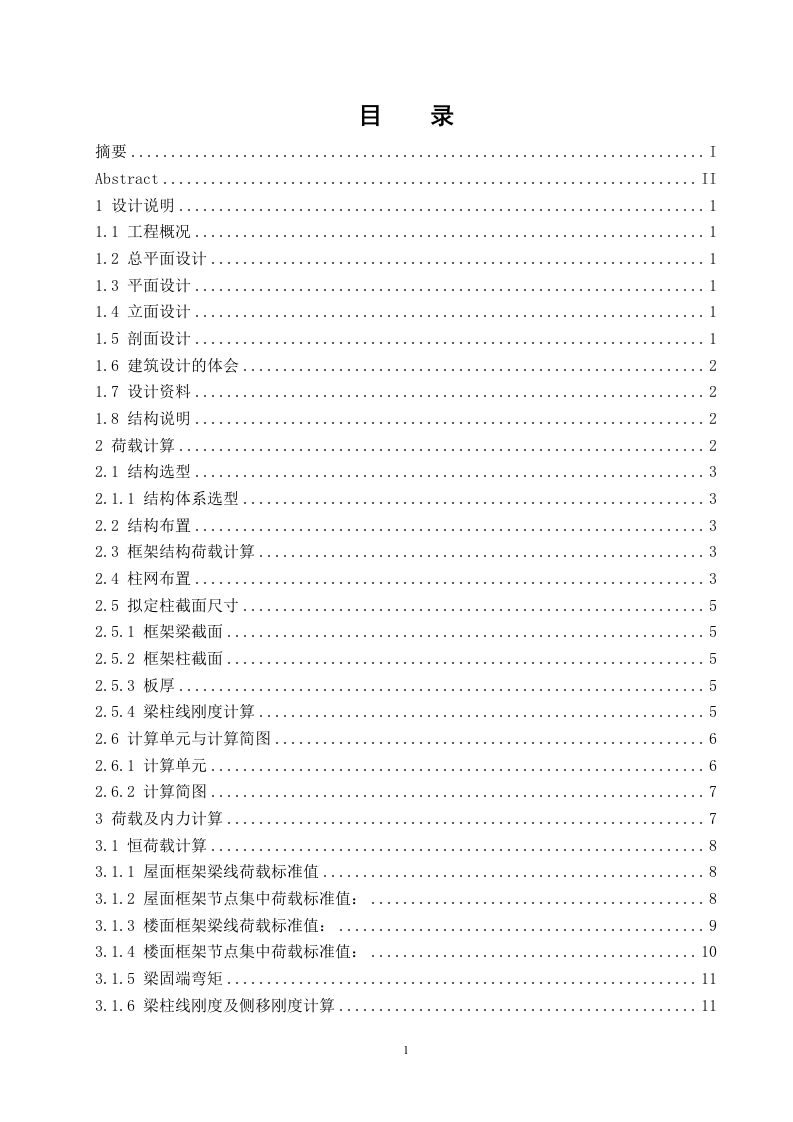 六一旅馆建筑与结构设计-新型材料、节能技术与多学科融合的探索摘要钢筋混凝土框架结构能够充分发挥混凝土和钢筋的力学性能,具有良好的受力性能和经济性。框架体系的特点在于布局自由度高、横向抗力强、抗震性能优异,适用于教育机构、医疗机构、酒店、住宅等多种民用建筑,以及部分工业建筑领域。在本次毕业设计中,我们将进行酒店的设计工作,涵盖建筑与结构两大方面。在建筑设计环节,我们遵循总体规划的指导,依据设计任务书的要求,全面考虑建筑风格选择、施工技术、建材选用、建筑设备配置、建筑美学及成本控制等因素。解决了建筑与生态融合的技术难点,以及与众多细节构造的协调问题,最终采纳了基于框架体系的整体设计方案,并绘制了建筑施工蓝图。在建筑初步设计阶段,我们确立了结构设计方案,挑选了适宜的结构体系,完成了结构布局,并对初步估算进行了验证,确定了结构部件的尺寸,通过荷载计算、内力分析等方法完成了结构设计。结构计算包括荷载计算、变形验算、内力分析及截面设计,并绘制了相关的结构施工图。本研究不仅提升了框架结构在多层民用建筑中的抗震性能,还为同类项目提供了设计参考,具有重要的理论和实践意义。关键词:框架结构荷载组合地震作用独立基础AbstractReinforced concrete structures can exert the mechanical properties of concrete and steelbars,and have good load-bearing performance,with outstanding economic performance.Thecharacteristics of the framework system are high layout freedom,good lateral resistance,andexcellent seismic resistance.It is suitable for various civil buildings such as educationalinstitutions,medical institutions,hotels,residential buildings,as well as some industrial buildingfields.In this graduation project,we will work on the design of a hotel,which covers two majoraspects:architecture and structure.In the architectural design process,we will follow theguidance of the overall plan and comprehensively consider multiple factors such as siteconditions,functional requirements,architectural style selection,construction technology,building material selection,building equipment configuration,architectural aesthetics,and costcontrol based on the specific requirements of the design task book.Successfully overcome theintegration challenges between the building and the surrounding ecology,as well as thecoordination issues with numerous detailed constructions,ultimately adopting this designconcept and drawing the construction blueprint for the building.In the preliminary design stageof the building,we established a structural design scheme;Selected a suitable structural system;The structural layout has been completed,and the preliminary estimate has been verified.Thedimensions of the structural components have been determined,and structural calculationanalysis has been carried out.Structural calculation includes load calculation,deformationverification,internal force analysis,section design,and drawing relevant structural constructiondrawings.Key word:frame structure load combination;bending moment;linear leaf foundation.目录Abstract....................II1设计说明…11.1工程概况....….11.2总平面设计...…11.3平面设计..11.4立面设计...11.5剖面设计....11.6建筑设计的体会21.7设计资料.21.8结构说明............22荷载计算...2.1结构选型..32.1.1结构体系选型..2.2结构布置.....32.3框架结构荷载计算。。32.4柱网布置...32.5拟定柱截面尺寸...52.5.1框架梁截面...52.5.2框架柱截面..S2.5.3板厚.....….52.5.4梁柱线刚度计算52.6计算单元与计算简图。。62.6.1计算单元..·62.6.2计算简图....73荷载及内力计算...73.1恒荷载计算.…….83.1.1屋面框架梁线荷载标准值3.1.2屋面框架节点集中荷载标准值:83.1.3楼面框架梁线荷载标准值:93.1.4楼面框架节点集中荷载标准值:…….103.1.5梁固端弯矩........…113.1.6梁柱线刚度及侧移刚度计算...113.2恒荷载作用下的框架内力计算..123.2.1弯矩分配系数...123.2.2内力计算....133.2.3合成总弯矩图153.3活荷载计算........173.3.1屋面活荷载...……173.3.2屋面纵向框架梁传来活荷载标准值…173.3.3楼面活荷...............3.3.4楼面纵向框架梁传来活荷载标准值183.3.5梁固端弯矩....183.4活荷载作用下的框架内力计算183.4.1