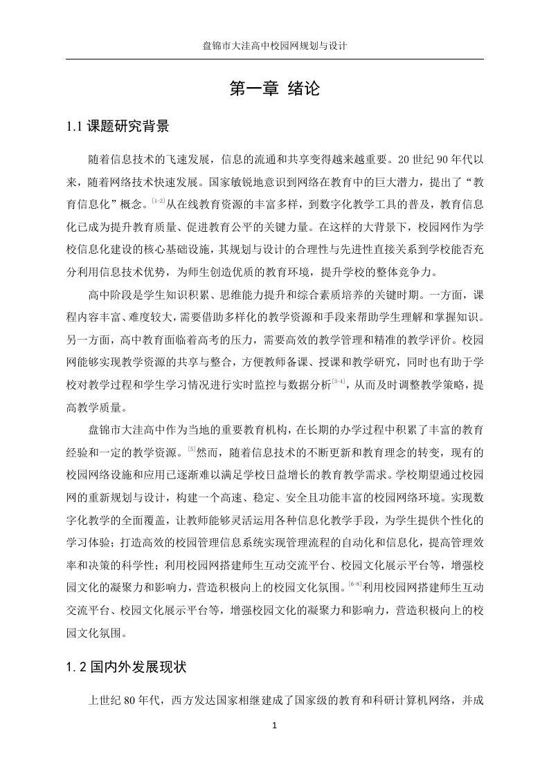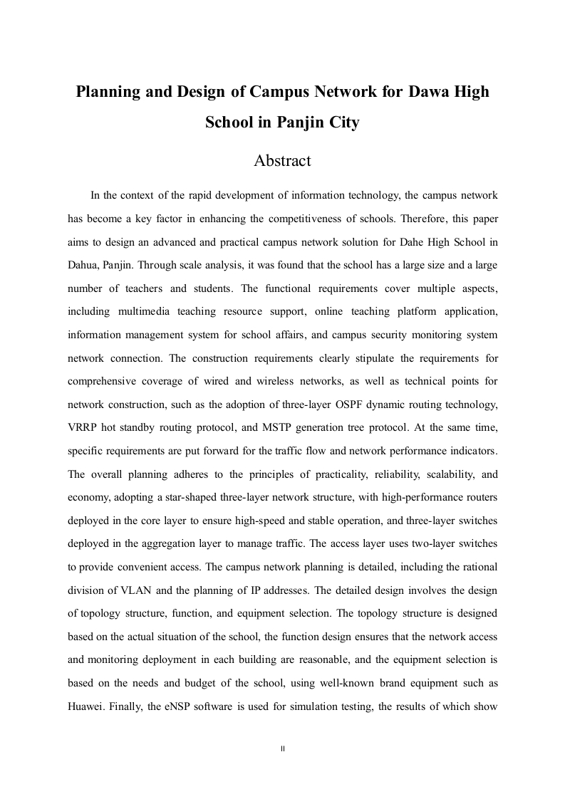 盘锦市大洼高中校园网规划与设计摘要在信息技术飞速发展的背景下,校园网成为学校提升竞争力的关键。为此,本文旨在为盘锦市大洼高中规划设计一套先进且实用的校园网方案。通过规模分析可知,学校规模较大,师生数量众多。功能需求涵盖教学、管理、学生发展等多方面,包括多媒体教学资源支持、在线教学平台应用、教务管理系统信息化、校园安全监控系统联网等。建设需求明确了有线与无线网络的全面覆盖要求,以及网络建设的技术要点,如采用三层OSP℉动态路由技术、VRRP热备份路由协议、MSTP生成树协议等,同时对业务流量和网络性能指标提出了具体要求。整体规划遵循实用性、可靠性、可扩展性和经济性原则,采用星型三层网络结构,核心层配置高性能路由器保障高速稳定,汇聚层运用三层交换机管理流量,接入层采用二层交换机提供便捷接入。校园网规划详细,包括合理划分VLAN、规划P地址等。详细设计涉及拓扑结构设计、功能设计和设备选型。拓扑结构结合学校实际情况构建,功能设计确保各楼栋网络接入与监控部署合理,设备选型依据学校需求和预算,选用华为等知名品牌设备,最后,利用NSP软件进行仿真测试,结果表明,DHCP、外网访问、VRRP、OSPF、MSTP、Qos、无线网络登录、IPSecVPN等功能均达到预期,校园网稳定高效、健壮且可扩展,将有力推动学校教学、管理等工作的信息化进程,为师生提供优质的网络环境。关键词:校园网规划:网络拓扑:设备选型:功能测试:高中信息化建设Planning and Design of Campus Network for Dawa HighSchool in Panjin CityAbstractIn the context of the rapid development of information technology,the campus networkhas become a key factor in enhancing the competitiveness of schools.Therefore,this paperaims to design an advanced and practical campus network solution for Dahe High School inDahua,Panjin.Through scale analysis,it was found that the school has a large size and a largenumber of teachers and students.The functional requirements cover multiple aspects,including multimedia teaching resource support,online teaching platform application,information management system for school affairs,and campus security monitoring systemnetwork connection.The construction requirements clearly stipulate the requirements forcomprehensive coverage of wired and wireless networks,as well as technical points fornetwork construction,such as the adoption of three-layer OSPF dynamic routing technology,VRRP hot standby routing protocol,and MSTP generation tree protocol.At the same time,specific requirements are put forward for the traffic flow and network performance indicators.The overall planning adheres to the principles of practicality,reliability,scalability,andeconomy,adopting a star-shaped three-layer network structure,with high-performance routersdeployed in the core layer to ensure high-speed and stable operation,and three-layer switchesdeployed in the aggregation layer to manage traffic.The access layer uses two-layer switchesto provide convenient access.The campus network planning is detailed,including the rationaldivision of VLAN and the planning of IP addresses.The detailed design involves the designof topology structure,function,and equipment selection.The topology structure is designedbased on the actual situation of the school,the function design ensures that the network accessand monitoring deployment in each building are reasonable,and the equipment selection isbased on the needs and budget of the school,using well-known brand equipment such asHuawei.Finally,the eNSP software is used for simulation testing,the results of which showthat the DHCP,external network access,VRRP,OSPF,MSTP,QoS,wireless network login,and IPSec VPN functions all meet expectations.The campus network is stable,efficient,robust,and scalable,which will effectively promote the informatization process of schoolteaching and ma