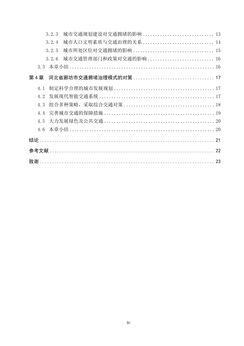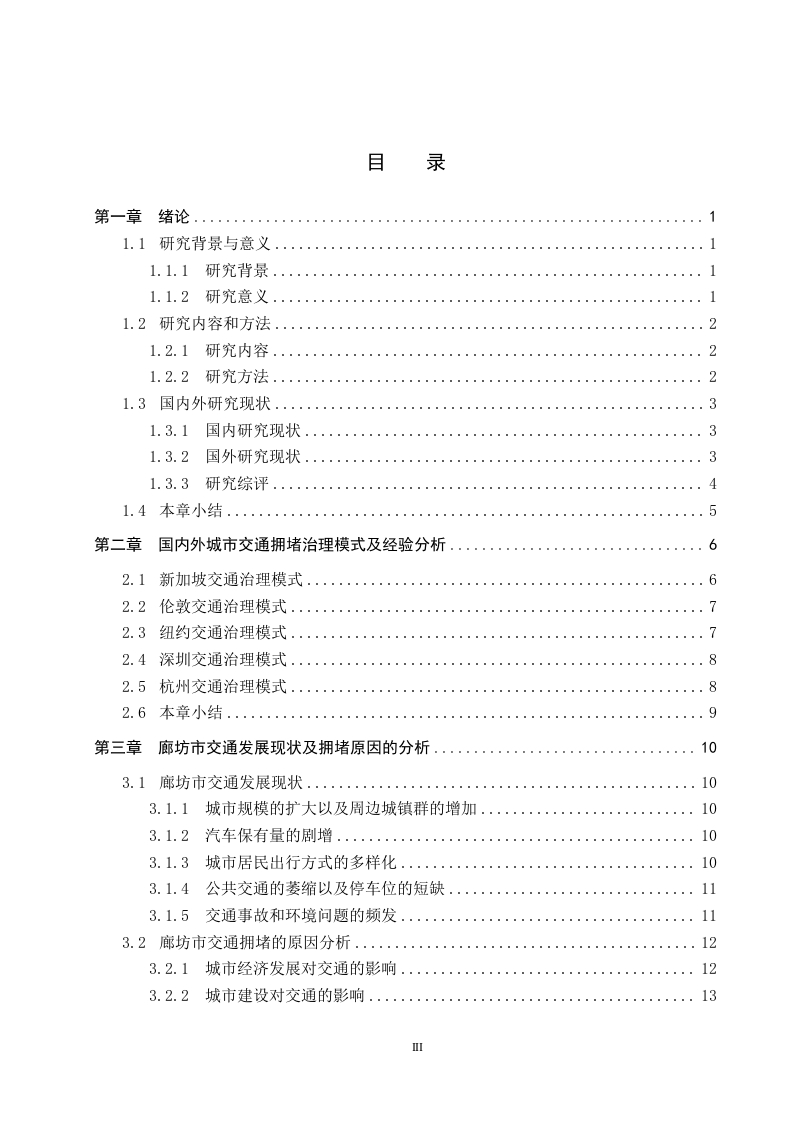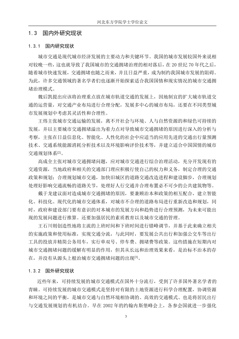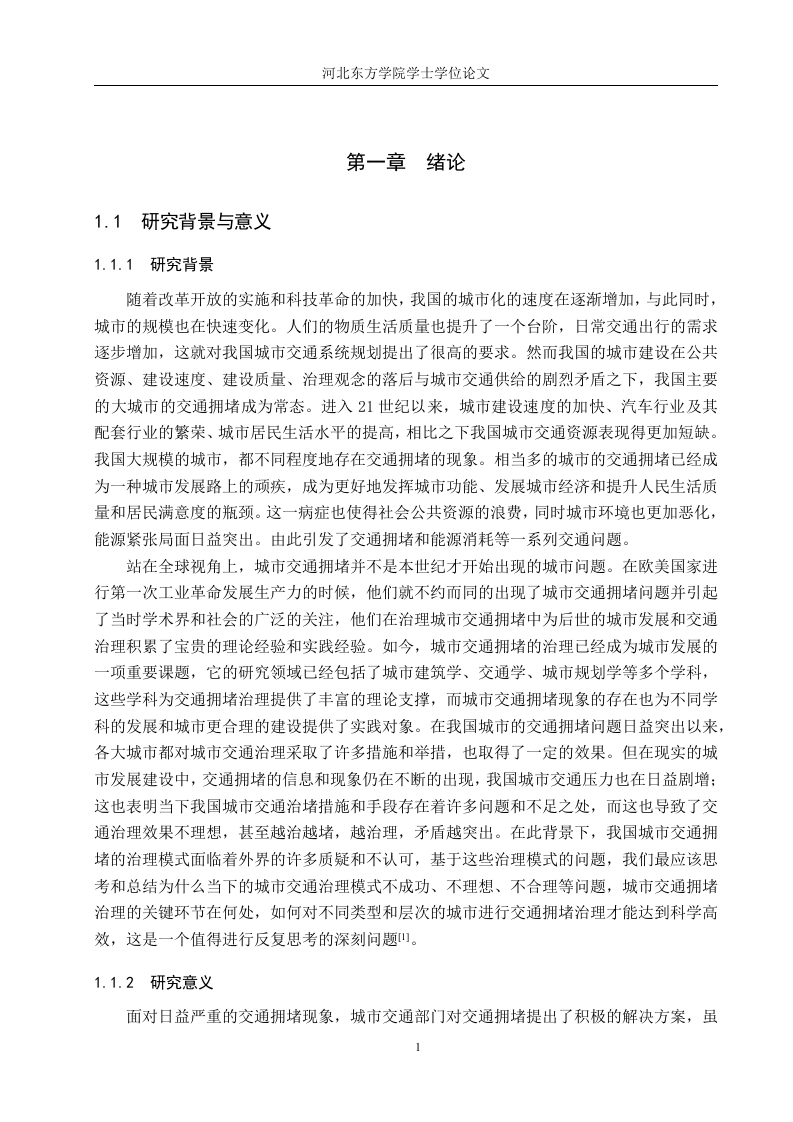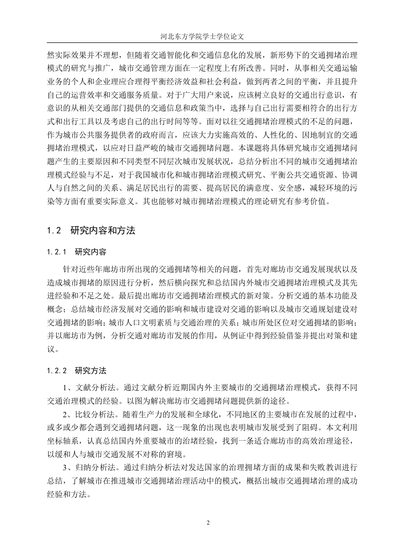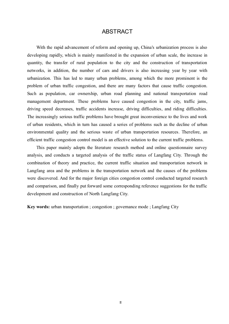城市交通拥堵治理模式的研究-以廊坊市为例摘要随着改革开放的快速推进,我国的城市化进程也在迅猛发展,这主要表现为城市规模的扩大,数量的增加,农村人口向城市的转移以及交通运输网的建设,此外,汽车保有量和驾驶员的数量也在随着城市化而逐年增加。这就出现了许多城市问题,其中,较为突出的是城市交通的拥堵问题,造成交通拥堵的因素有很多。如人口,汽车保有量,城市道路的规划以及城市交通管理部门的治理手段等。这些因素造成了中国许多大中型城市的不同程度的交通拥堵问题。随着城市交通问题的突出,对城市居民的生活和工作产生了不好的影响,还会对城市经济和城市居住环境造成冲击。因此,解决目前许多城市所面临的交通问题的关键就在于能否找到一个行之有效的城市交通拥堵治理模式。本文主要采用了文献资料研究法、比较分析法、归纳分析法,对目前廊坊的交通问题进行了有计划的实际分析。发现了廊坊市现阶段交通所存在的一些问题,运用相关的专业知识和相实地走访的手段分析了造成目前廊坊交通拥堵的主要原因。还对国外主要城市的治理方法进行了仔细的分析与借鉴,从而得到了一些实质性地参考信息,以图对廊坊市日后的交通建设提供帮助。关键词:城市交通:拥堵:治理模式:廊坊市1ABSTRACTWith the rapid advancement of reform and opening up,China's urbanization process is alsodeveloping rapidly,which is mainly manifested in the expansion of urban scale,the increase inquantity,the transfer of rural population to the city and the construction of transportationnetworks,in addition,the number of cars and drivers is also increasing year by year withurbanization.This has led to many urban problems,among which the more prominent is theproblem of urban traffic congestion,and there are many factors that cause traffic congestion.Such as population,car ownership,urban road planning and national transportation roadmanagement department.These problems have caused congestion in the city,traffic jams,driving speed decreases,traffic accidents increase,driving difficulties,and riding difficulties.The increasingly serious traffic problems have brought great inconvenience to the lives and workof urban residents,which in turn has caused a series of problems such as the decline of urbanenvironmental quality and the serious waste of urban transportation resources.Therefore,anefficient traffic congestion control model is an effective solution to the current traffic problems.This paper mainly adopts the literature research method and online questionnaire surveyanalysis,and conducts a targeted analysis of the traffic status of Langfang City.Through thecombination of theory and practice,the current traffic situation and transportation network inLangfang area and the problems in the transportation network and the causes of the problemswere discovered.And for the major foreign cities congestion control conducted targeted researchand comparison,and finally put forward some corresponding reference suggestions for the trafficdevelopment and construction of North Langfang City.Key words:urban transportation;congestion;governance mode Langfang City目录第一章绪论...1.1研究背景与意义.11.1.1研究背景。。1.1.2研究意义..11.2研究内容和方法.....21.2.1研究内容21.2.2研究方法21.3国内外研究现状...…31.3.1国内研究现状1.3.2国外研究现状...31.3.3研究综评......41.4本章小结.…分第二章国内外城市交通拥堵治理模式及经验分析·2.1新加坡交通治理模式..62.2伦敦交通治理模式...72.3纽约交通治理模式。。。…72.4深圳交通治理模式..82.5杭州交通治理模式.·2.6本章小结.....0.9第三章廊坊市交通发展现状及拥堵原因的分析.…103.1廊坊市交通发展现状.....….103.1.1城市规模的扩大以及周边城镇群的增加.…103.1.2汽车保有量的剧增.…103.1.3城市居民出行方式的多样化....103.1.4公共交通的菱缩以及停车位的短缺..113.1.5交通事故和环境问题的频发113.2廊坊市交通拥堵的原因分析.....123.2.1城市经济发展对交通的影响...·123.2.2城市建设对交通的影响...…133.2.3城市交通规划建设对交通拥堵的影响..........·.…133.2.4城市人口文明素质与交通治理的关系...........143.2.5城市所处区位对交通拥堵的影响...153.2.6城市交通管理部门和政策对交通的影响.…163.3本章小结....16第4章河北省廊坊市交